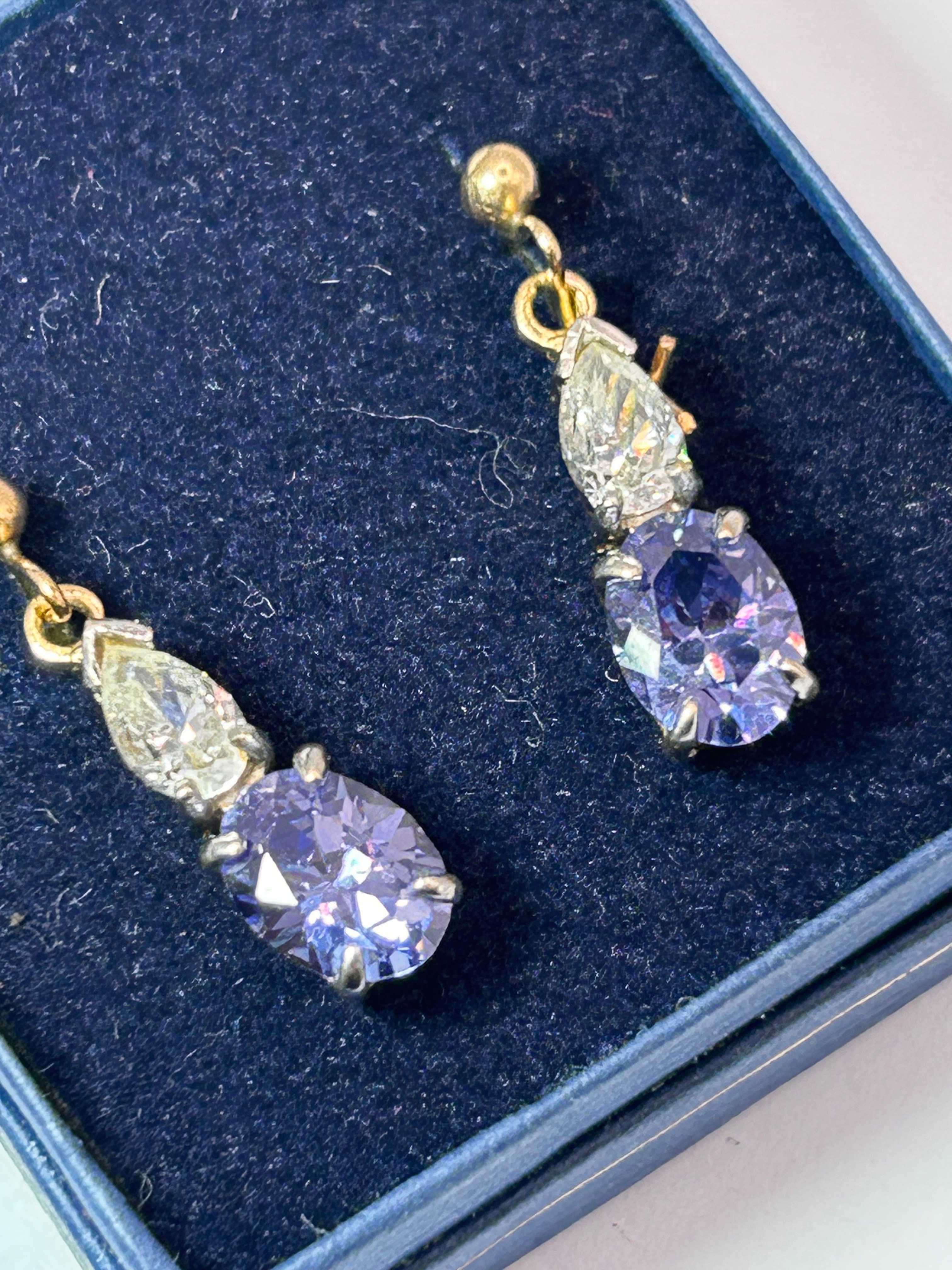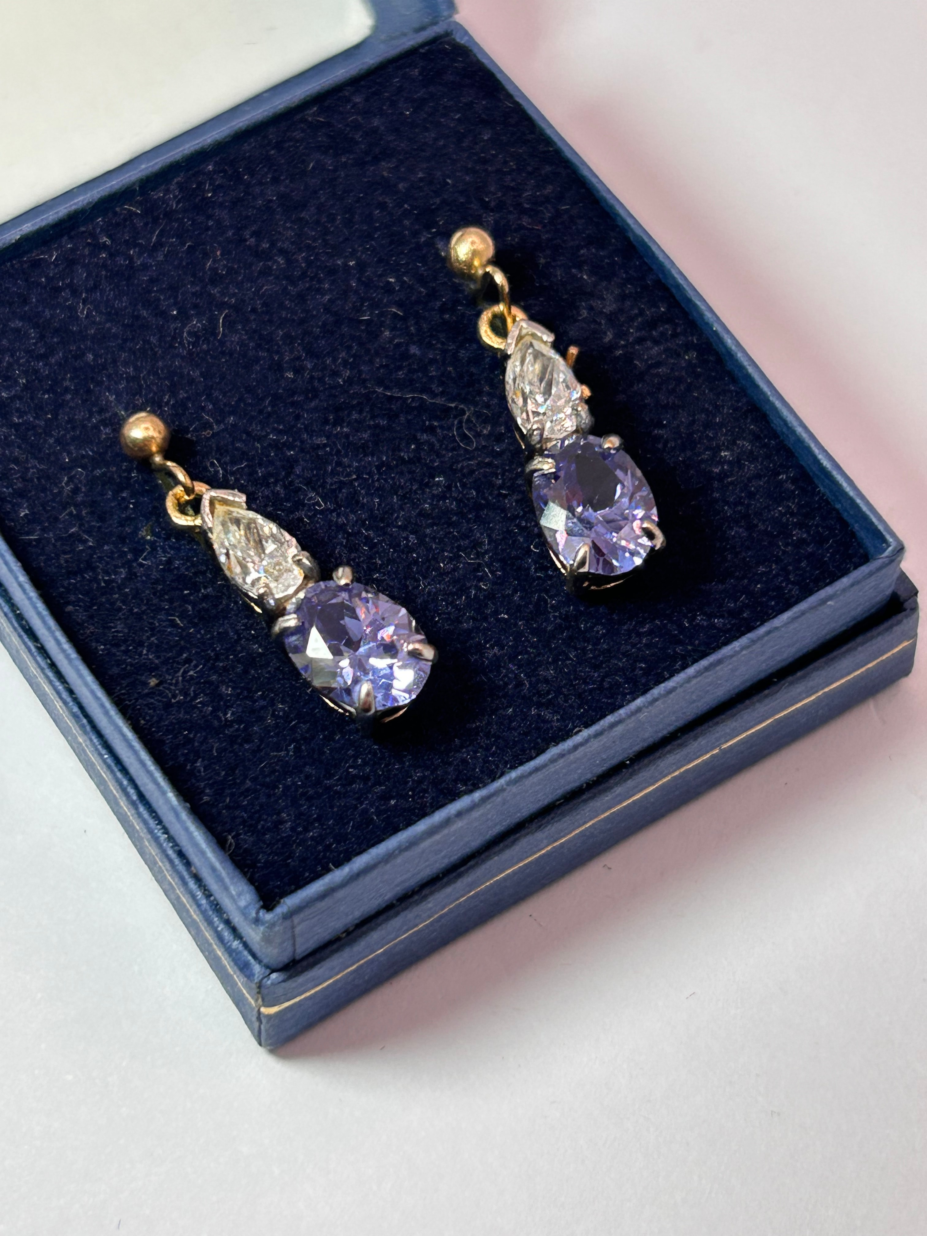 A pair of 9ct Gold drop earrings, each featuring a gold post suspending a pear-shaped colorless faceted stone above a larger, oval-shaped faceted stone of a vibrant lavender-purple hue, both securely set with prongs. The earrings are presented within a dark blue, velvet-lined, fitted presentation box. No discernible hallmarks, maker’s marks, or inscriptions are visible under preliminary inspection.