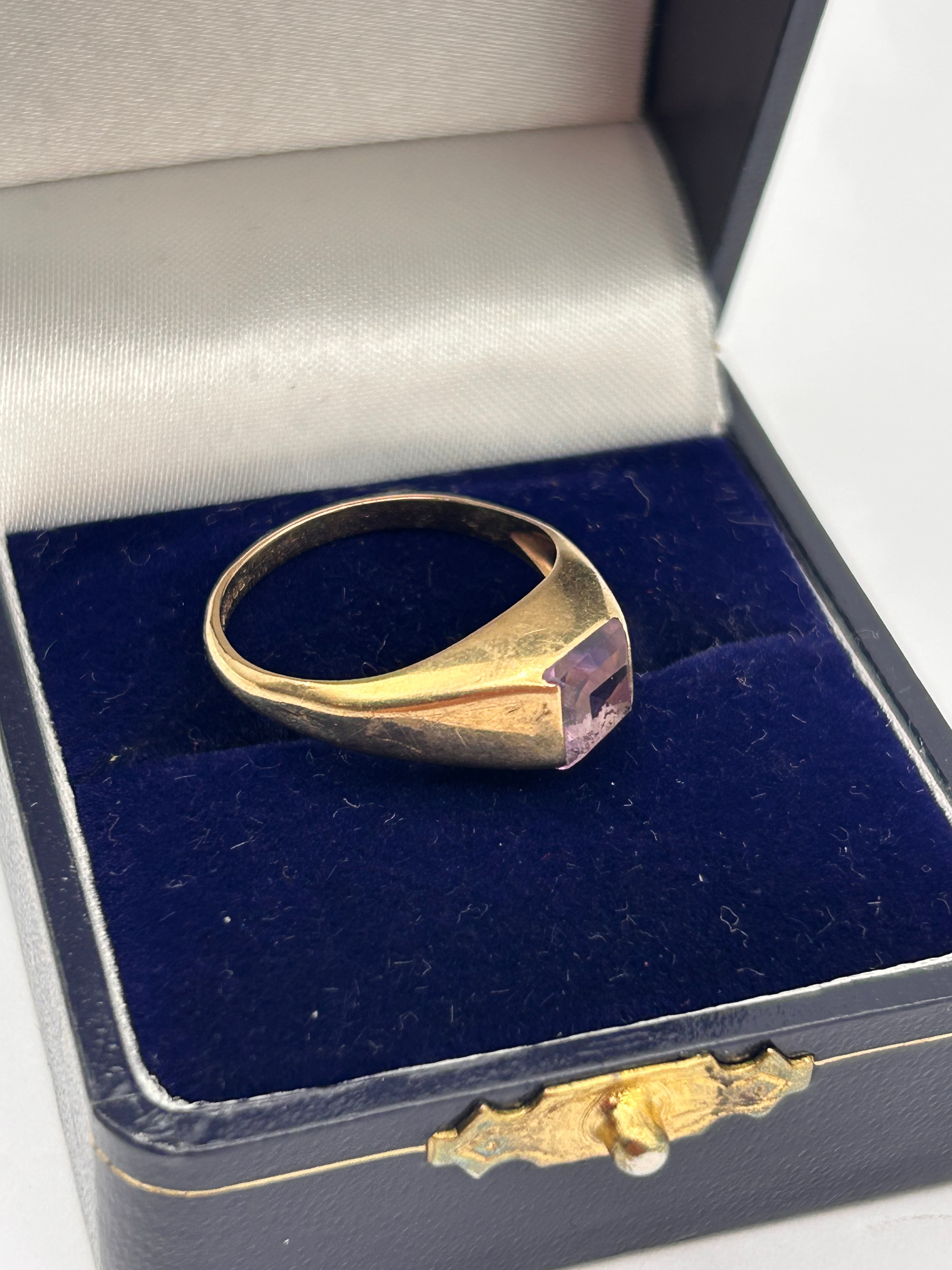 A vintage 9ct yellow gold amethyst ring. The signet-style ring features a rectangular, step-cut amethyst, bezel-set within the broad, tapering shoulders of the band. Presented in a hinged, dark blue velvet-lined jewelry box with a black exterior and a decorative gold-tone clasp.