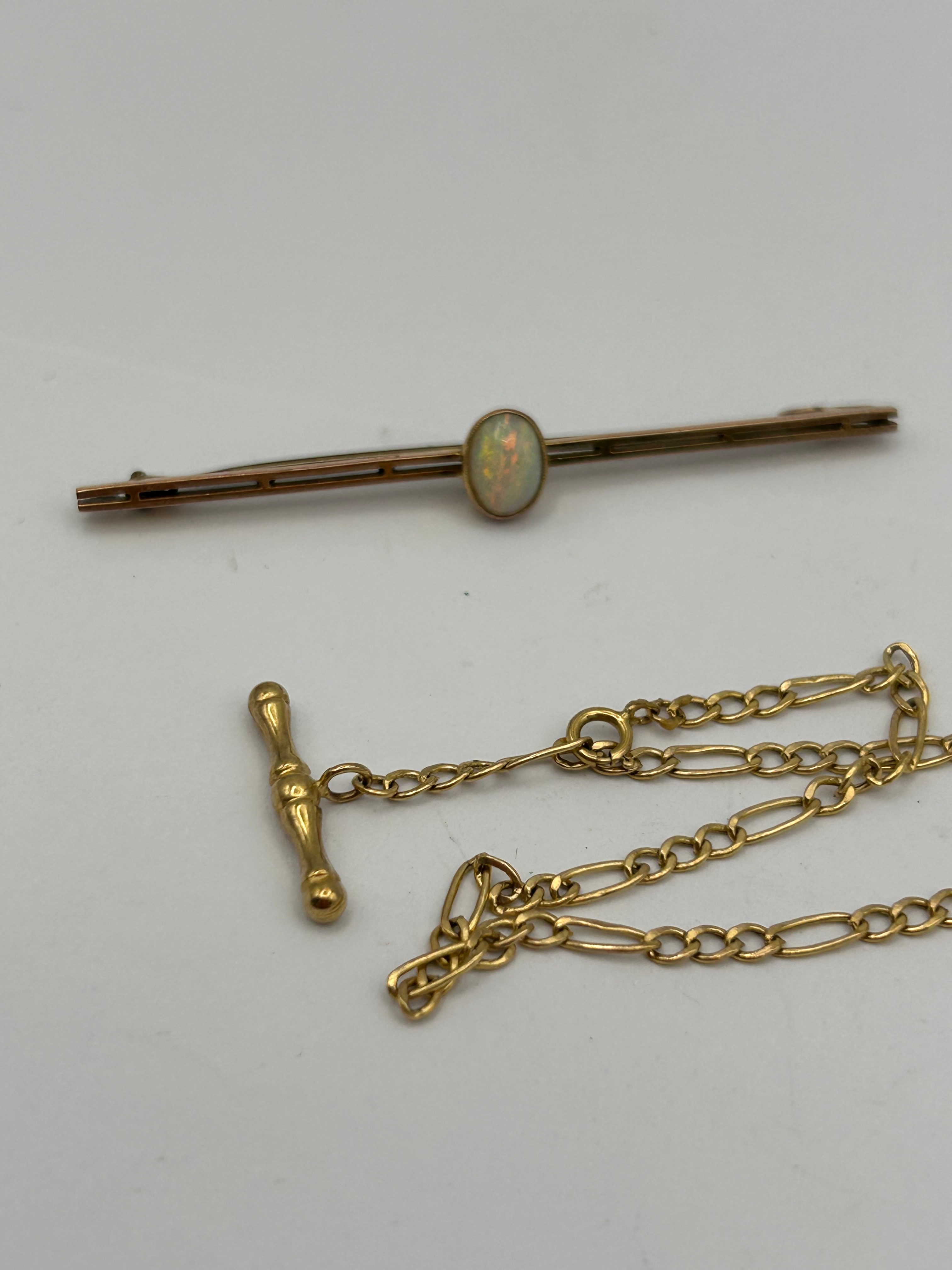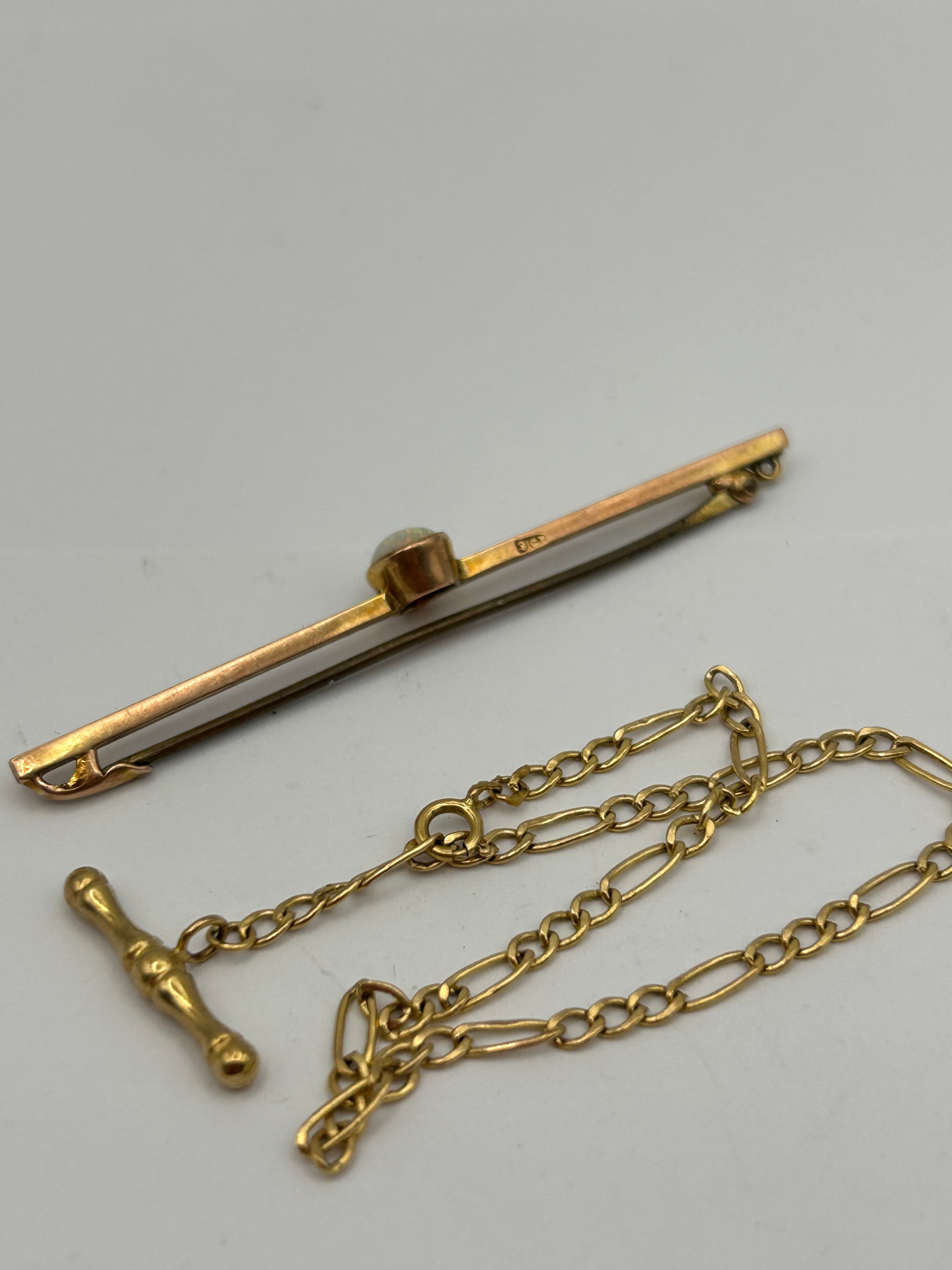 A Victorian gold plated bar-style tie or cravat pin, accompanied by Gold bracelet. The pin features a slender, straight bar with a single oval cabochon-cut opal set centrally, exhibiting play-of-color. The item is crafted from gold plated metal, with a ‘9ct’ mark and other indistinct hallmarks visible on the reverse of the bar pin. The safety chain is constructed from figaro-style links, consistent with an Albert chain, and terminates in a decorative T-bar.