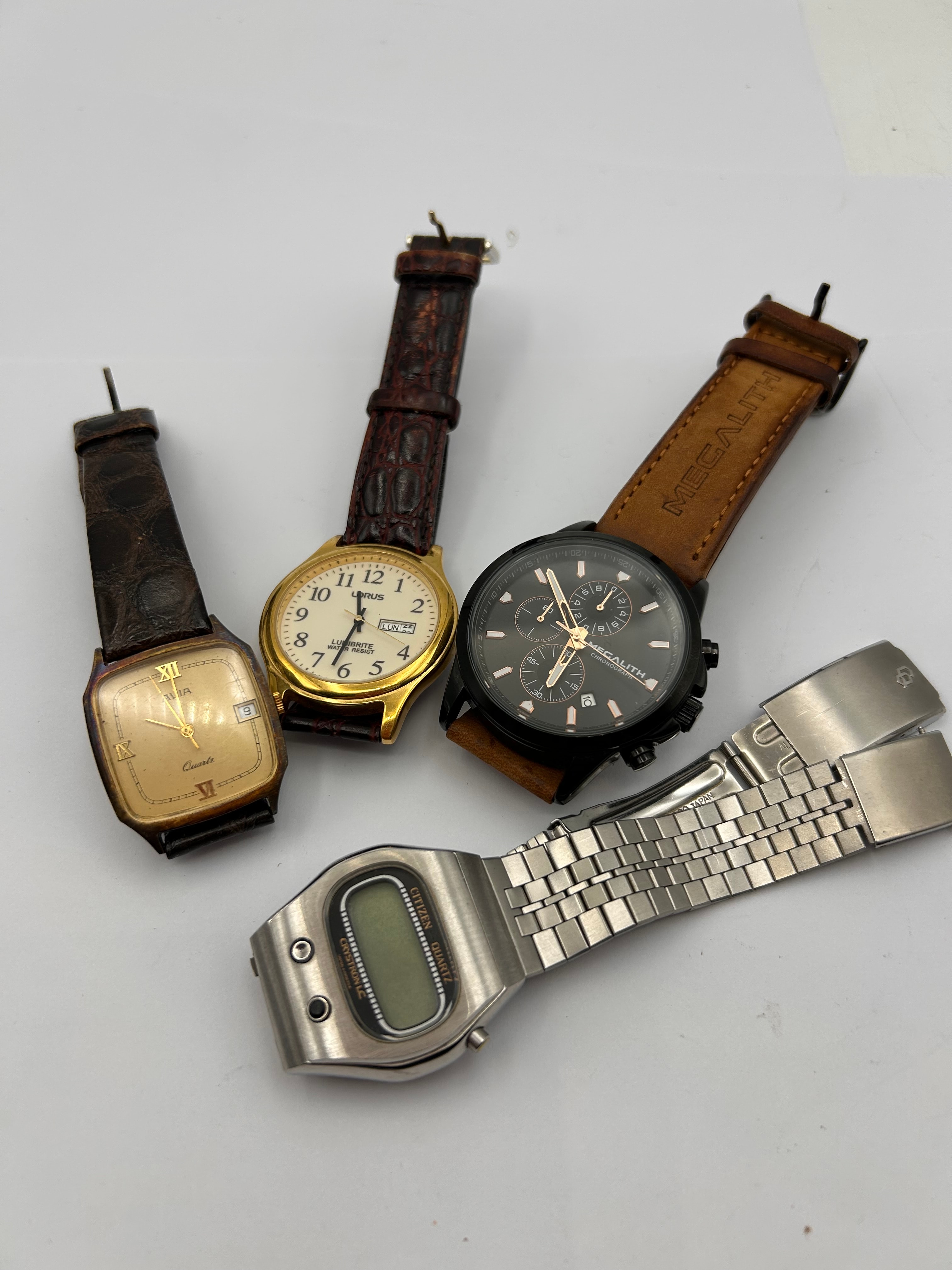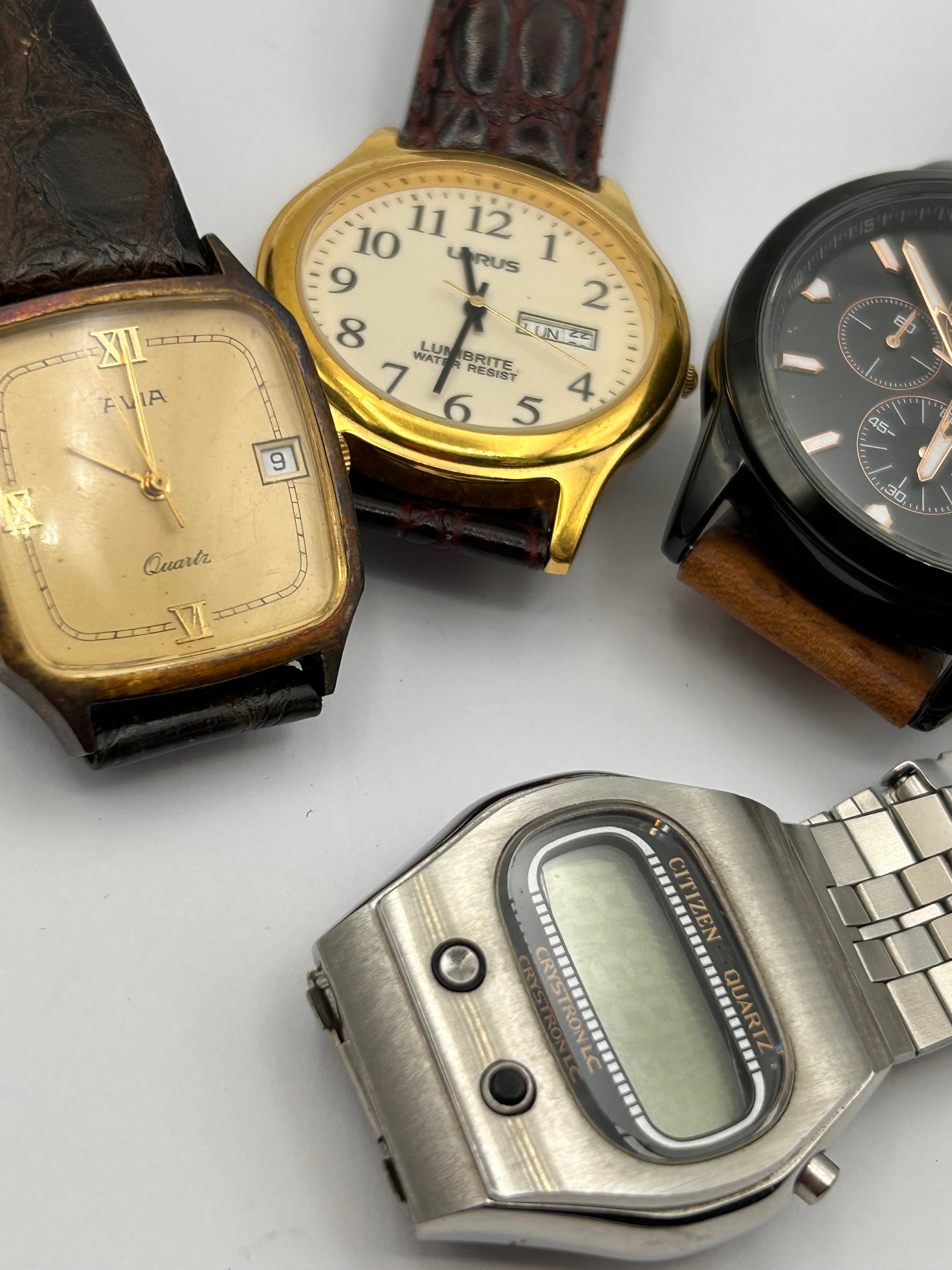 A collection of four men’s wristwatches, comprising an assortment of styles and materials. The first is a rectangular gold-tone AVIA quartz analog watch with a brown leather strap, featuring a champagne dial marked “AVIA,” “Quartz,” and faintly “Swiss Made,” displaying Roman and Arabic numerals. The second is a round gold-tone LORUS analog watch on a dark brown crocodile-embossed leather strap, with a white dial showing Arabic numerals, a day/date window, and text including “LUMIBRITE” and “WATER RESIST.” The third is a black-toned MEGALITH chronograph analog watch with a brown leather strap embossed “MEGALITH,” featuring a black dial inscribed “MEGALITH CHRONOGRAPH WATER RESIST” with multiple subdials. The final watch is a silver-tone CITIZEN digital watch with a matching metal link bracelet, featuring a rectangular case with a blank display marked “CITIZEN QUARTZ CRYSTRON LC.”
