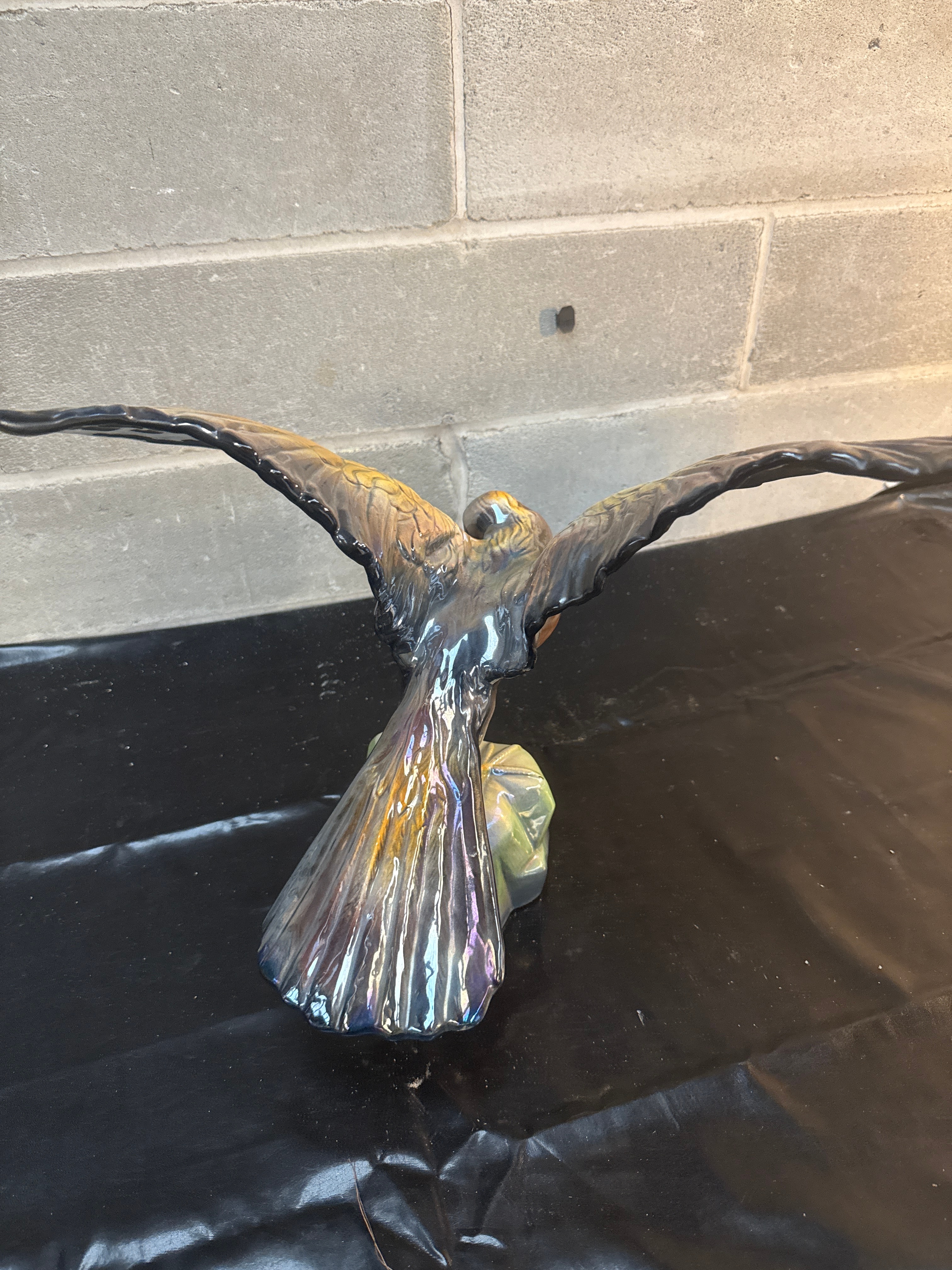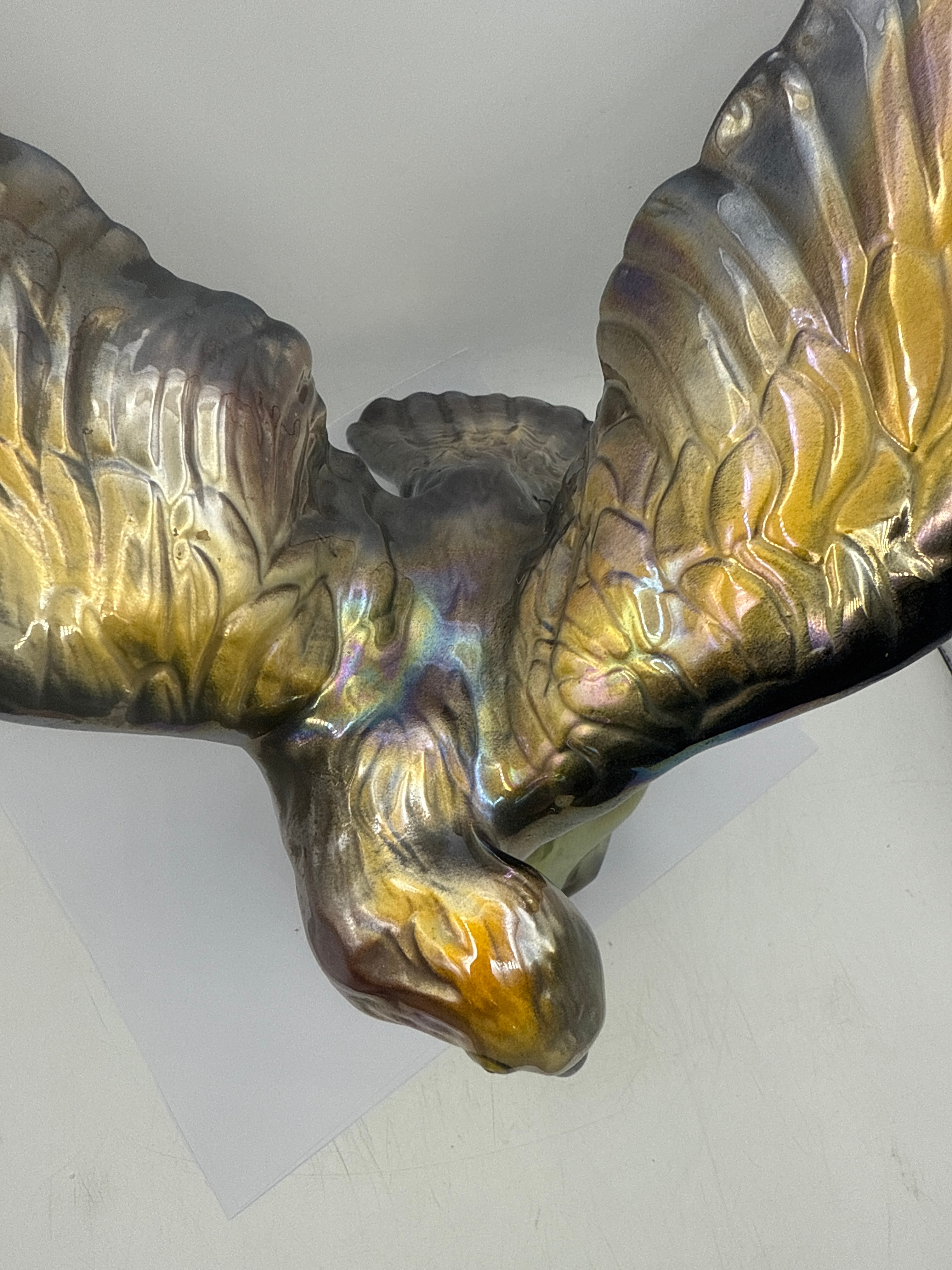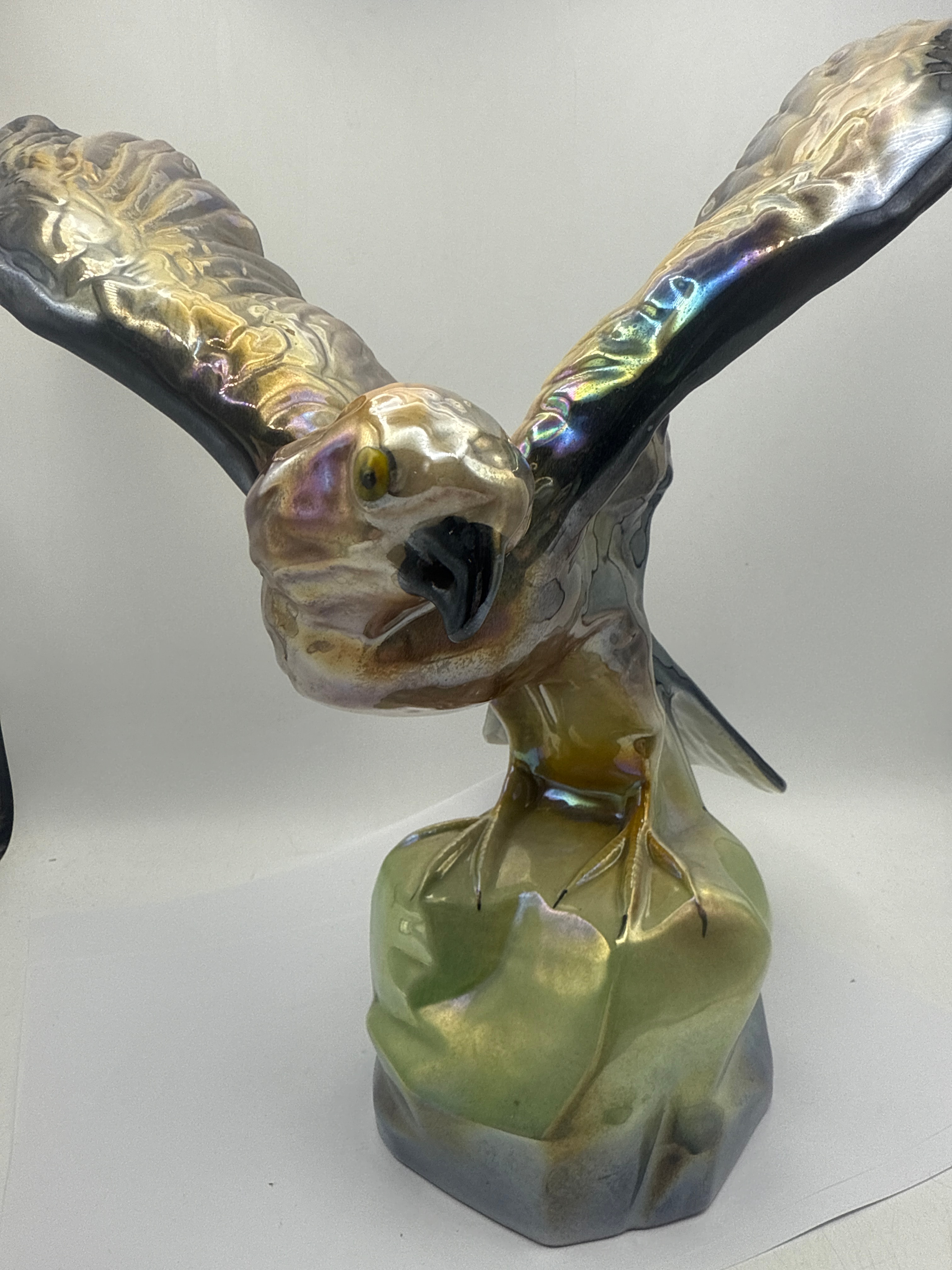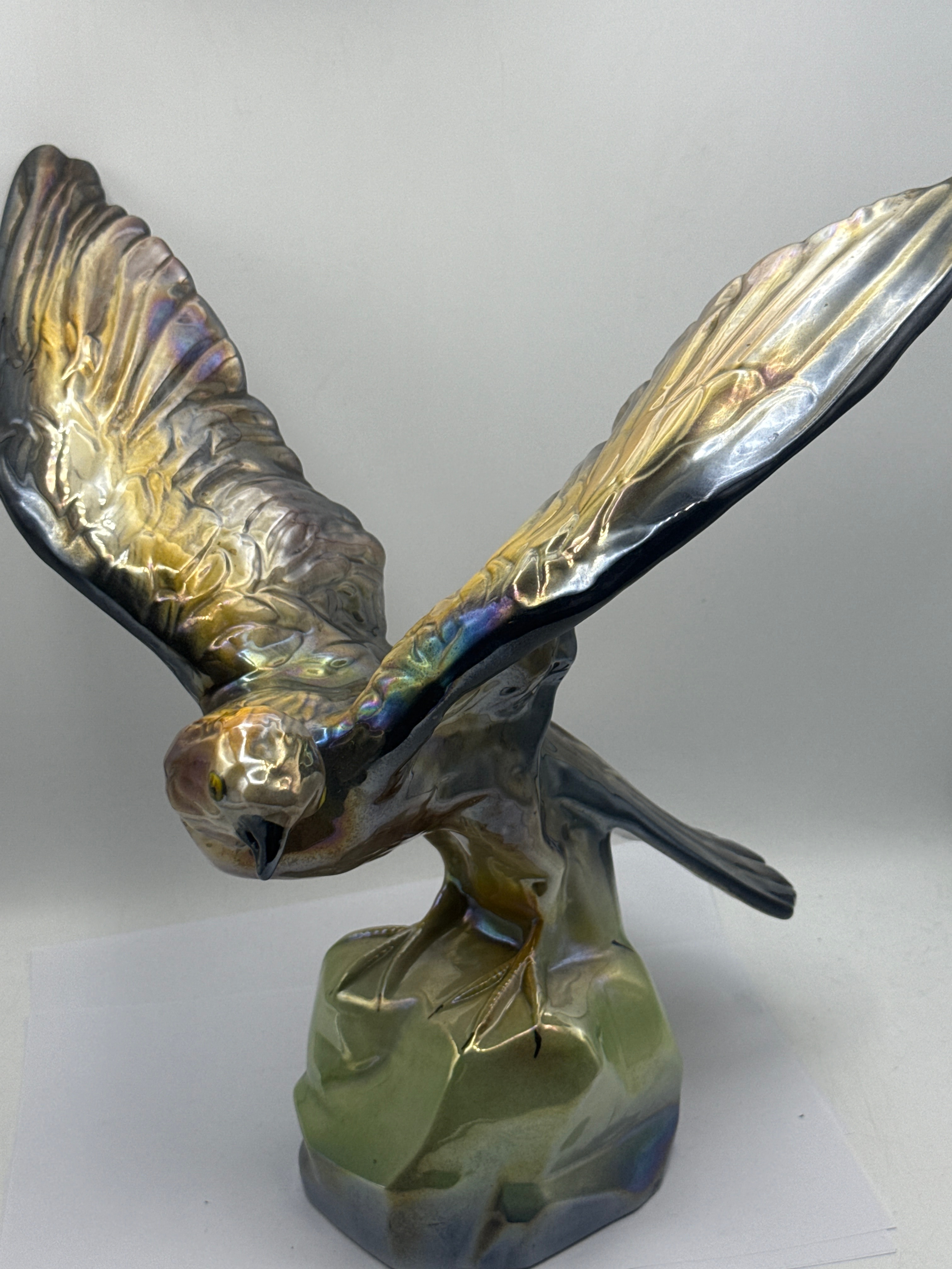 A ceramic figurine depicting a bird of prey, likely an eagle or hawk, captured in a dynamic pose with its wings fully spread, perched atop a stylized rock formation. The piece features a prominent iridescent luster glaze, showcasing a shimmering spectrum of metallic hues including gold, silver, bronze, blue, green, and purple across its surface, creating a pearlescent effect. The overall style appears naturalistic yet stylized.