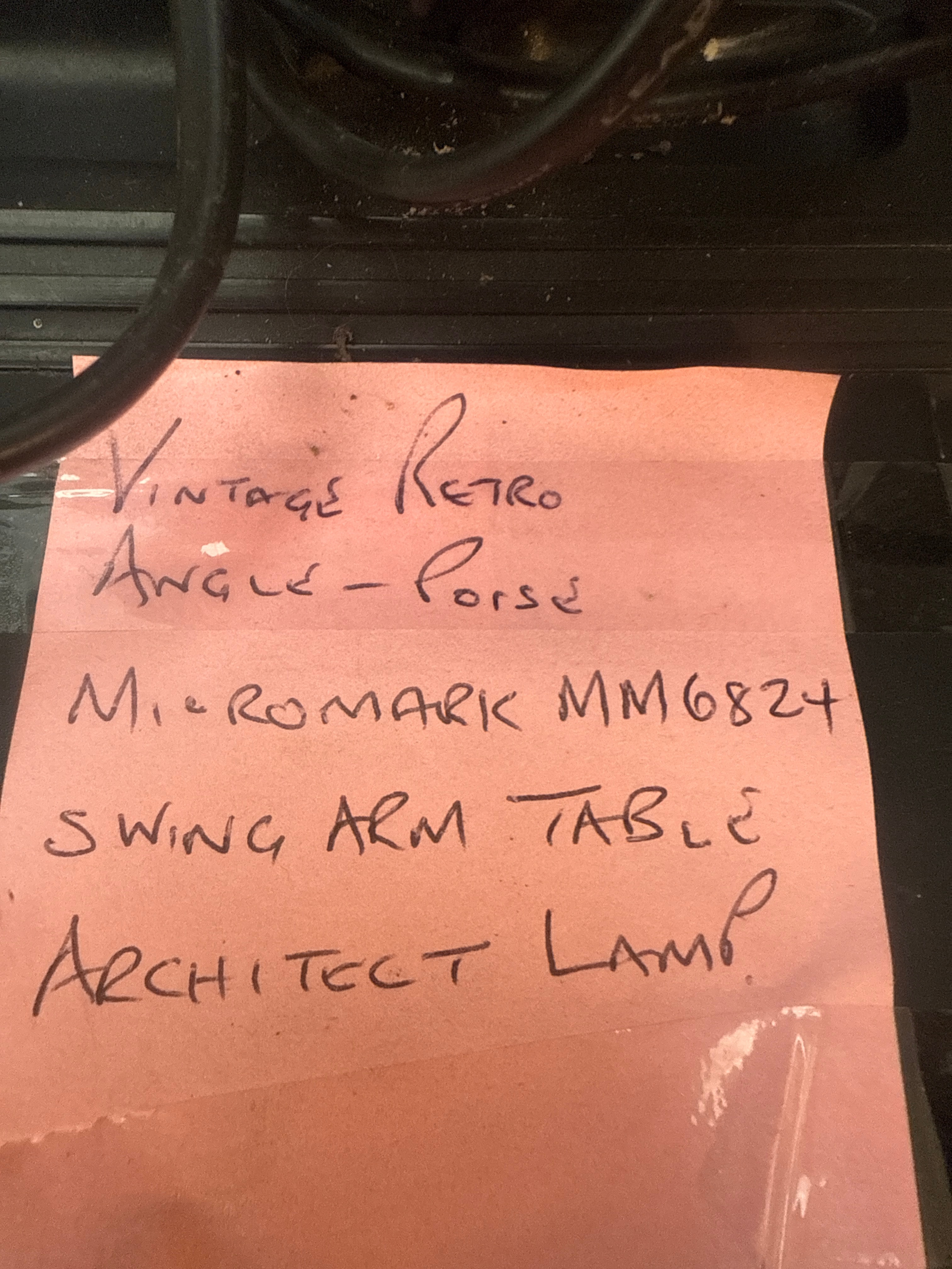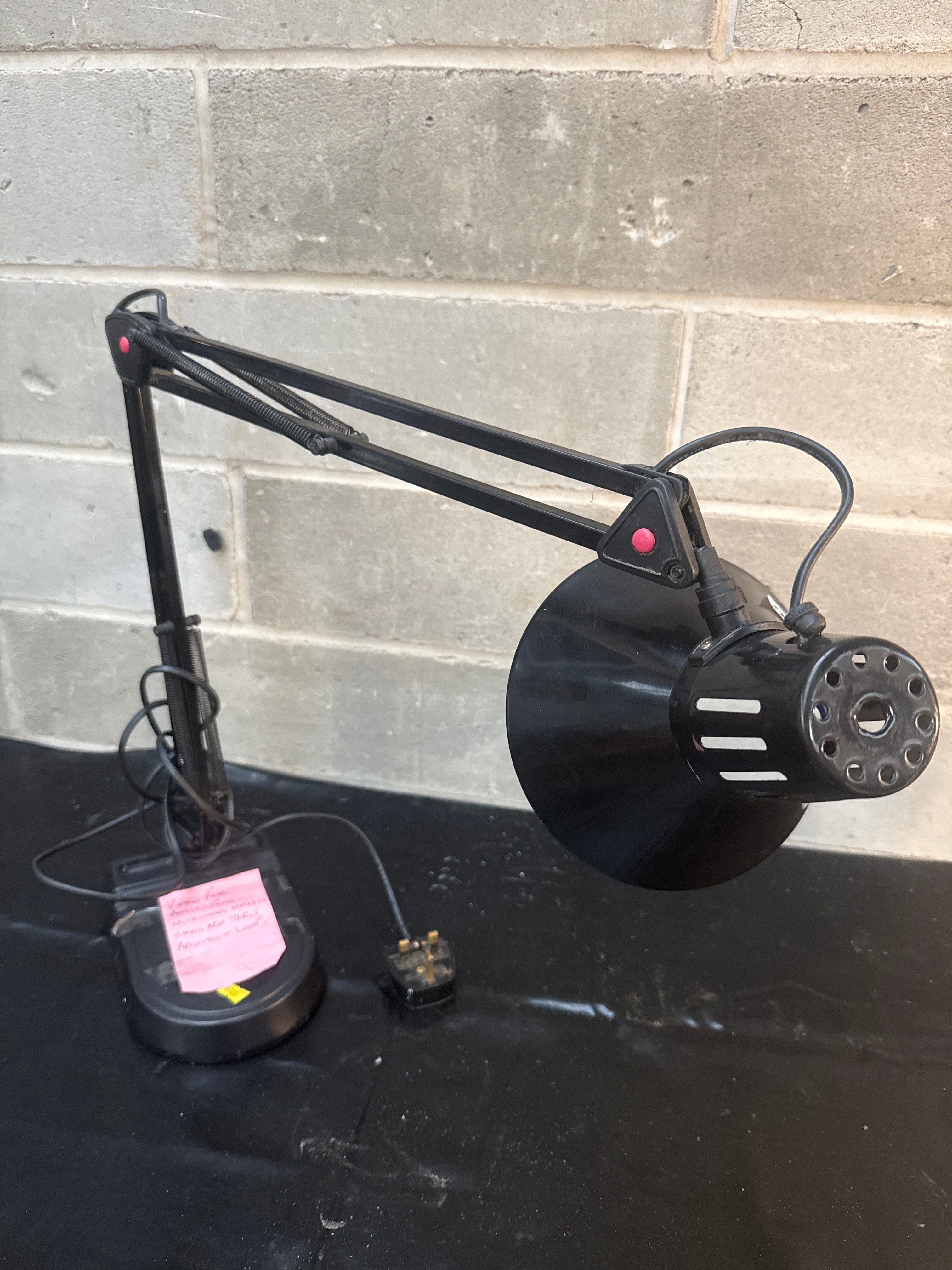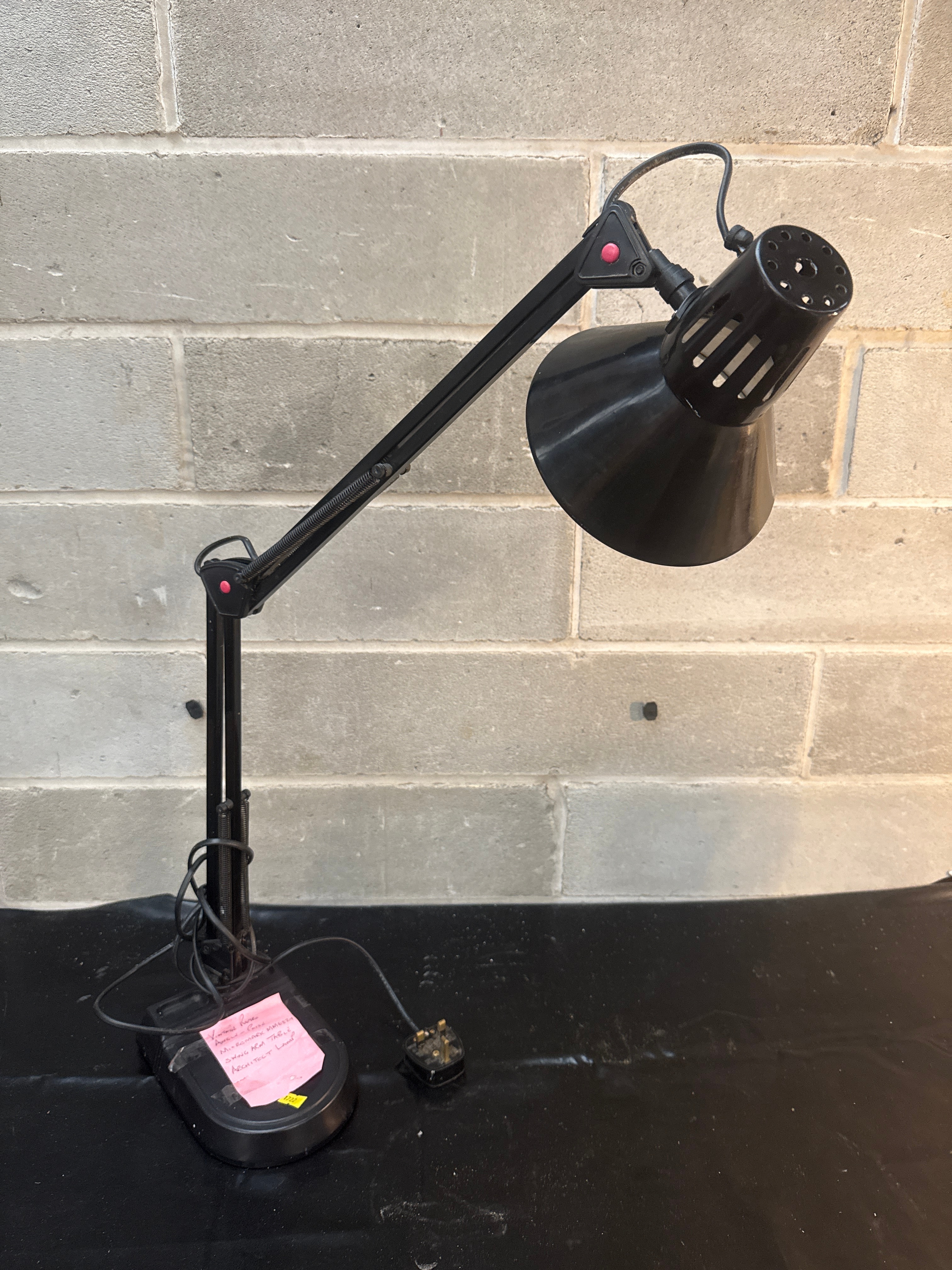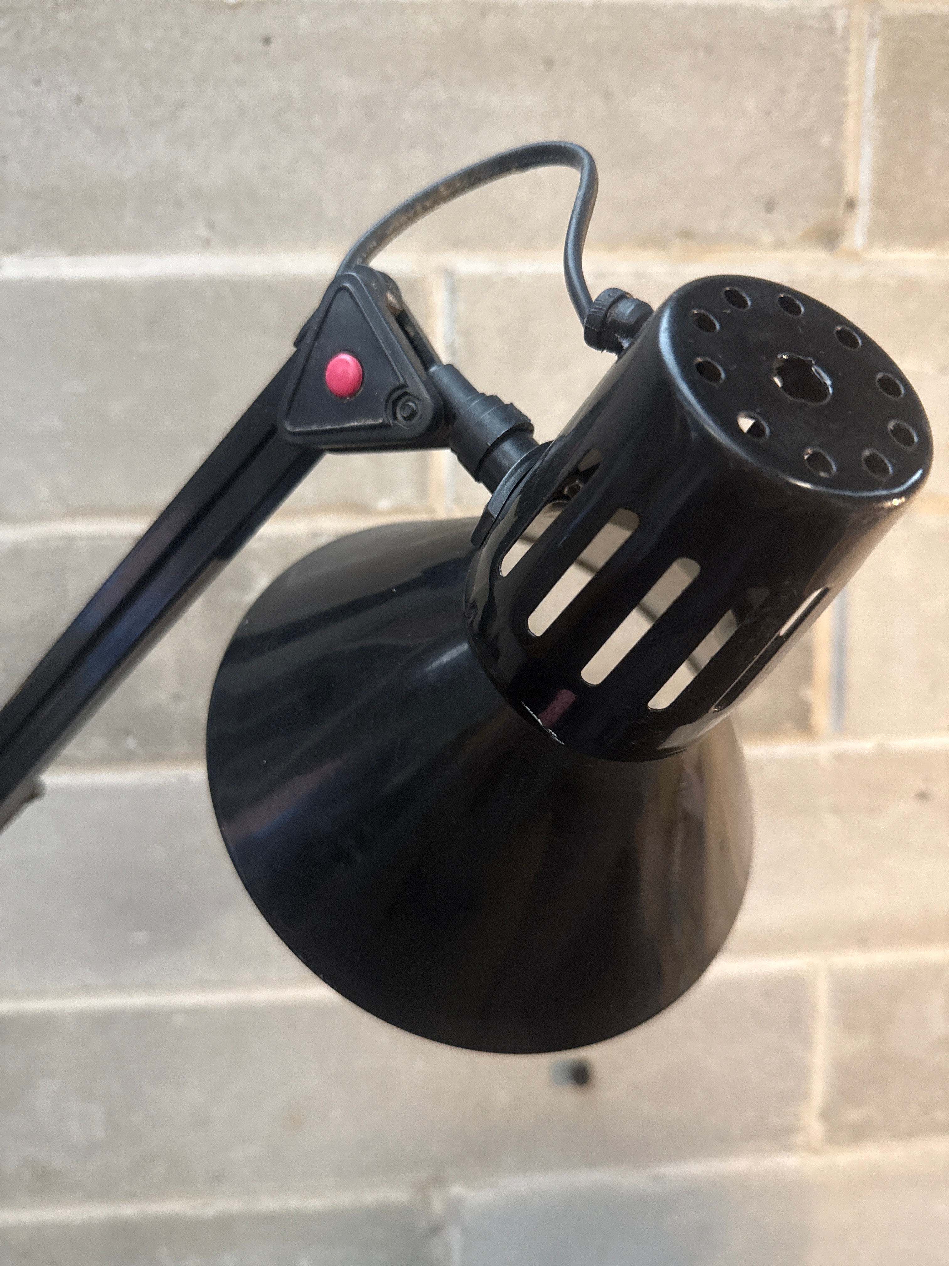 A Micromark MM6824 vintage retro swing arm table architect lamp, dating to the circa 1970s. This black-finished, articulated swing-arm table lamp features adjustable arms and a conical, vented shade constructed from black-painted metal. The base and pivot joints are made from plastic components, accented by small red buttons at the arm hinges. It is equipped with a UK-standard three-pin plug.