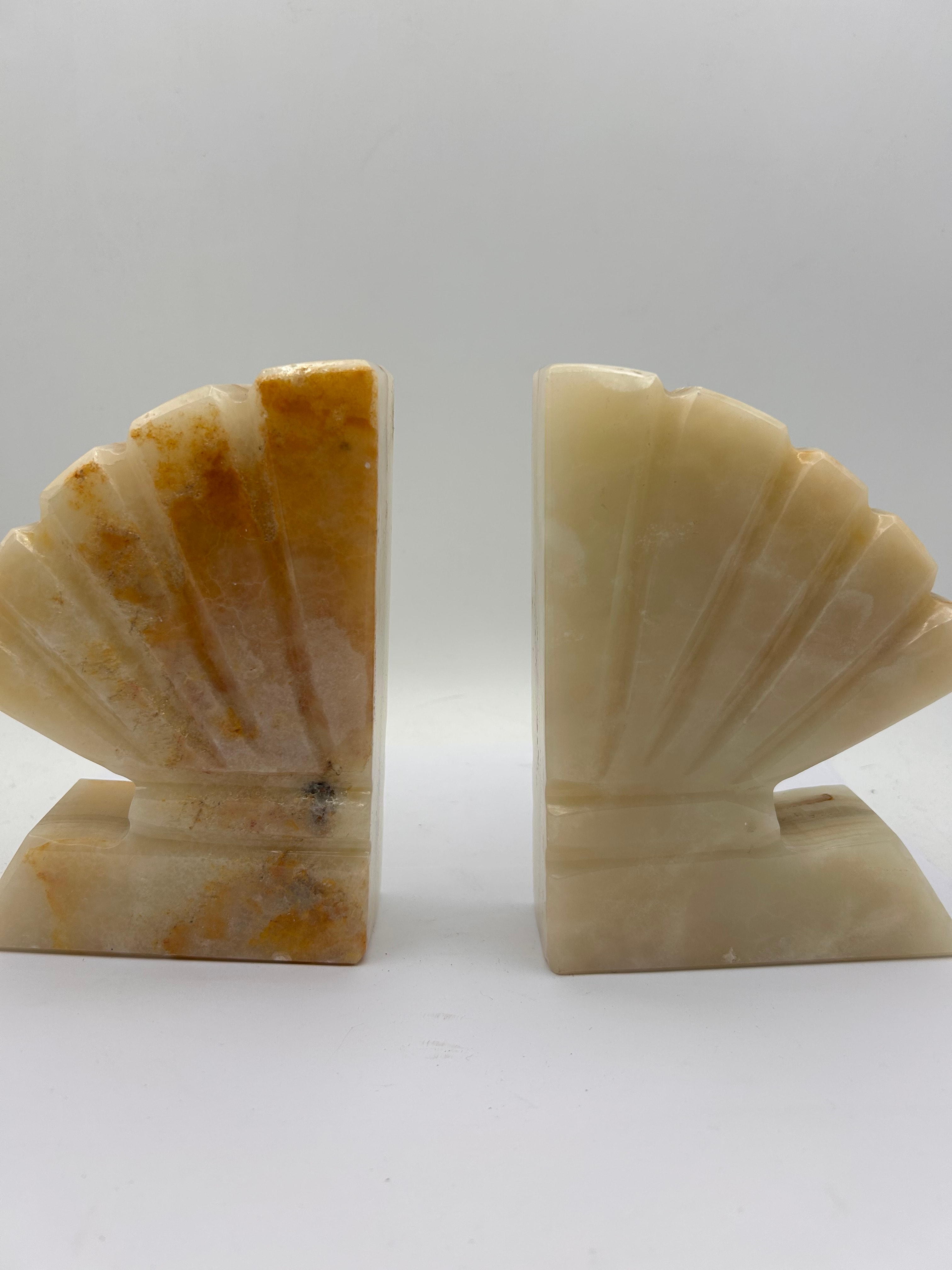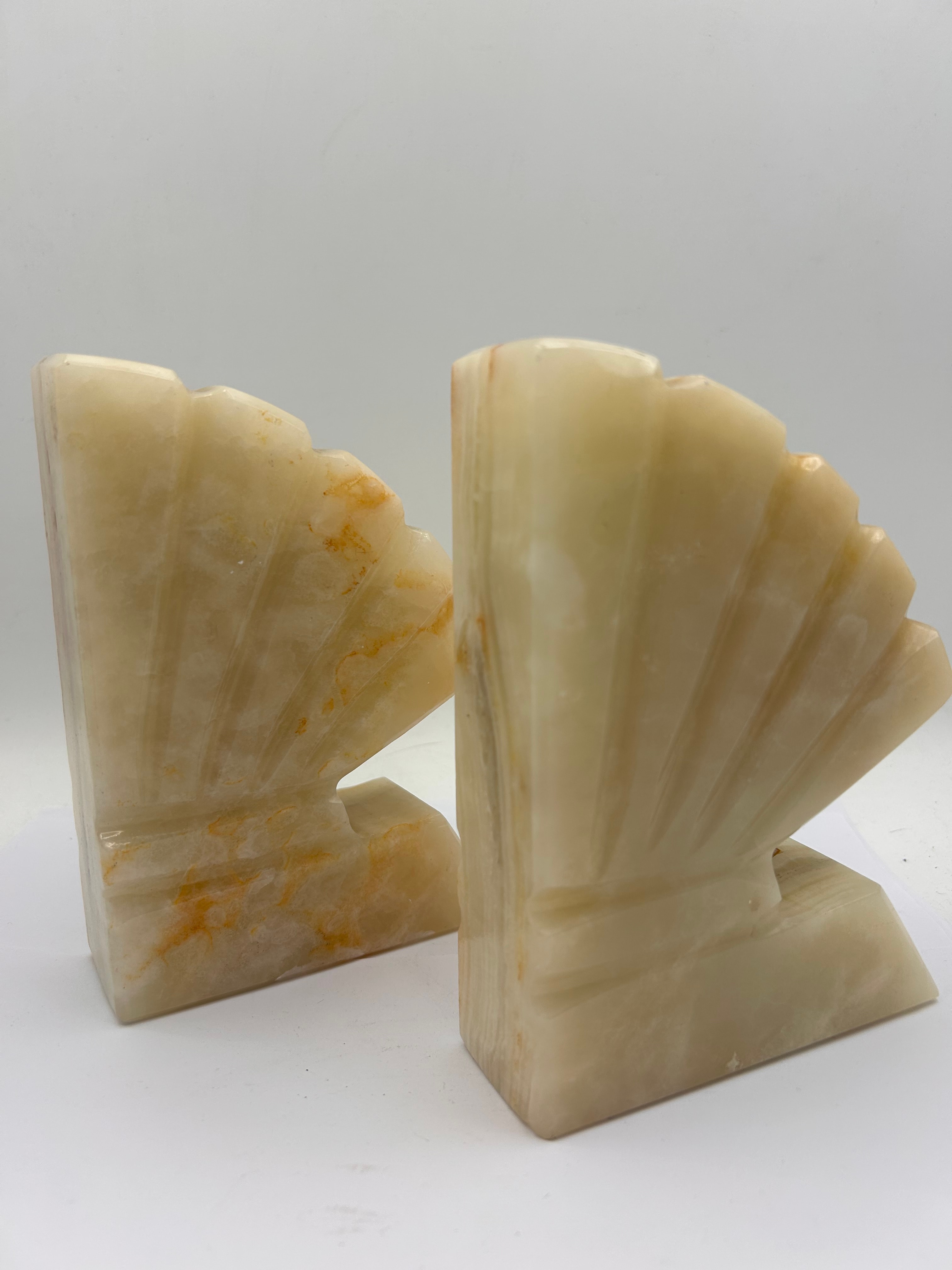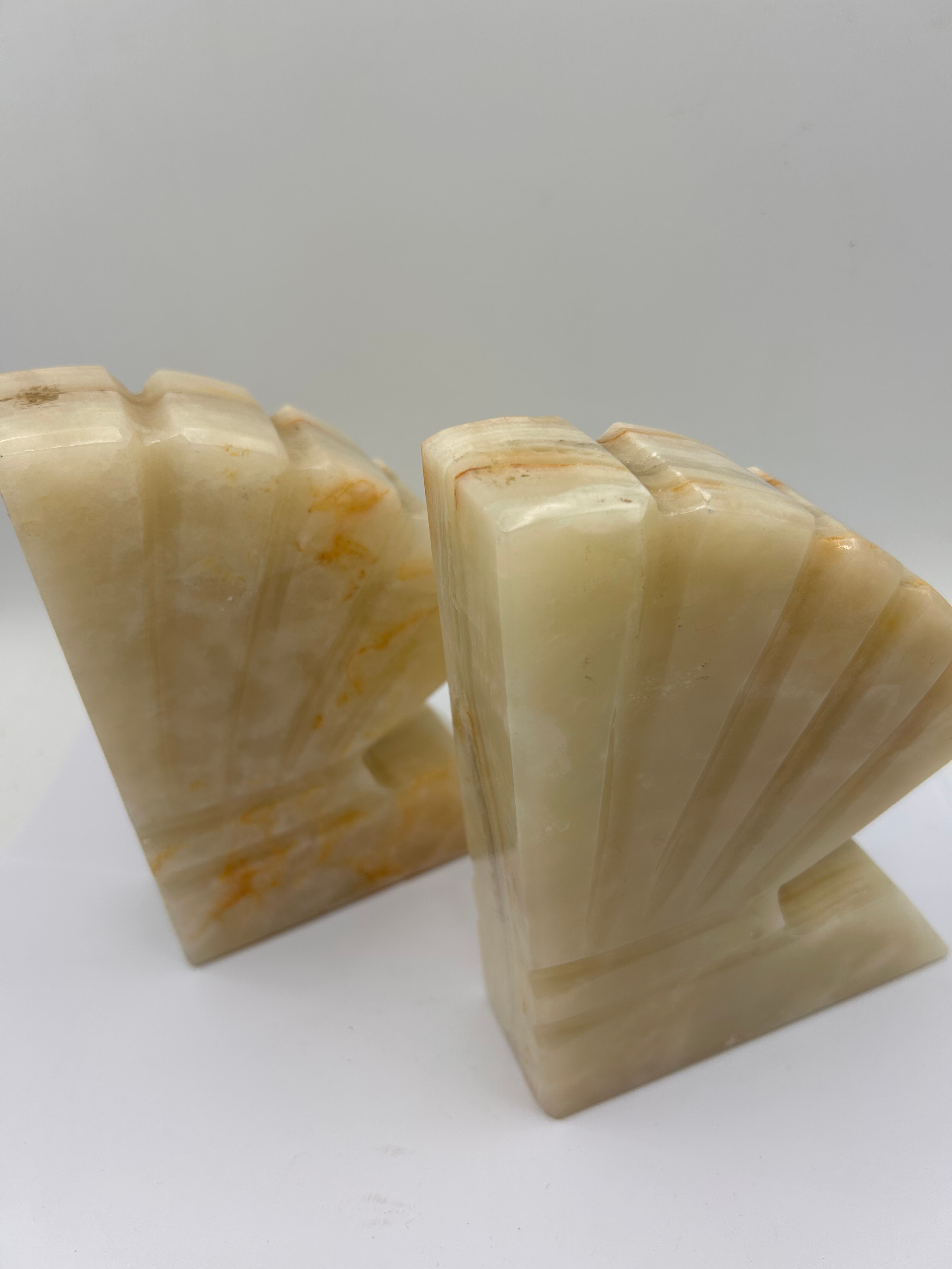 A pair of Art Deco carved onyx bookends, each featuring a stylized design with a geometric, angular base supporting a raised, fan or shell-like upper section detailed with radiating linear grooves. The carved and polished stone exhibits natural translucent banding in shades of cream and beige with prominent rust-orange veining. No visible text or markings are present.
