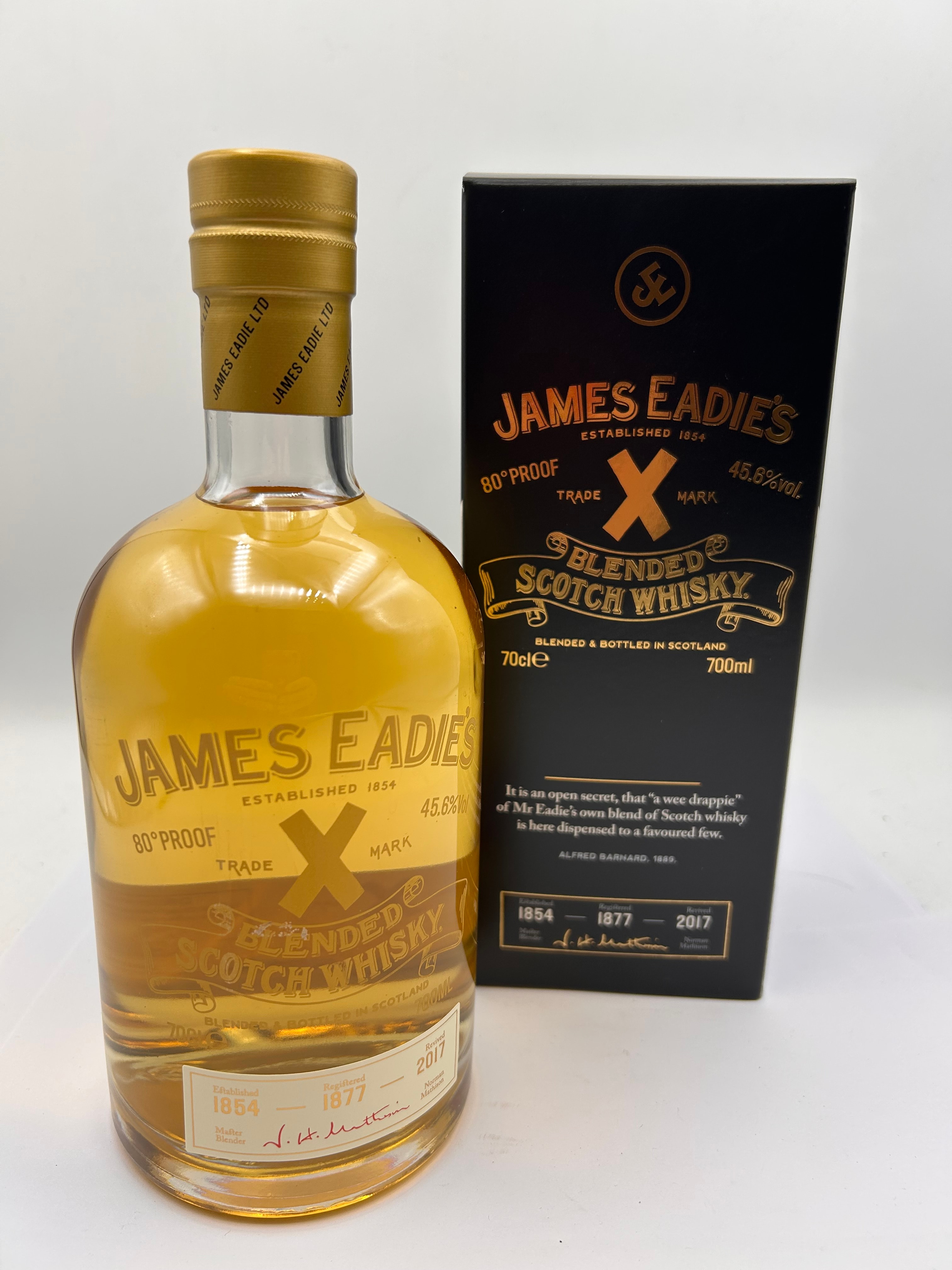 A bottle of James Eadie’s Trade Mark ‘X’ Blended Scotch Whisky, presented with its original black cardboard presentation box. The clear glass bottle contains 70cl (700ml) of golden-amber liquid, sealed with a gold-colored foil cap. Both the bottle and box prominently display “JAMES EADIE’S,” “ESTABLISHED 1854,” “80° PROOF,” “45.6% vol,” “TRADE X MARK,” and “BLENDED SCOTCH WHISKY,” noting it is “BLENDED & BOTTLED IN SCOTLAND.” The bottle’s main label also features “1854,” “1877,” and “2017” under a “DISTILLING PERIOD” section, along with “Single Malt / Grain Whisky” and a signature appearing to be “J. H. Lutton.” The box design and text on the reverse elaborate on the brand’s history and product, including the phrase “uisce beatha,” which translates from Irish Gaelic as “water of life.”