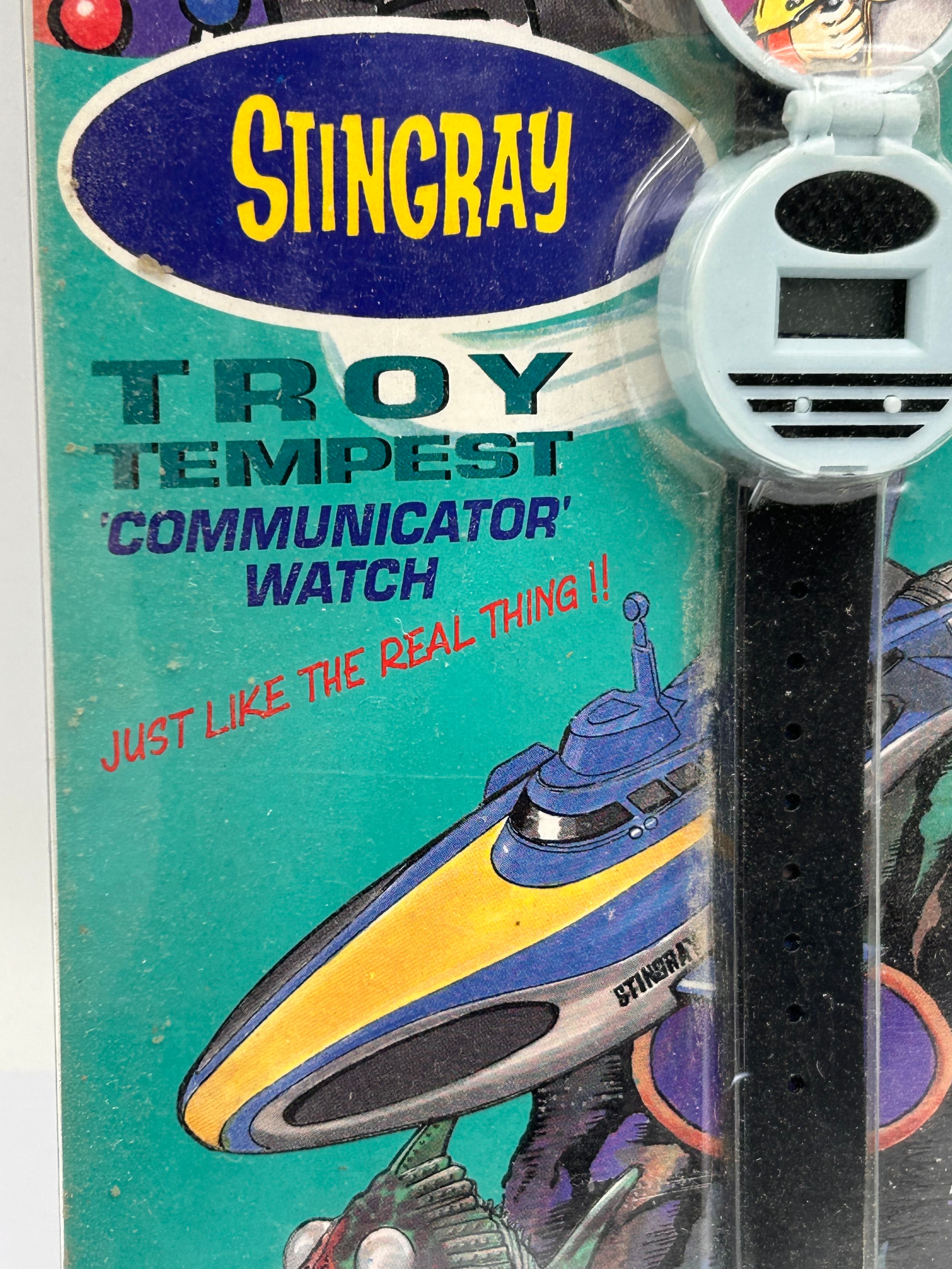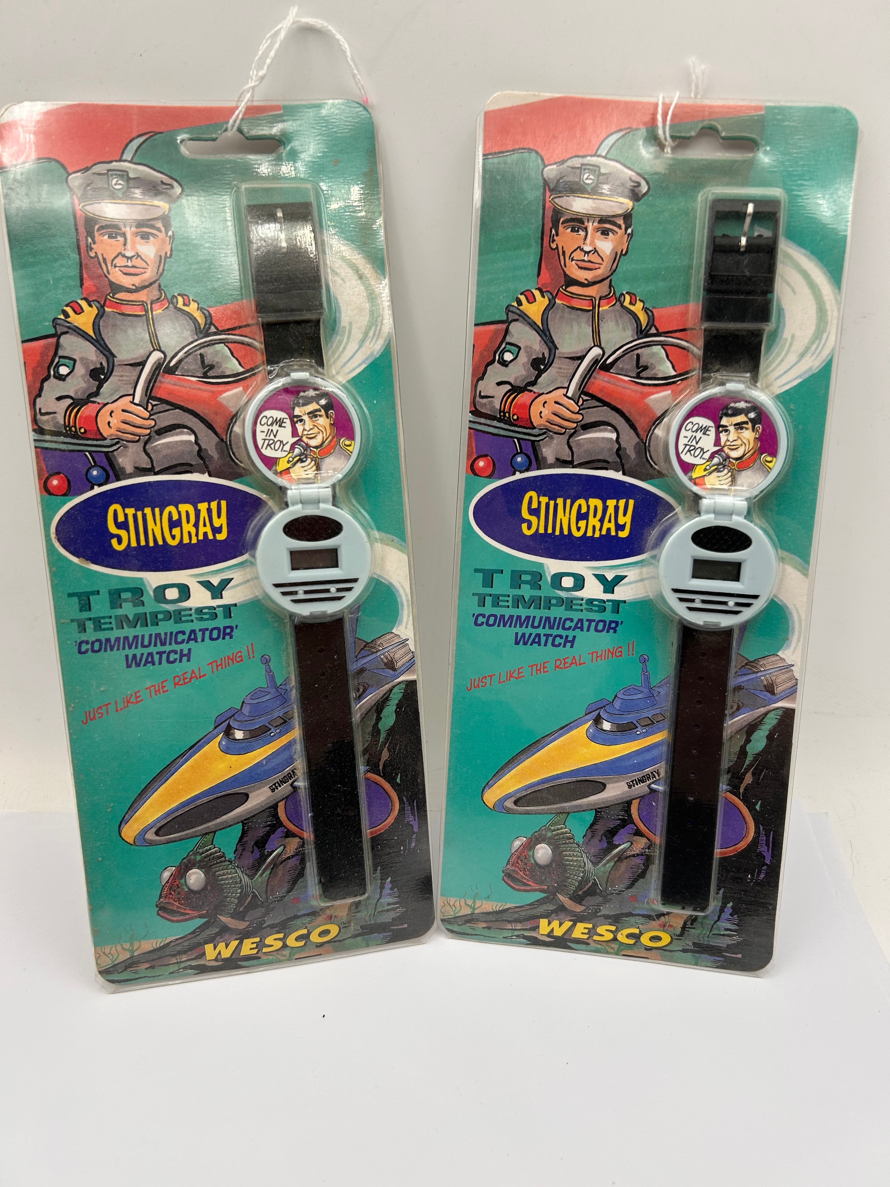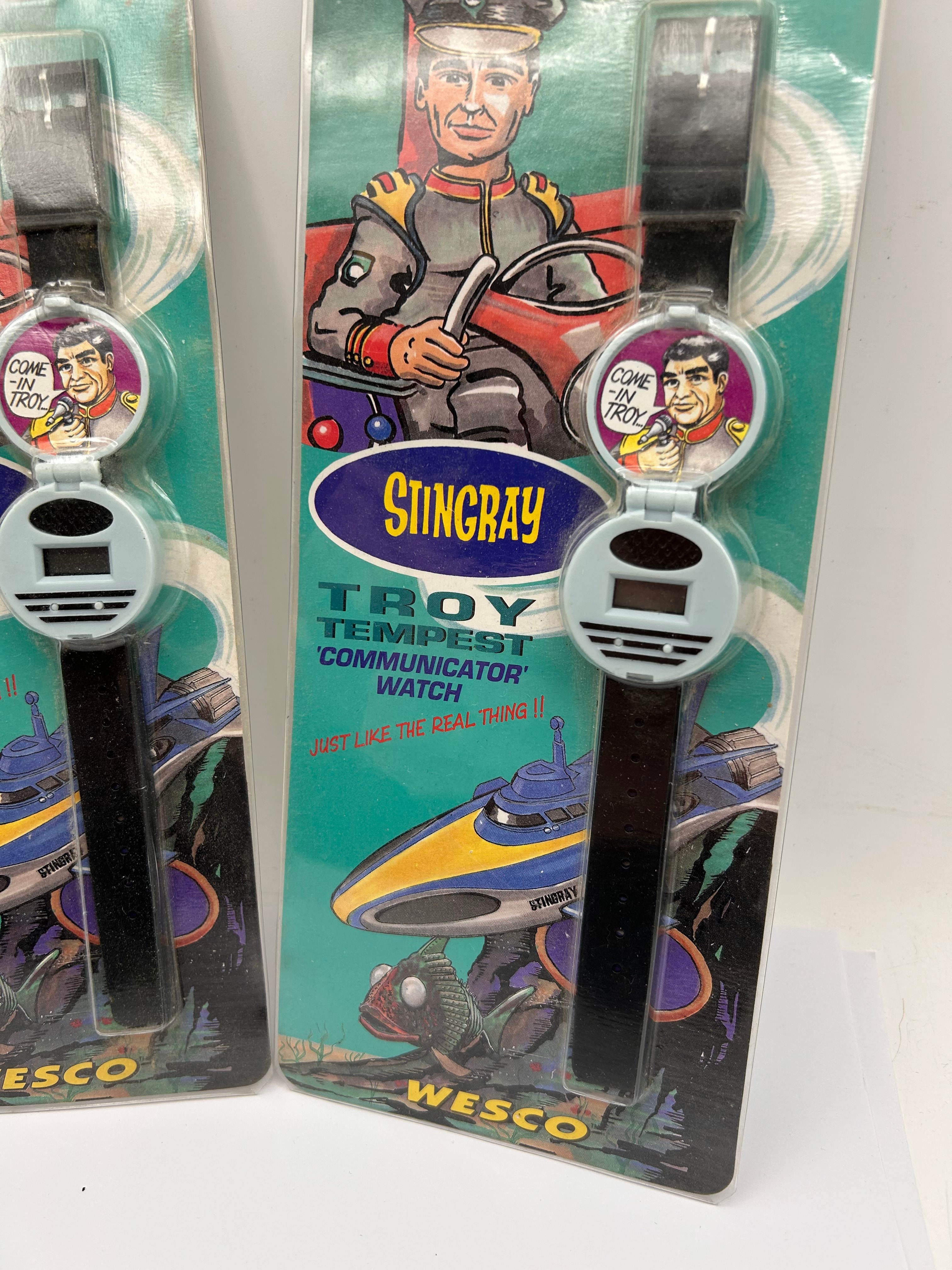 A pair of identical vintage children’s watches, identified as Gerry Anderson’s Stingray Troy Tempest Communicator Watches by Wesco, circa 1992. Each watch is presented in its original, unopened cardboard blister packaging. The watches feature a light blue plastic housing designed as a “communicator” with a small digital display and a hinged cover depicting a character within a speech bubble reading “COME IN TROY!”. They are fitted with black plastic straps. The packaging is illustrated with images of Captain Troy Tempest, the Stingray submarine, and other characters, bearing the prominent text “Stingray,” “TROY TEMPEST ‘COMMUNICATOR’ WATCH,” “JUST LIKE THE REAL THING !!”, and “WESCO” at the bottom. The items appear to be New Old Stock (NOS).