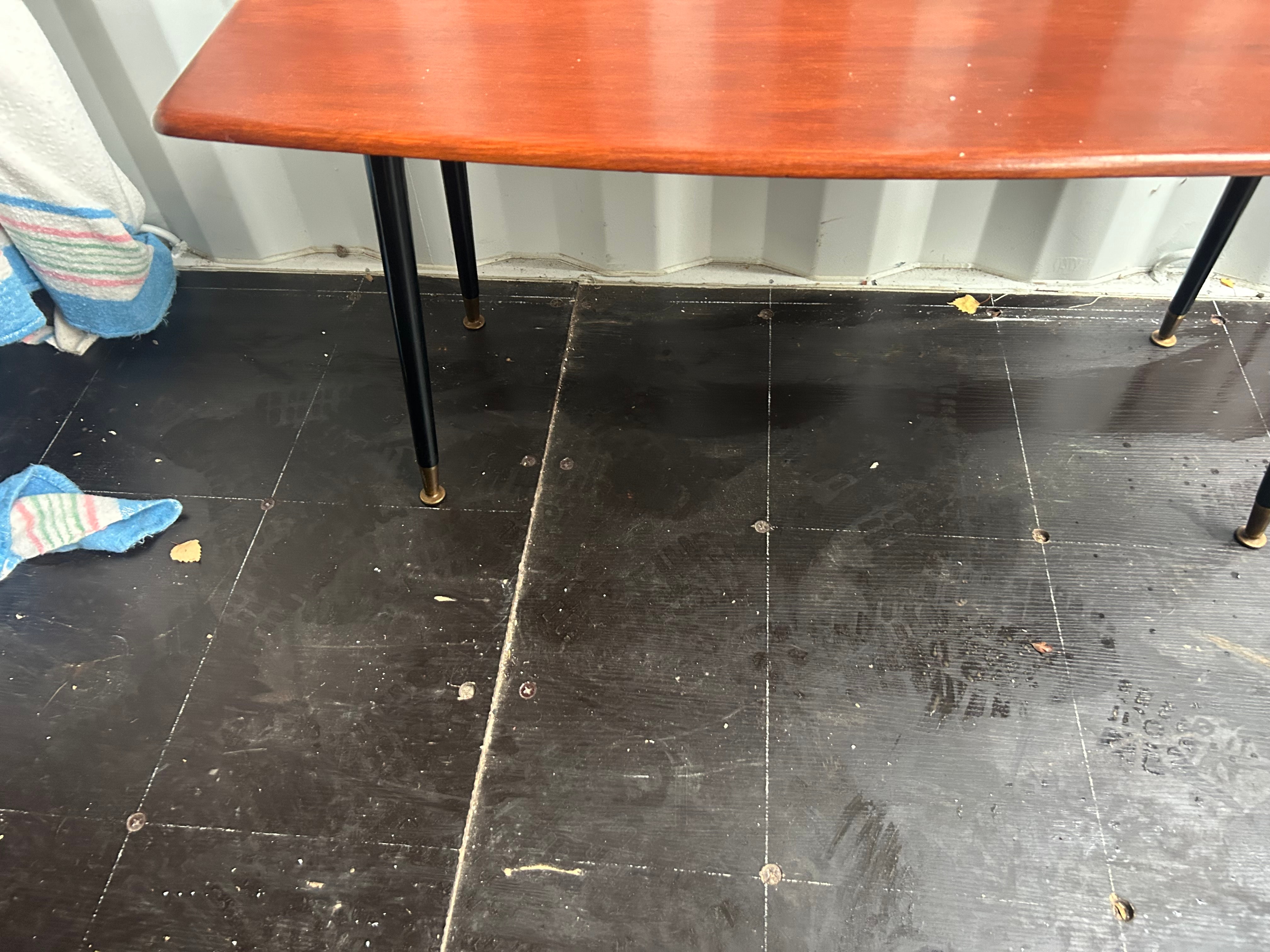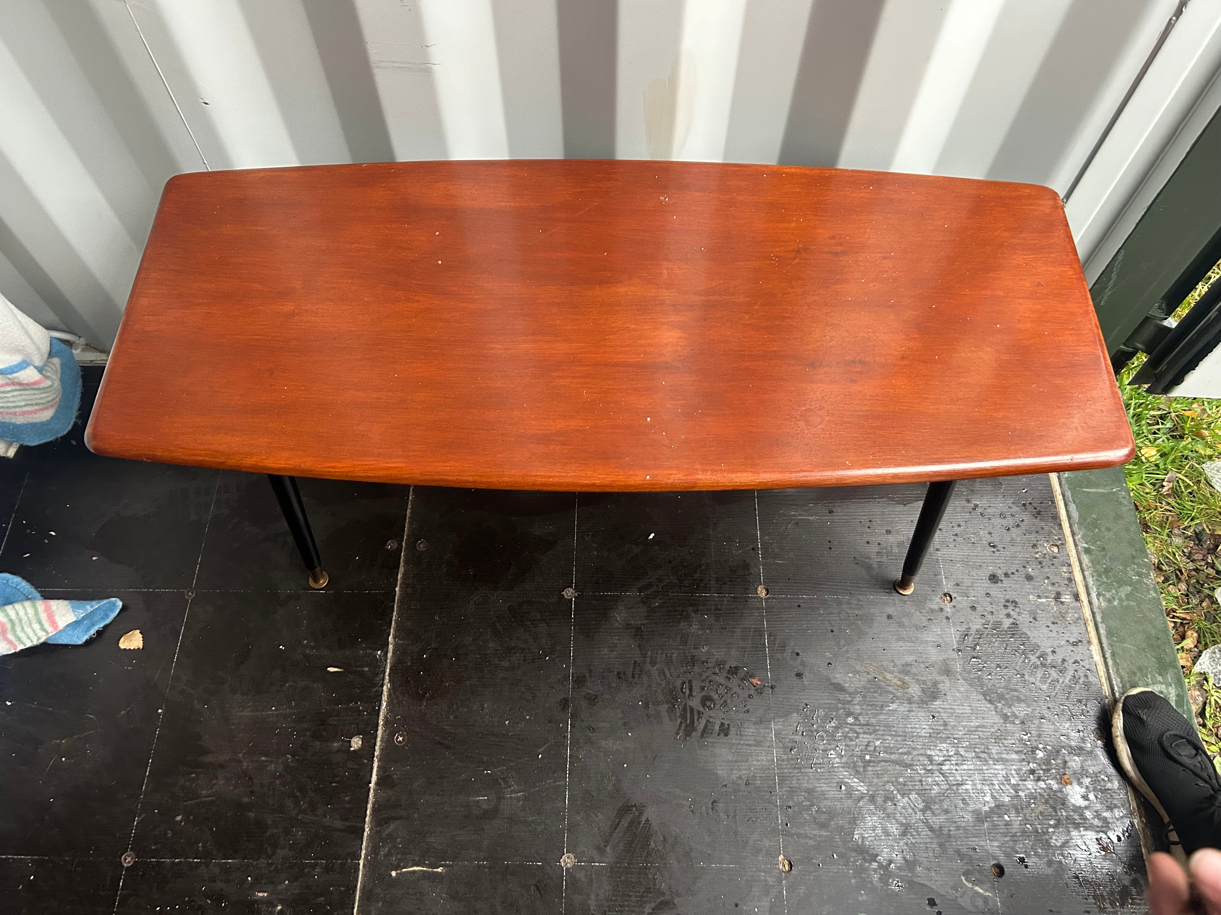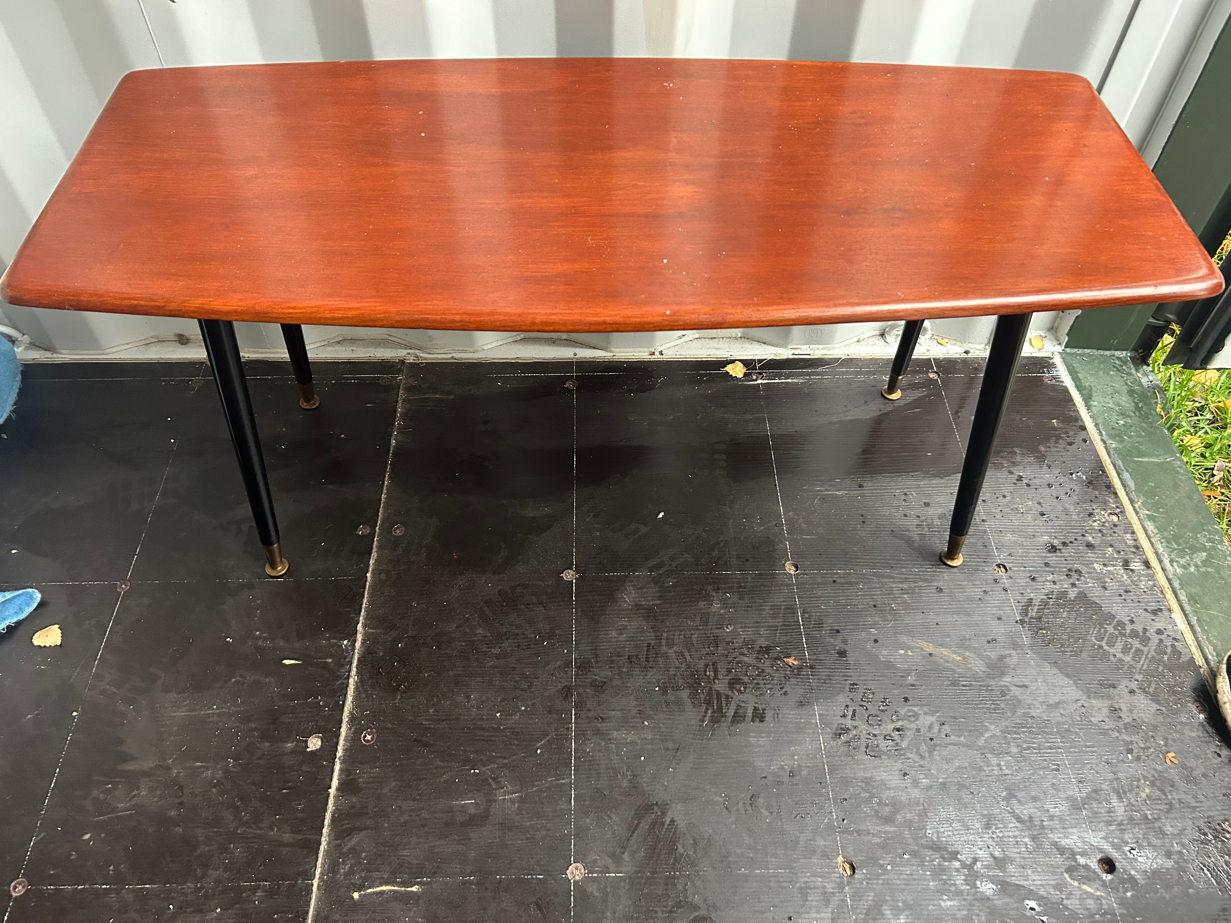 A Mid-Century Modern coffee table, dating from the 1950s or 1960s. The table features an elongated rectangular tabletop with gently curved short ends, crafted from a reddish-brown wood or wood veneer. It stands on four outwardly angled, tapered legs finished in black, each terminating in a brass or gold-toned metal cap.