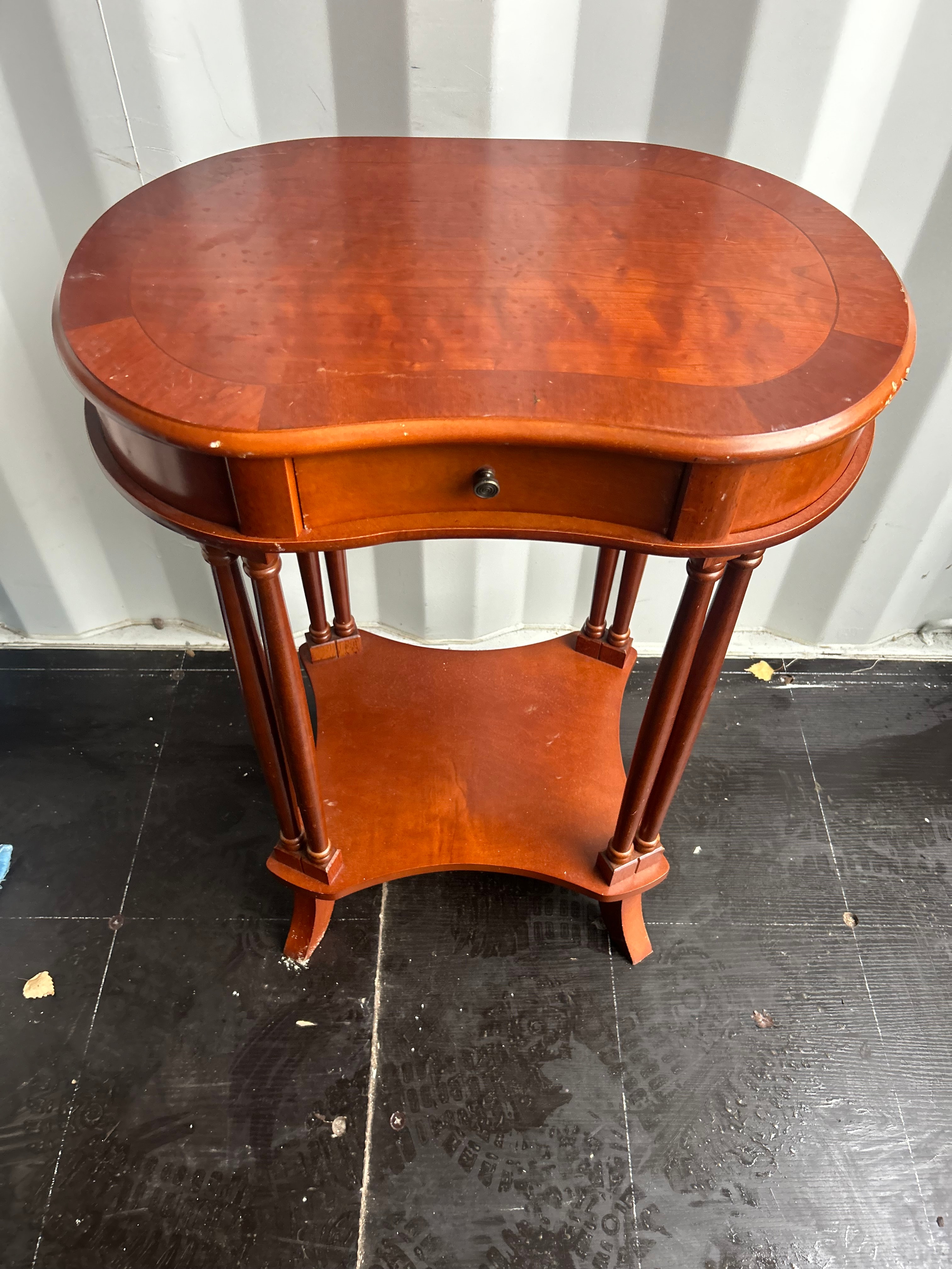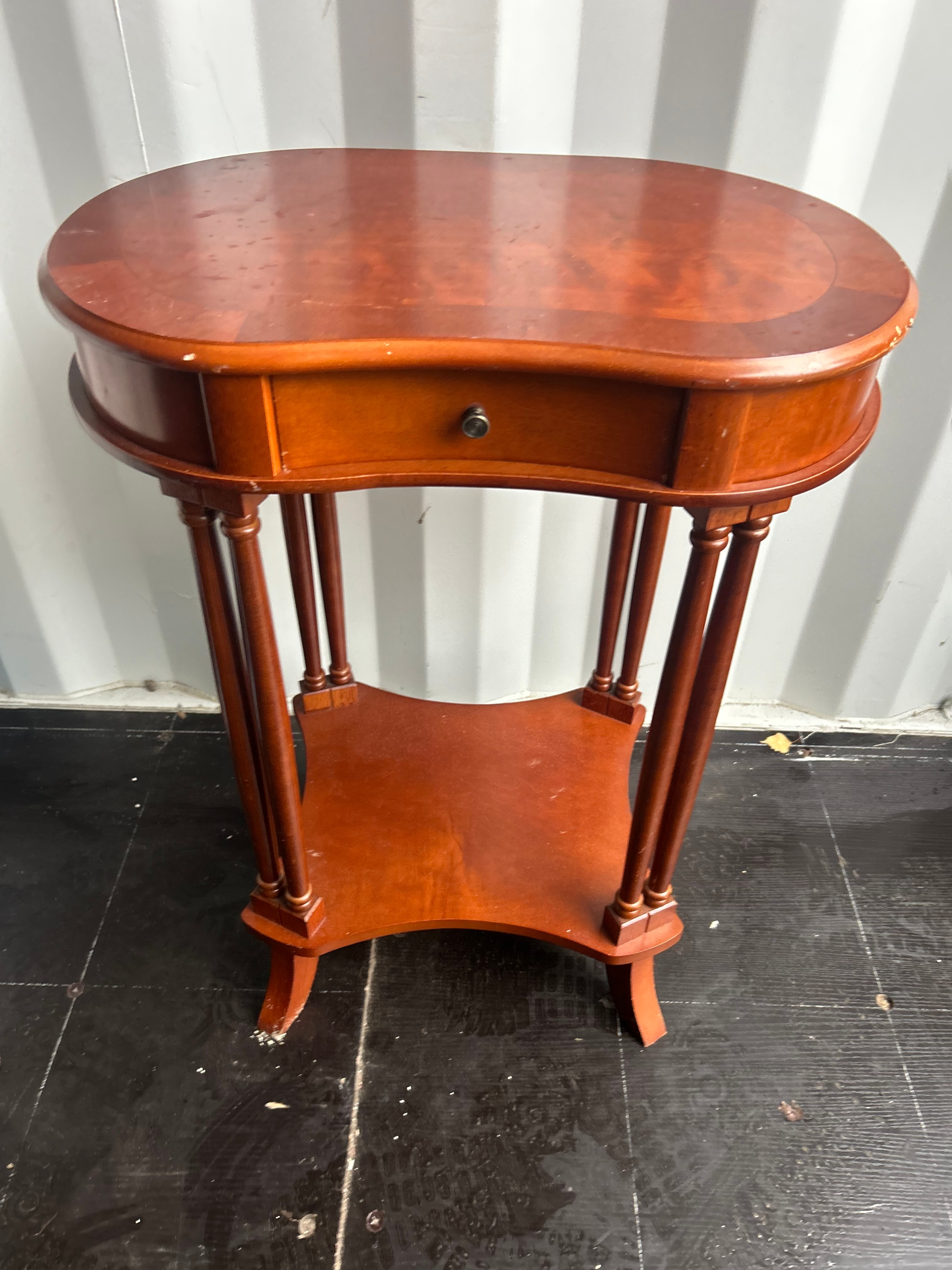An oval-top accent table constructed of wood with a reddish-brown, possibly cherry or mahogany-toned, stain. It features a recessed central panel on the tabletop that suggests a faux inlay border. The table includes a single drawer with a dark, possibly metal, knob, and stands on four turned legs connected by a shaped lower shelf, terminating in subtly splayed feet. Stylistically, it leans towards traditional or revival designs, likely dating from the mid-to-late 20th century or later.