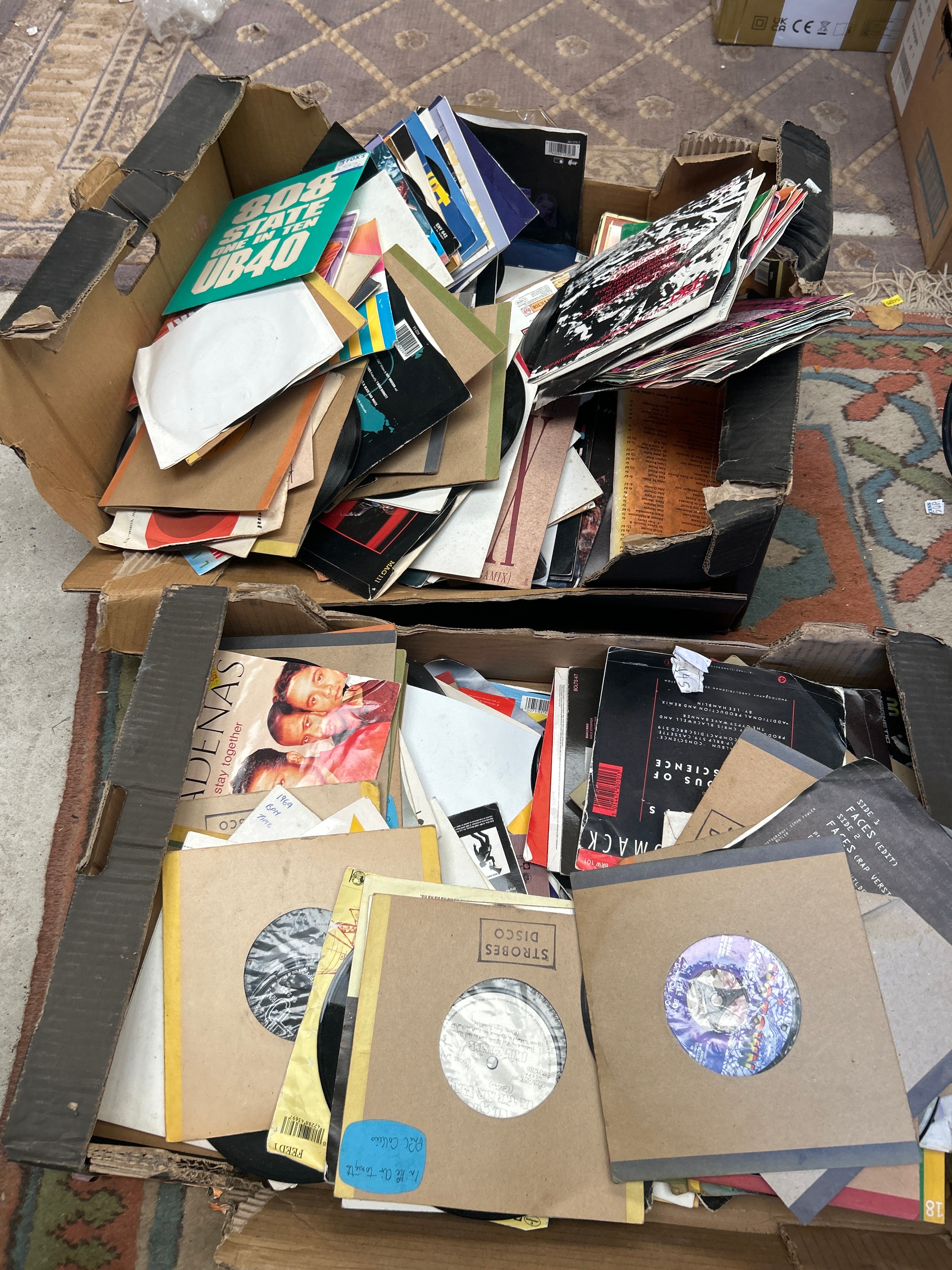 A substantial collection of predominantly vinyl records, comprising both 7-inch and 12-inch singles. The records are loosely arranged within two open cardboard boxes and housed in a mix of plain white and kraft brown paper sleeves, alongside numerous colorful picture sleeves featuring various album art. Visible titles and artists include “UB40” with “One in Ten”, “ADENAS stay together”, “STROBES DISCO”, “FACES”, and “In the Air Tonight” by “Phil Collins”. Further markings include “P.D.Q. Bach”, “VICTOR” logos, barcodes, specific catalog numbers such as “BRW 101” and “MAG 111”, and a “50P” price sticker. The collection spans genres from at least the late 1960s through the 1990s.