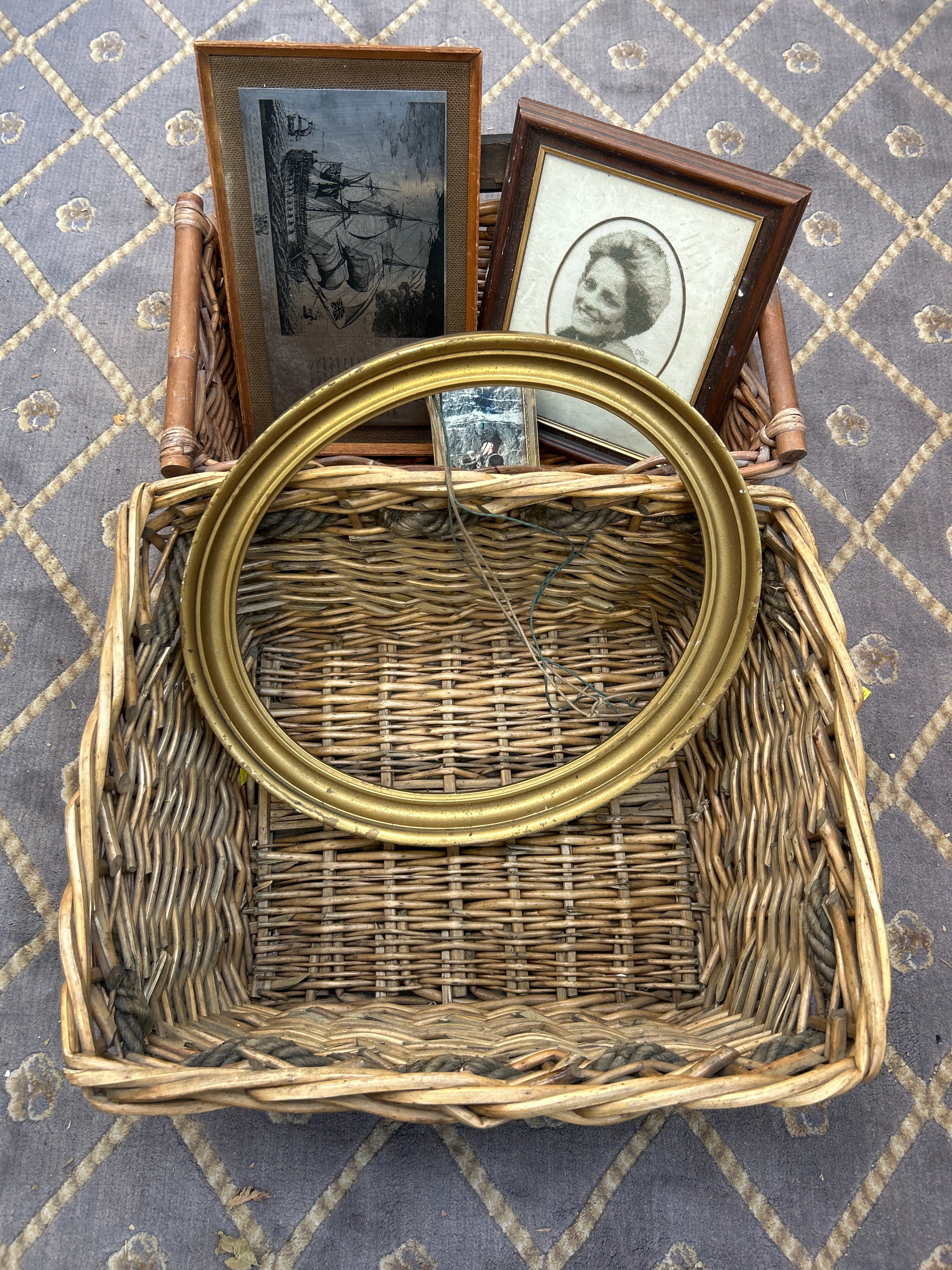 A large, rectangular hand-woven wicker gathering basket, constructed from natural wicker. Contained within are a collection of four items: a rectangular light-wood framed monochromatic engraving or lithograph depicting a large sailing warship at sea, with visible text identifying it as “Painted by C. Stanfield R.A.” and “Engraved by T. Jeavons,” suggesting an early to mid-19th century naval scene, likely titled “THE BATTLE OF…”; a rectangular dark-wood framed oval-matted photograph of a woman, likely a late 19th to early 20th-century studio portrait; a small, darkly framed modern color photograph showing a figure in a mountain landscape; and an empty, ornate, gilded or gold-painted oval picture frame with a deep profile.