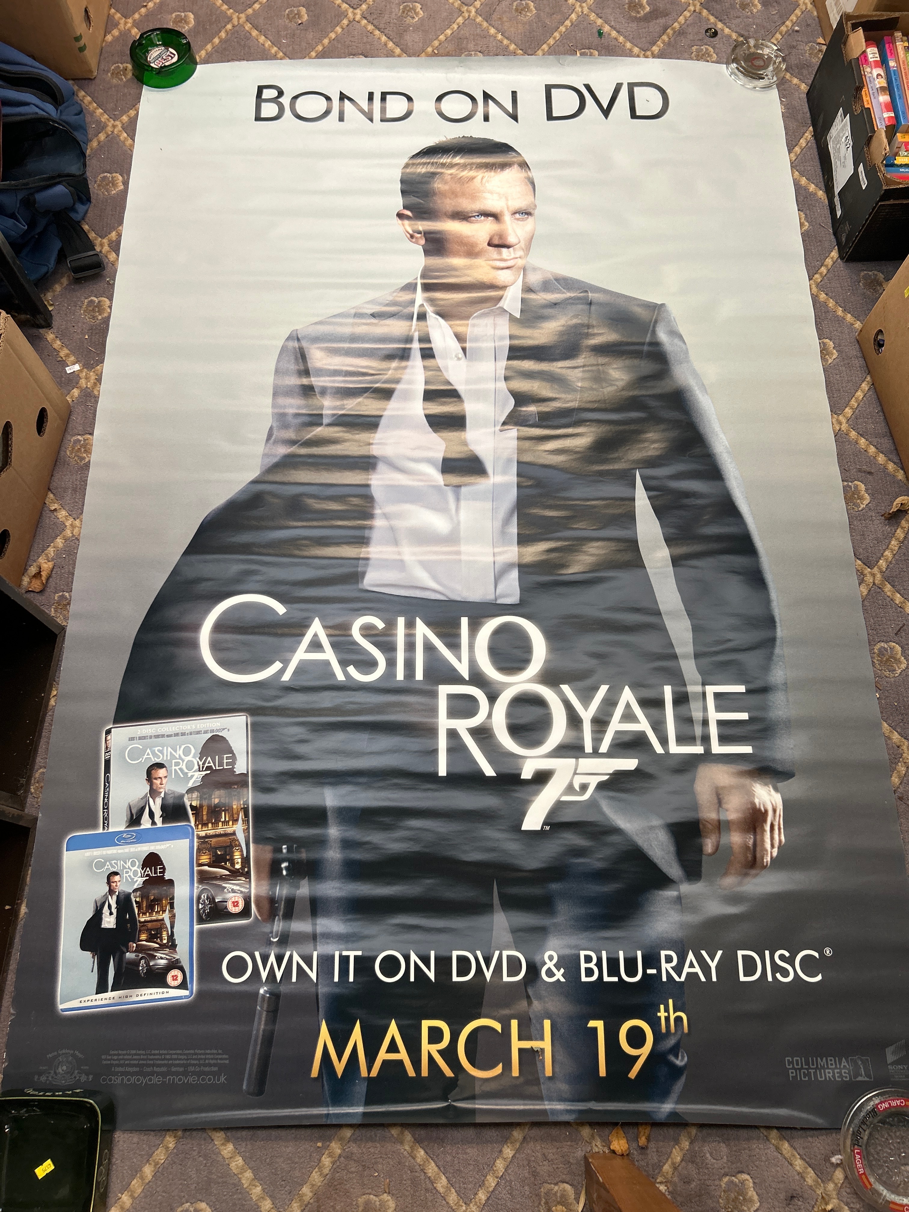 An original promotional poster for the film ‘Casino Royale’, depicting actor Daniel Craig as James Bond. This large format poster, made of a flexible paper or similar material, features the prominent text “BOND ON DVD” at the top, with “CASINO ROYALE 007” displayed largely below the central figure. Further promotional text reads “OWN IT ON DVD & BLU-RAY DISC” and “MARCH 19th,” indicating a release date for home media. Visuals of the DVD and Blu-ray packaging, including a “2-DISC COLLECTOR’S EDITION” and a “12” age rating, are present in the lower left corner. Logos for “COLUMBIA PICTURES” and “SONY” are visible at the bottom right, alongside small print detailing a “© 2006 Danjaq, LLC and United Artists Corporation” copyright and co-production notes (“United Kingdom – Czech Republic – German – USA Co-Production”), with a website address “casinoroyale-movie.co.uk”.