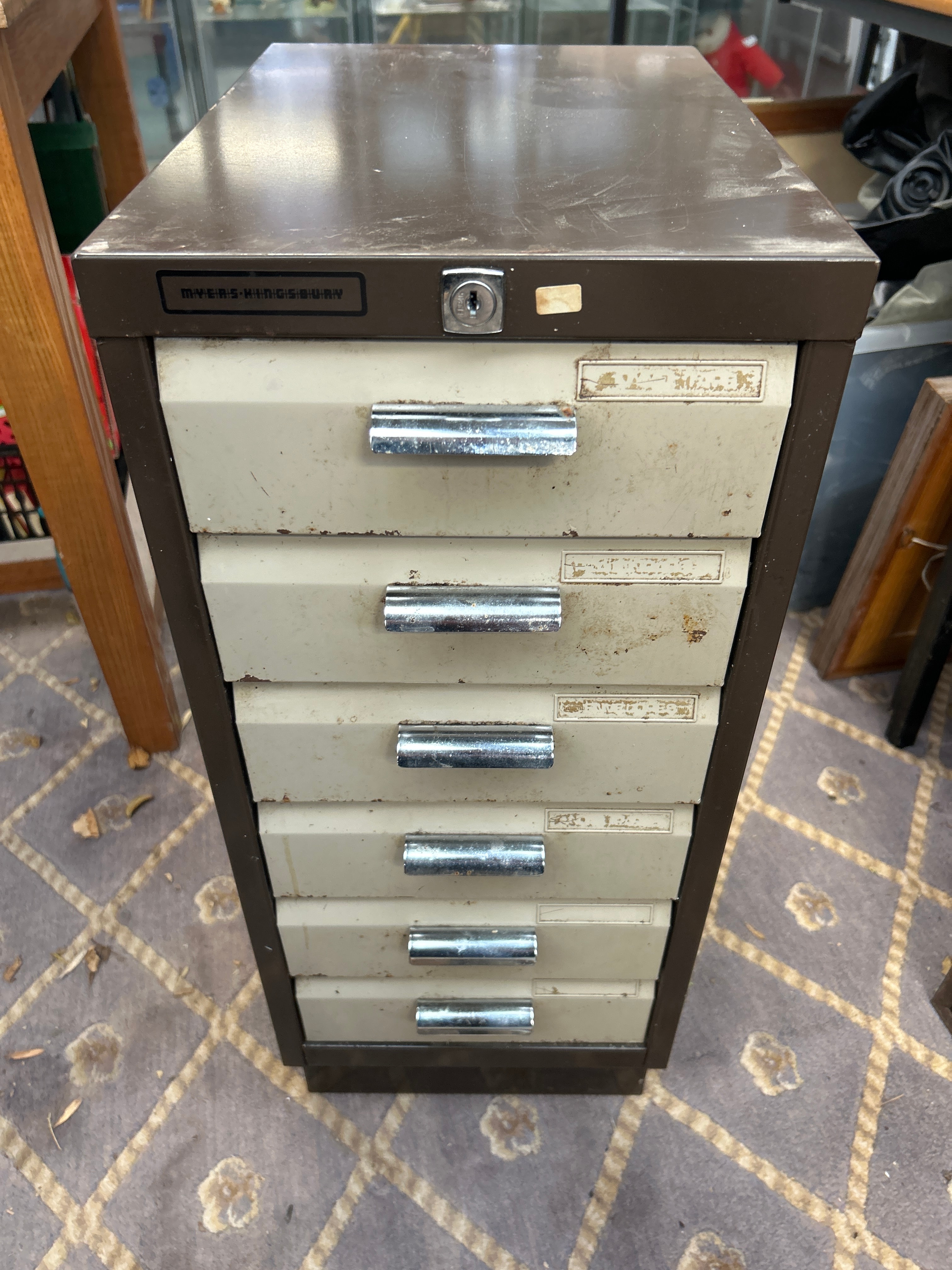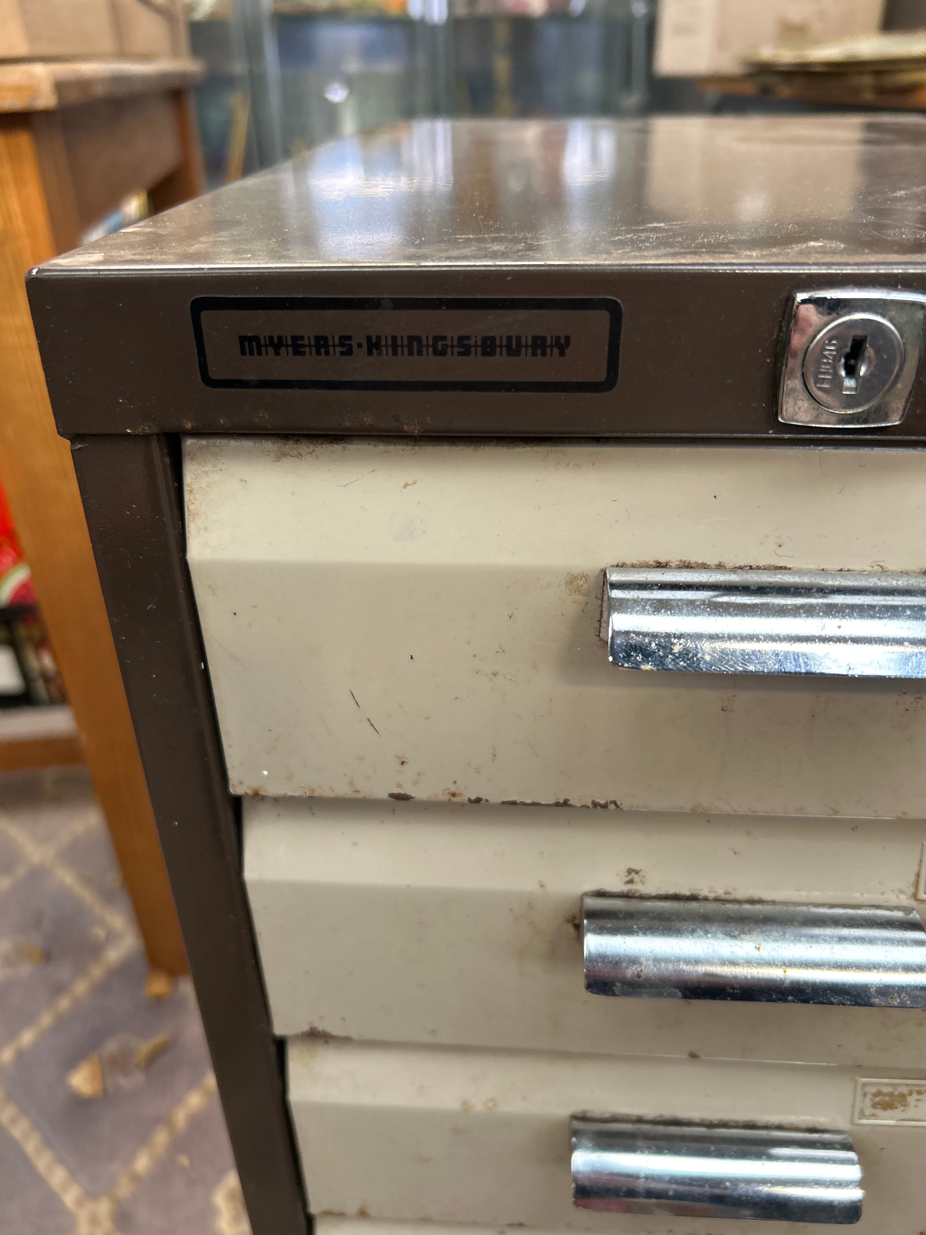 A Myers-Kingsbury six-drawer vertical metal storage cabinet, likely a card catalog or small parts organizer, in a mid-20th century industrial style. It features a two-tone design with a dark brown painted frame and light beige painted steel drawer fronts. Each shallow drawer is equipped with a chrome-plated pull handle and a paper label holder; some contain faded, handwritten content, with “VALVE” faintly discernible on one. The top front of the cabinet bears a rectangular manufacturer’s label reading “MYERS-KINGSBURY” and a keyhole lock mechanism marked “ALCO”.