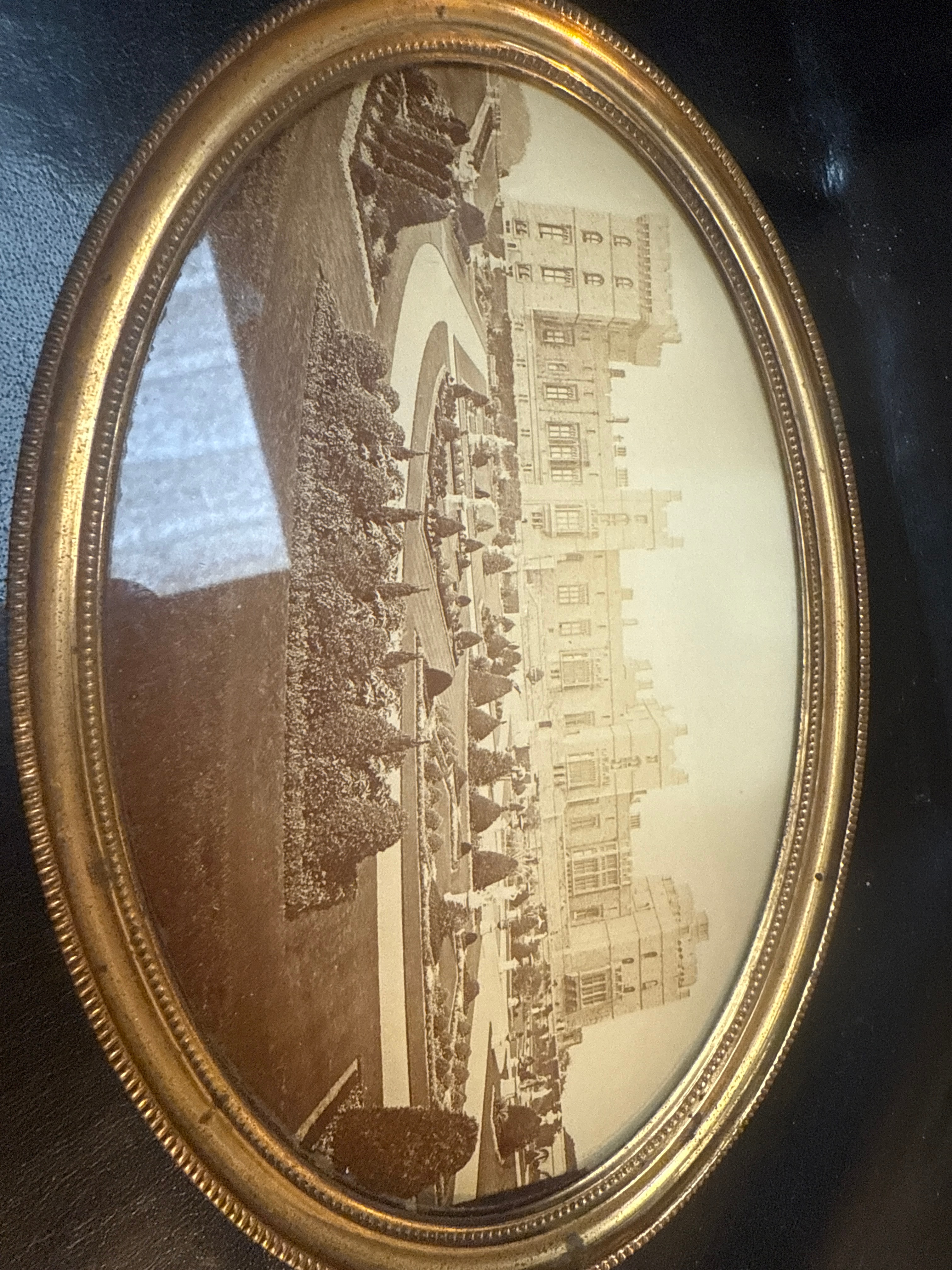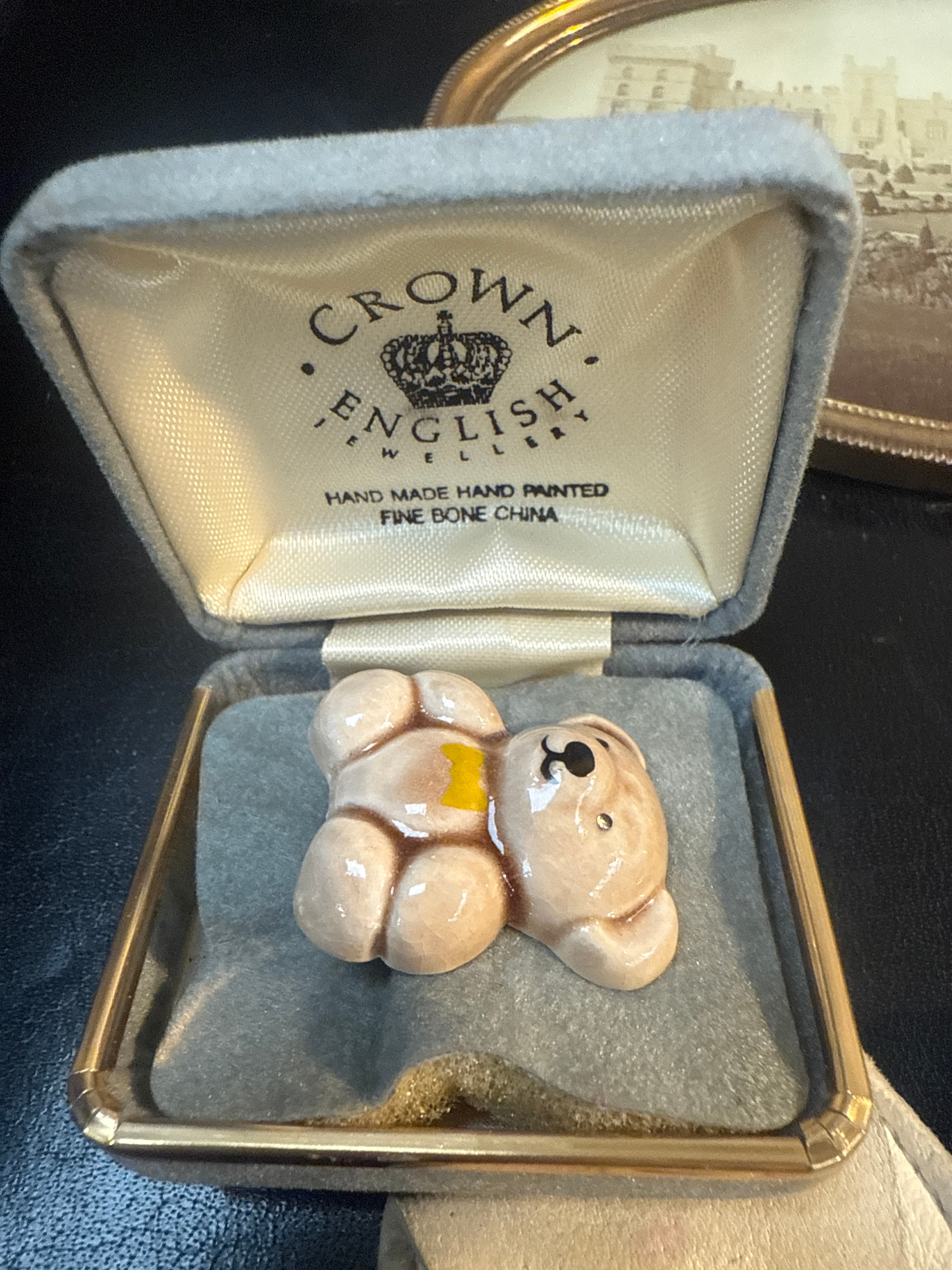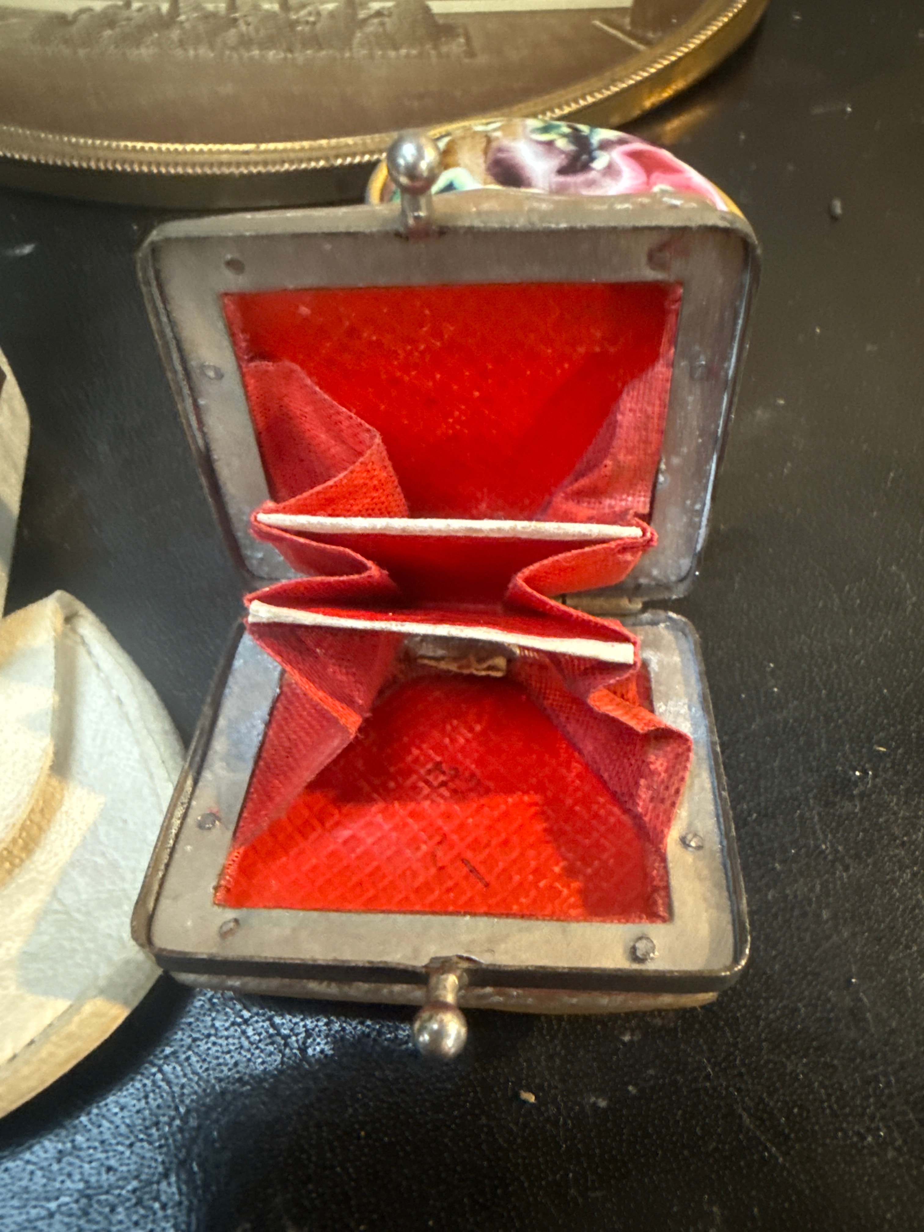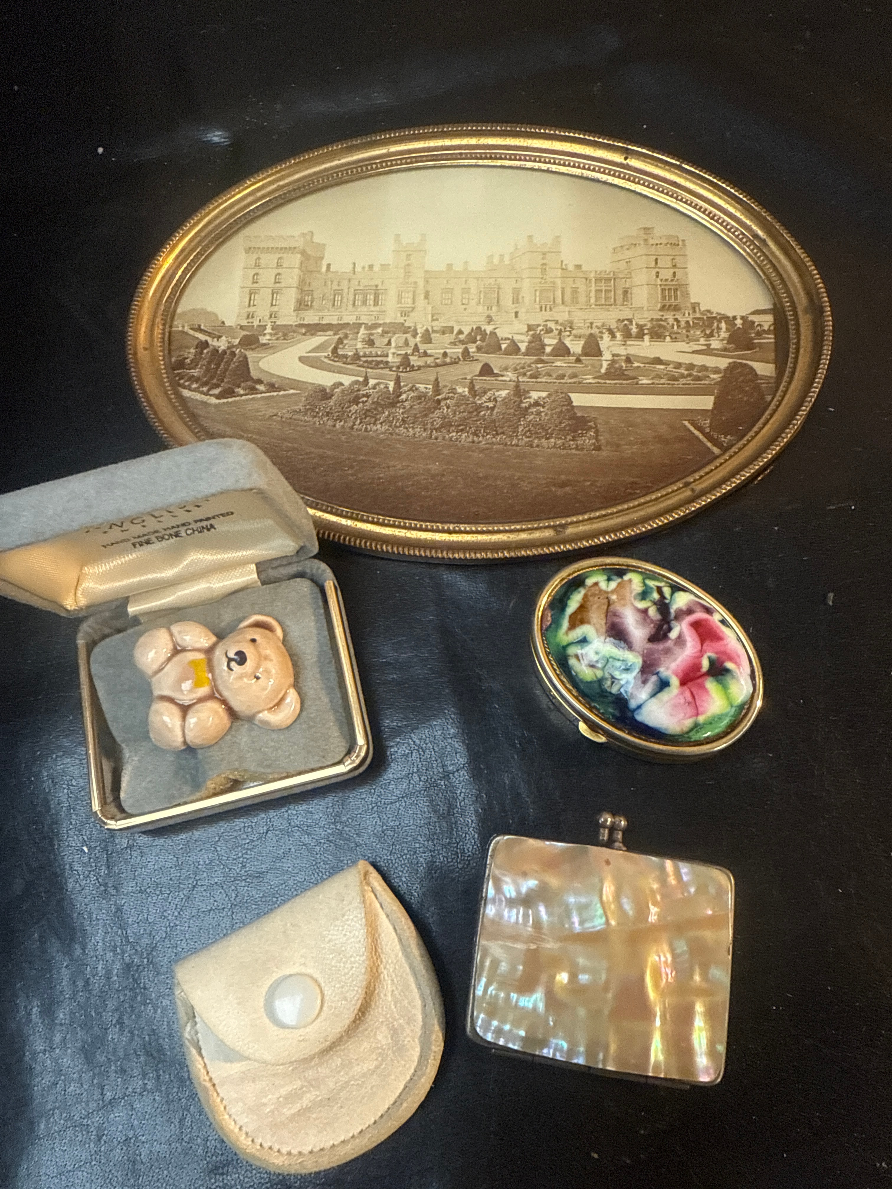 A group of five decorative objects. Comprising an oval, gilded brass frame with beaded detailing, housing a sepia-toned photographic print of a large historic castle or stately home with formal gardens, likely early 20th-century, visually similar to Windsor Castle. Also included is a small, glazed “FINE BONE CHINA” hand-painted teddy bear figurine/brooch, presented in its original grey velvet and satin box, marked “CROWN ENGLISH WELLER” (English, Hand Made Hand Painted Fine Bone China). The collection further includes an oval, gold-toned metal hinged box featuring a vibrant multi-colored enamel or stone inlay top with abstract or floral motifs, and a rectangular hinged box crafted from iridescent mother-of-pearl panels, which opens to reveal a red accordion-style fabric interior, suggesting a coin purse. The lot is completed by a small, light-colored leather or faux leather pouch secured by a pearl-style button closure.