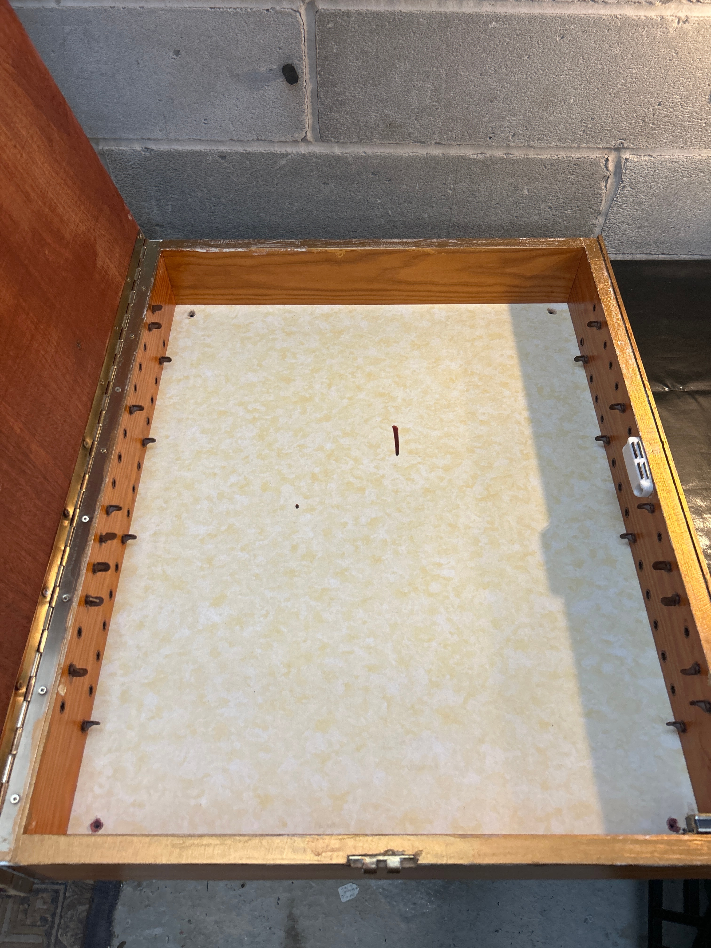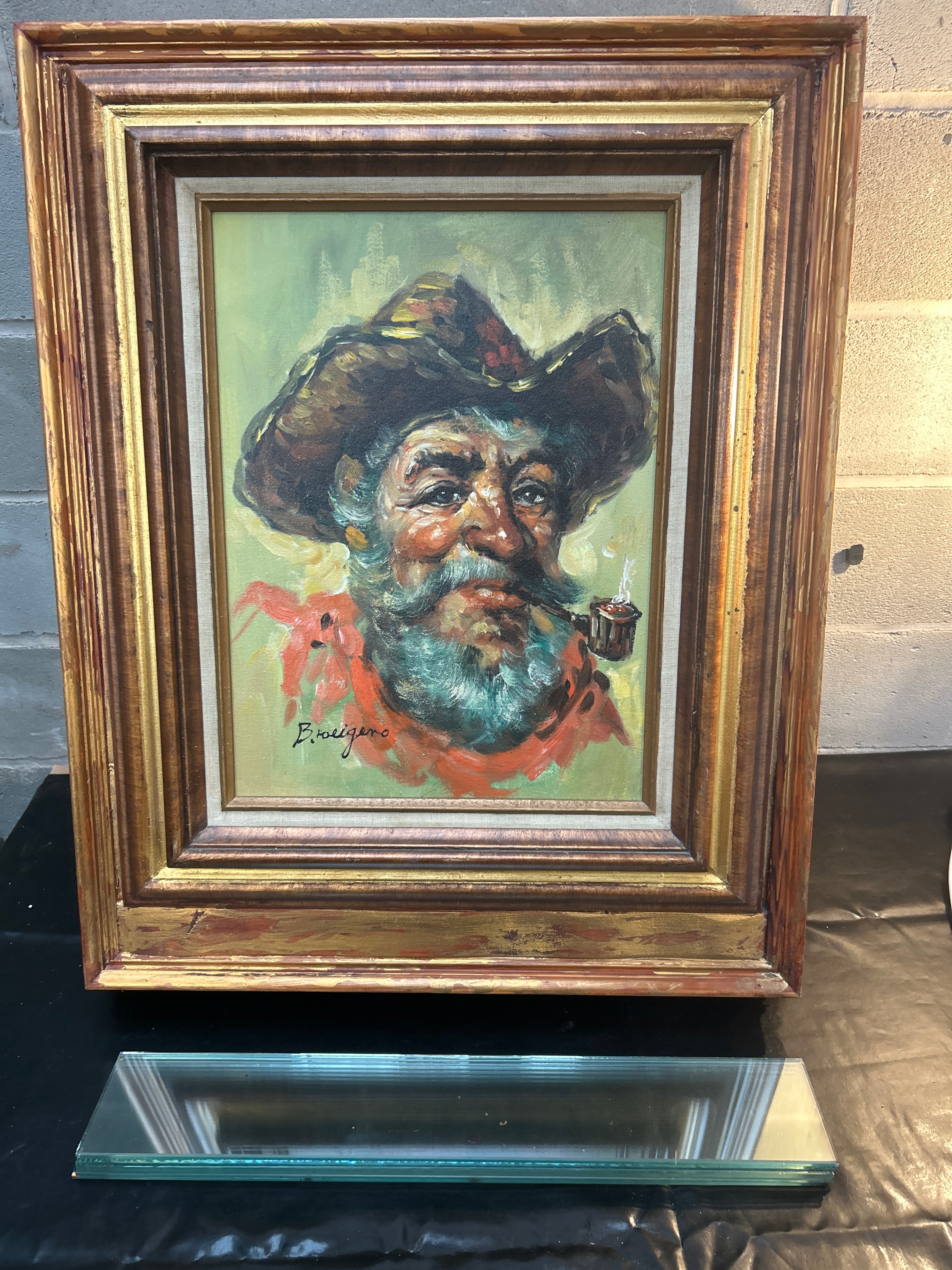 An oil painting by F. Di Sciascio, depicting a character portrait of a bearded man wearing a wide-brimmed hat and a red scarf, smoking a pipe. The artwork is executed in an illustrative style, likely dating to the mid-20th century, and is signed “F. Di Sciascio” in the lower left corner. It is housed in a multi-toned wooden frame with a gold-colored inner fillet and a darker wood outer section. A view of the reverse reveals that the framed painting serves as the lid of a wooden box, with the artwork affixed to the inside. The box interior features numerous small wooden pegs lining the sides, and the base is covered with a light-colored, speckled material, marked with a faint red “I” and an illegible white sticker, suggesting its potential use as a game box or specialized storage.