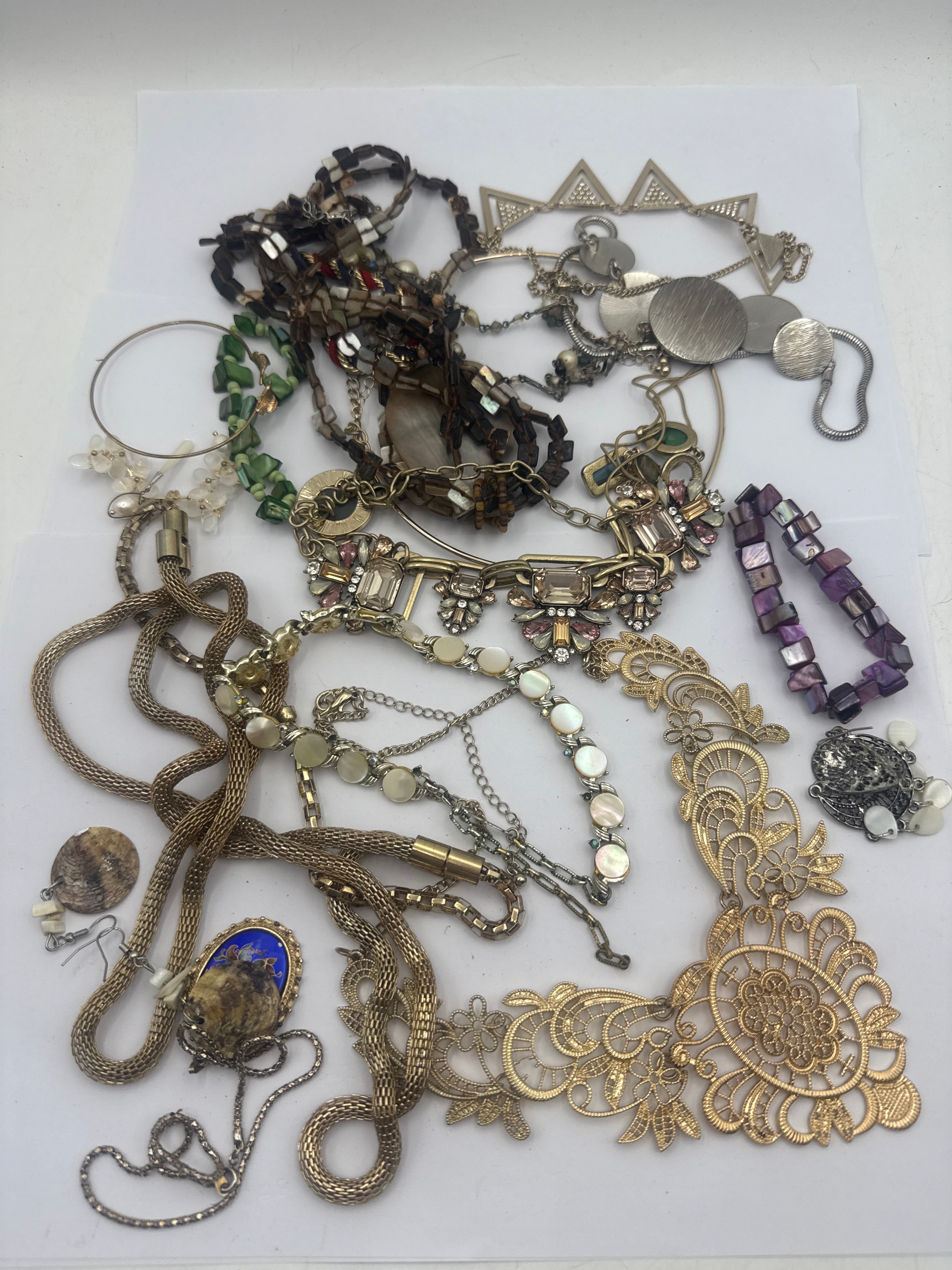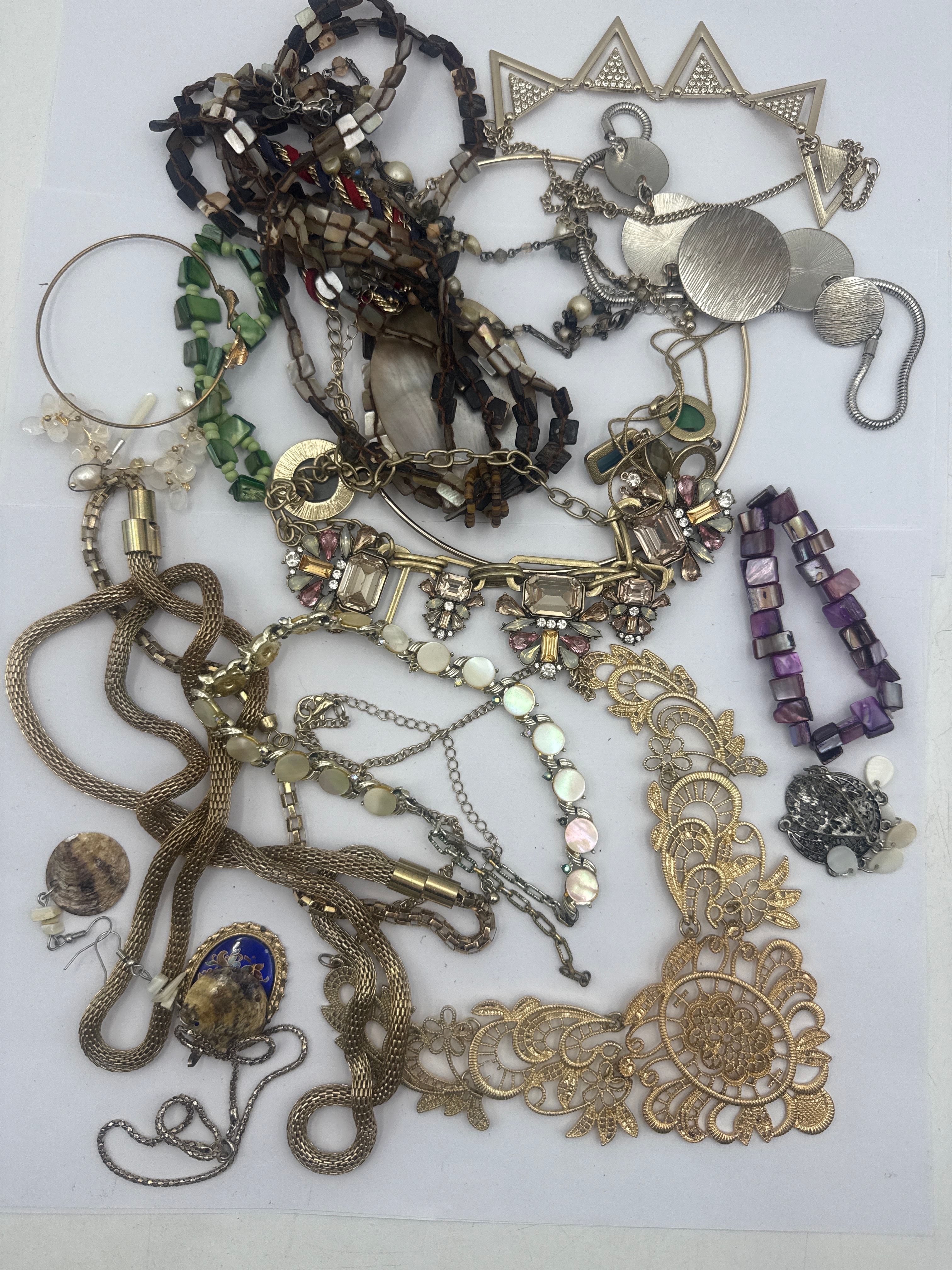 A mixed lot of costume jewelry, comprising necklaces, bracelets, and earrings in a variety of styles, predominantly late 20th to contemporary fashion. Materials include gold-tone and silver-tone base metals, various glass and plastic beads, natural stones such as shell and what appear to be amethyst-like elements, mother-of-pearl, and numerous clear and colored rhinestones. The styles range from multi-strand beaded pieces and filigree designs to minimalist metalwork and decorative items featuring larger stone-like components. No discernible text, maker’s marks, or hallmarks are visible.