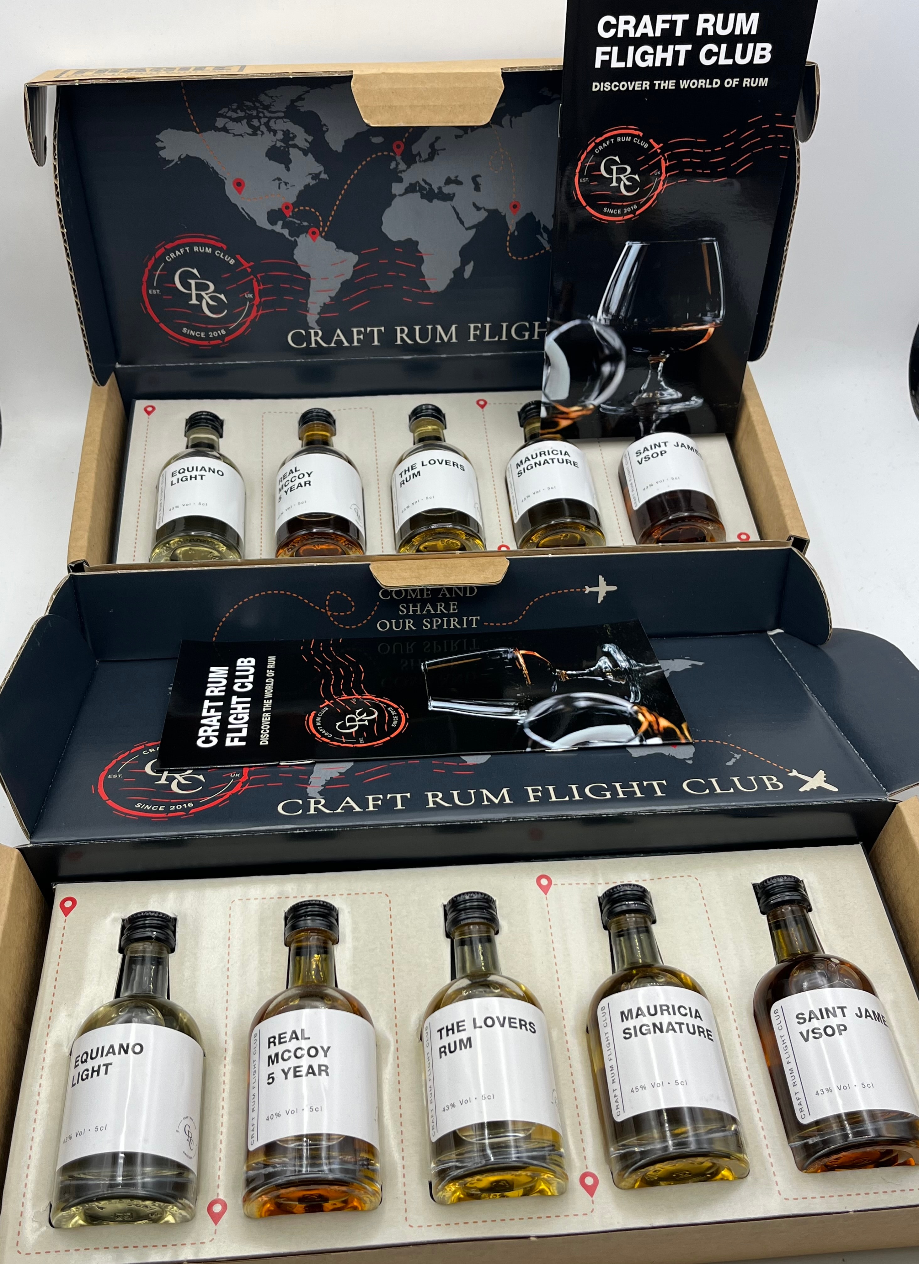 A Craft Rum Flight Club Tasting Set, presented in its original cardboard box packaging. The black interior of the box features a world map graphic and the “GRC” logo with “EST. SINCE 2016 UK,” alongside text reading “CRAFT RUM FLIGHT CLUB” and “DISCOVER THE WORLD OF RUM.” The set contains a set of five miniature clear glass bottles, each with a black screw cap and a white label, indicating 5cl of rum at 43% Vol. The rums are individually labeled: ‘EQUIANO LIGHT,’ ‘REAL MCCOY 5 YEAR,’ ‘THE LOVERS RUM,’ ‘MAURICIA SIGNATURE,’ and ‘SAINT JAMES VSOP.’ A coordinating “Craft Rum Flight Club” brochure is also included.