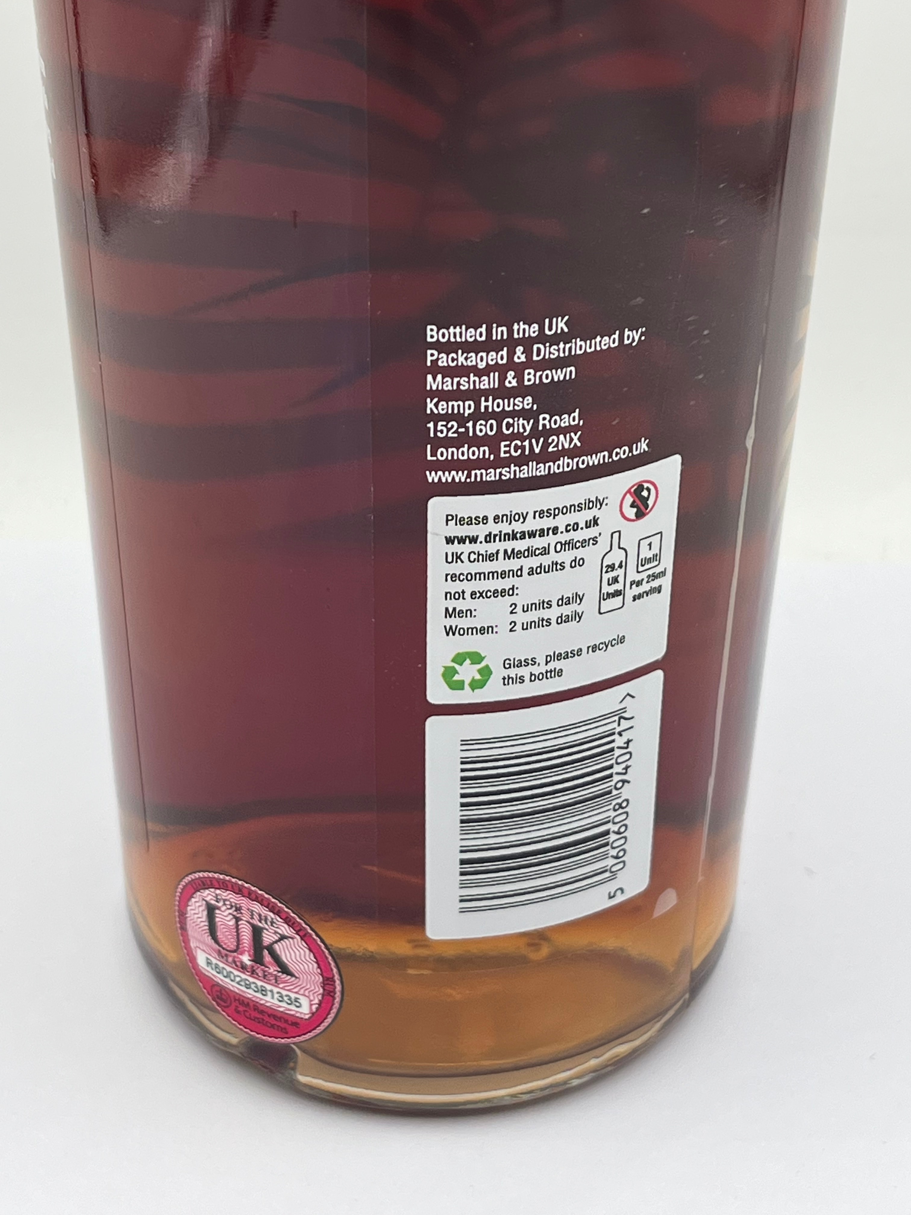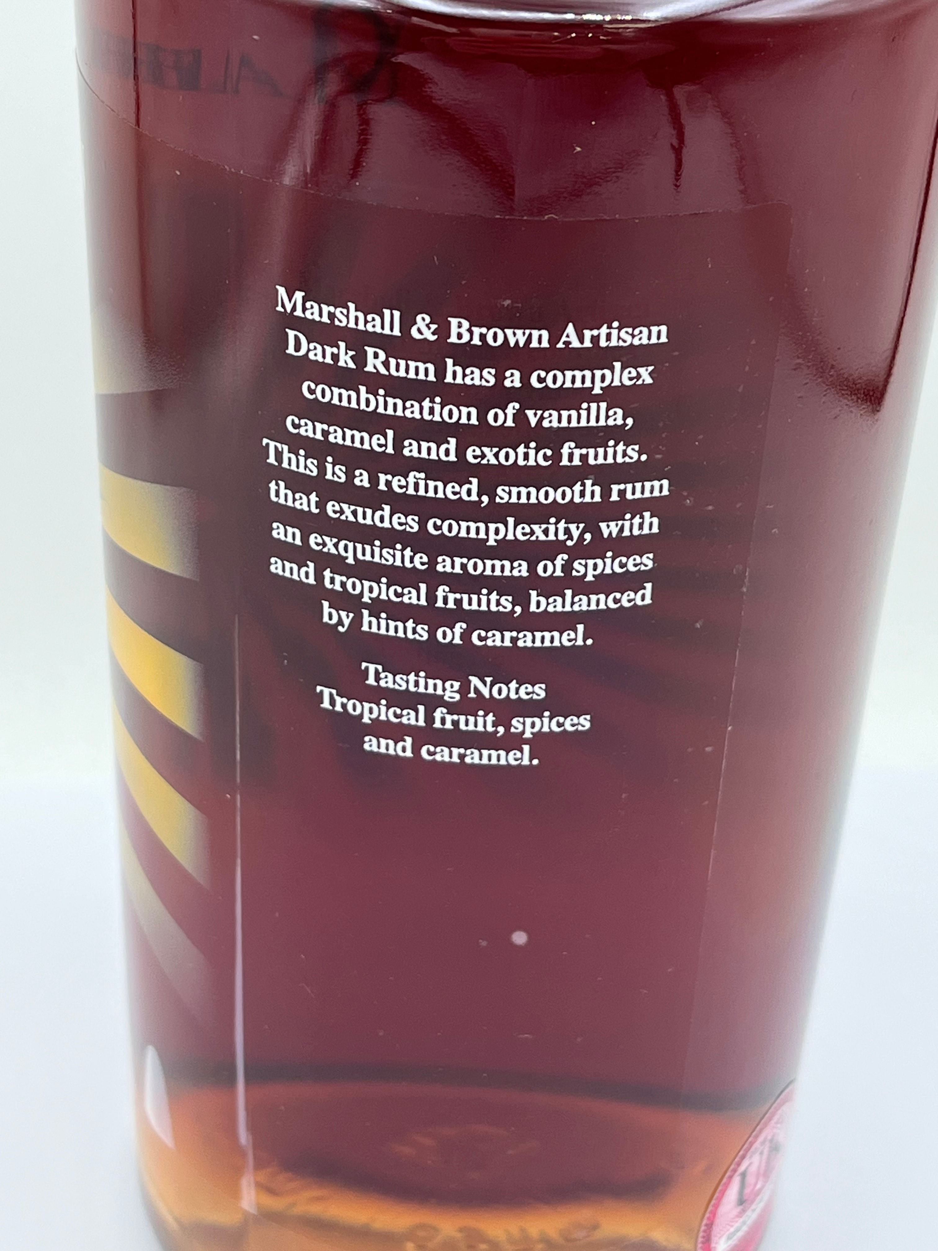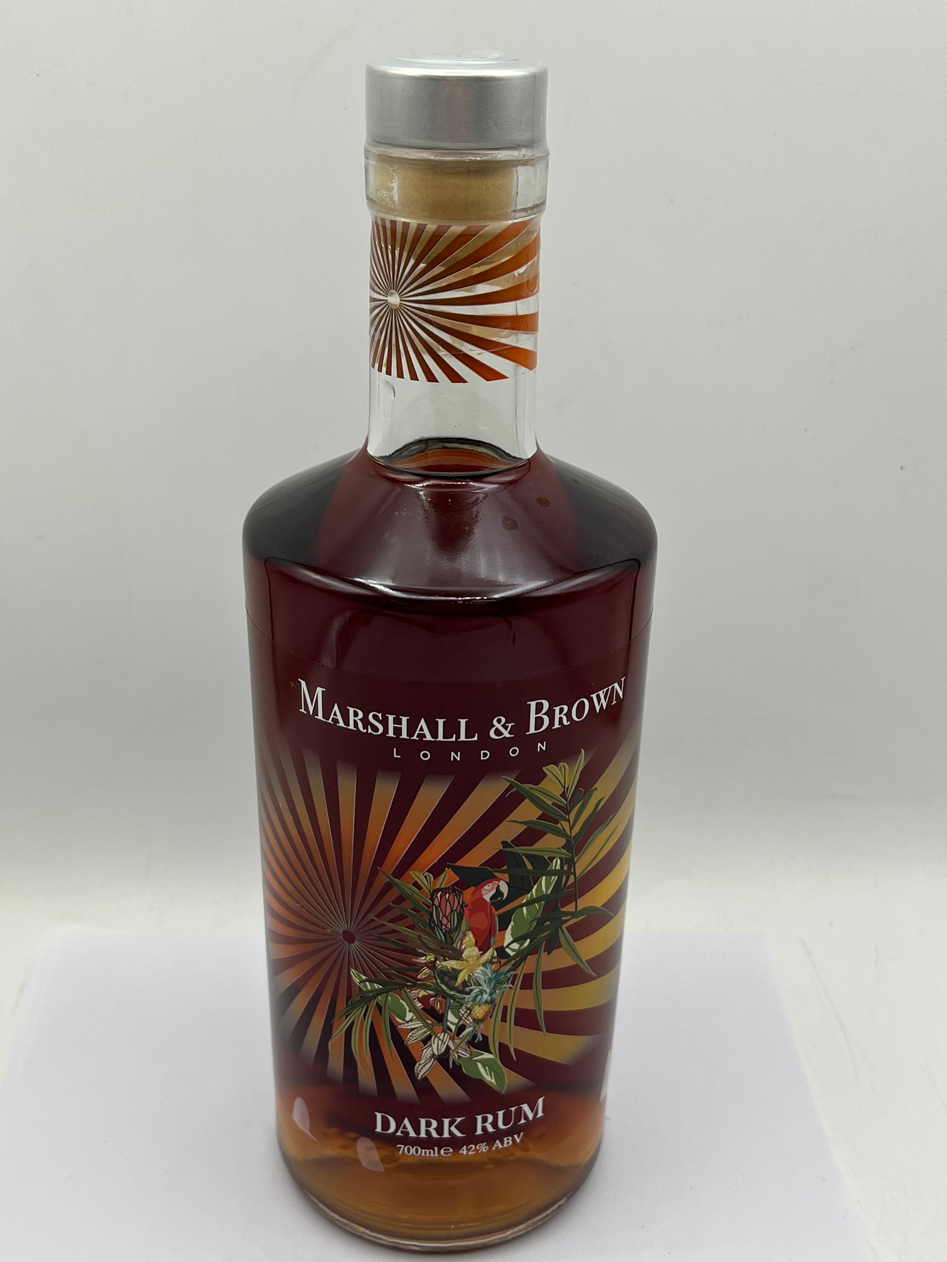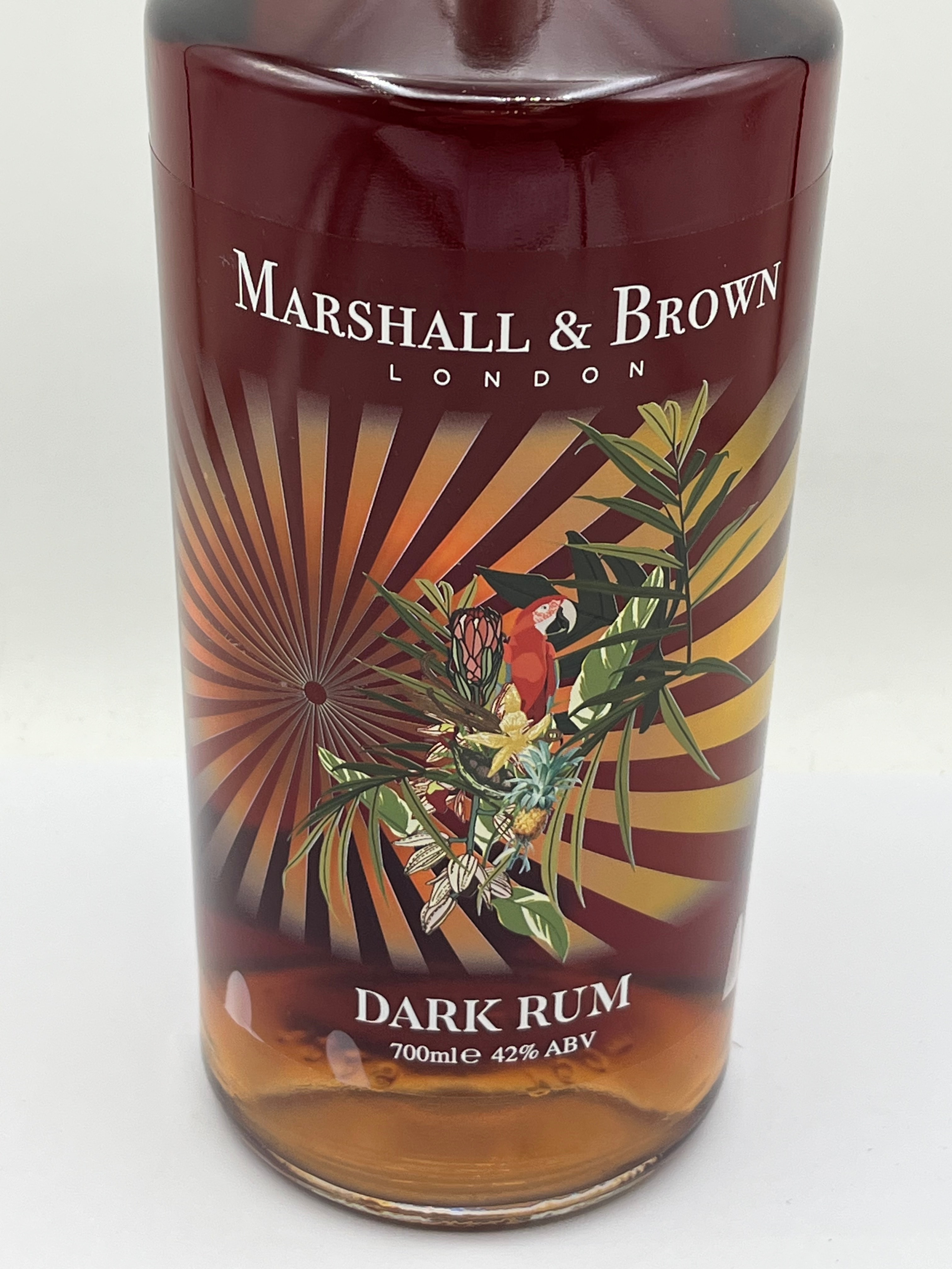 A bottle of Marshall & Brown Artisan Dark Rum, 70cl. This modern glass bottle is sealed with a cork stopper and metallic cap. The front label features a tropical-themed design with a parrot, exotic foliage, and flowers against an orange and gold sunburst background. Visible text includes ‘DARK RUM’ and ‘700mle 42% ABV’. The reverse label provides details such as ‘Bottled in the UK’, distributor information (Marshall & Brown, London), responsible drinking guidelines (UK Chief Medical Officers’ recommendations, drinkaware.co.uk), a barcode, and a UK Duty Paid stamp. Tasting notes describe it as an ‘Artisan Dark Rum’ with hints of vanilla, caramel, and tropical fruits. The bottle appears full and unopened.