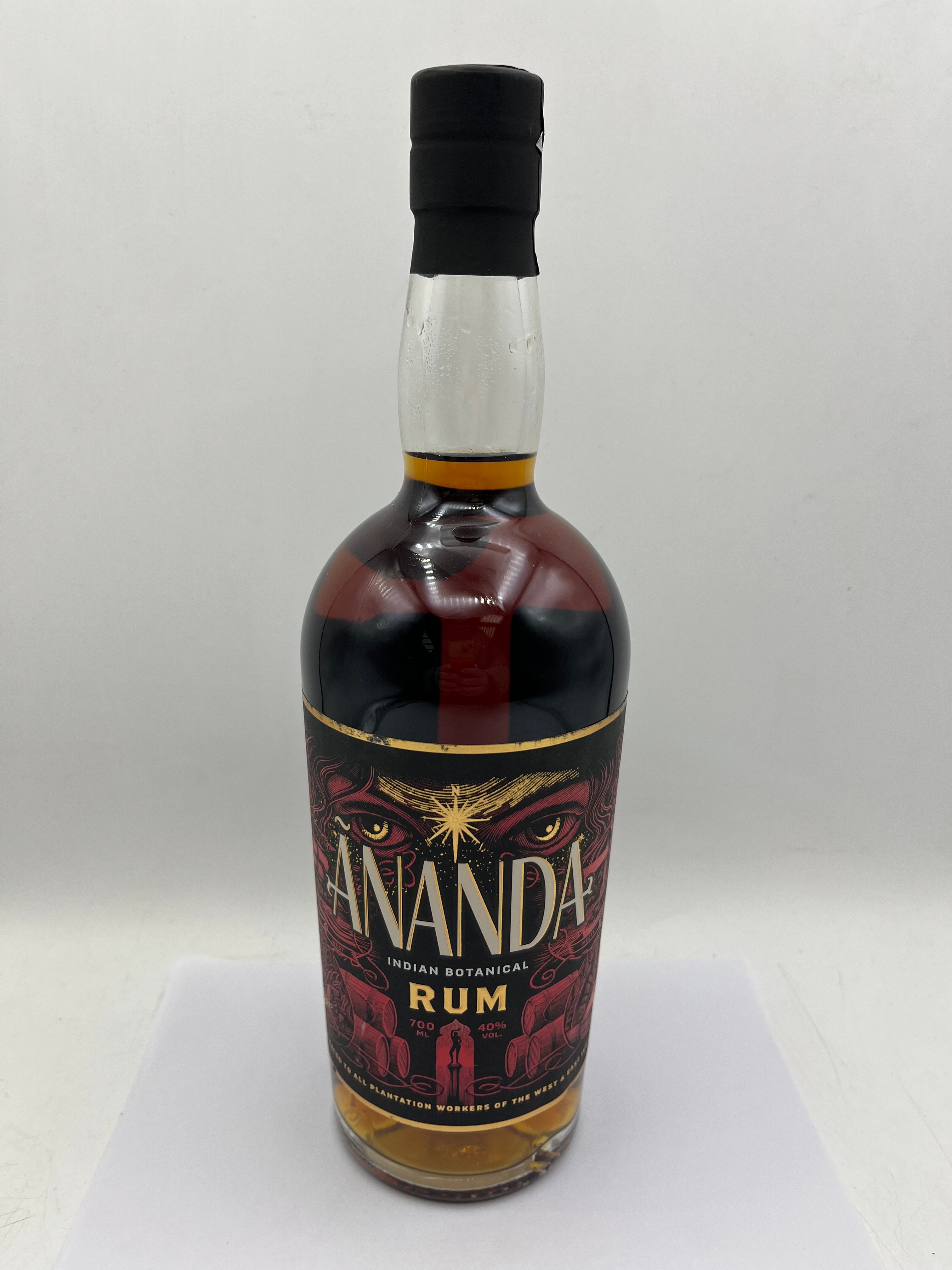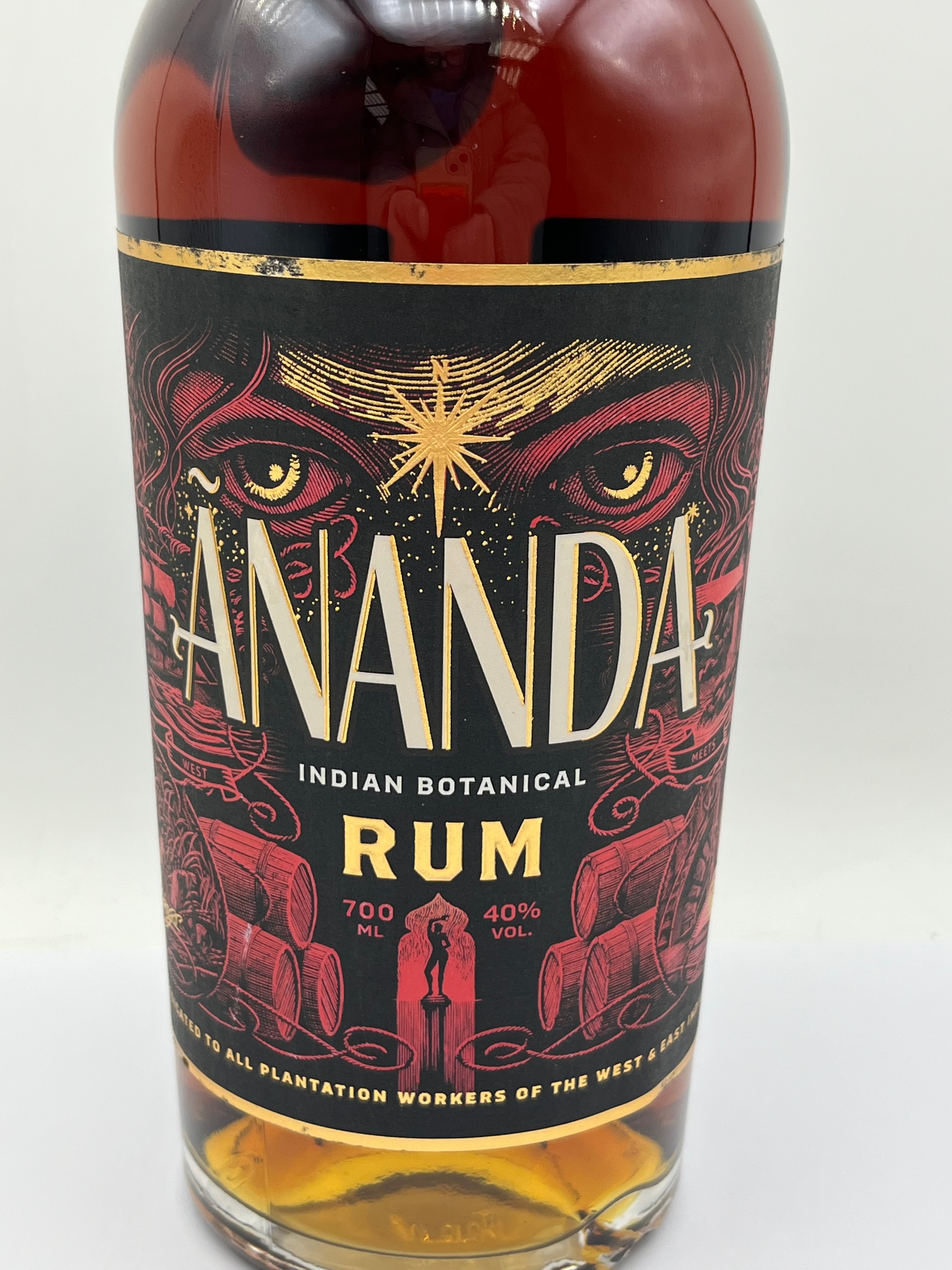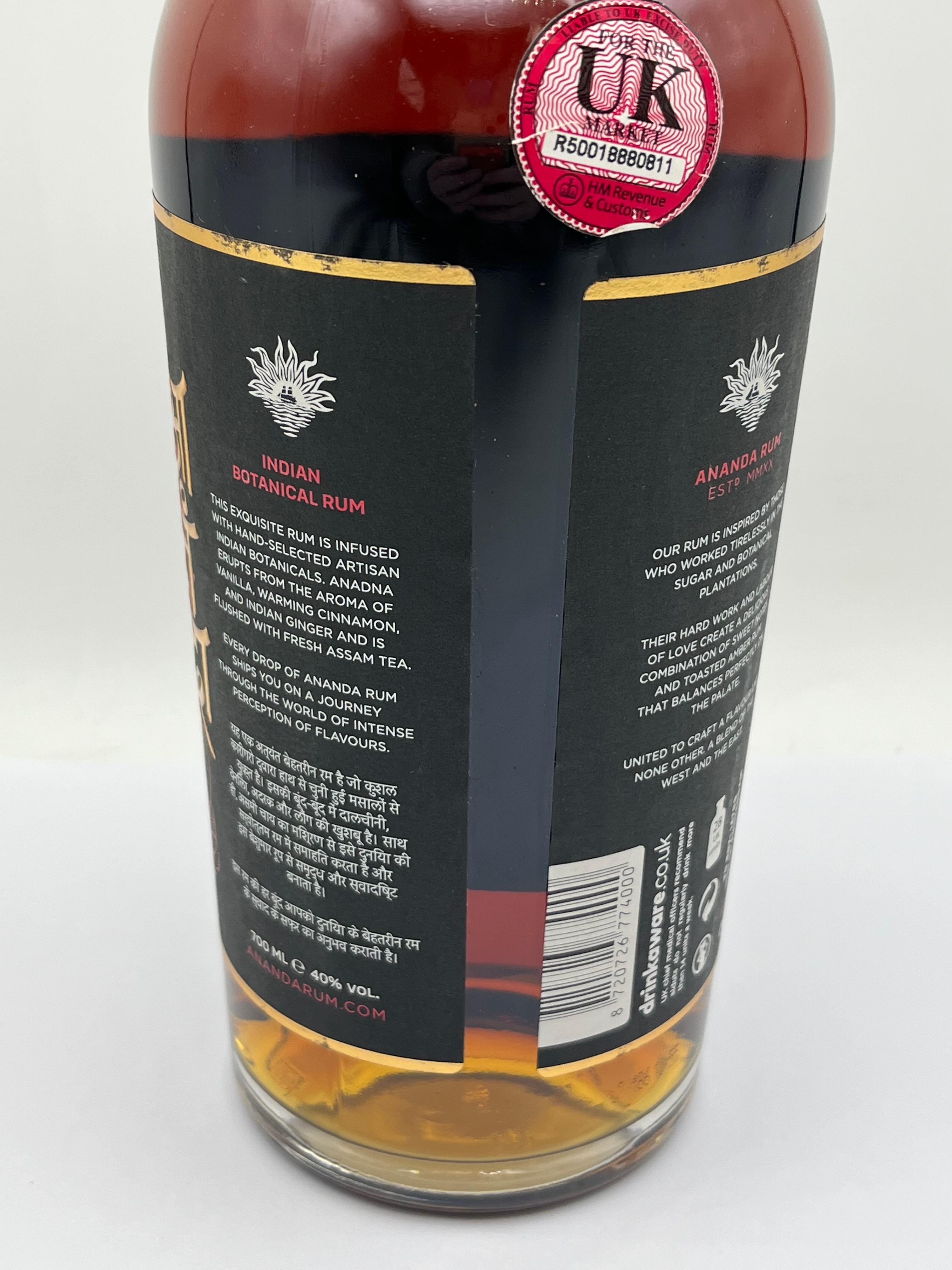A modern, factory-sealed glass bottle of Ananda Indian Botanical Rum. This dark amber liquid, at 40% Vol., is contained within a clear glass bottle featuring a striking black paper label with red and gold printing. The design depicts stylized eyes, a starburst, barrels, and a human figure, consistent with a contemporary “Indian Botanical” theme. The front label prominently displays “ANANDA INDIAN BOTANICAL RUM.” The back label provides descriptive English text detailing its infusion with vanilla, cinnamon, ginger, and Assam tea, and a dedication to plantation workers. A block of Hindi text on the back offers a similar descriptive narrative regarding the rum’s botanicals and journey of flavors. A prominent red circular sticker states “FOR THE UK MARKET HM Revenue & Customs R500188880811,” indicating its intended distribution.
