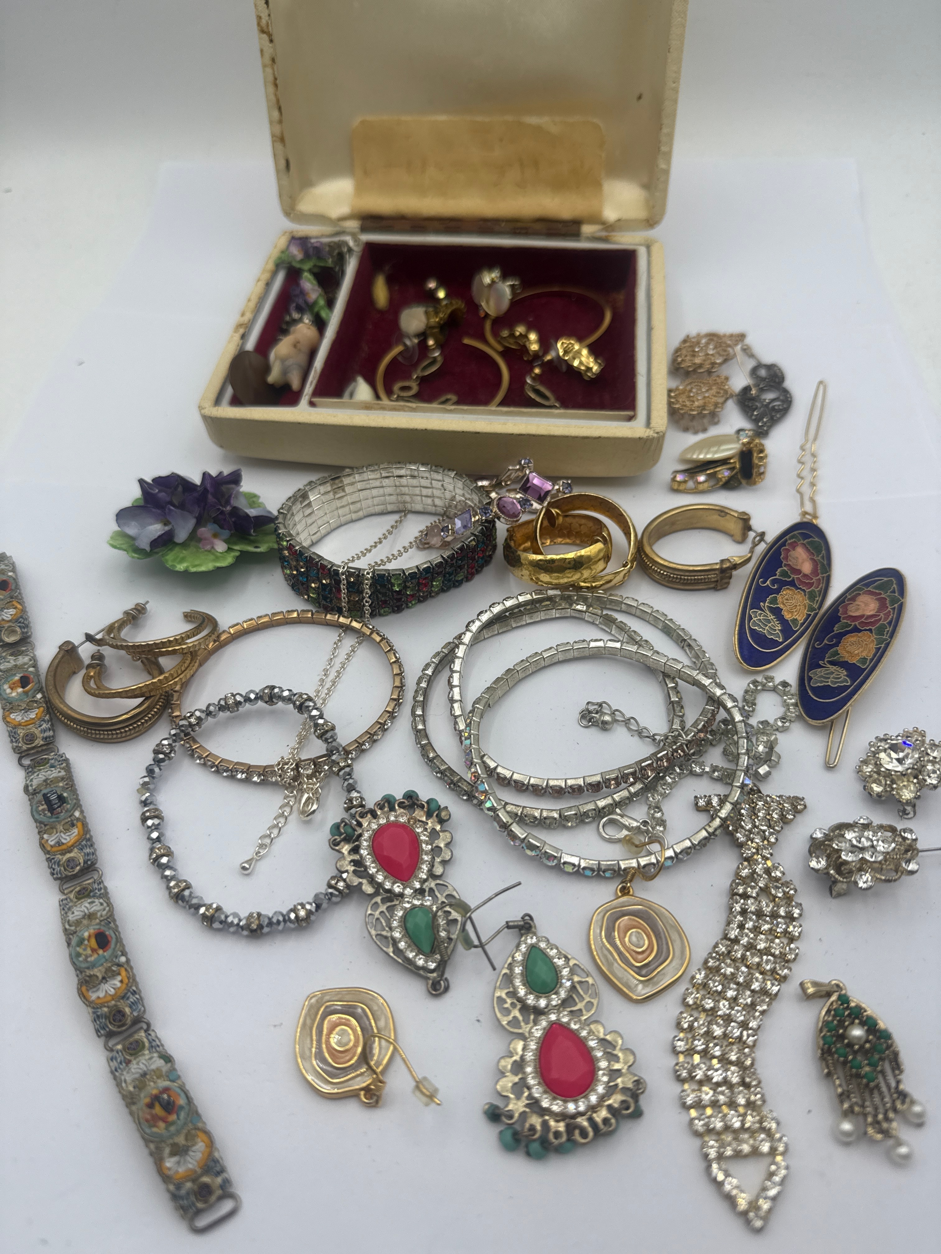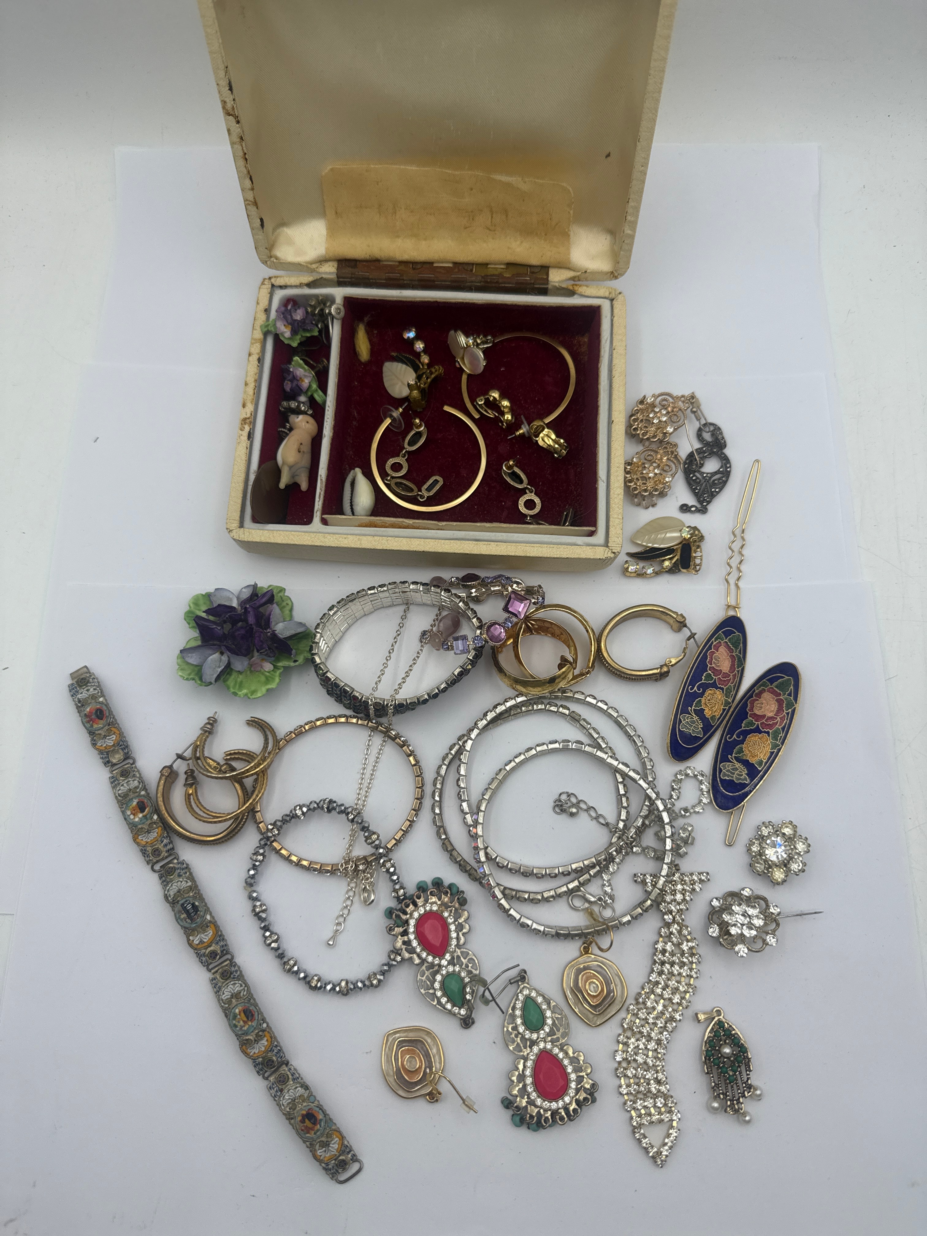 A group of assorted vintage costume jewelry, primarily consisting of gold-toned and silver-toned pieces. The collection includes various bracelets (bangle, chain, flexible, rhinestone-set, enamel-detailed), numerous earrings (clip-on and pierced, some with rhinestones, enamel, or colored stones), several rings, and brooches. Materials appear to include clear and colored rhinestones, faux pearls, and colored glass or plastic cabochons in shades of red, green, blue, and purple. The styles are diverse, suggesting a mid to late 20th-century period, ranging from intricate pave-set rhinestone designs and floral enamel work to simpler metallic forms. No discernible text or manufacturer’s markings are visible on any items. Accompanied by a small, rectangular, hinged jewelry box featuring an off-white exterior and a discolored, gold-toned fabric-lined interior with red velvet compartments.