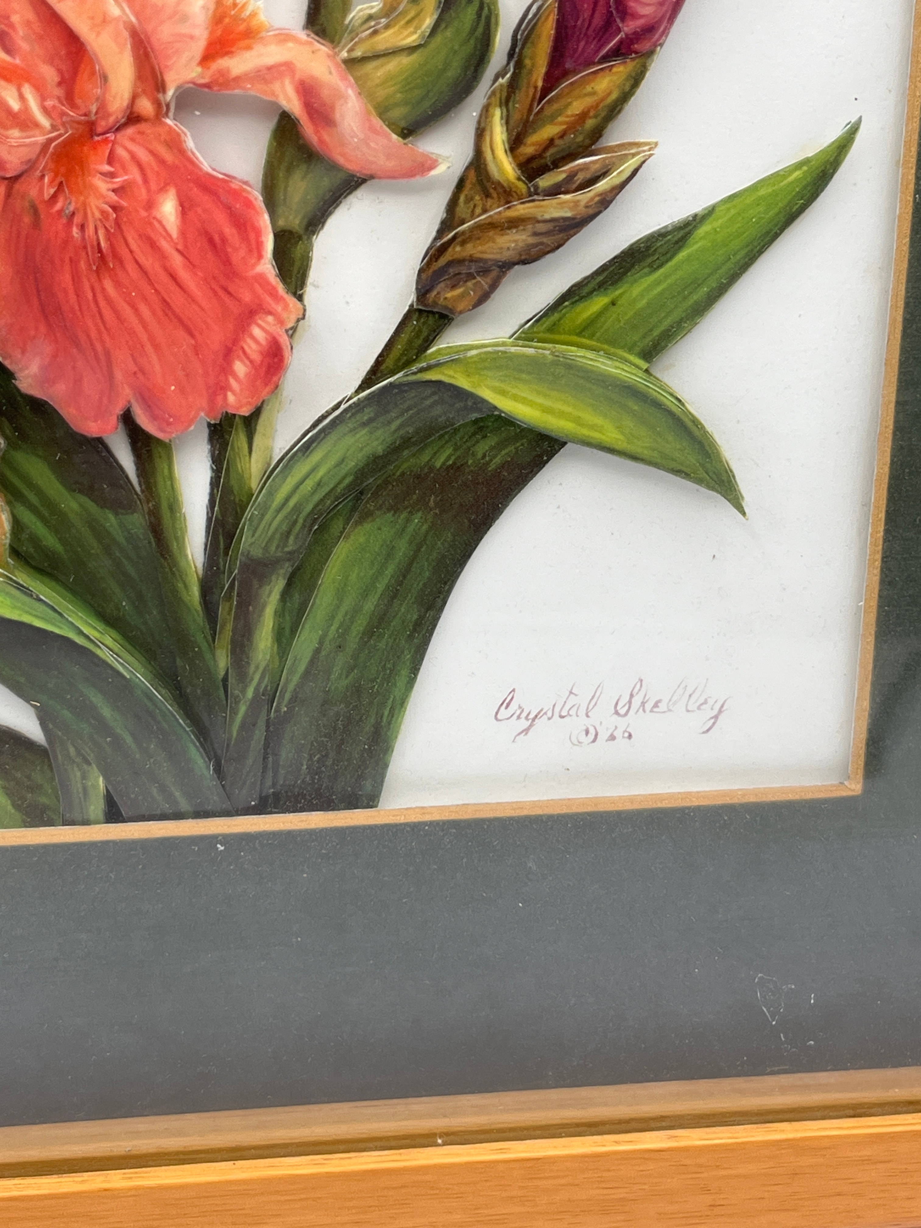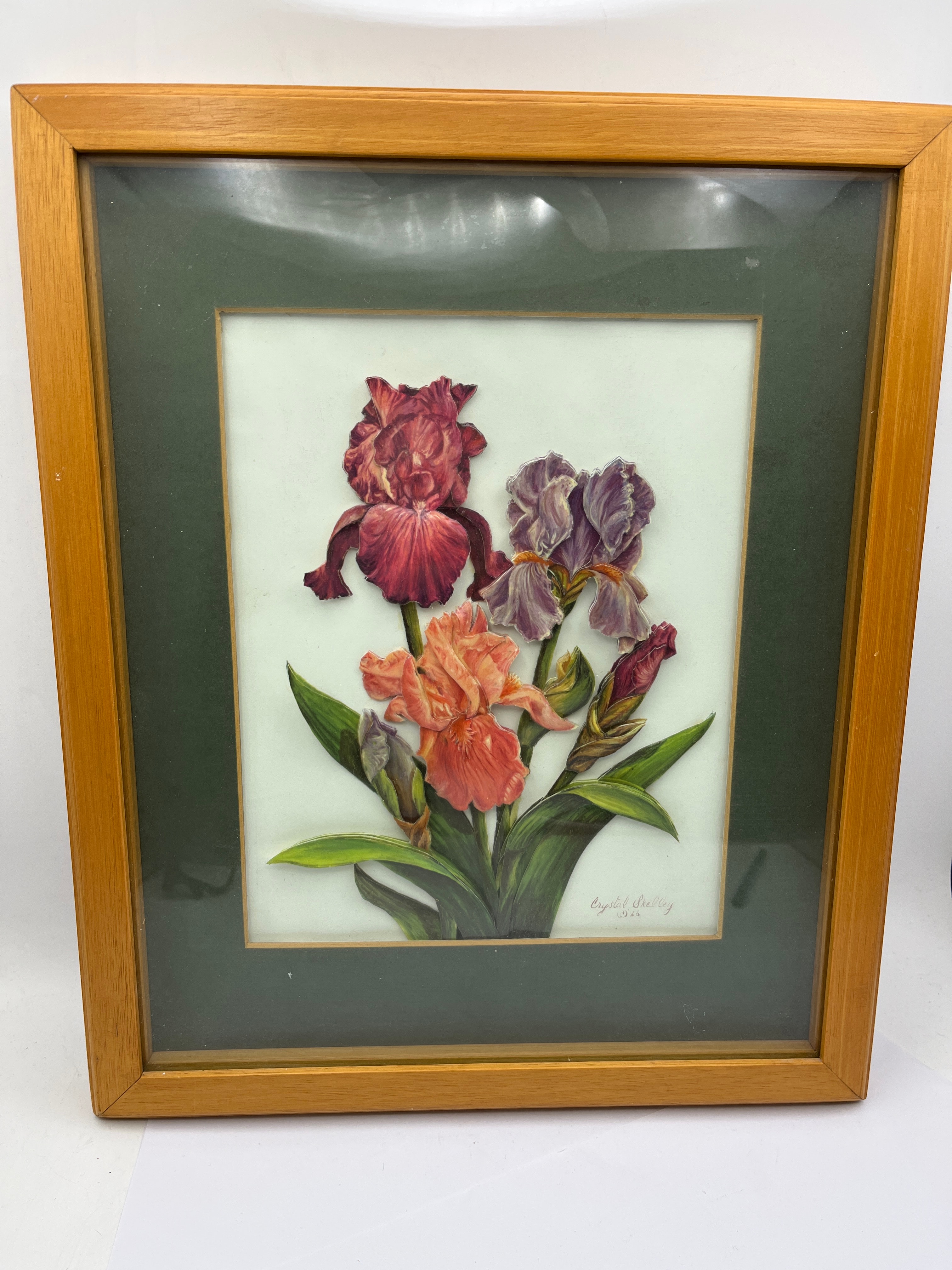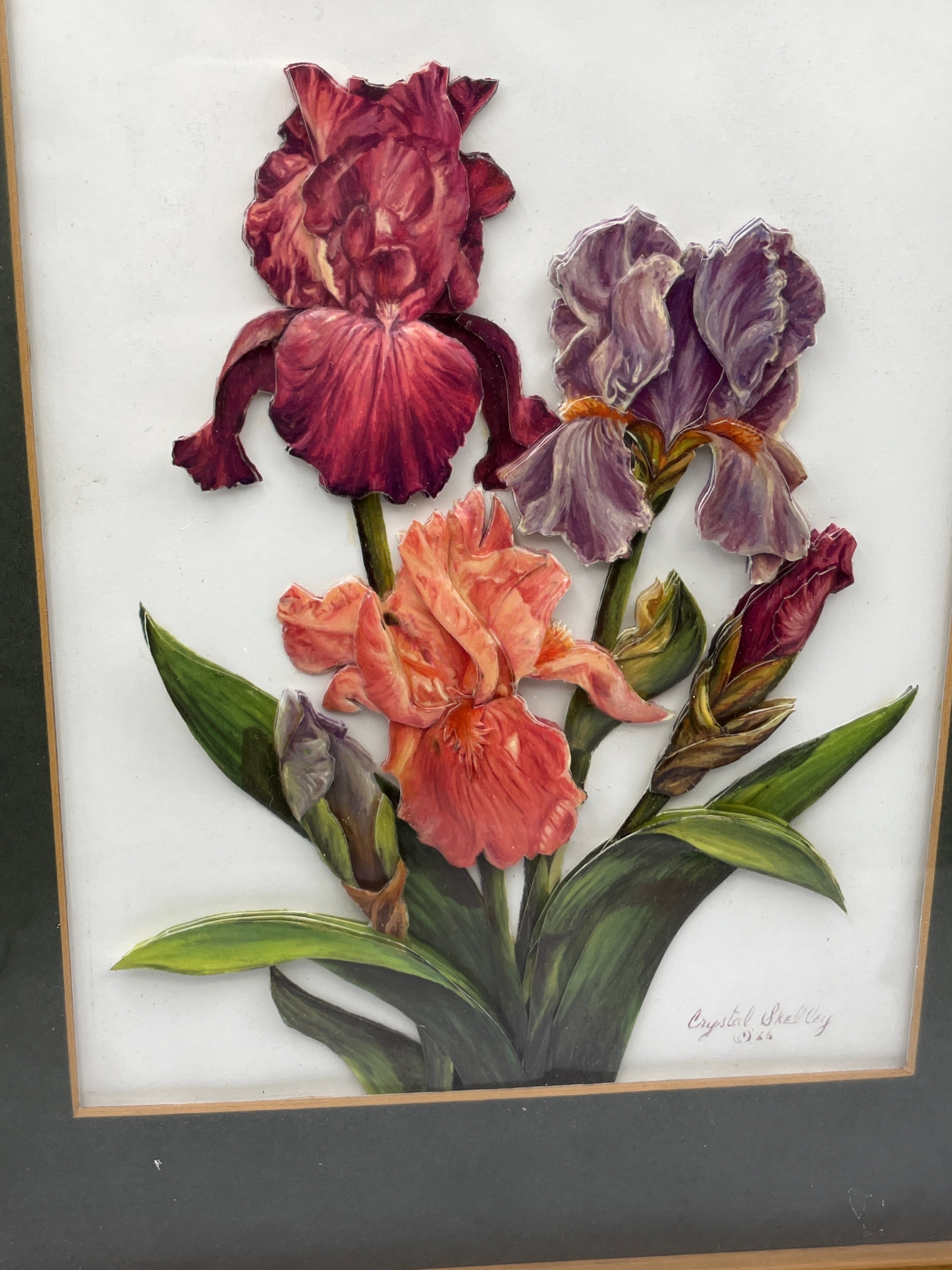 A framed three-dimensional paper relief artwork depicting a vibrant bouquet of irises in shades of deep red, purple, and orange-pink, with green foliage. The layered paper elements create a palpable depth, presented against a white ground within a dark green mat. The piece is housed under glass in a simple, light-toned wooden frame. A signature, “Crystal Shelley,” and what appears to be “(c) 25” are visible in the lower right corner of the artwork.