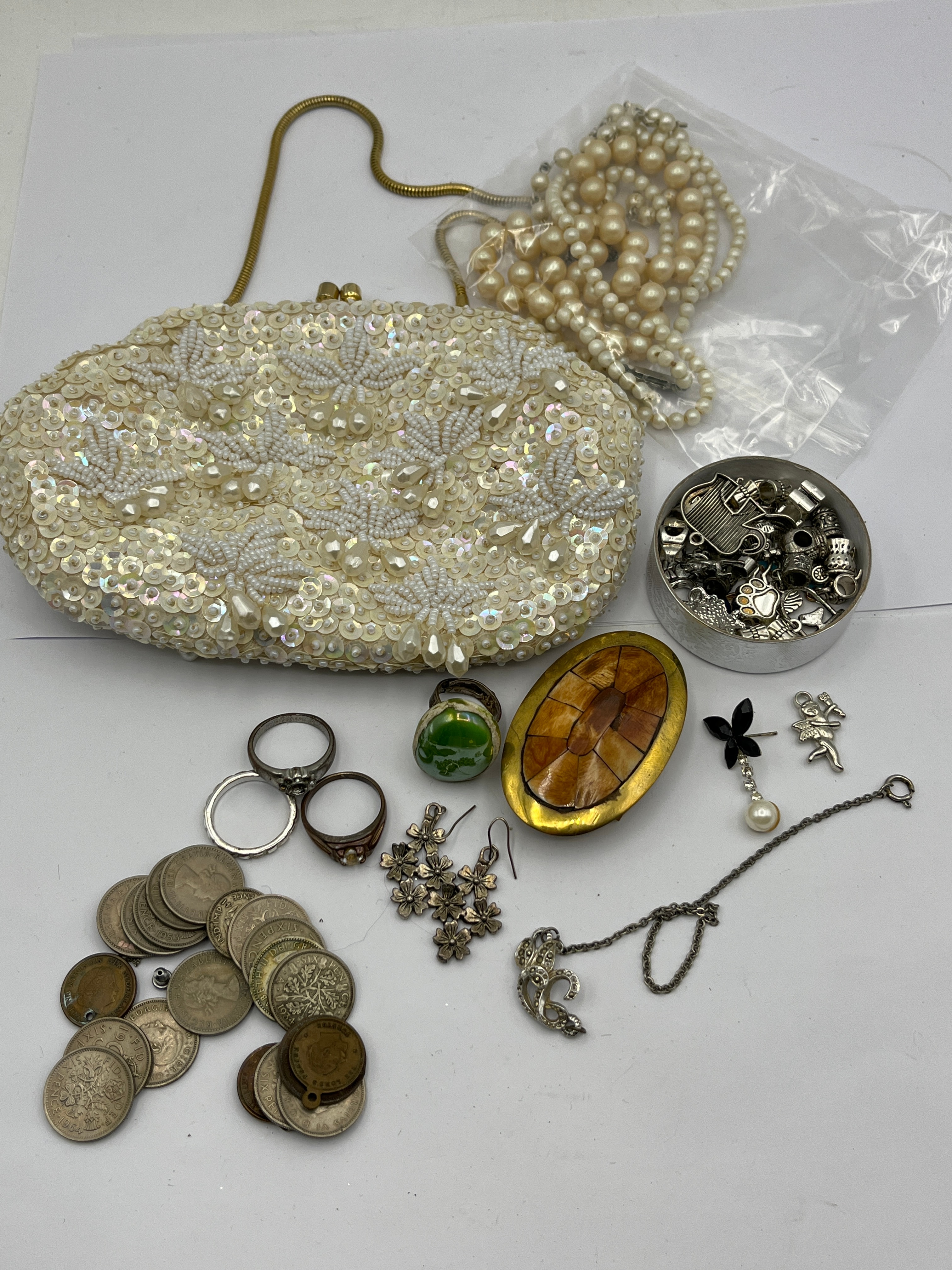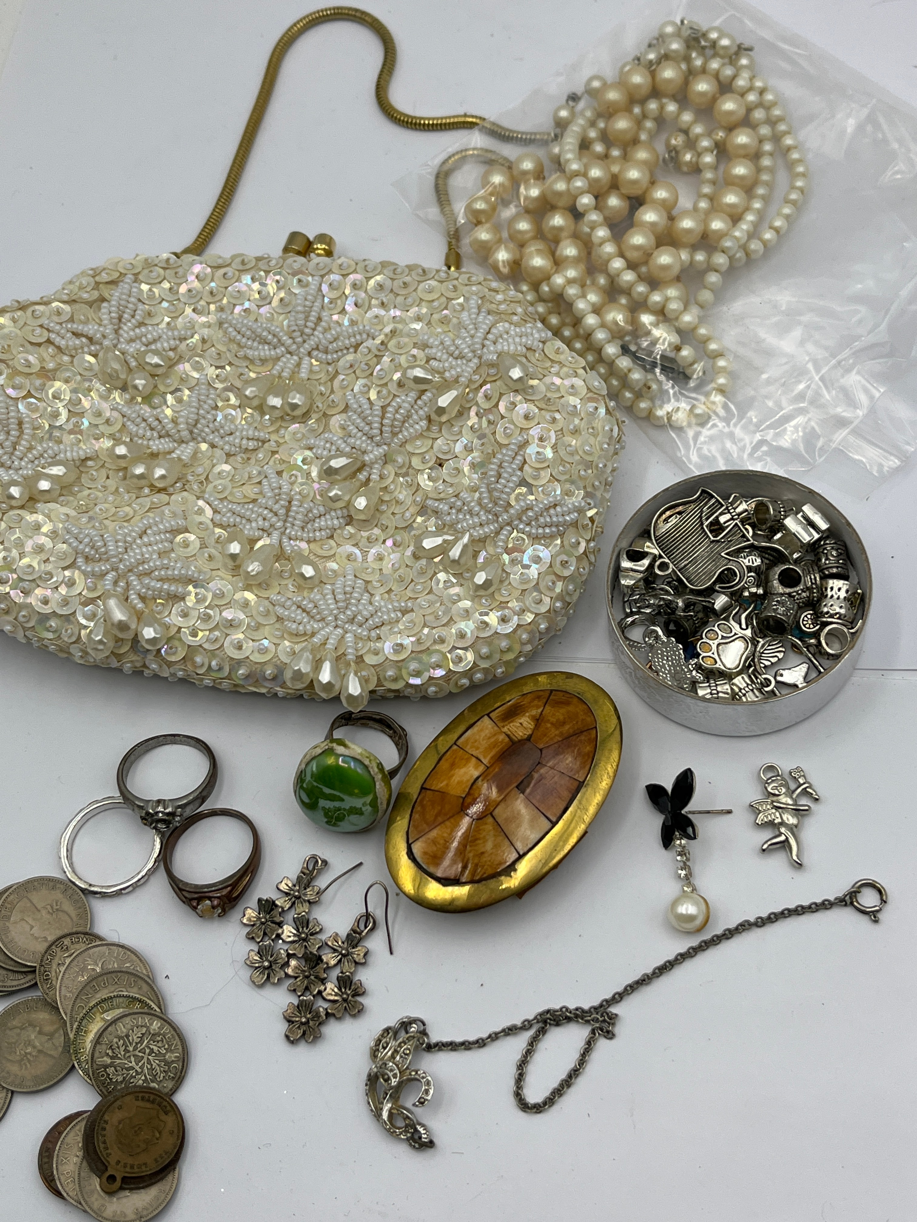 An oval-shaped vintage beaded coin purse, densely adorned with iridescent white sequins and small white beads, accented by a gold-tone metal frame and chain strap. Accompanying this are a multi-strand faux pearl necklace, a small container filled with assorted silver-tone charms and findings, several metal rings (one featuring a prominent green cabochon), a floral-motif earring set, a single dangle earring with a black bow and faux pearl, a silver-tone chain necklace with an animal-form pendant, and a gold-tone oval brooch inlaid with segmented shell or amber-toned material. A stack of miscellaneous foreign coins is also present, including several Russian Kopeck denominations, with visible text such as “КОПЕЙКА” (Kopeyka) and “10 КОПЕЕК” (10 Kopecks) and dates like 1961 on some.