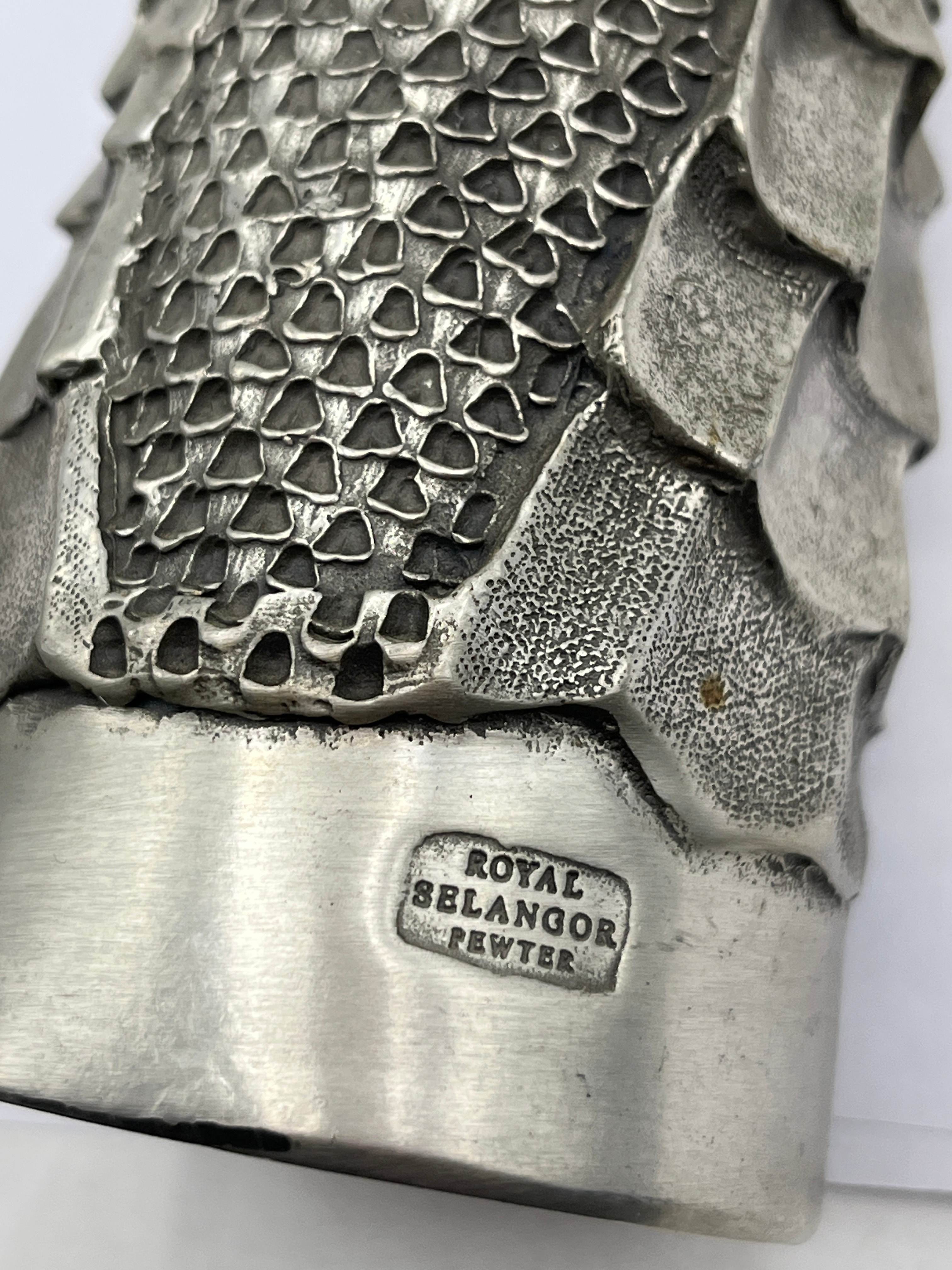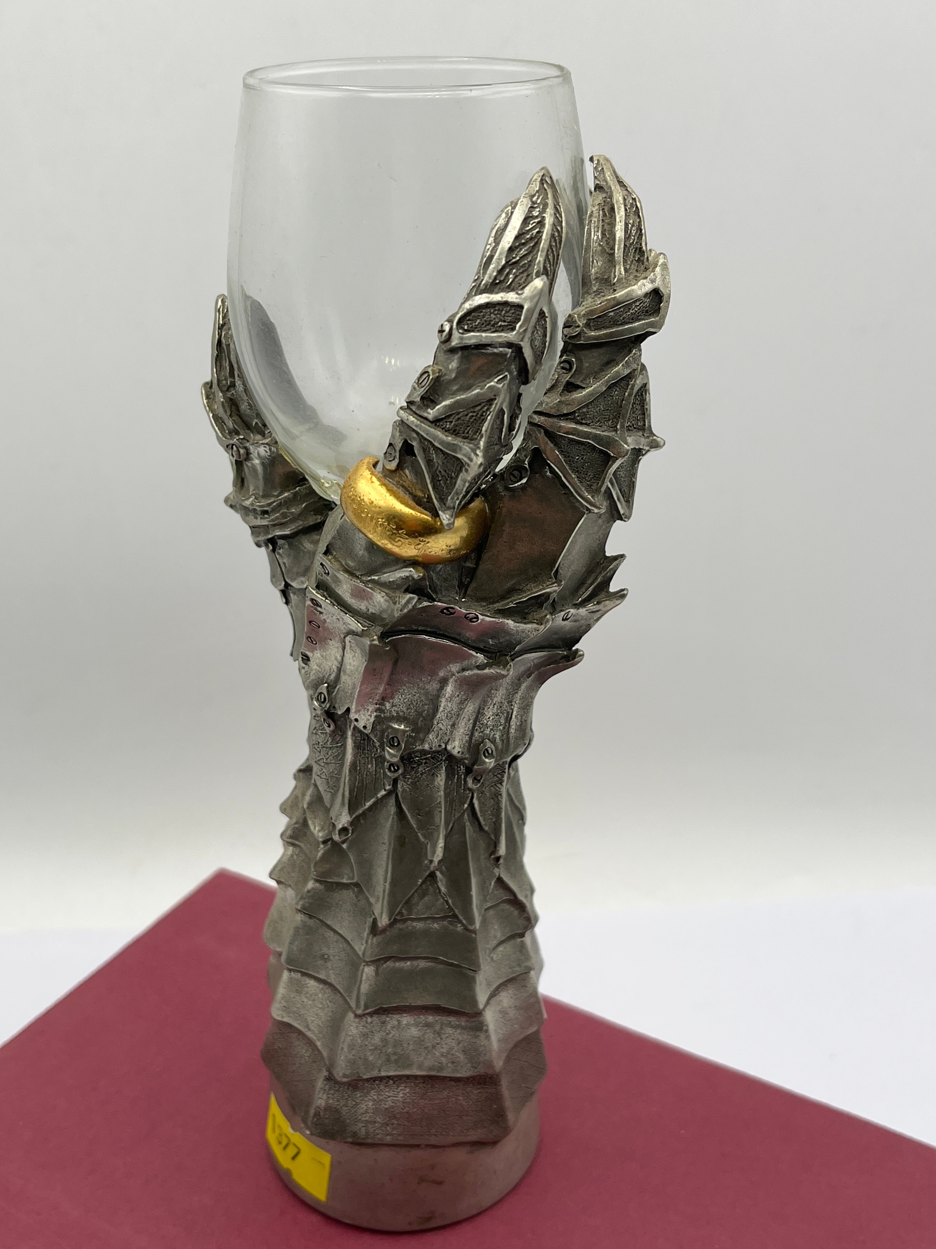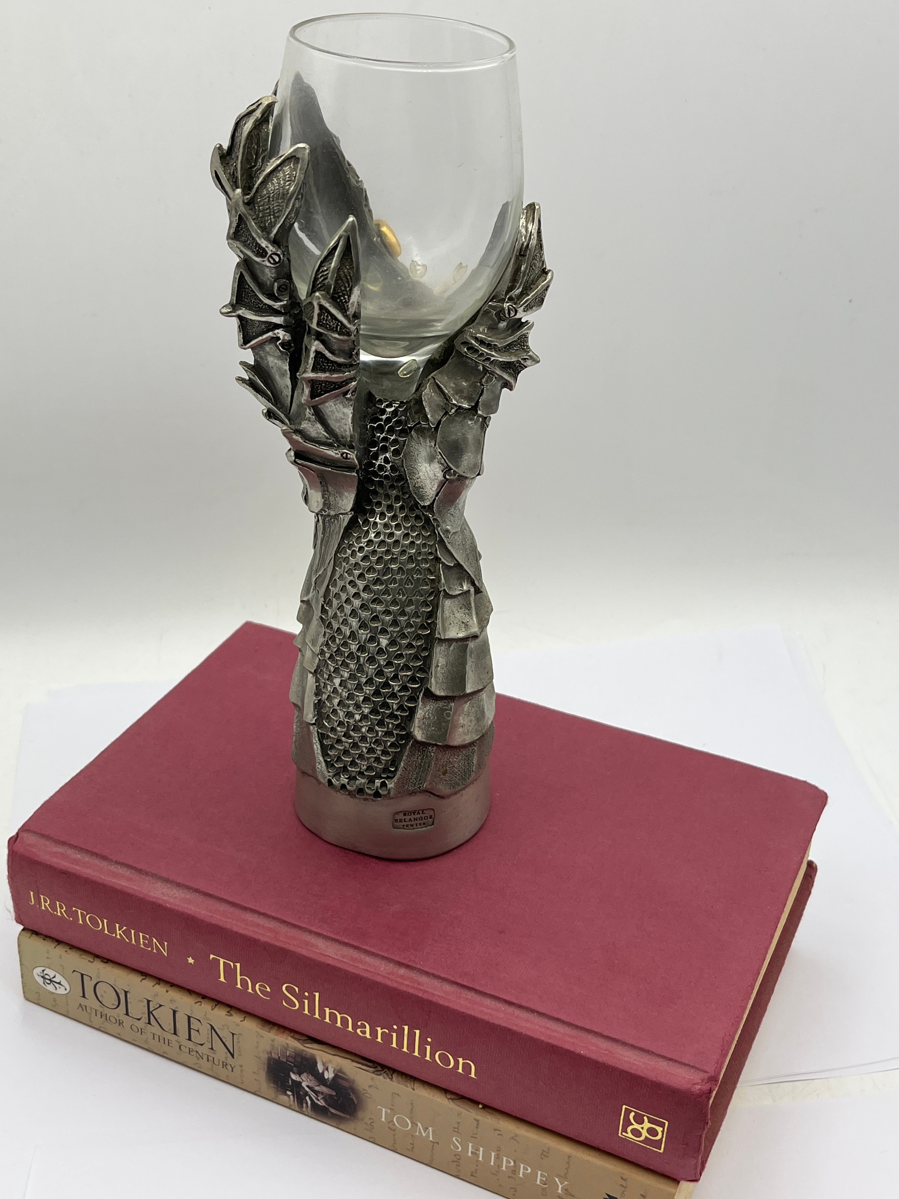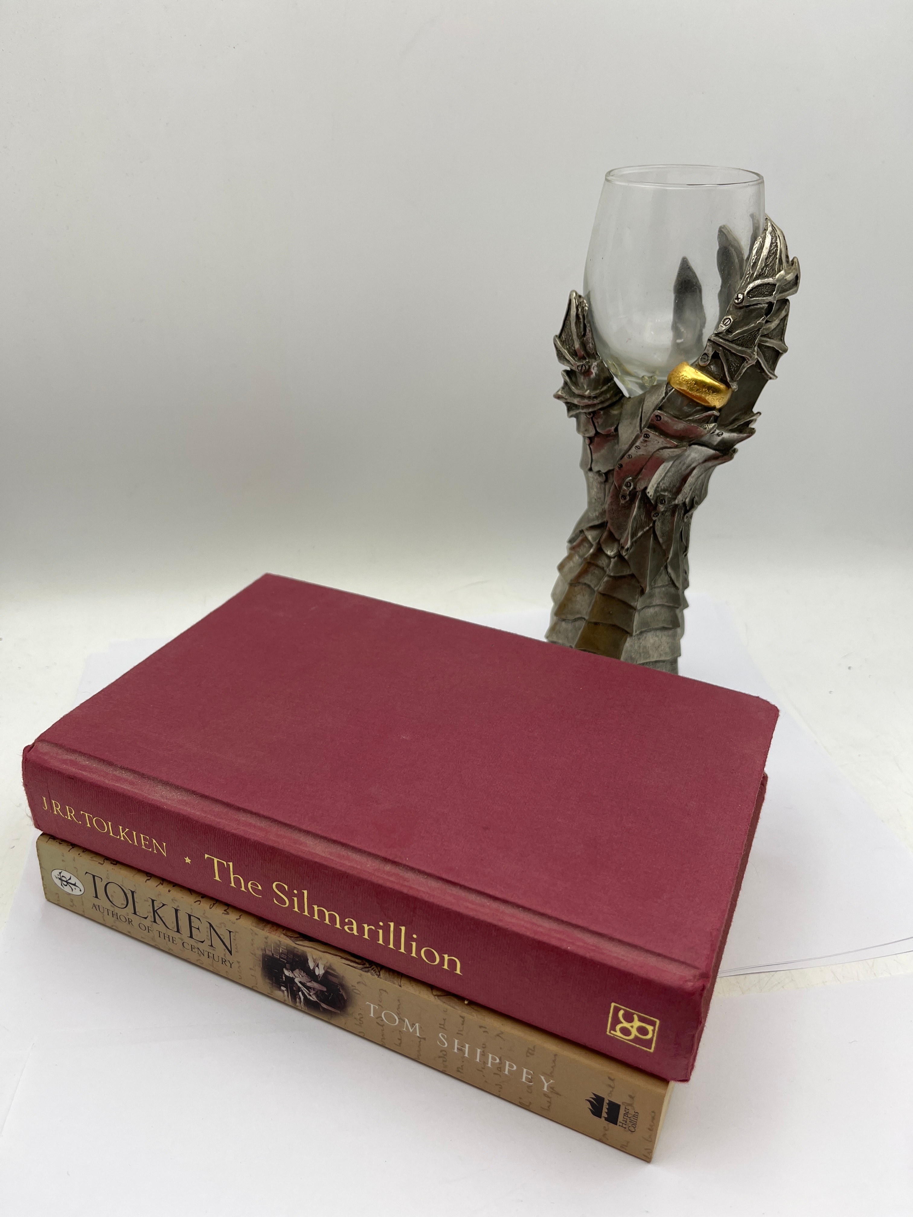 This lot comprises two hardcover books and a Royal Selangor pewter goblet. The first book is J.R.R. TOLKIEN’s ‘The Silmarillion,’ a red-covered hardcover edition, consistent with a 1977 first edition/printing based on visual matches from web research. The second book is ‘J.R.R. TOLKIEN: Author of the Century’ by TOM SHIPPEY, a beige-covered hardcover biography. The accompanying goblet features a clear glass insert supported by a detailed silver-toned pewter base. The base is sculpted to resemble an armored gauntlet or dragon’s claw, prominently holding a gold-toned metal ring. The base is clearly stamped ‘ROYAL SELANGOR PEWTER.’