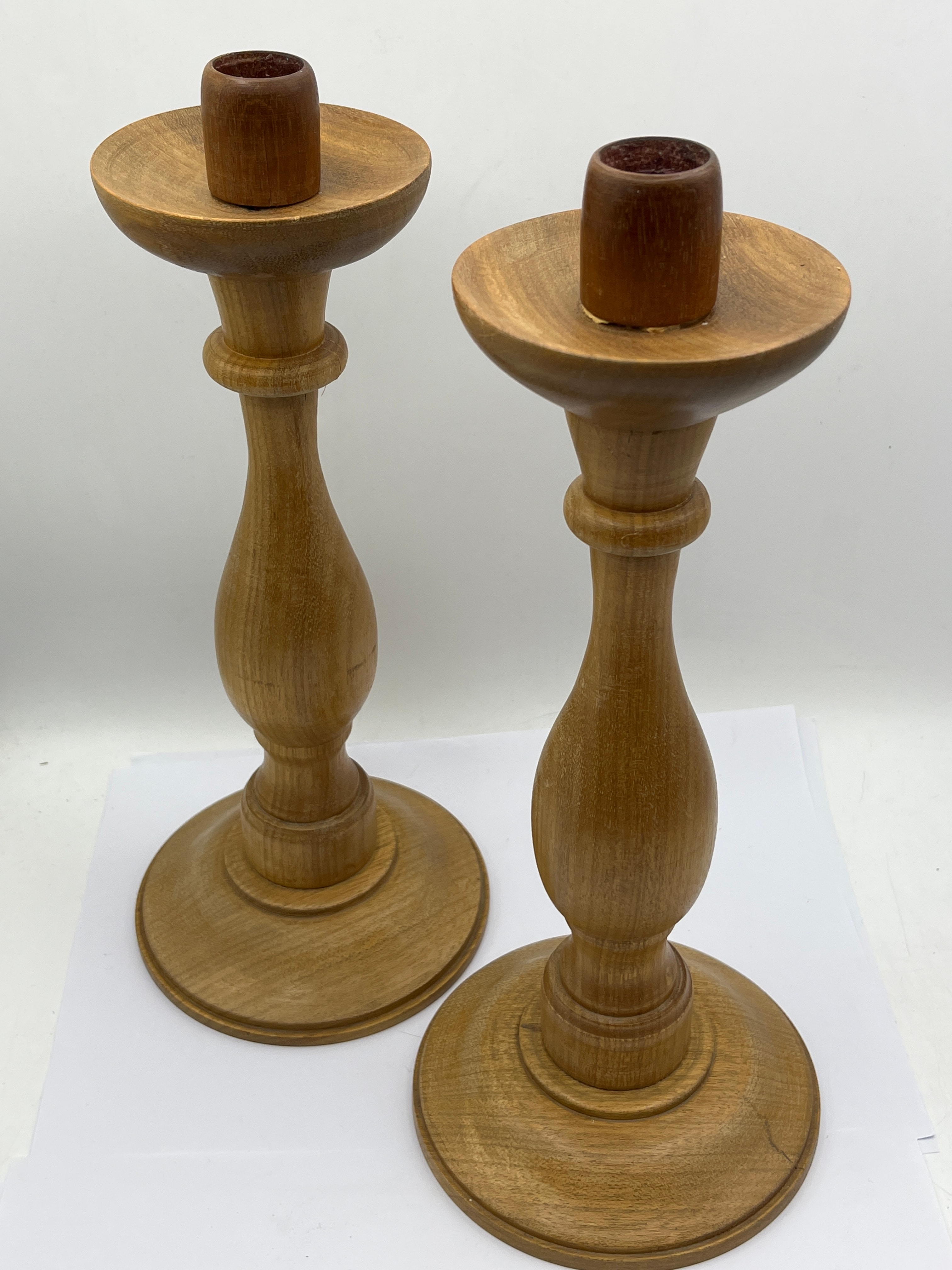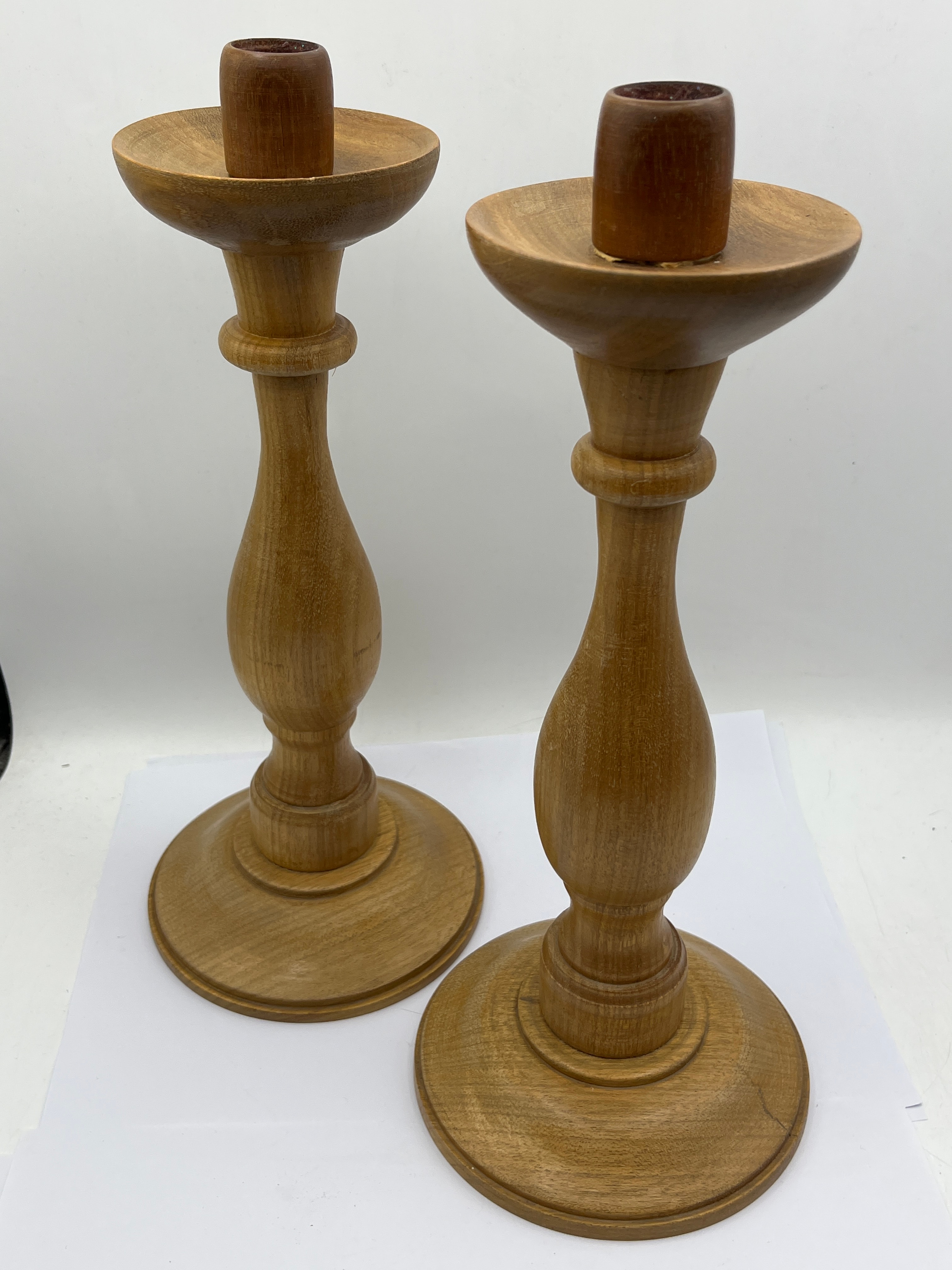 A pair of retro turned wooden candlesticks, each standing 13 inches tall. Each candlestick features a circular stepped base, a baluster-shaped stem, and a broad, shallow drip pan, topped with a darker, cylindrical candle cup. Crafted from wood with a visible grain, they exhibit a natural light to medium tone, possibly with a clear finish. The design is traditional in form. No visible text, markings, or inscriptions are discernible.