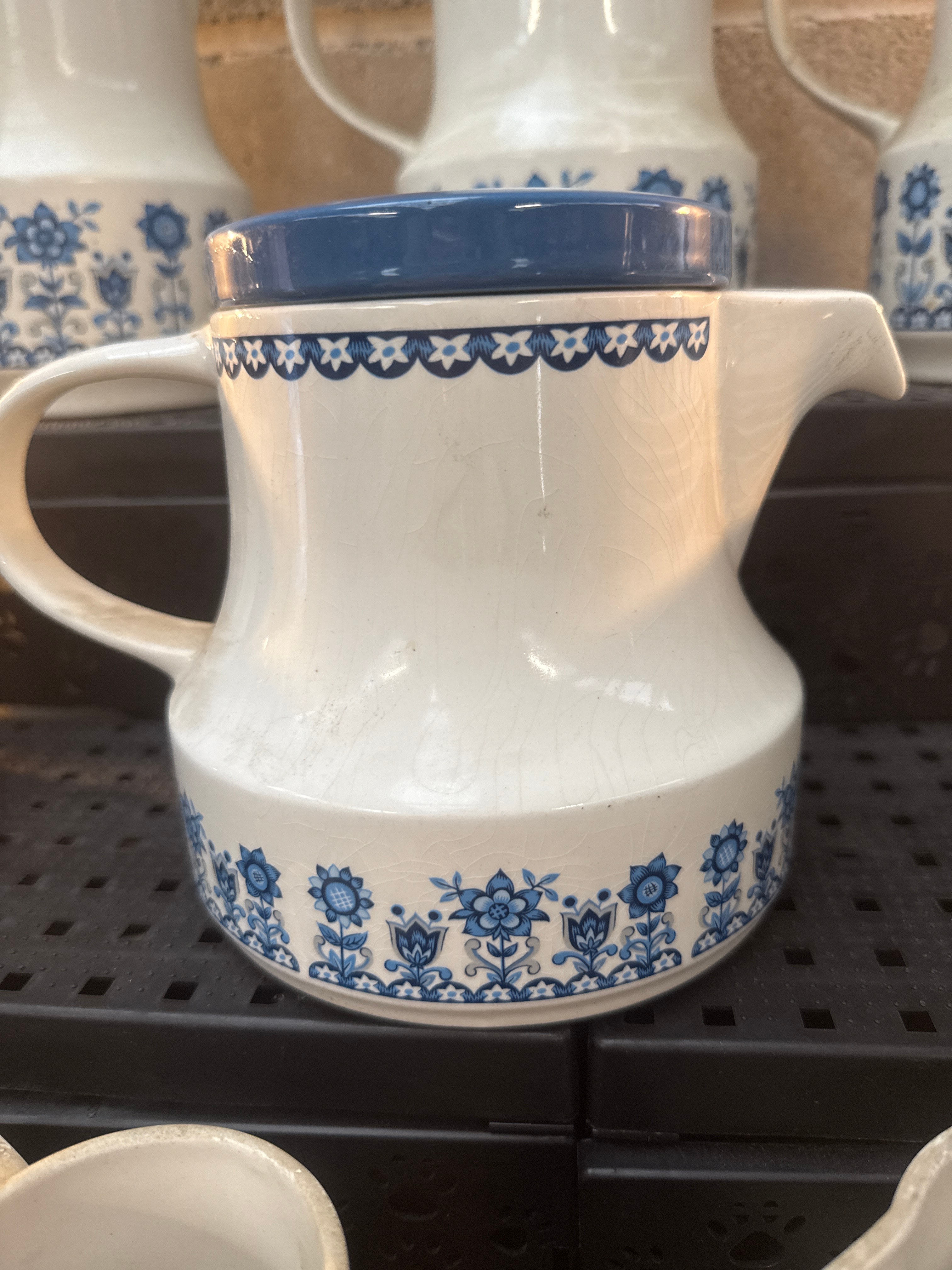 A collection of Johnson Brothers ‘Tudor Blue’ tableware, of Mid-Century Modern style. The lot comprises white ceramic pieces uniformly decorated with a blue underglaze floral and geometric pattern. It includes three tall lidded pitchers, a lidded coffee or teapot, four smaller pitchers or creamers, and a stack of eight bowls. The lids are made of dark blue plastic. The design features a band of stylized blue floral motifs around the base and a blue scalloped or geometric border near the rim.