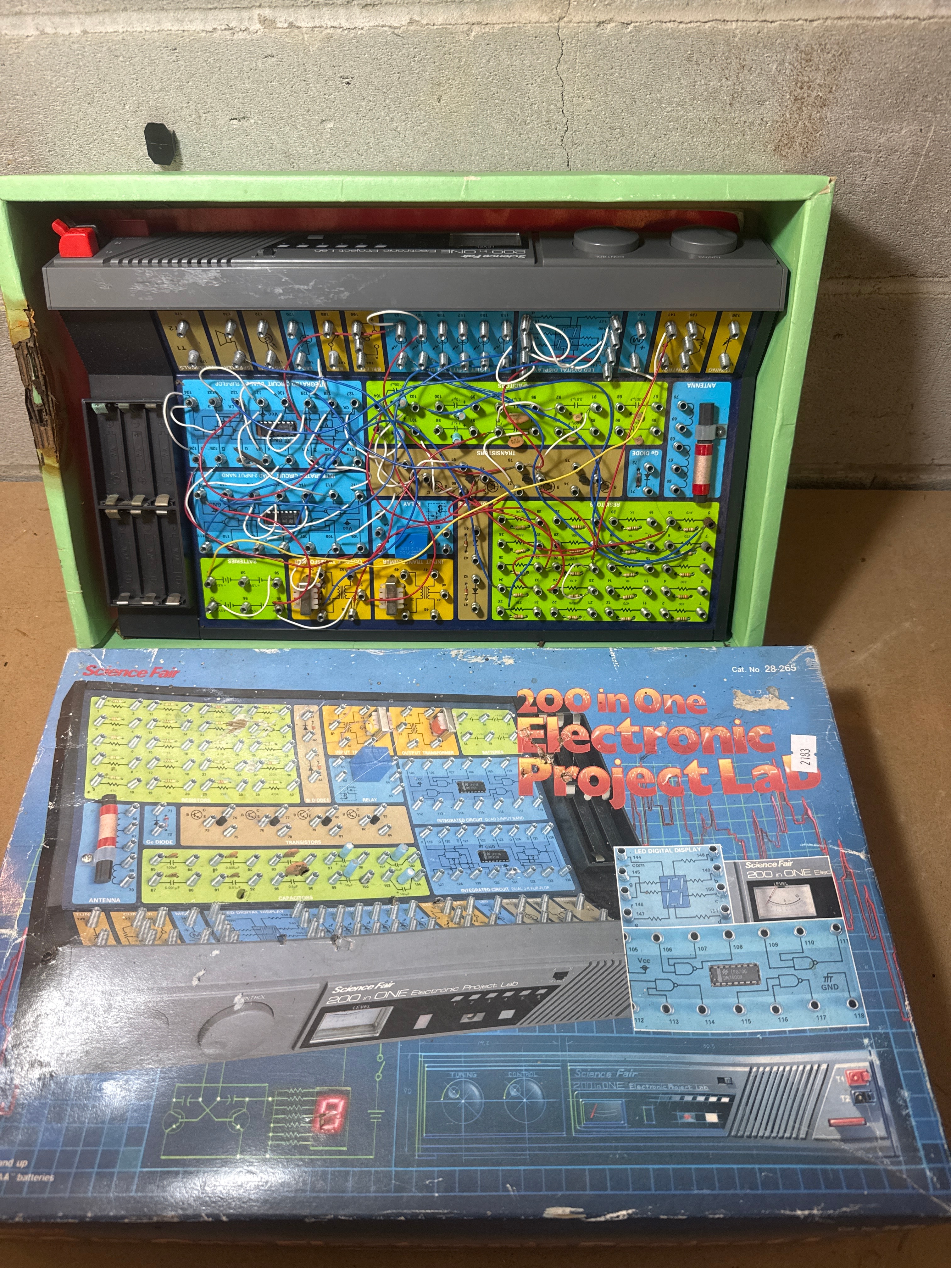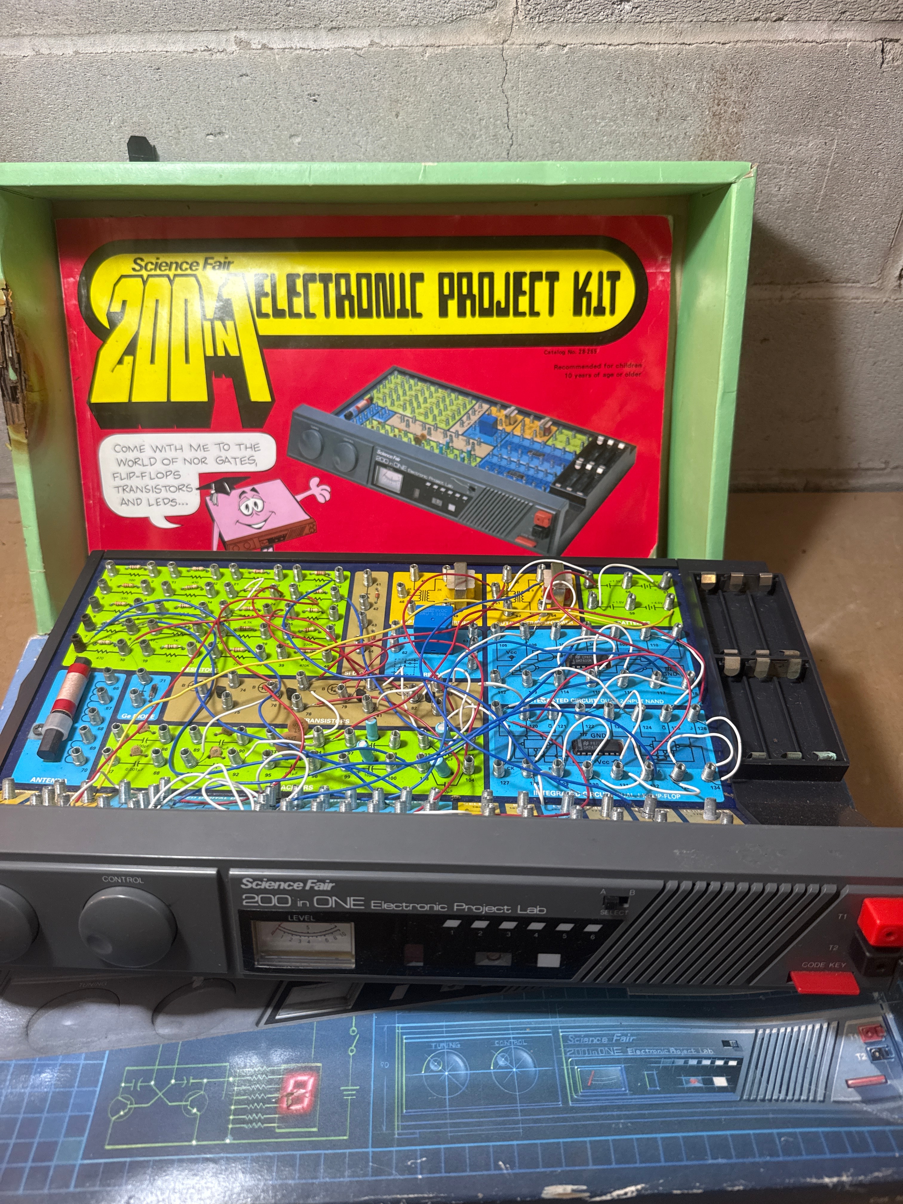 An educational Radio Shack Science Fair 200 in One Electronic Project Lab, identified by Cat. No. 28-265, likely dating from the 1970s-1980s. The main component features a grey and multi-colored plastic project board densely populated with various electronic components, including resistors, transistors, and integrated circuits, currently interconnected by numerous colored jumper wires. The unit is housed within a light green plastic tray. Visible labels on the unit include “CONTROL” and “CODE KEY.” The original cardboard packaging features promotional text such as “Come with me to the world of NOR GATES, OP AMPS, TRANSISTORS AND LEDs…” and a recommendation for “ages 10 to adult.”