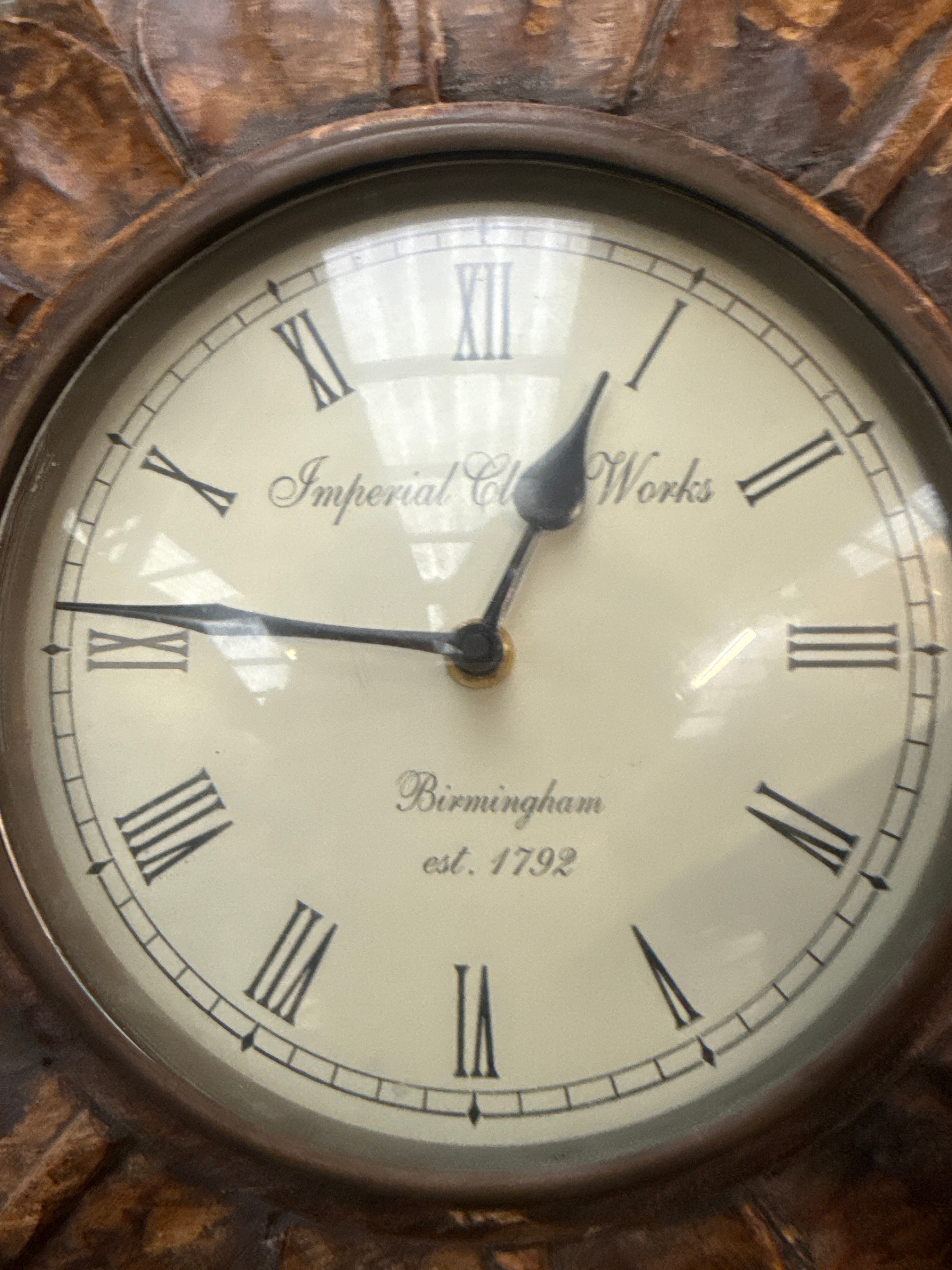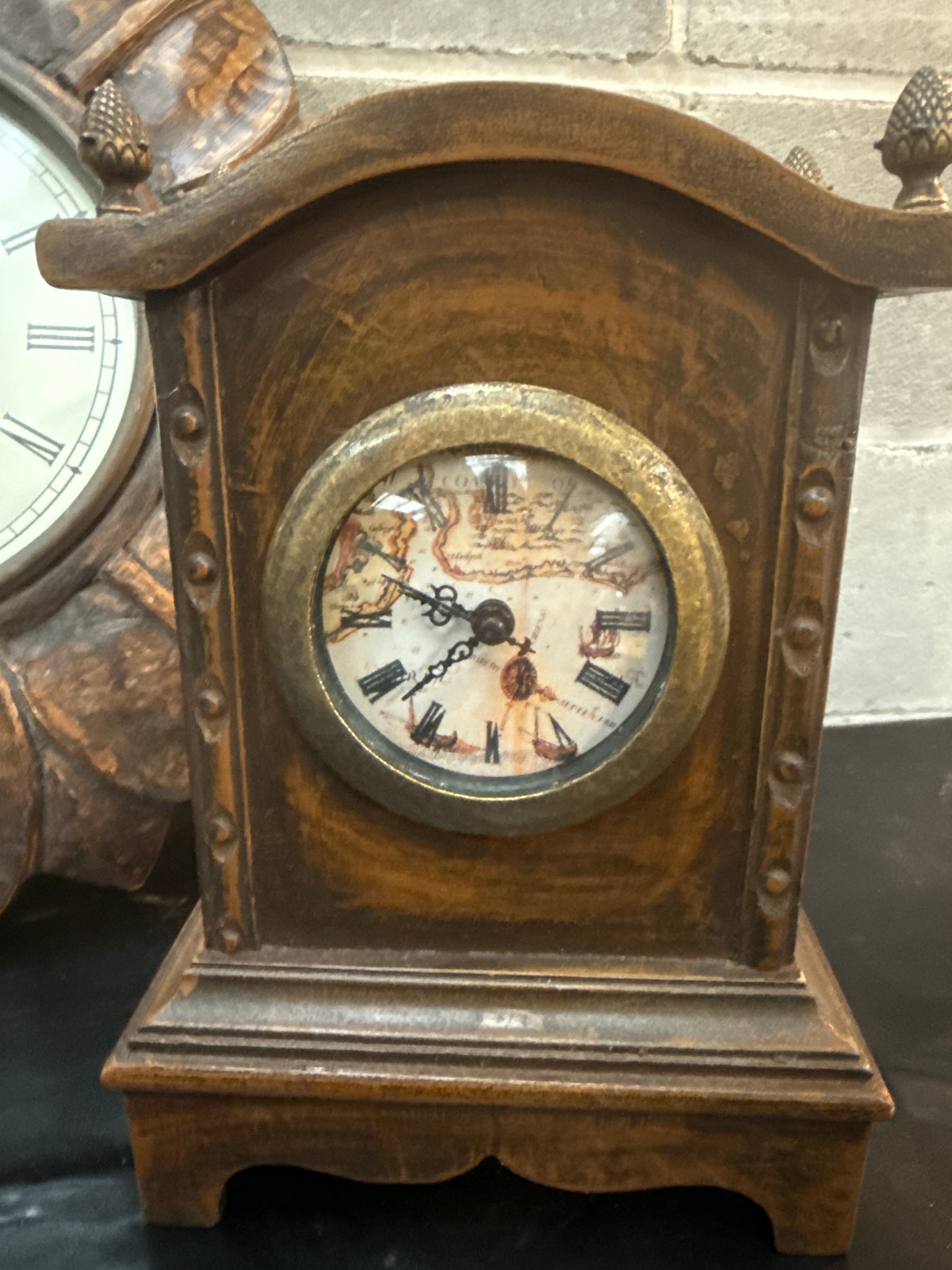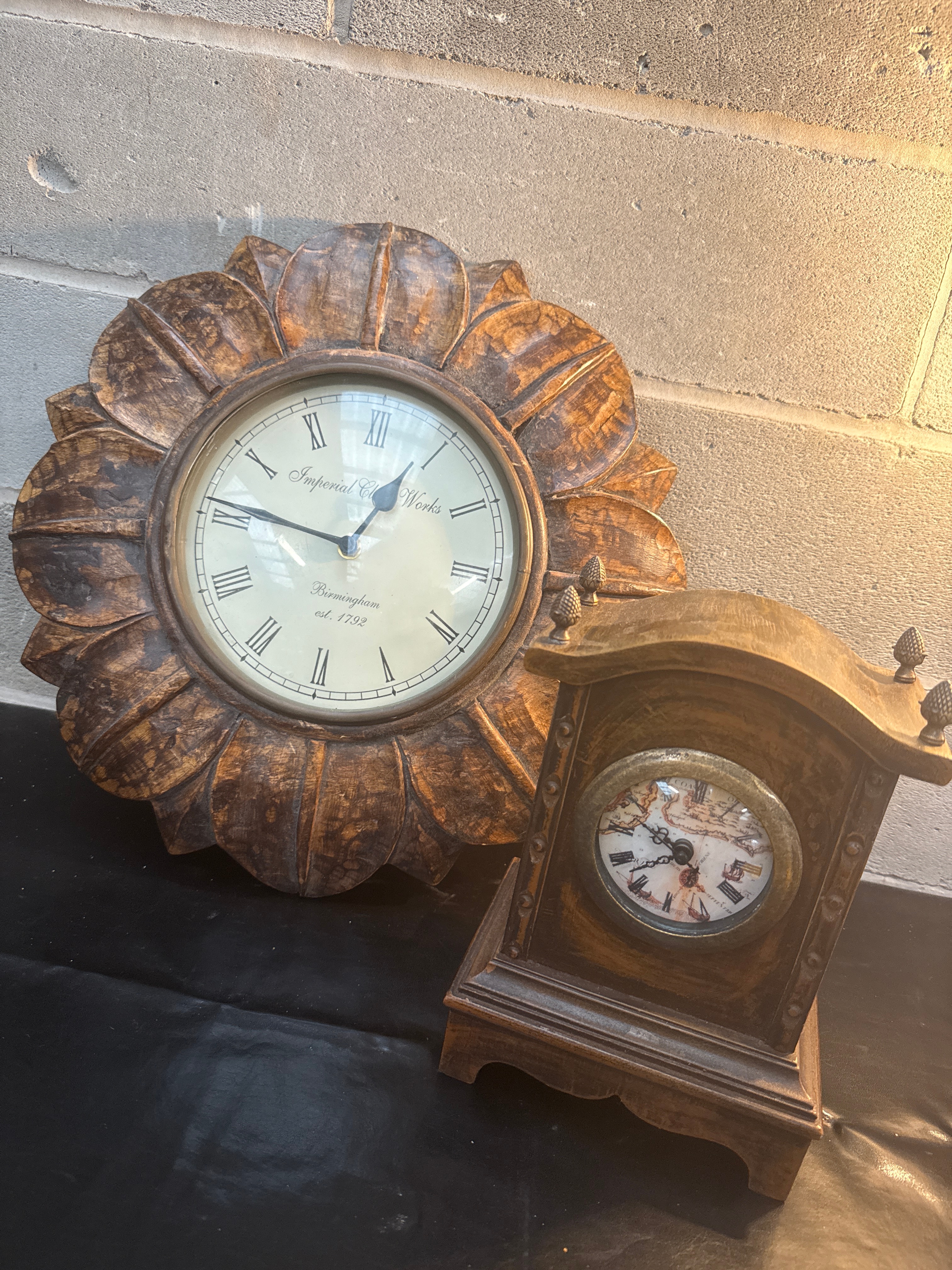 A pair of decorative clocks, both featuring a distressed wooden aesthetic. The larger item is a circular wooden wall clock with a heavily textured or distressed, foliate-carved frame, consistent with a sunburst style. Its cream-colored dial features black Roman numerals and hands, marked “Imperial Clock Works” above the center and “Birmingham est. 1792” below. The smaller item is a compact wooden mantle or table clock, also with a distressed finish, designed in a traditional architectural style with finial accents on its stepped top. Its smaller, brass-toned bezel-set dial displays a map motif with black Roman numerals and hands.
