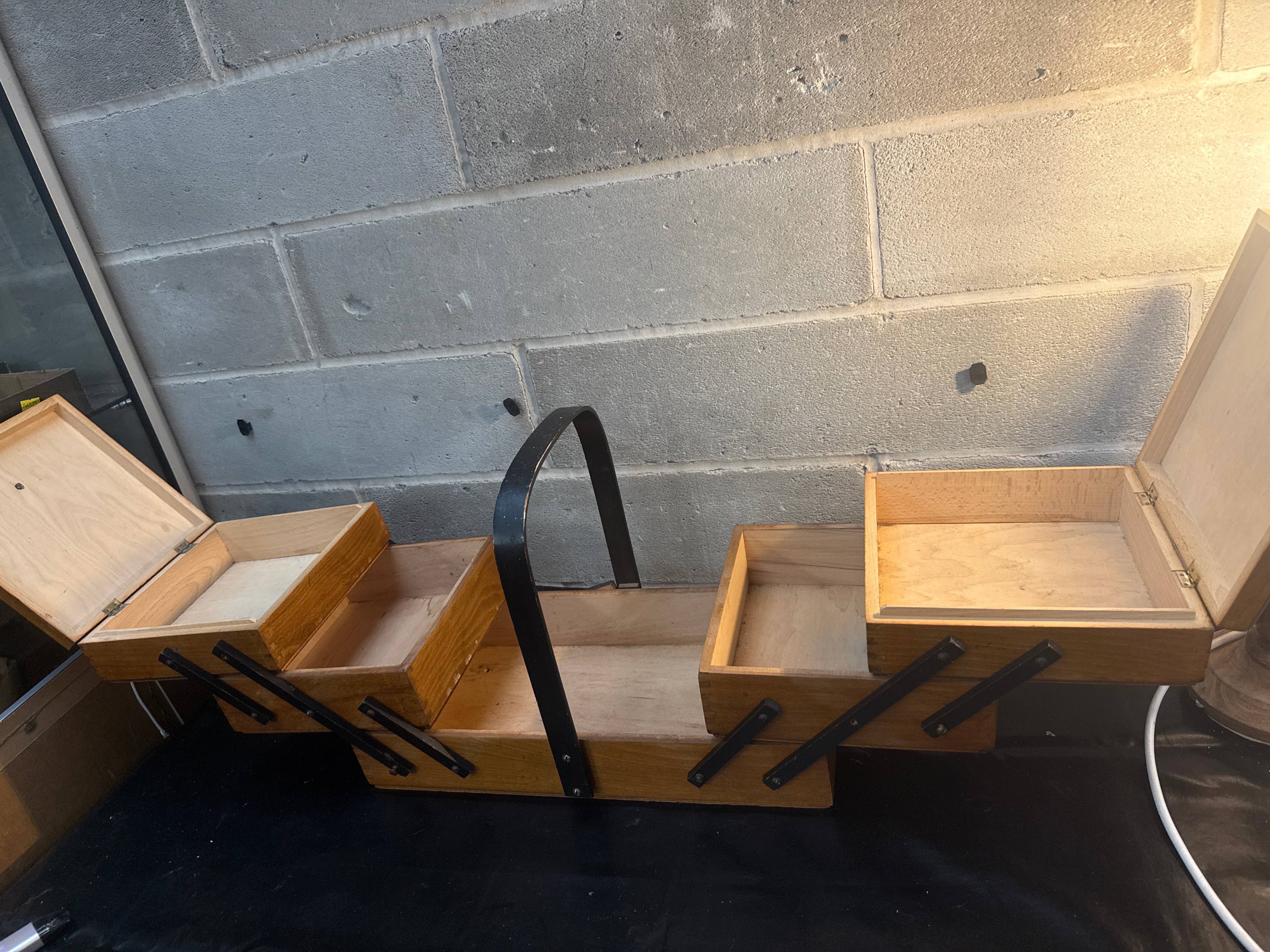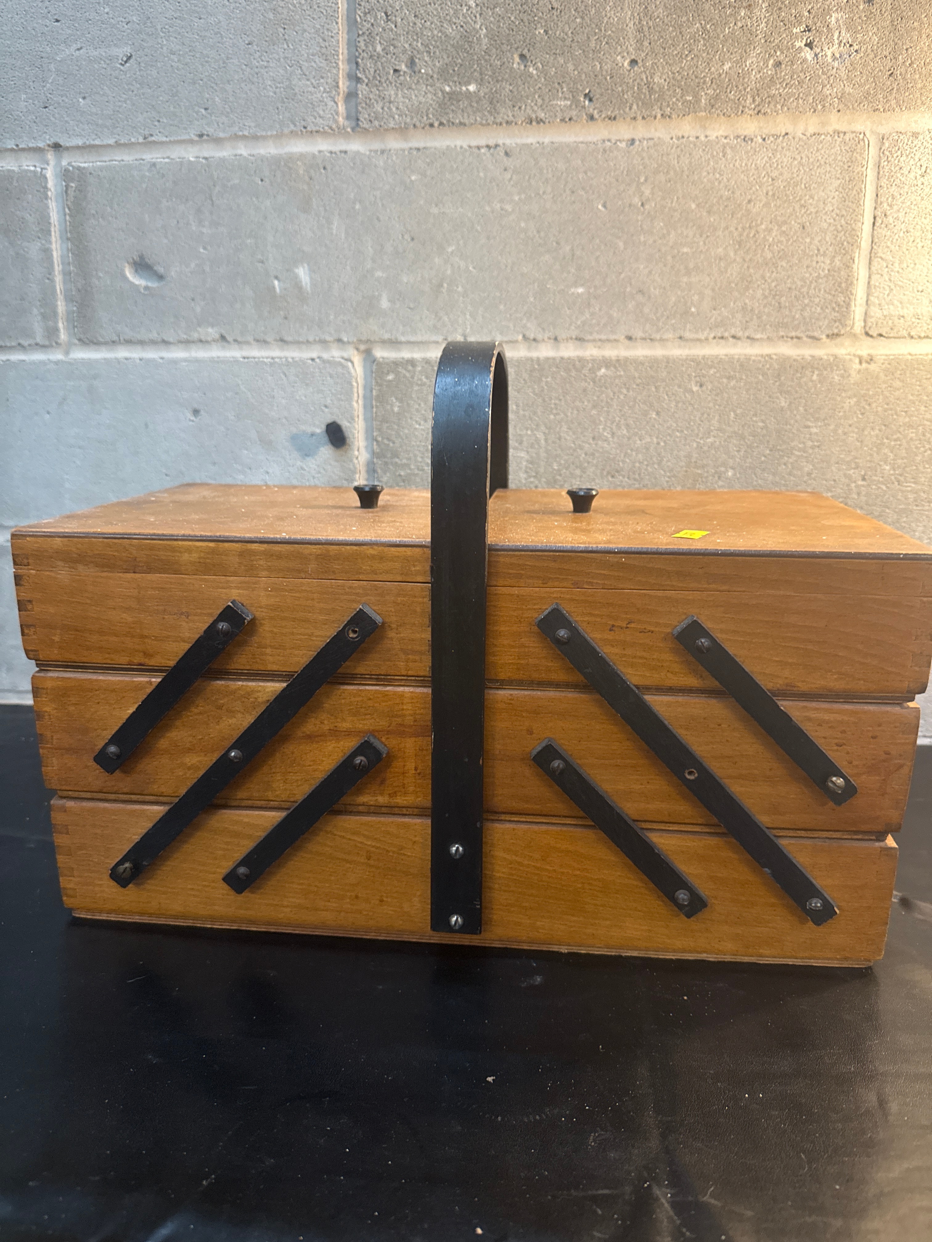 A Mid Century Wood Sewing Box, Accordion Style, 3 Tier, Dovetailed. Constructed primarily of light-toned wood with black metal hardware forming the multi-tiered opening mechanism and the central carrying handle. Two small, round wooden finials are present on the top lid. The interior reveals multiple compartments of varying sizes, also in light-toned wood. A small yellow sticker is visible on the upper surface of the lid, but no text or markings are legible from the image.