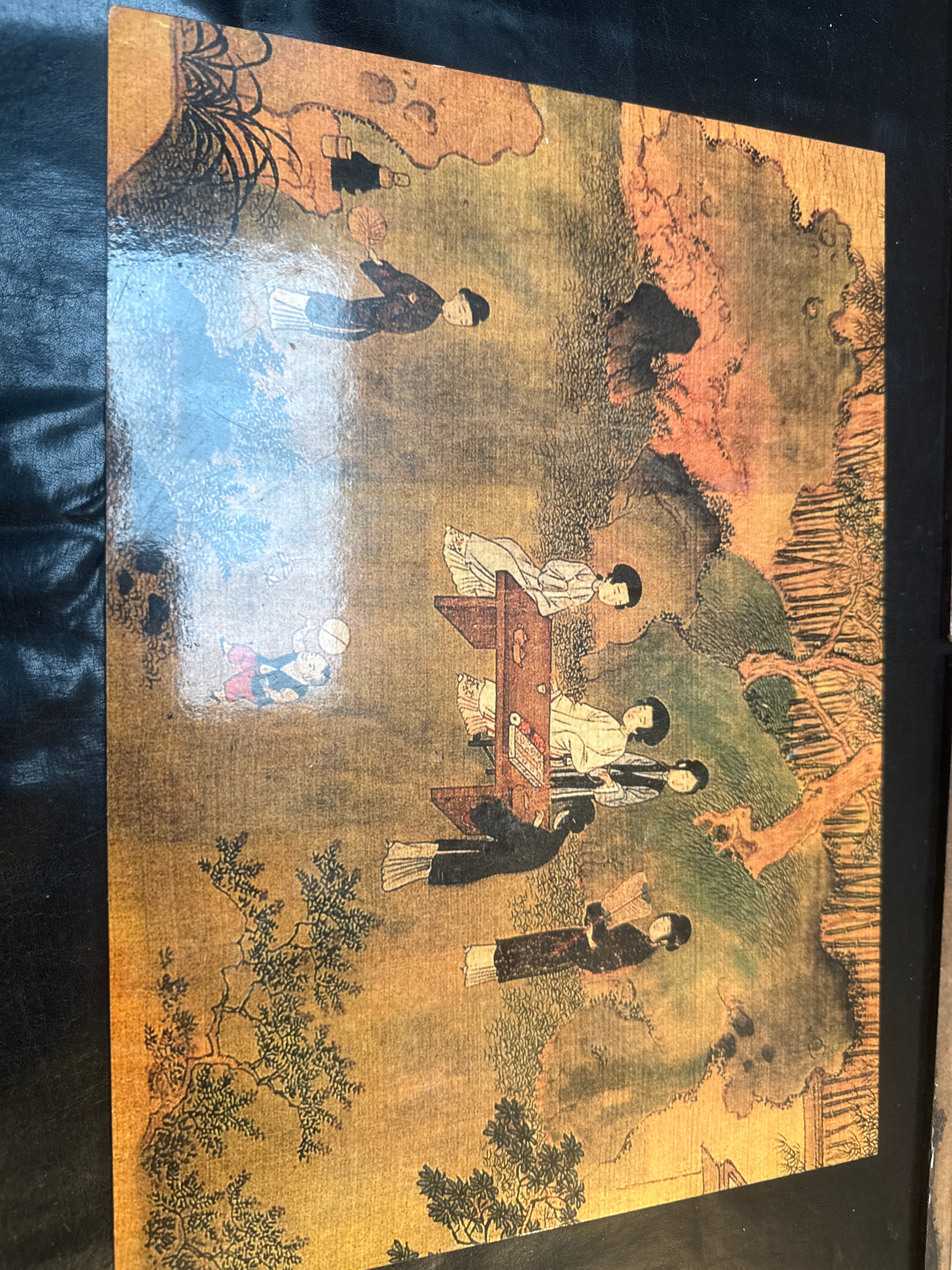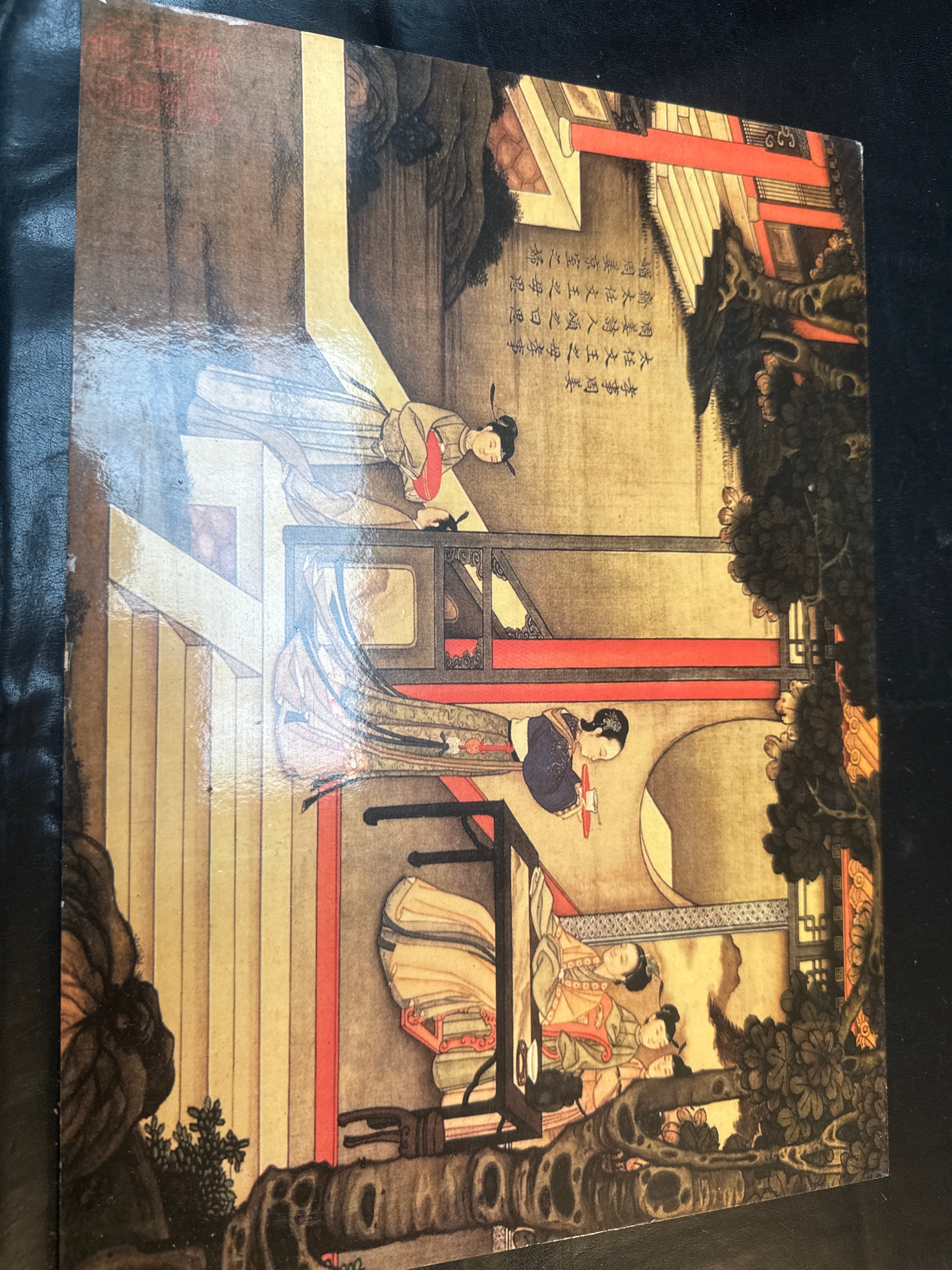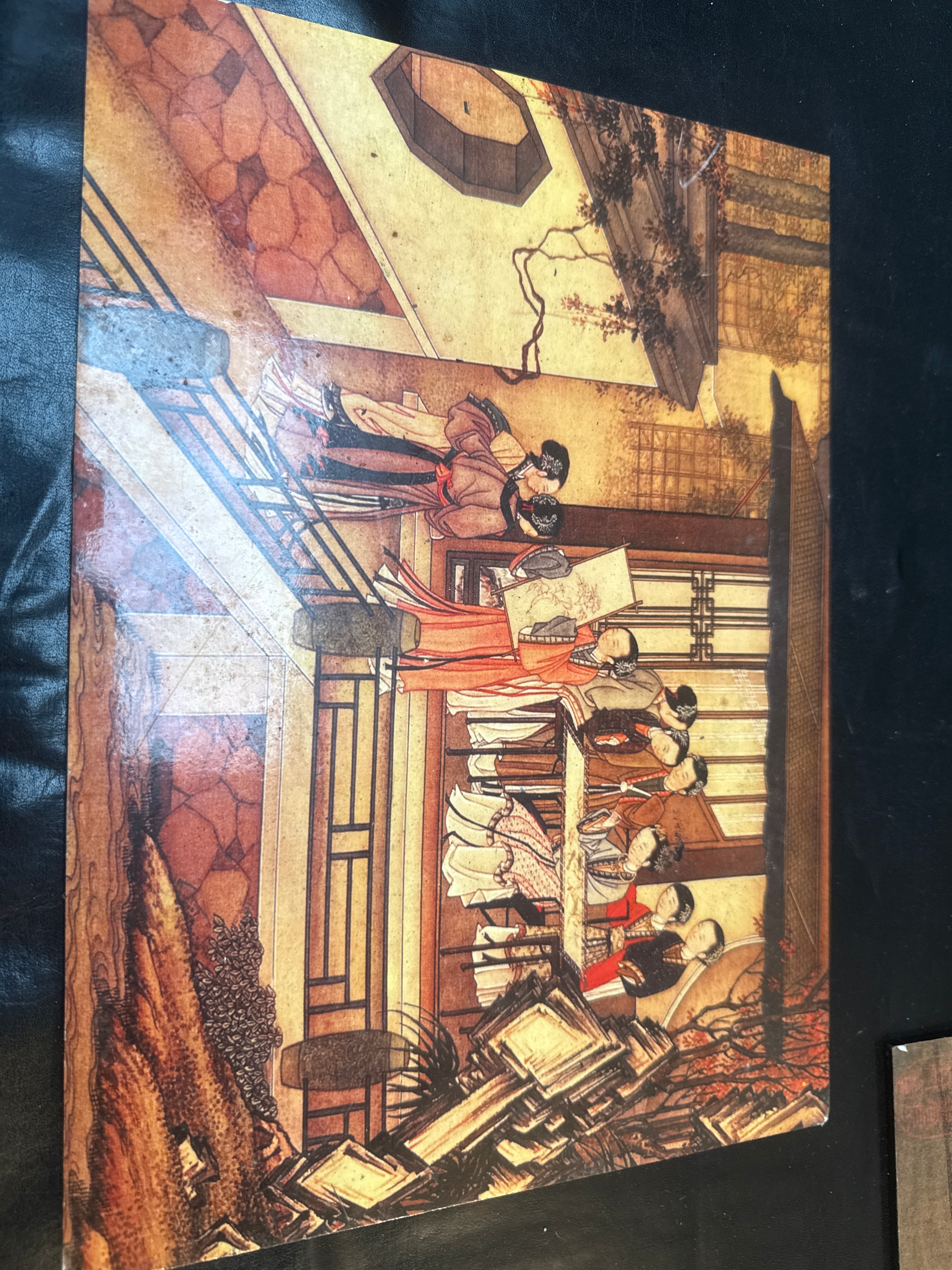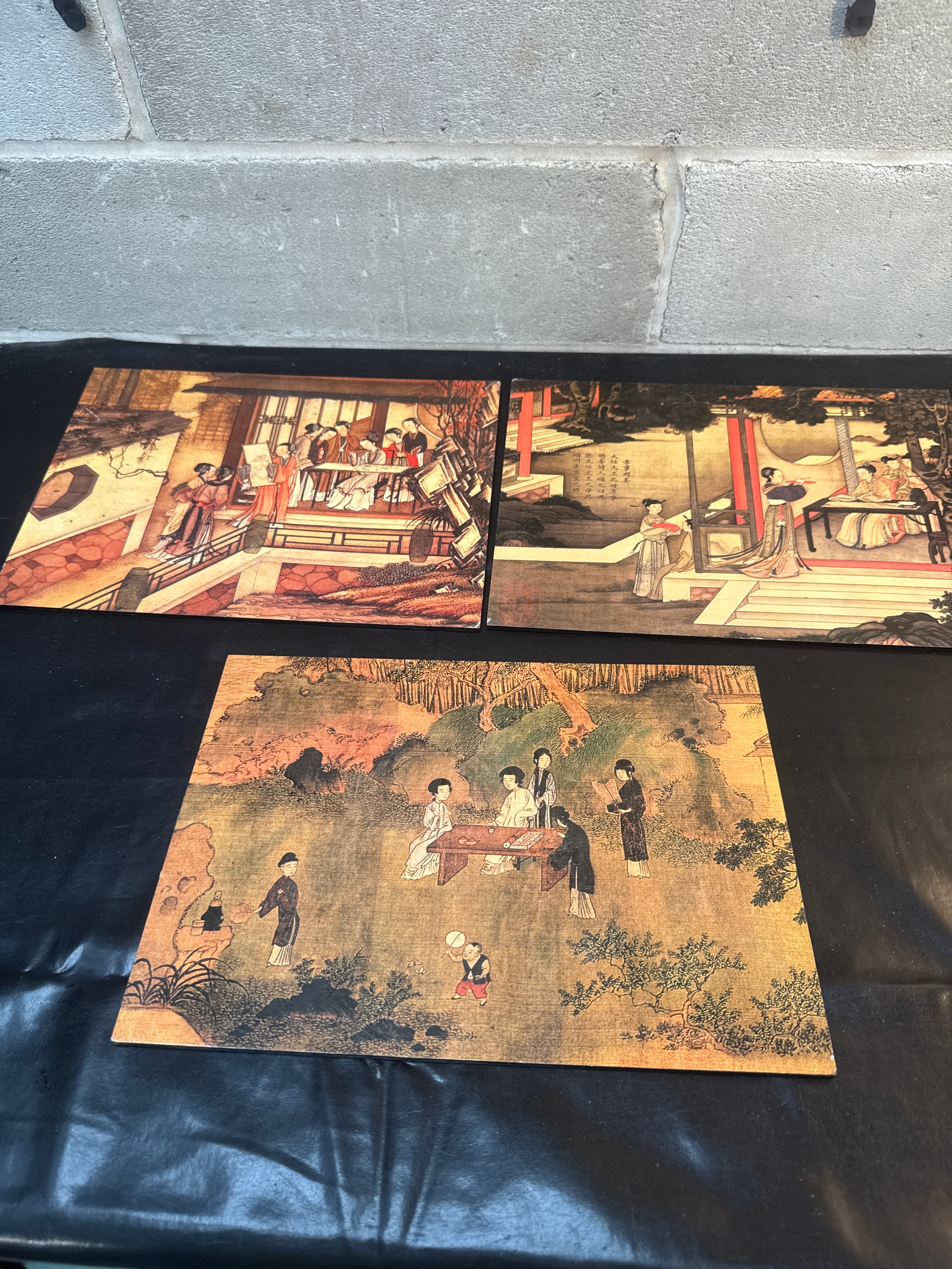A group of three decorative reproductive prints, executed in the classical Chinese painting style. Each print depicts various genre scenes with multiple figures in traditional attire within interior and exterior architectural settings, including a garden scene. The imagery reflects historical Chinese aesthetics, drawing influence from Ming or Qing dynasty art. The prints are executed on paper, mounted onto a rigid substrate, and feature a slightly glossy finish. One print bears visible vertical text in traditional Chinese characters, which translates to excerpts from Tang dynasty poems by Li Bai (‘Preface to a Spring Day Feast at the Peach and Plum Garden’) and Zhang Ruoxu (‘A Night on the Spring River with Flowers and Moon’).