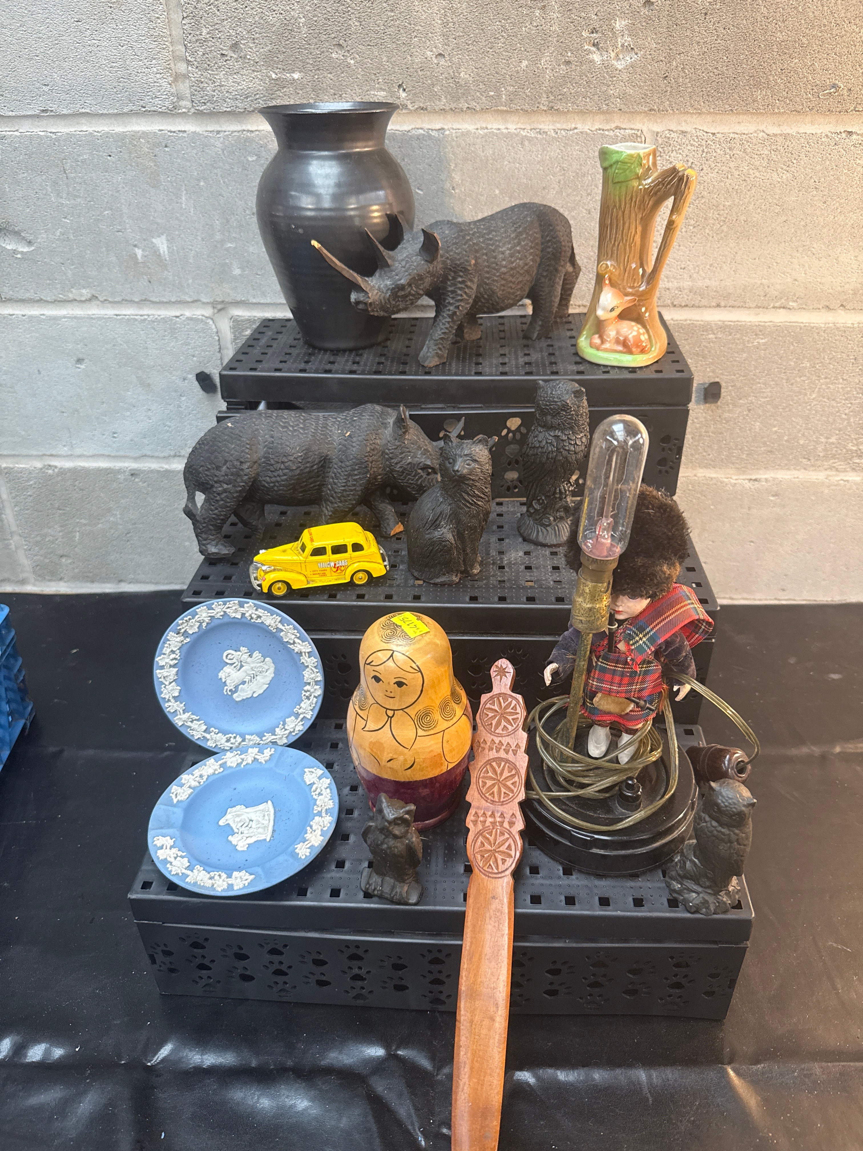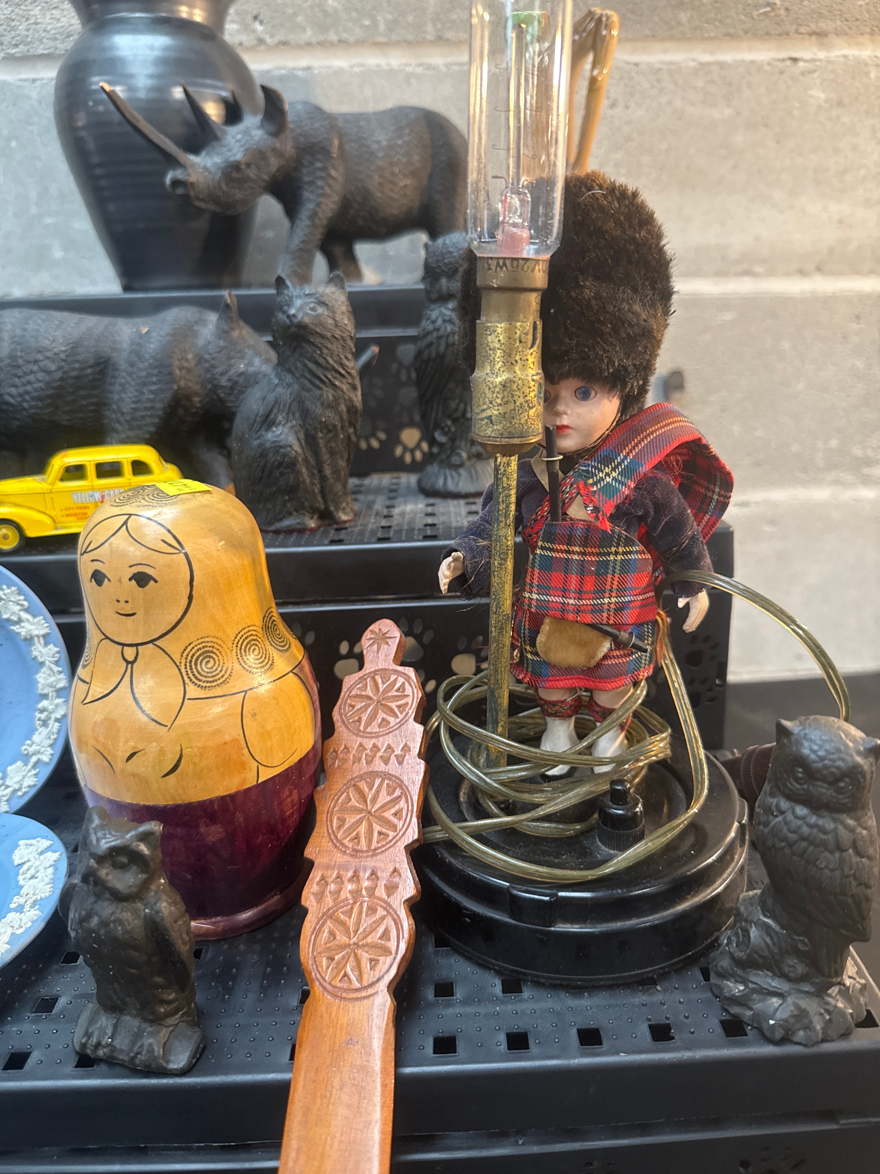 This diverse collection comprises decorative and functional objects, predominantly crafted from carved wood, ceramic, and resin, with additional elements of pottery, plastic, metal, and textile. Key items include a black pottery vase, a light brown ceramic tree-trunk pitcher, and a group of dark animal figurines depicting rhinos, a boar, cats, and owls. Also present are a large painted wooden Matryoshka nesting doll and a carved wooden paddle featuring geometric patterns. The lot further includes two light blue decorative plates with white classical relief designs, reminiscent of Jasperware, a yellow toy car marked “TAXI,” and a unique table lamp incorporating a doll dressed in a kilt and fur hat holding a bare light bulb.