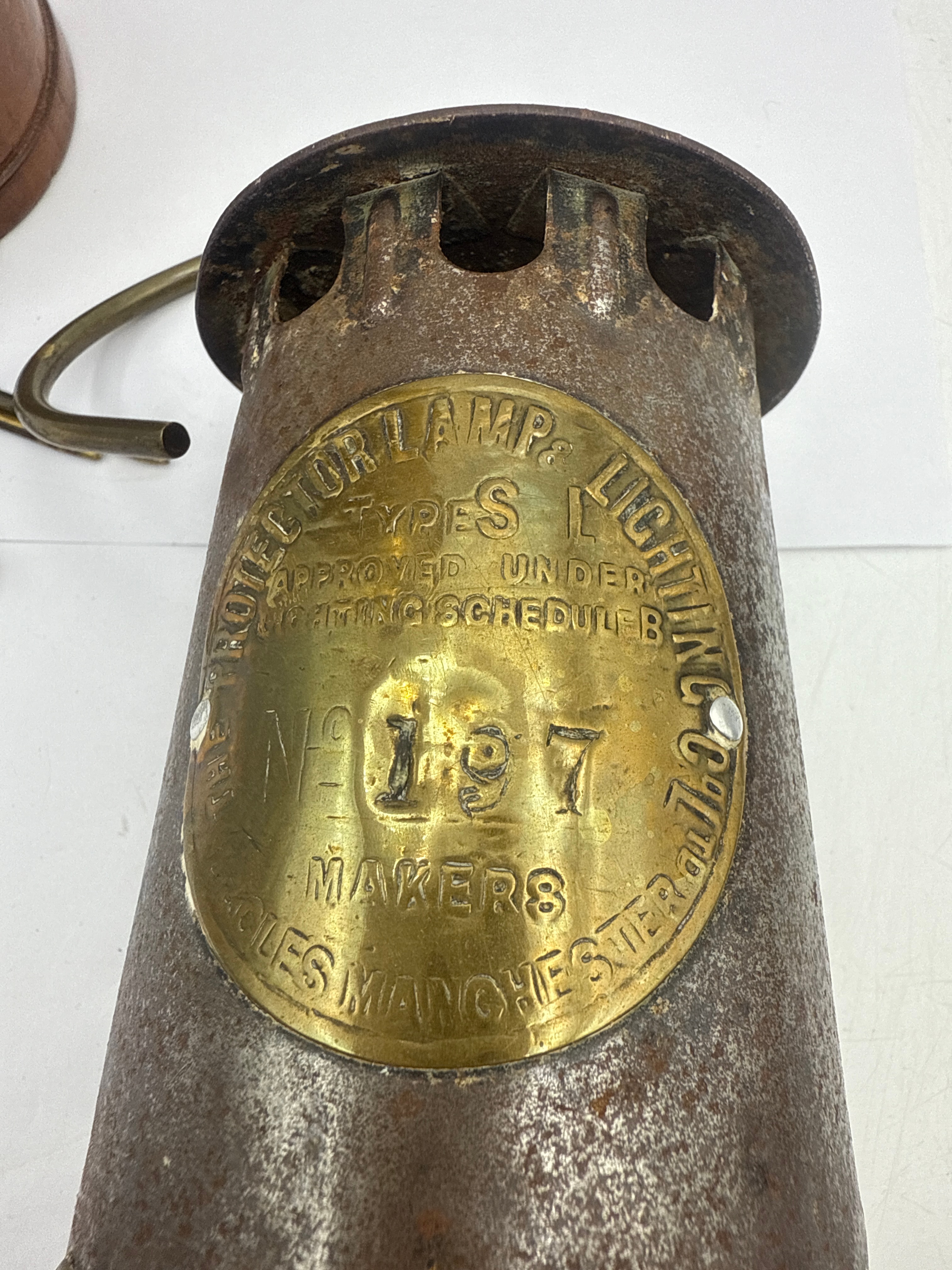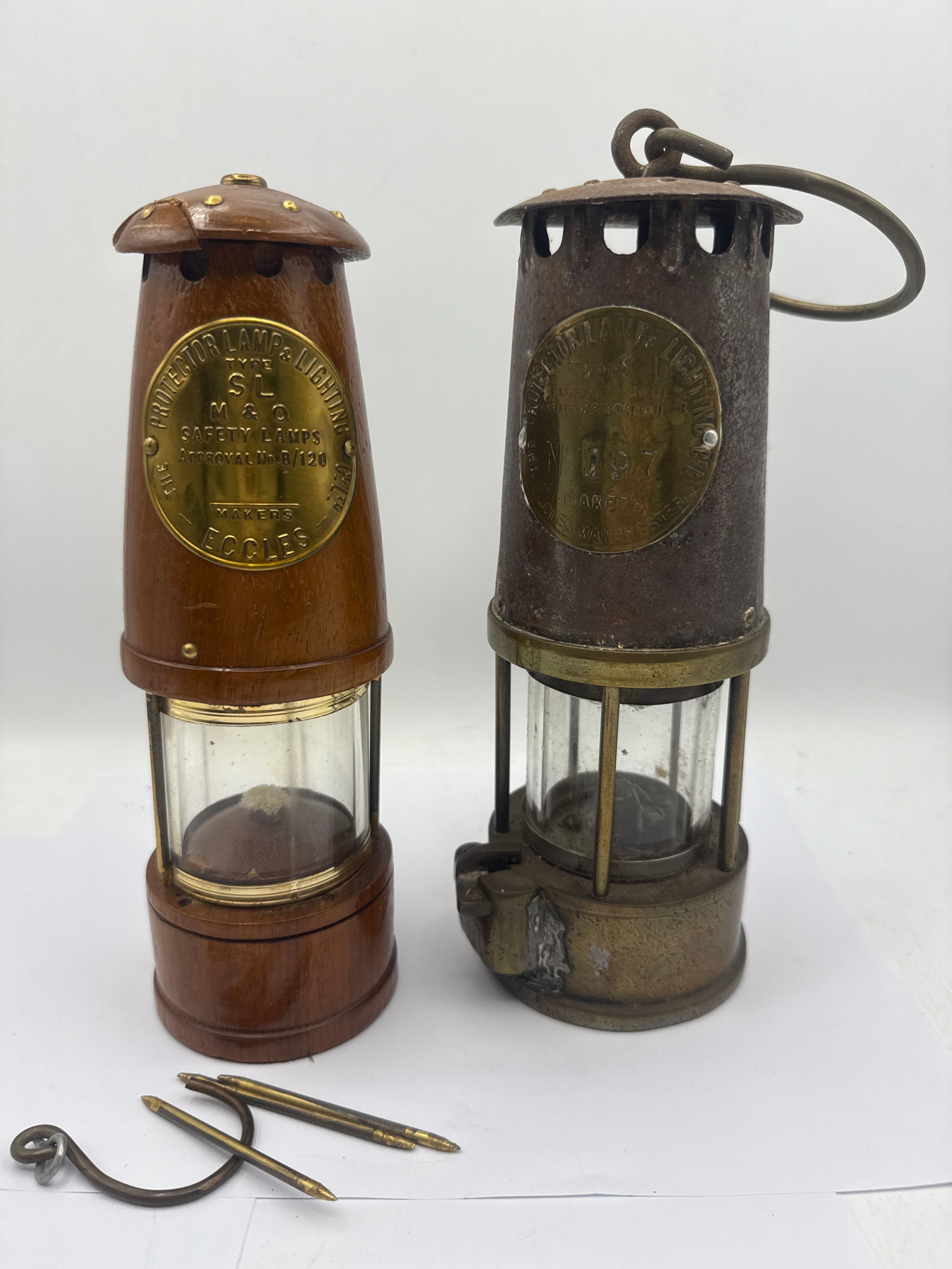 A pair of miners’ safety lamps by The Protector Lamp & Lighting Co. Ltd., Eccles, accompanied by several small metal accessories. One lamp features a polished wooden upper body with brass accents, including a prominent brass plaque engraved with “THE PROTECTOR LAMP & LIGHTING Co. LTD.”, “TYPE SL”, “M & Q”, “SAFETY LAMPS”, “APPROVAL No. B/120”, and “MAKERS ECCLES”. The second lamp has a dark metal cylindrical body with a brass plaque that reads “THE PROTECTOR LAMP & LIGHTING Co. LTD.”, “TYPES I.L.”, “APPROVED UNDER MINING SCHEDULES”, “No. 197”, and “MAKERS ECCLES MANCHESTER”. The accessories include three small, pointed metal rods and a small metal hook.