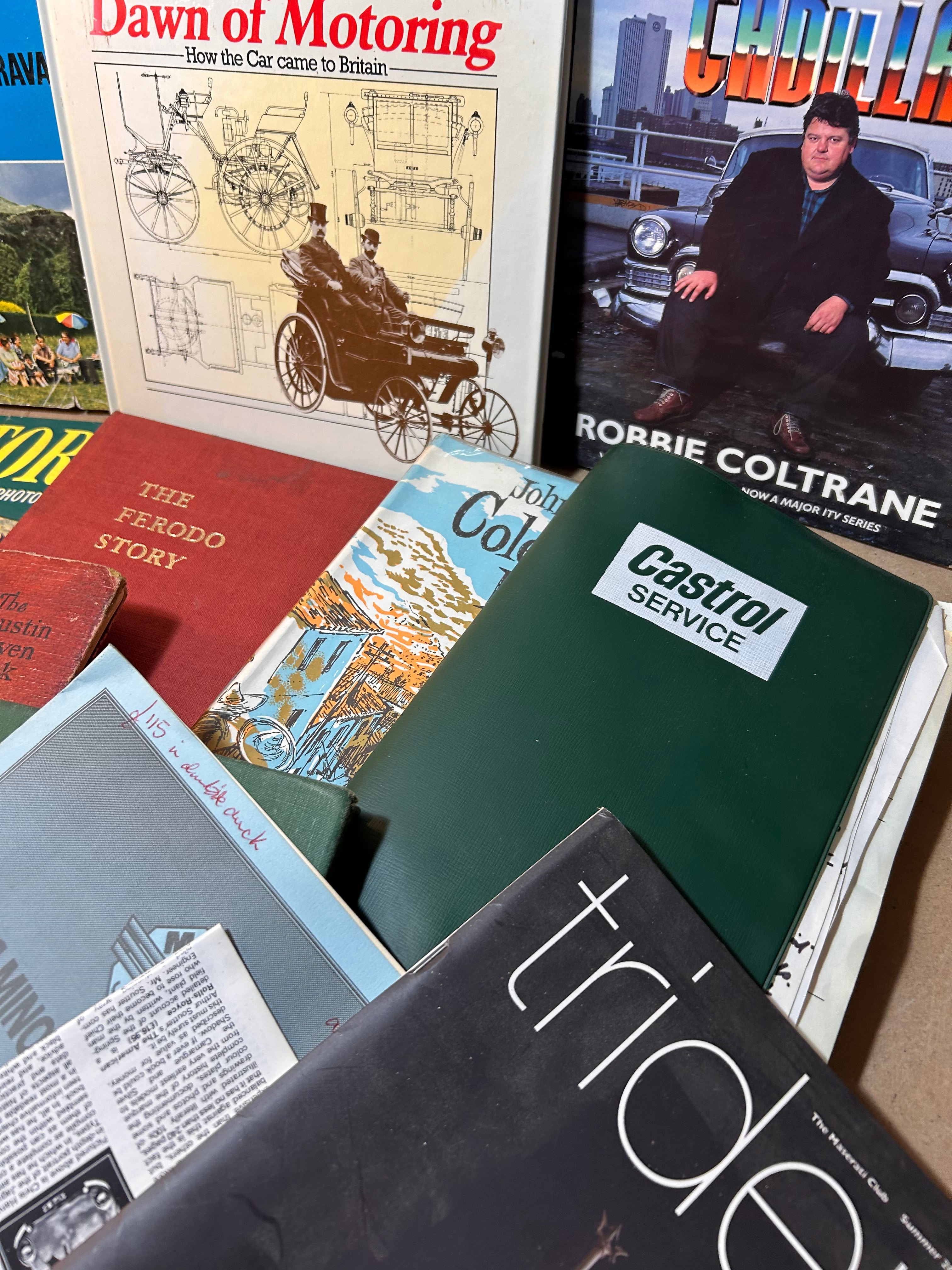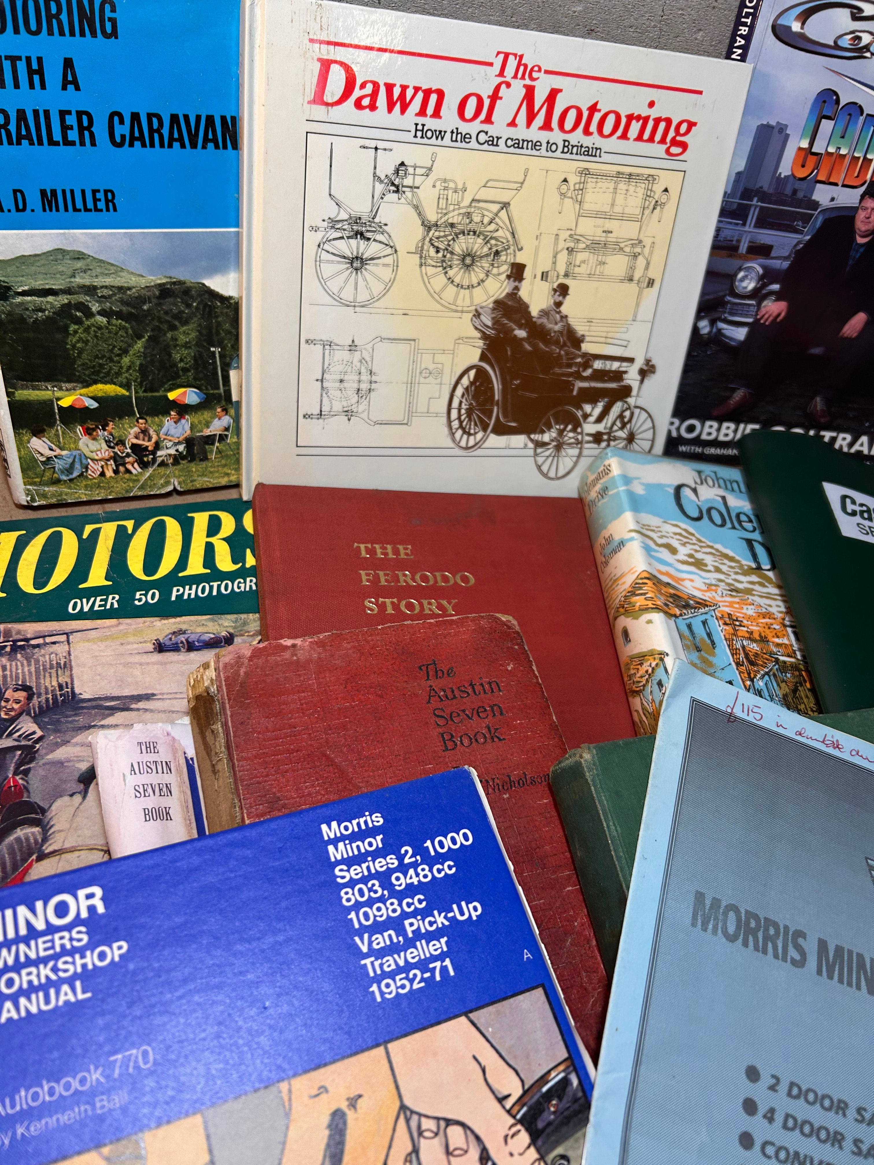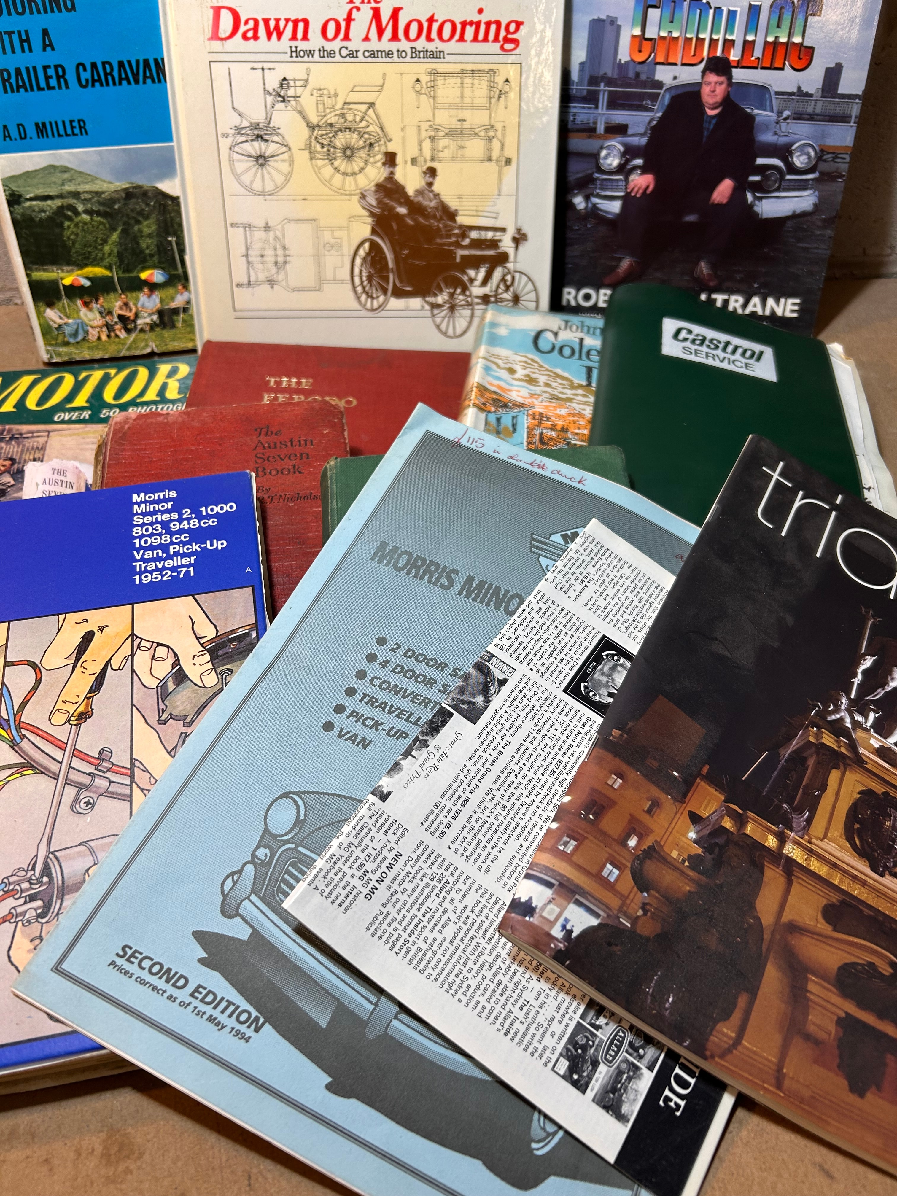 A collection of approximately ten to fifteen automotive-themed books, manuals, and periodicals. Visible titles include “The Dawn of Motoring – How the Car came to Britain,” “The Ferodo Story,” “The Austin Seven Book,” a “Morris Minor Owners Workshop Manual” covering models from 1952-71 (803, 948cc, 1098cc Van, Pick-Up, Traveller), and a “Castrol Service” manual. Also includes items featuring “Cadillac” in conjunction with “Robbie Coltrane,” and a manual dated “Second Edition, Prices correct as of 1st May 1994.” All visible text is in English. The items are primarily constructed from paper and cardboard, encompassing a mix of hardcover books and softcover manuals or magazines.