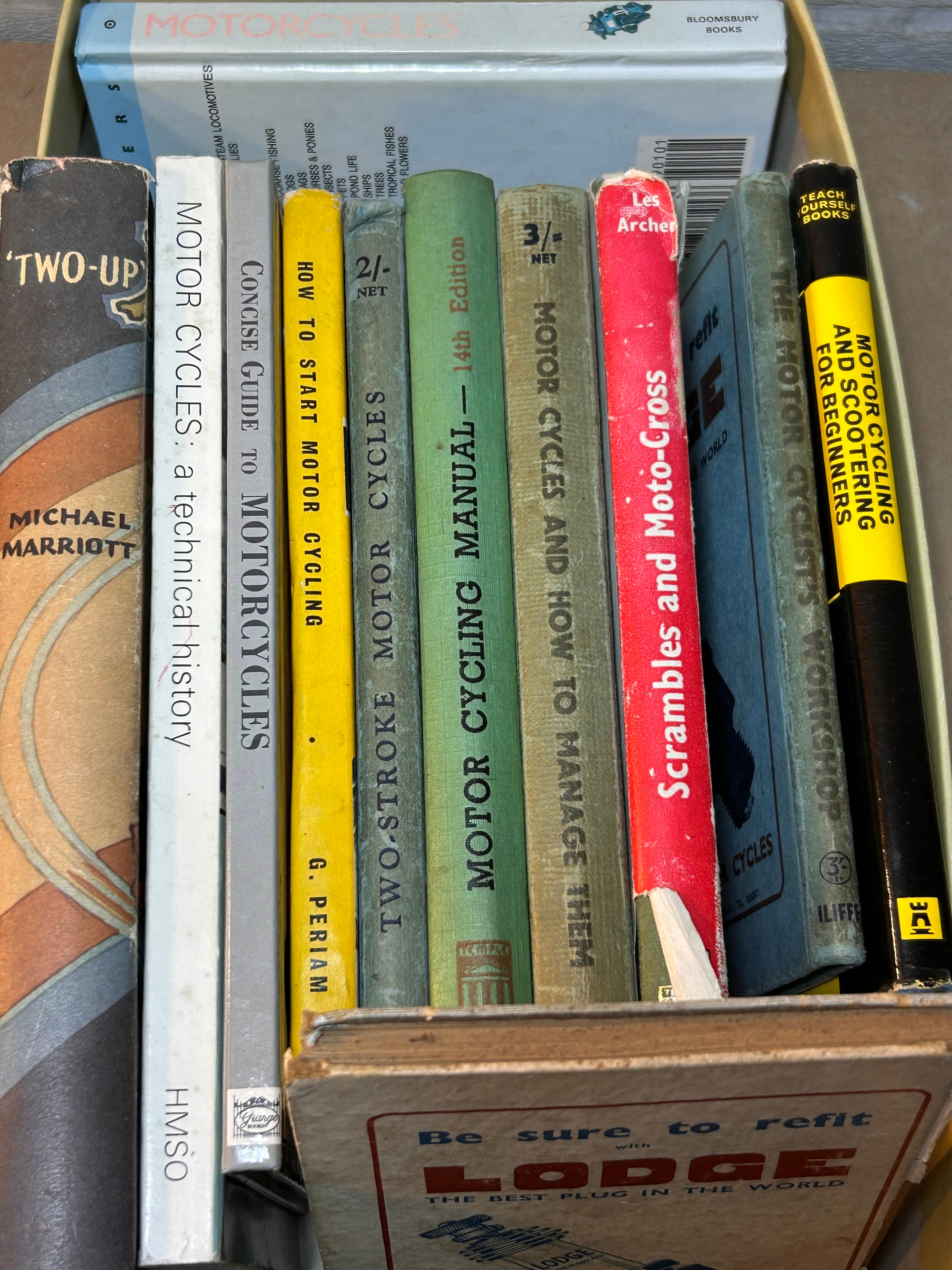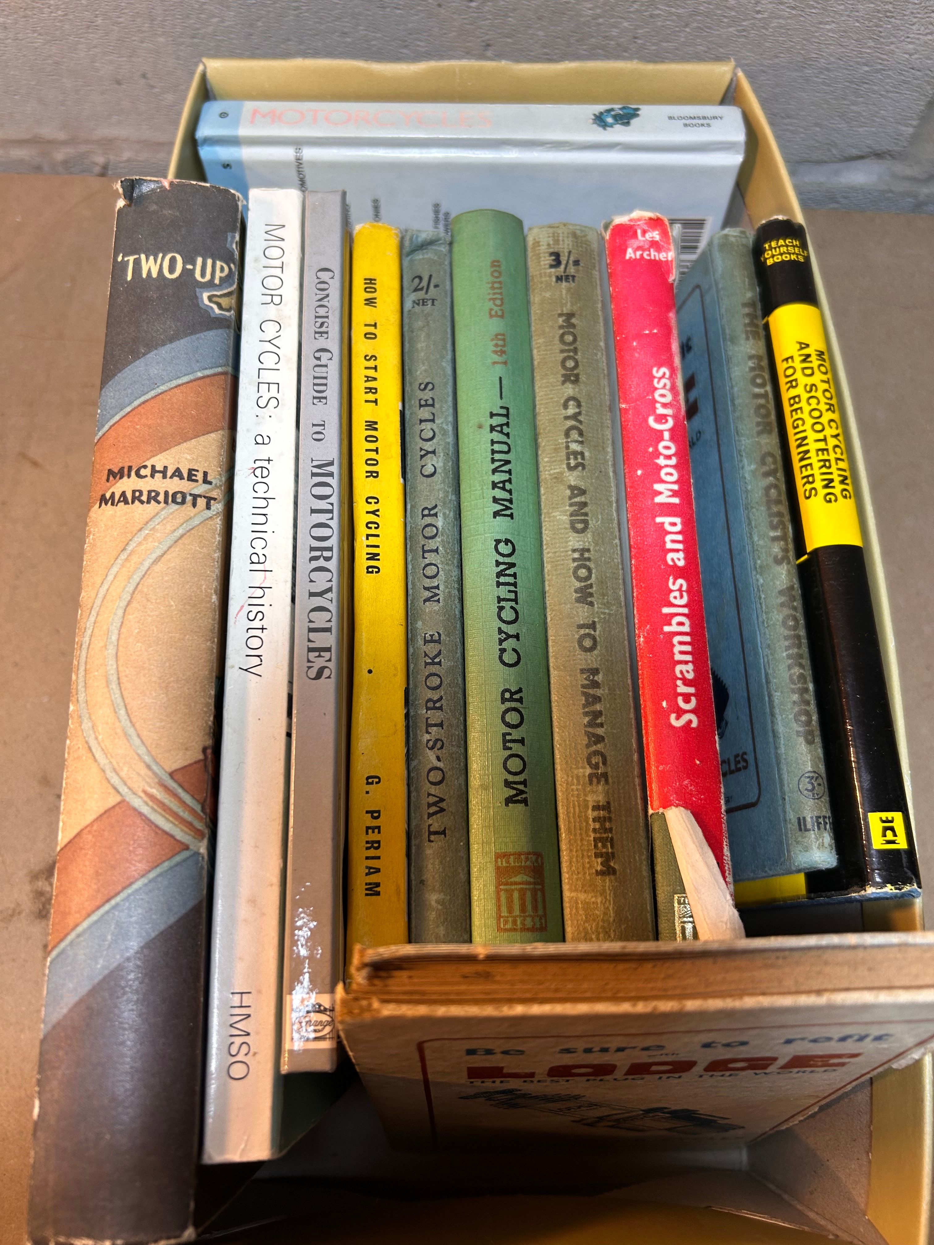A collection of approximately ten English-language books, mostly hardback and some paperback volumes, with a central theme of motorcycling. Titles include “MOTOR CYCLES: a technical history,” “Concise Guide to MOTORCYCLES,” “HOW TO START MOTOR CYCLING,” “TWO-STROKE MOTOR CYCLES,” “MOTOR CYCLING MANUAL – 14th Edition,” “MOTOR CYCLES AND HOW TO MANAGE THEM,” “Scrambles and Moto-Cross,” and “MOTORCYCLING AND SCOOTERING FOR BEGINNERS.” Visible publishers include HMSO, Bloomsbury Books, Les Archer, and Iliffe. The typography and period pricing (e.g., “2/- NET,” “3/6 NET”) suggest the books date from the mid-to-late 20th century. The collection is stored upright in a plain cardboard box. A separate item visible at the bottom of the box, possibly a promotional brochure or box lid, features the text “LODGE THE BEST PLUG IN THE WORLD.”