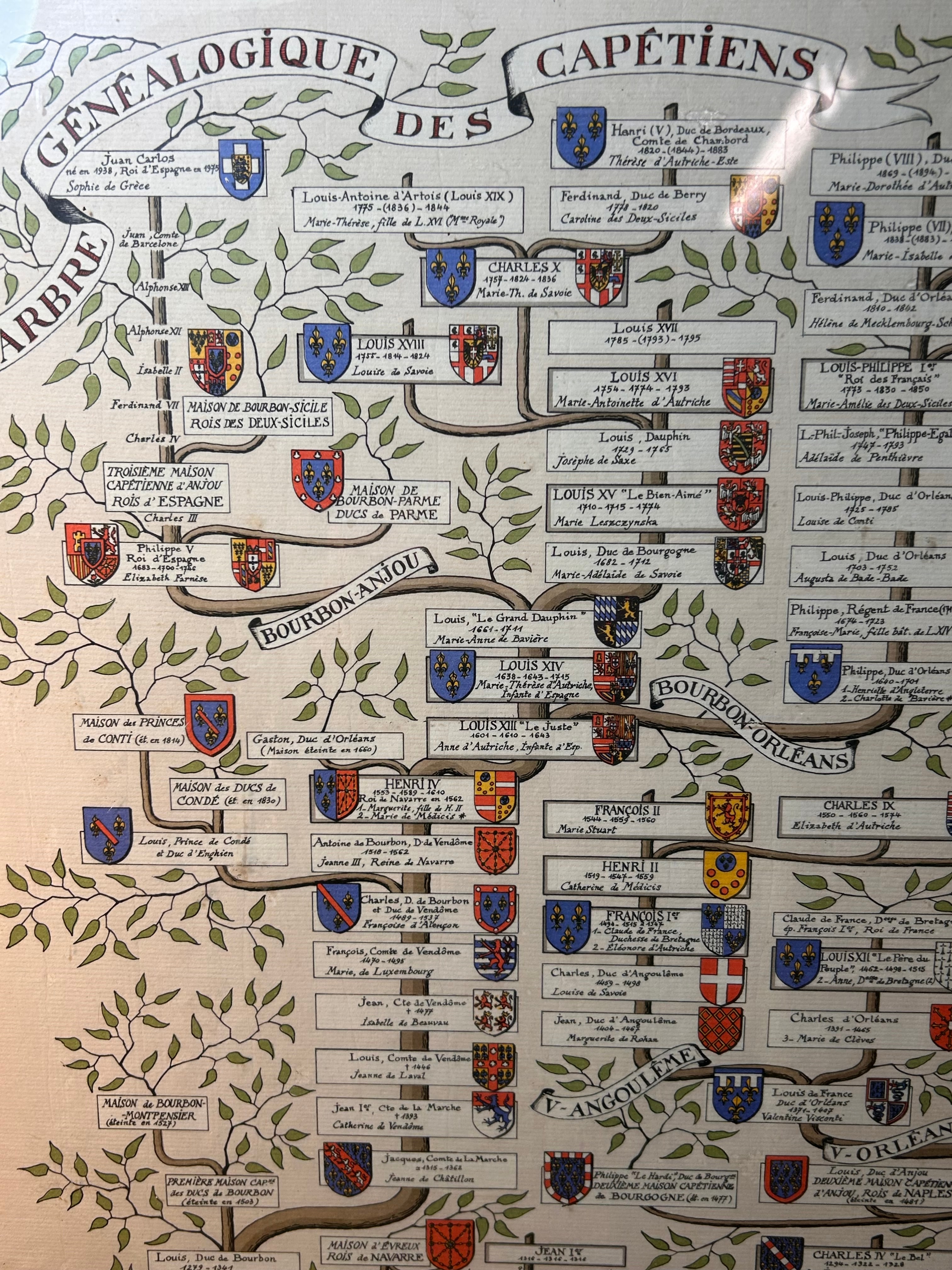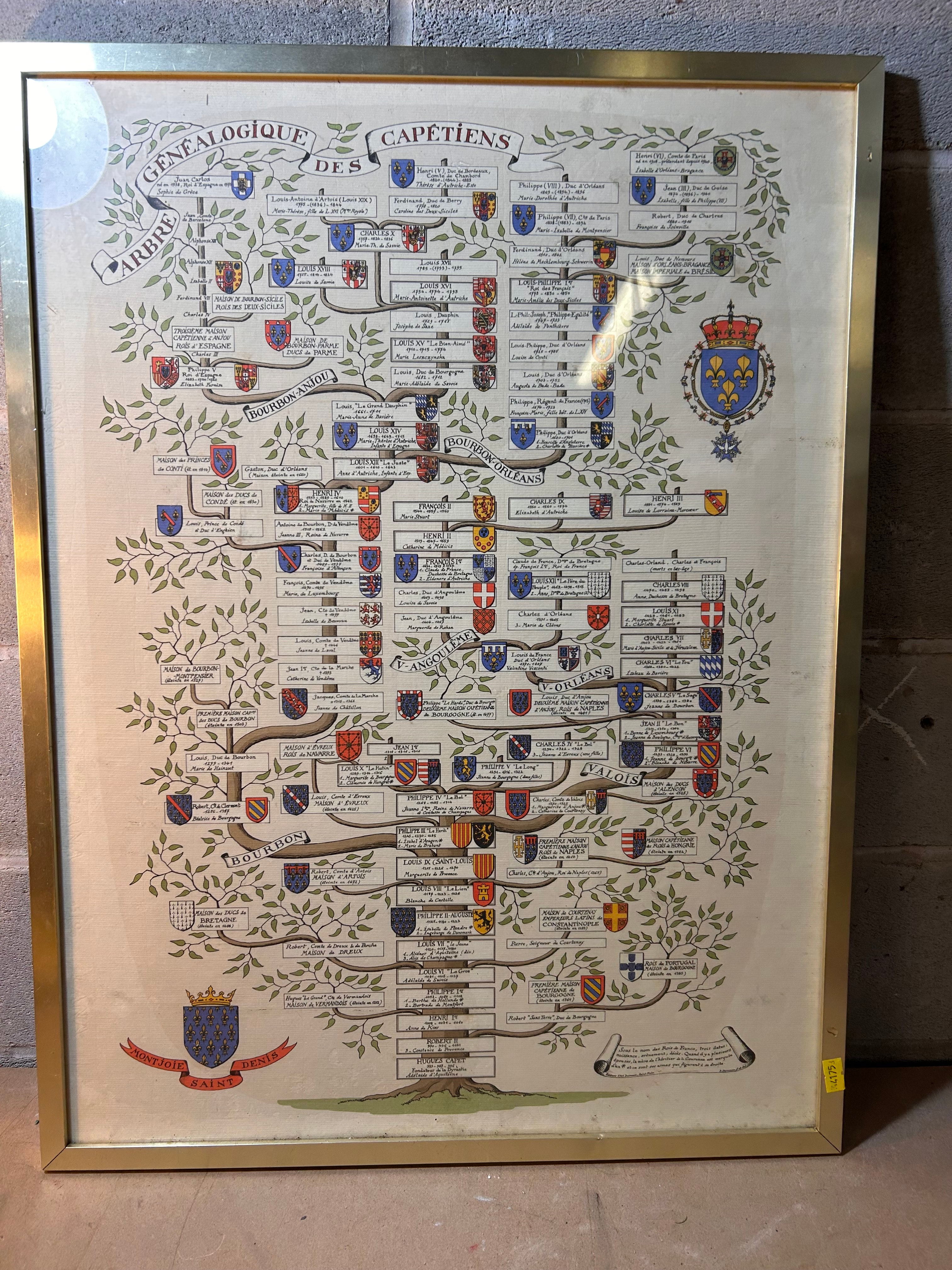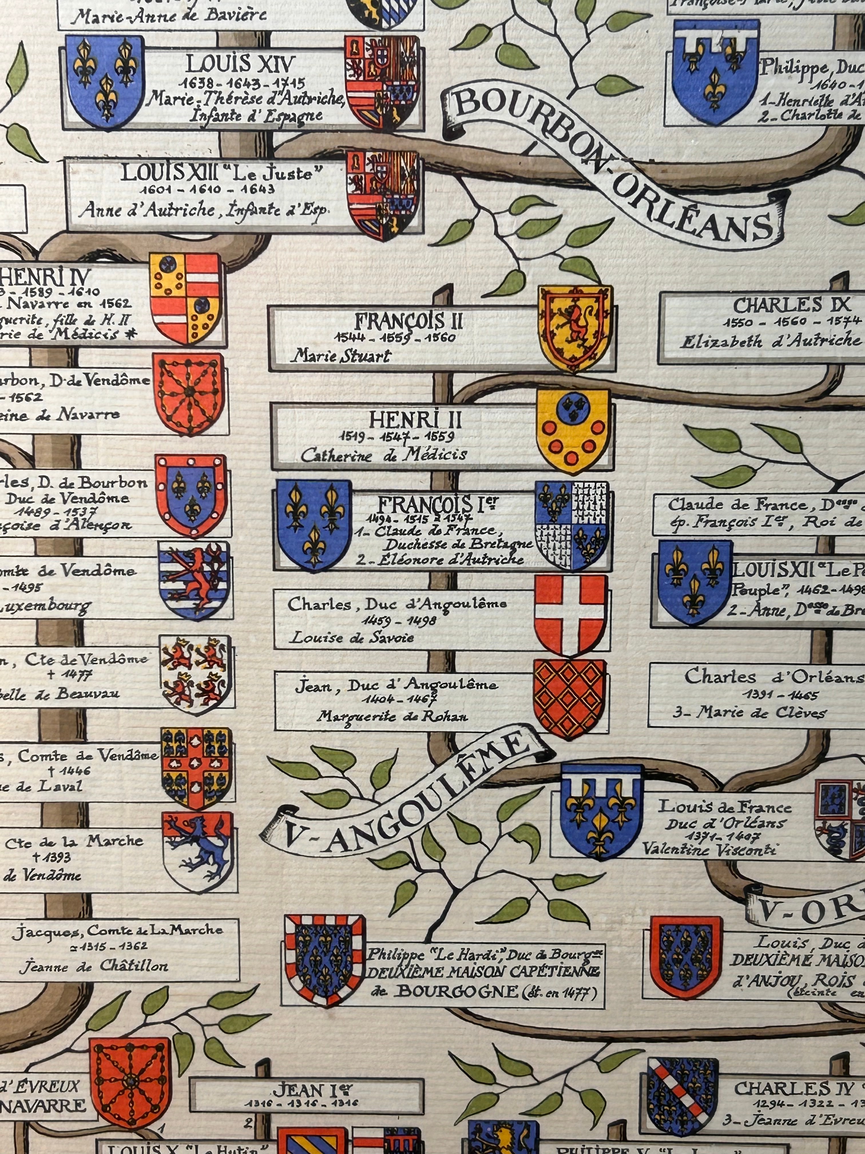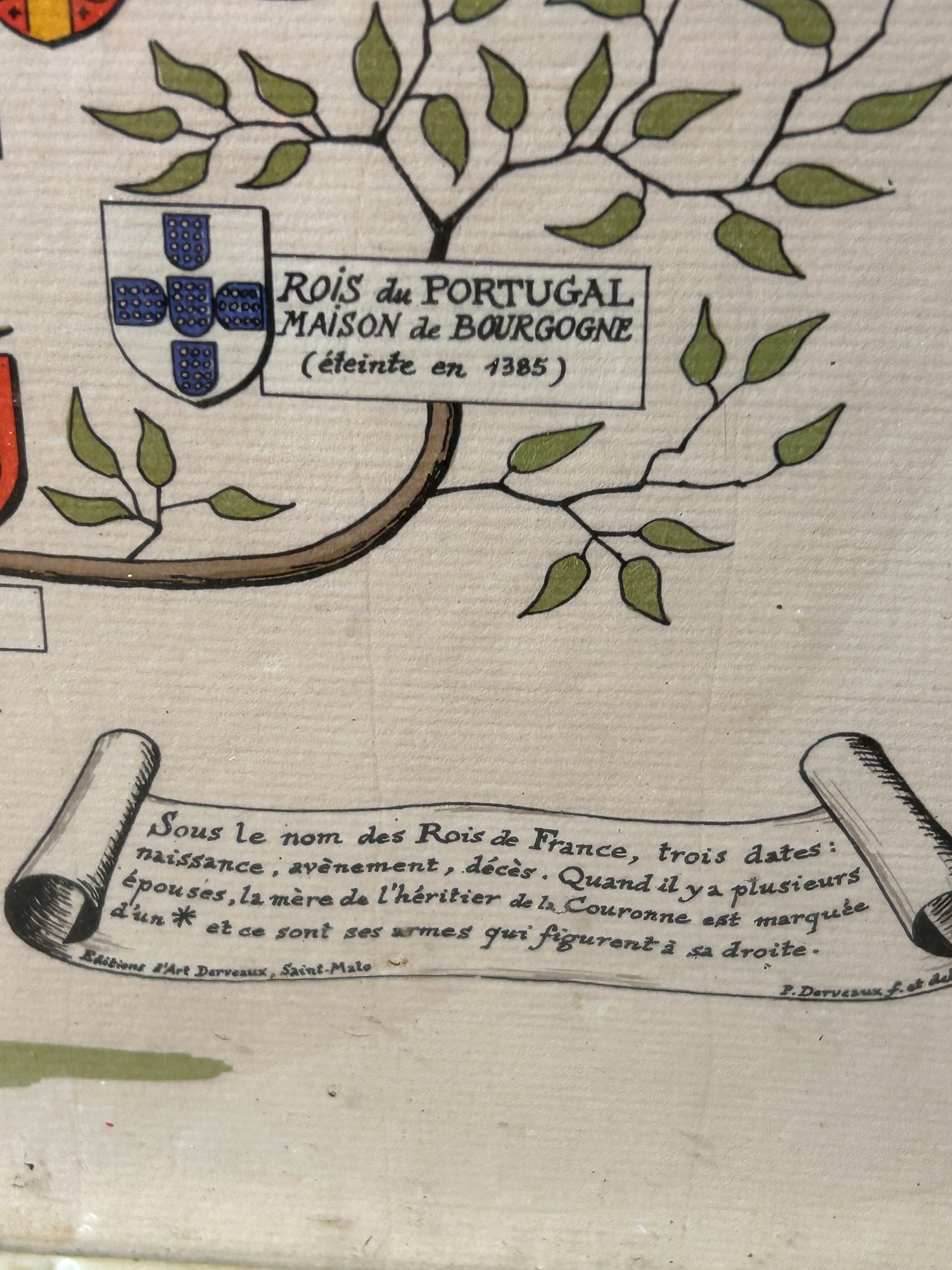 An ‘Arbre Généalogique des Capétiens’ (Genealogical Tree of the Capetians) print published by Éditions d’Art Derveaux, Saint-Malo. This colorful print illustrates various French and related European royal houses, such as Bourbon-Anjou and Bourbon-Orléans, featuring individual names, birth, accession, and death dates, alongside their respective heraldic coats of arms. All visible text is in French, including a scroll detailing the display conventions for dates and spouses: “Sous le nom des Rois de France, trois dates: naissance; avènement, décès. Quand il y a plusieurs épouses, la mère de l’héritier de la Couronne est marquée d’un * et ce sont ses armes qui figurent à sa droite.” The bottom of the print identifies the publisher as “Éditions d’Art Derveaux, Saint-Malo” and “P. Derveaux f. et éd.” The print is housed under glass in a simple, gold-colored frame.