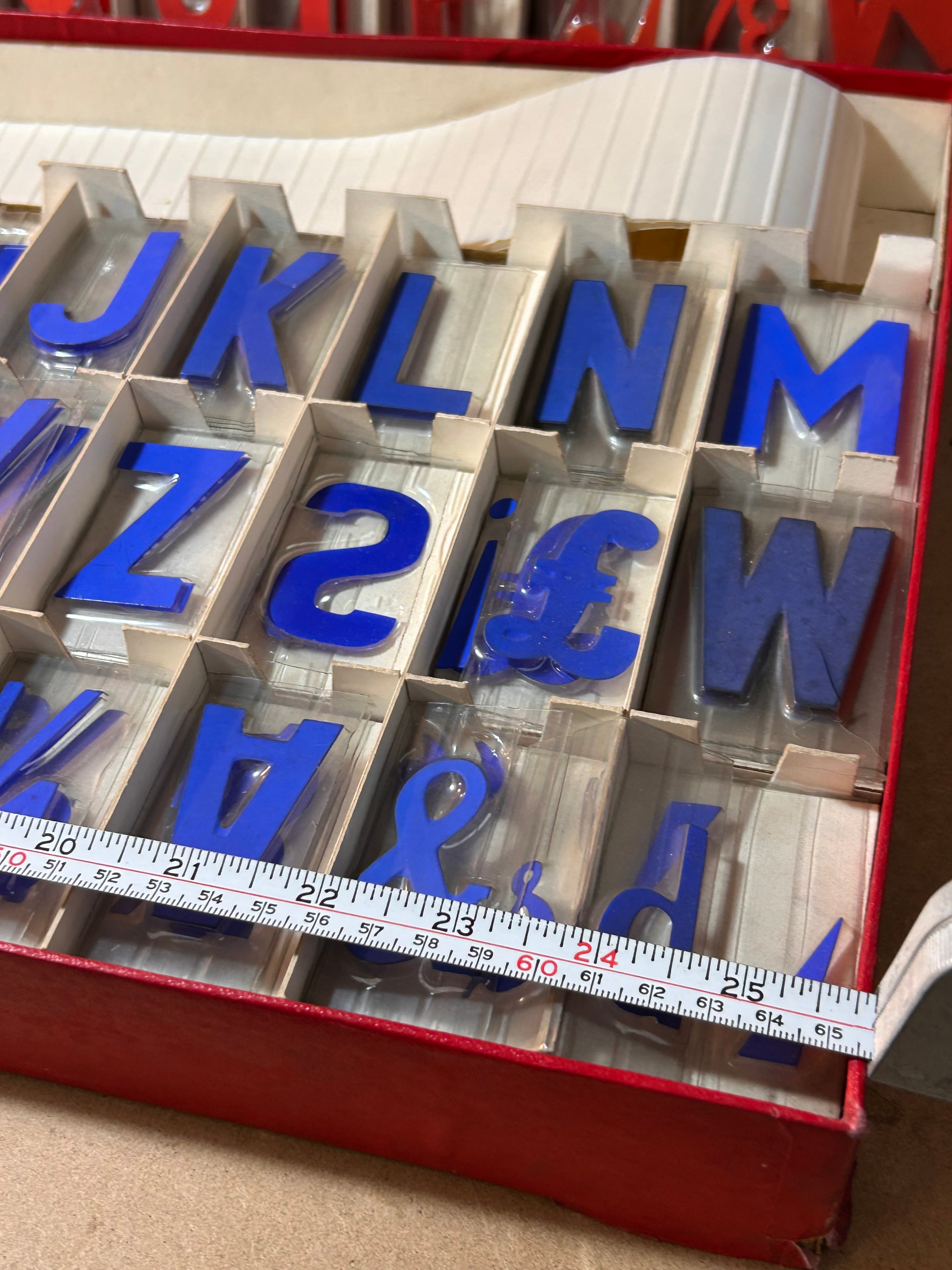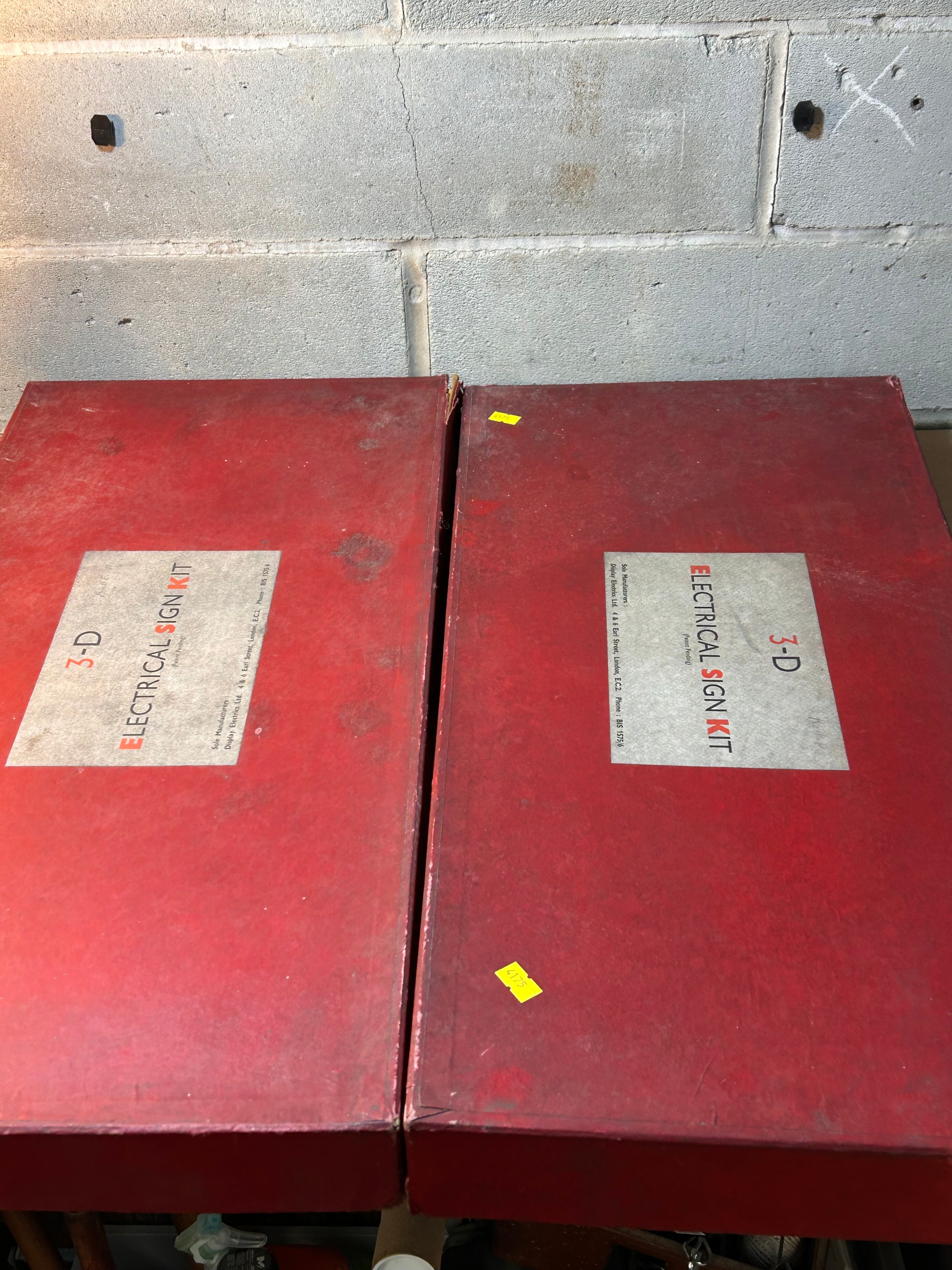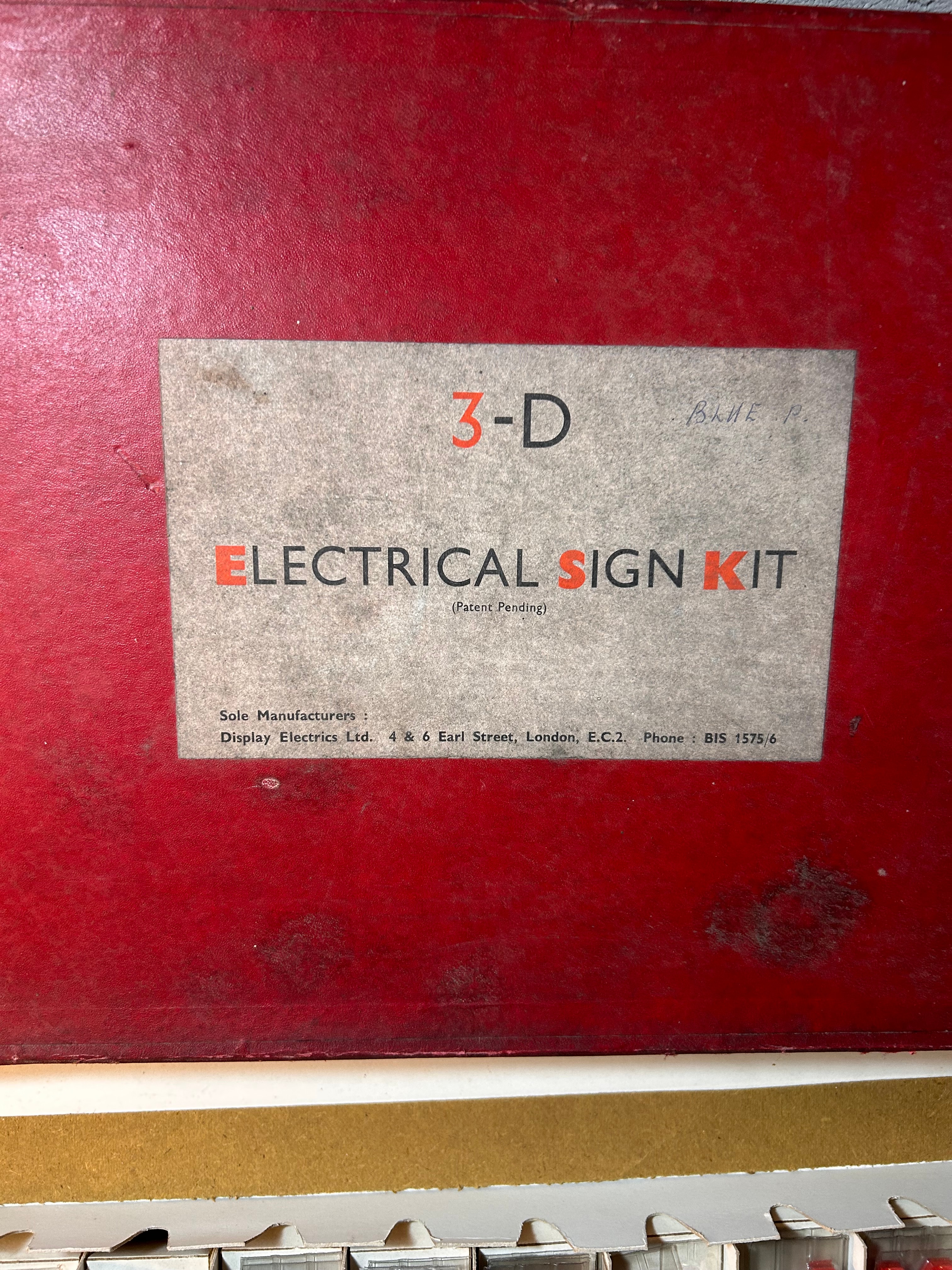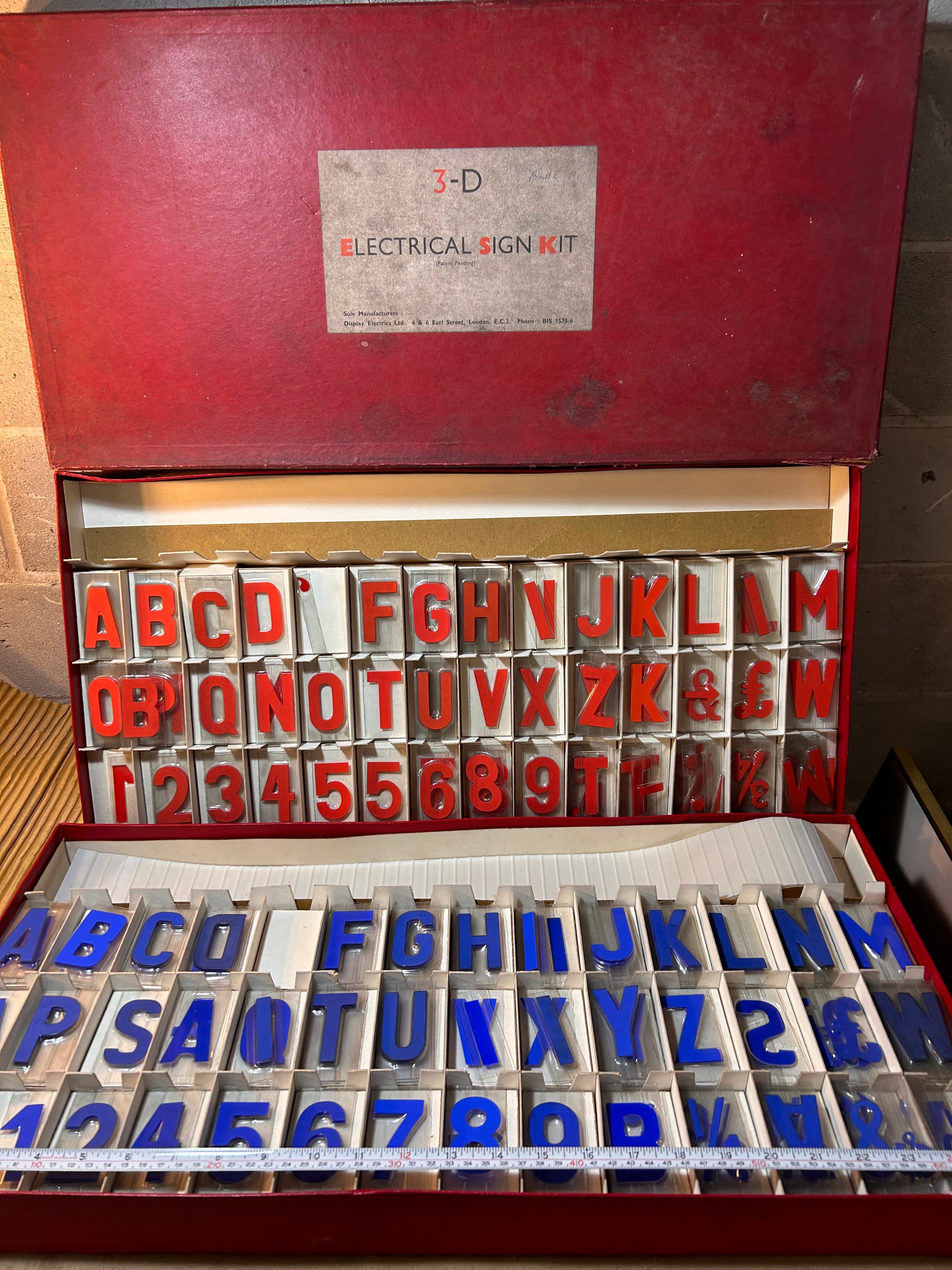 A pair of vintage ‘3-D Electrical Sign Kit’ sets, manufactured by Display Electrics Ltd., 4 & 6 Earl Street, London, E.C.2., with ‘Patent Pending’ noted on the labels. These mid-20th century kits are designed for creating three-dimensional electrical signs. Each rectangular red cardboard box contains numerous individual, molded plastic, sans-serif characters, including letters, numbers, and symbols, organized within cardboard compartment dividers. One kit features red characters, while the other contains blue characters. One box label includes a handwritten ‘BLUE P.’ annotation.