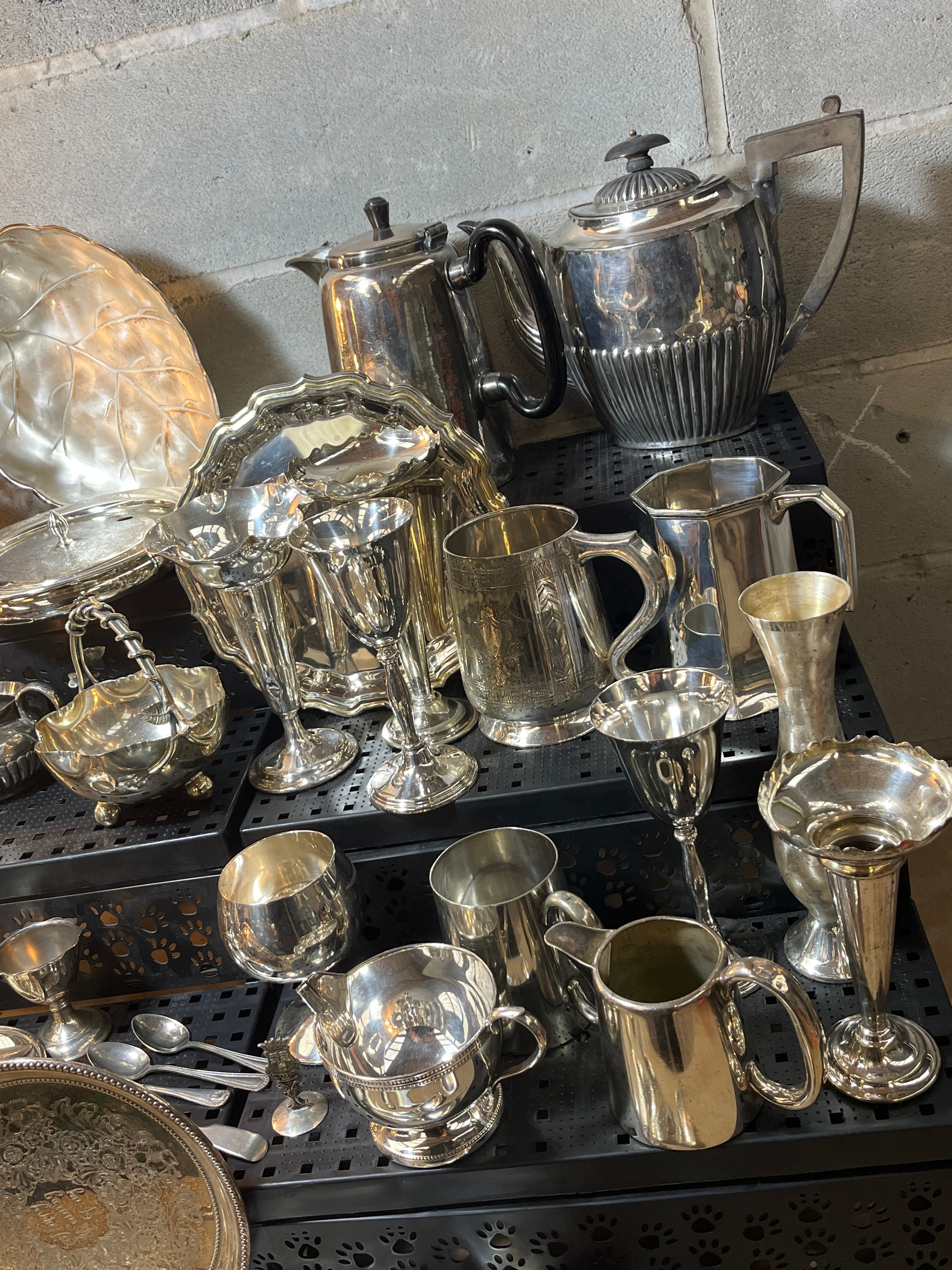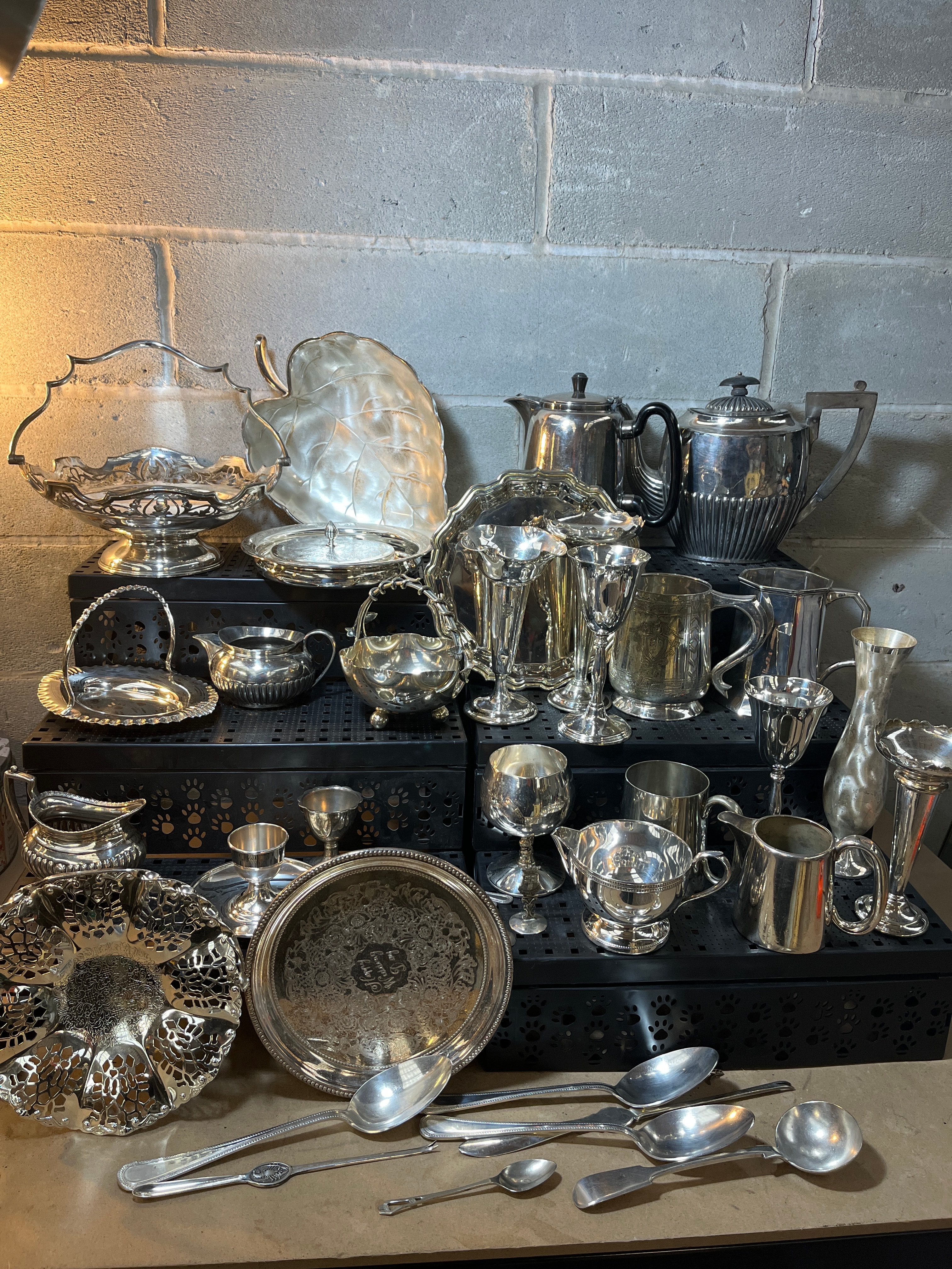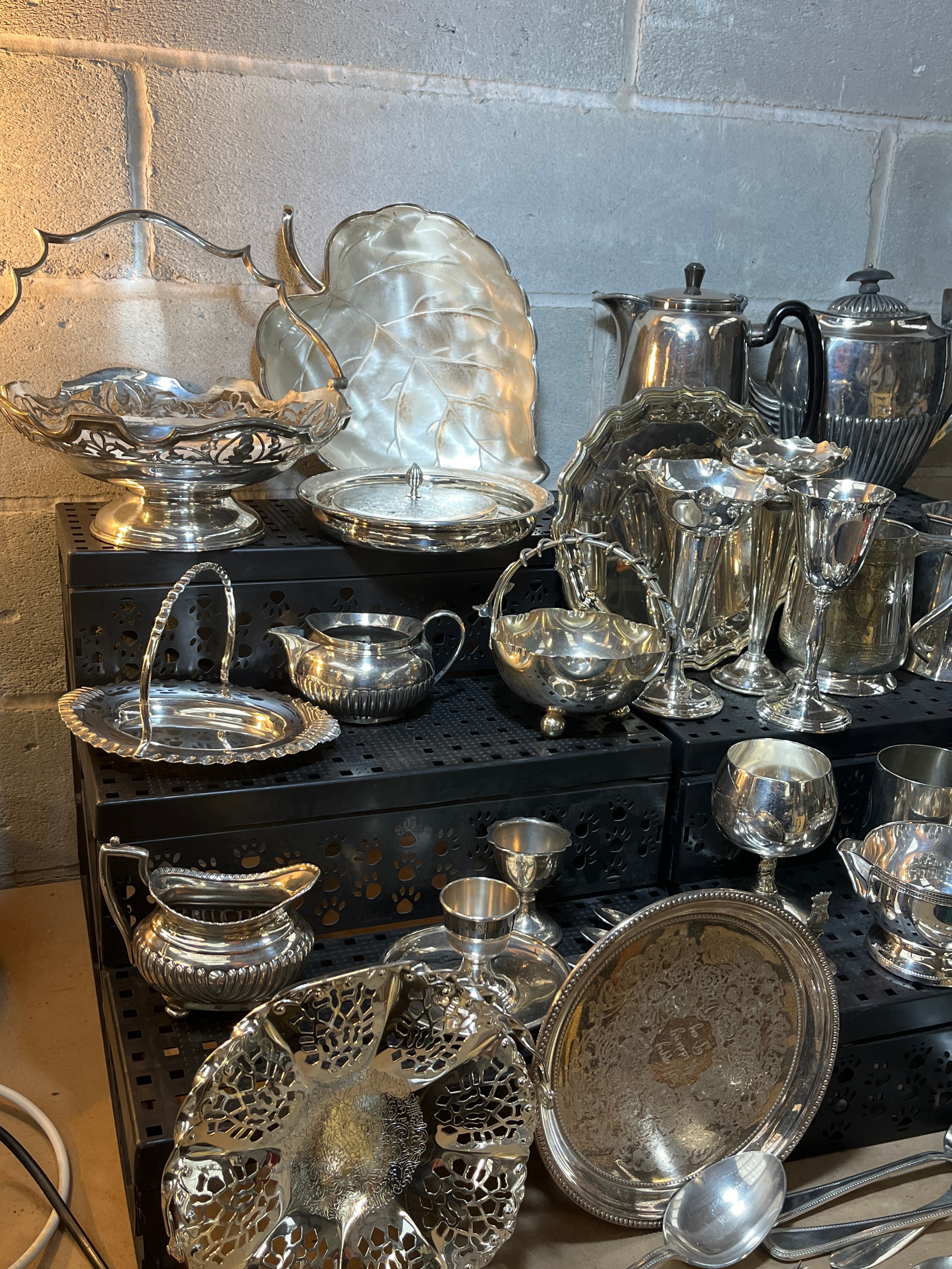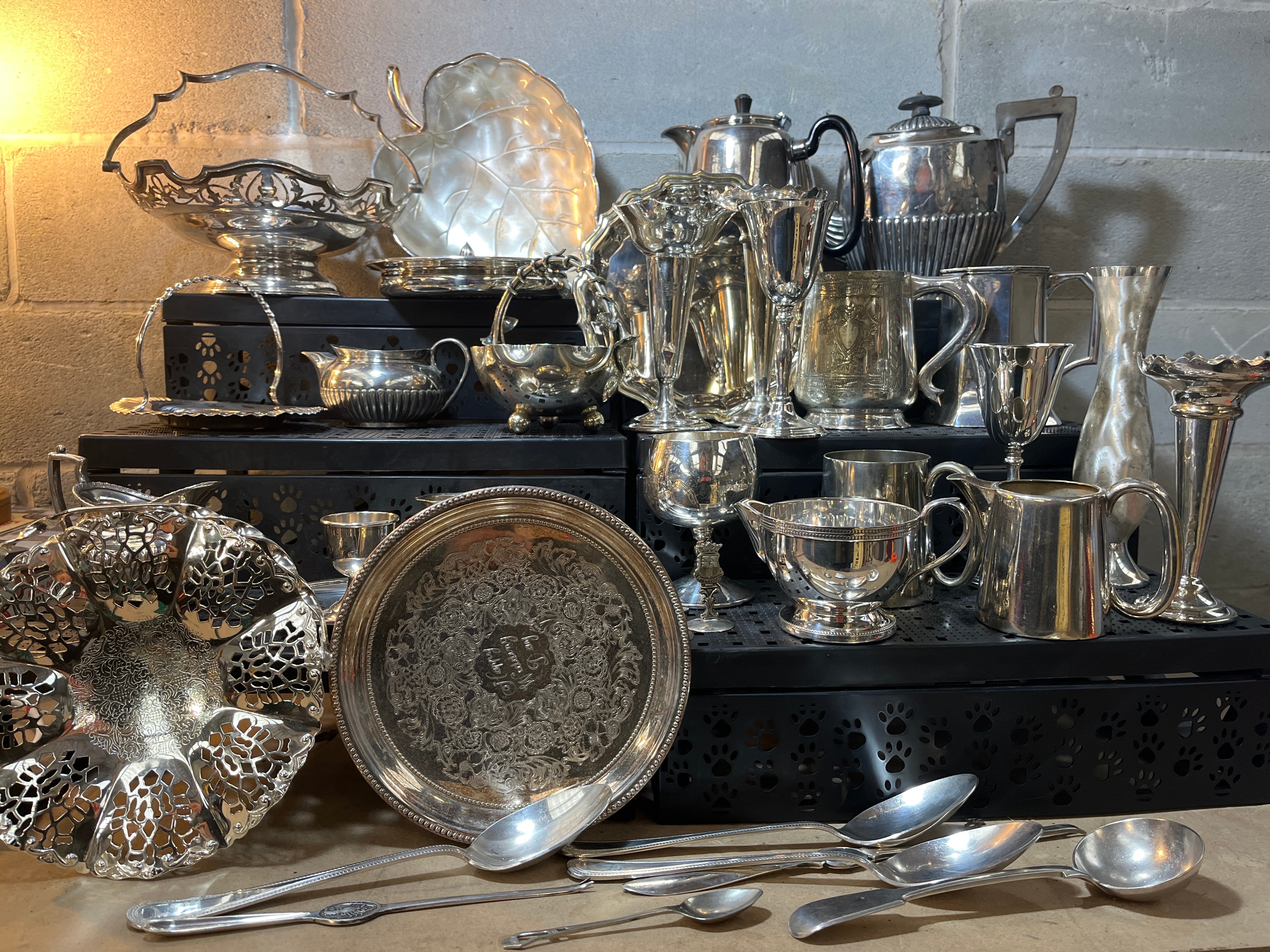 A large collection of silverplate hollowware and flatware, likely spanning from the late 19th to mid-20th century. The assortment includes various object types such as teapots, coffee pots, creamers, sugar bowls, diverse bowls (including footed, lidded, pierced, and a large leaf-shaped dish), multiple trays (one large round tray features an engraved monogram, possibly “MRS” or “MS,” surrounded by an elaborate floral design), goblets, tankards, pitchers, vases, and an array of spoons and a fork. The styles are varied, ranging from ornate classical designs with fluting and decorative borders to more streamlined forms.
