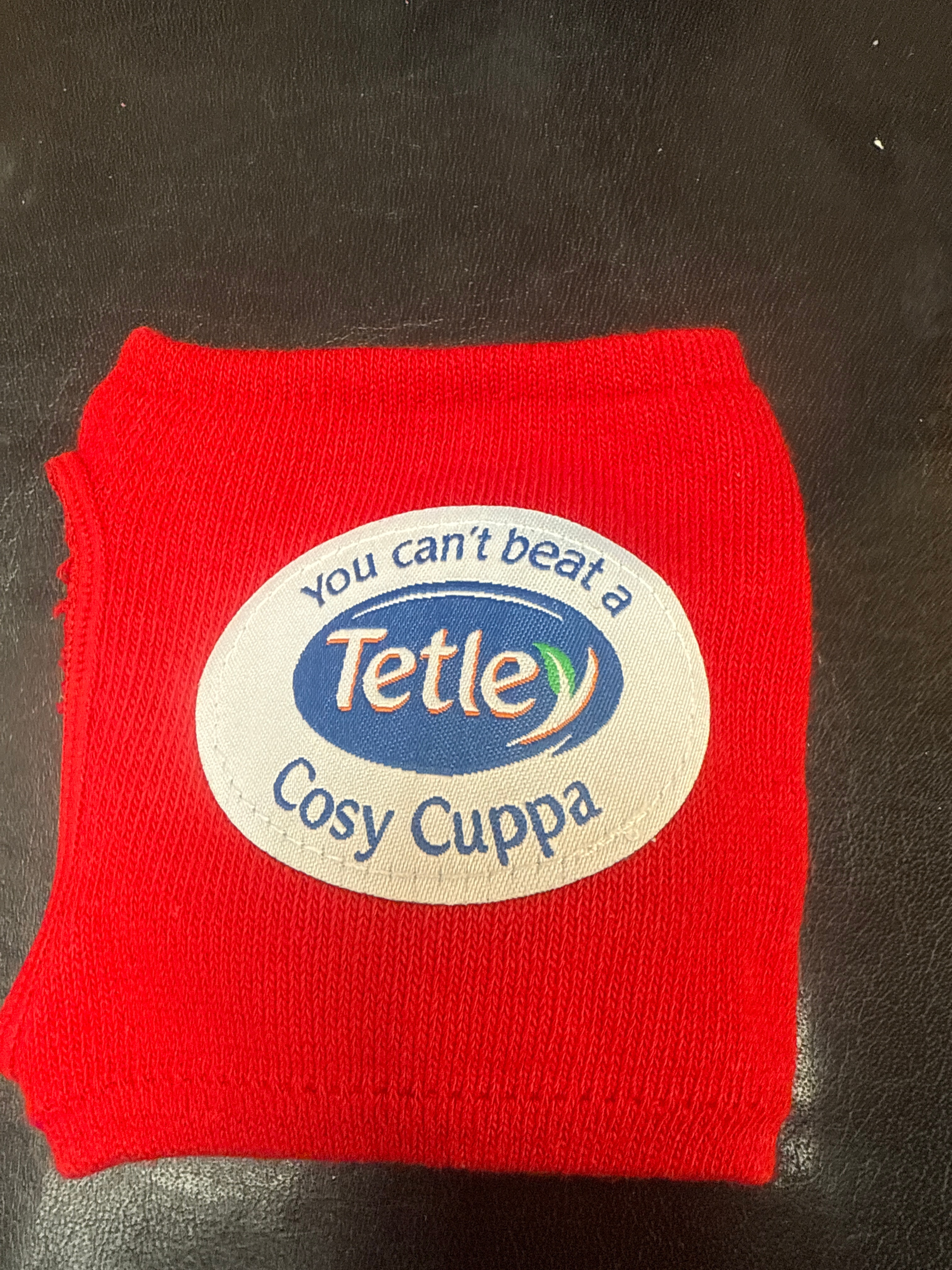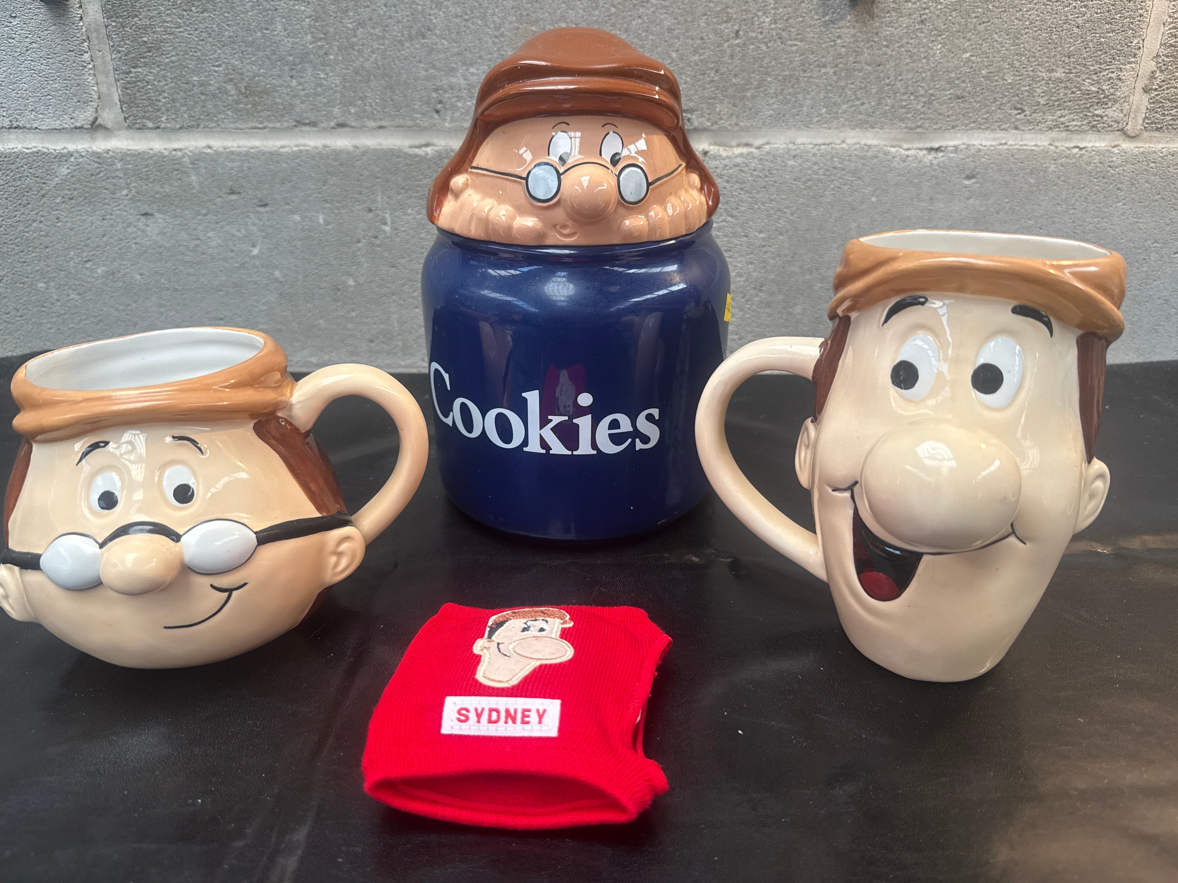 A group of Wade for Lyons Tetley ‘Tea Folk’ ceramics and an associated textile. The central ceramic piece is a character cookie jar, featuring a blue cylindrical body labeled ‘Cookies’ in white script, topped by a brown lid shaped as a cartoon figure with glasses, consistent with the ‘Gaffer’ character from the Tetley Tea Folk series. Flanking the cookie jar are two glazed ceramic character mugs, each depicting a stylized male face; one with glasses and a subtle smile, the other with an open-mouthed expression, both representative of the ‘Tea Folk’ characters. Accompanying these is a red knitted textile, likely a tea cosy, featuring two distinct fabric patches: one with a cartoon monkey character above the word ‘SYDNEY,’ and another oval patch with the text ‘you can’t beat a Tetley Cosy Cuppa’ surrounding a ‘Tetley’ brand logo.