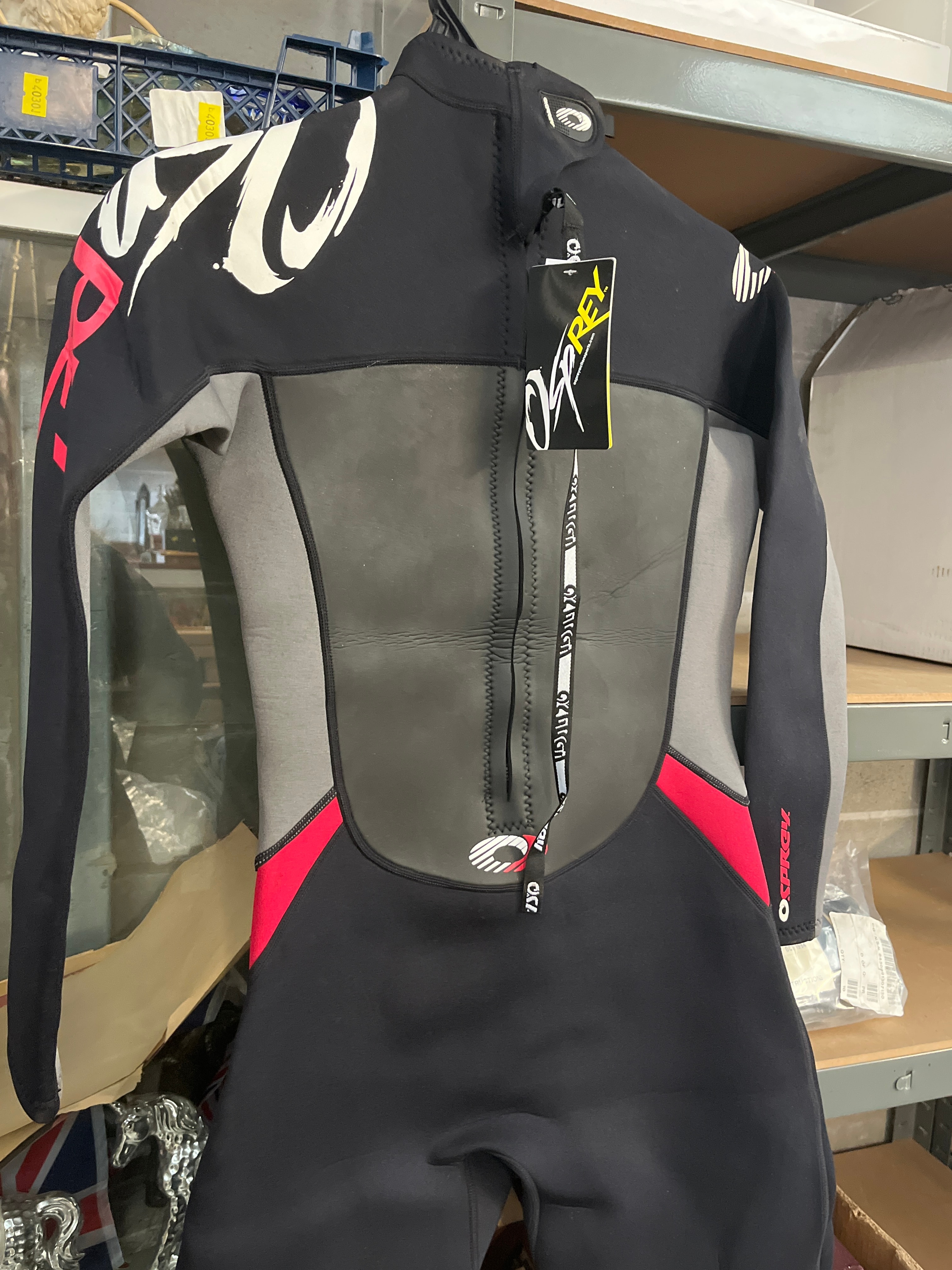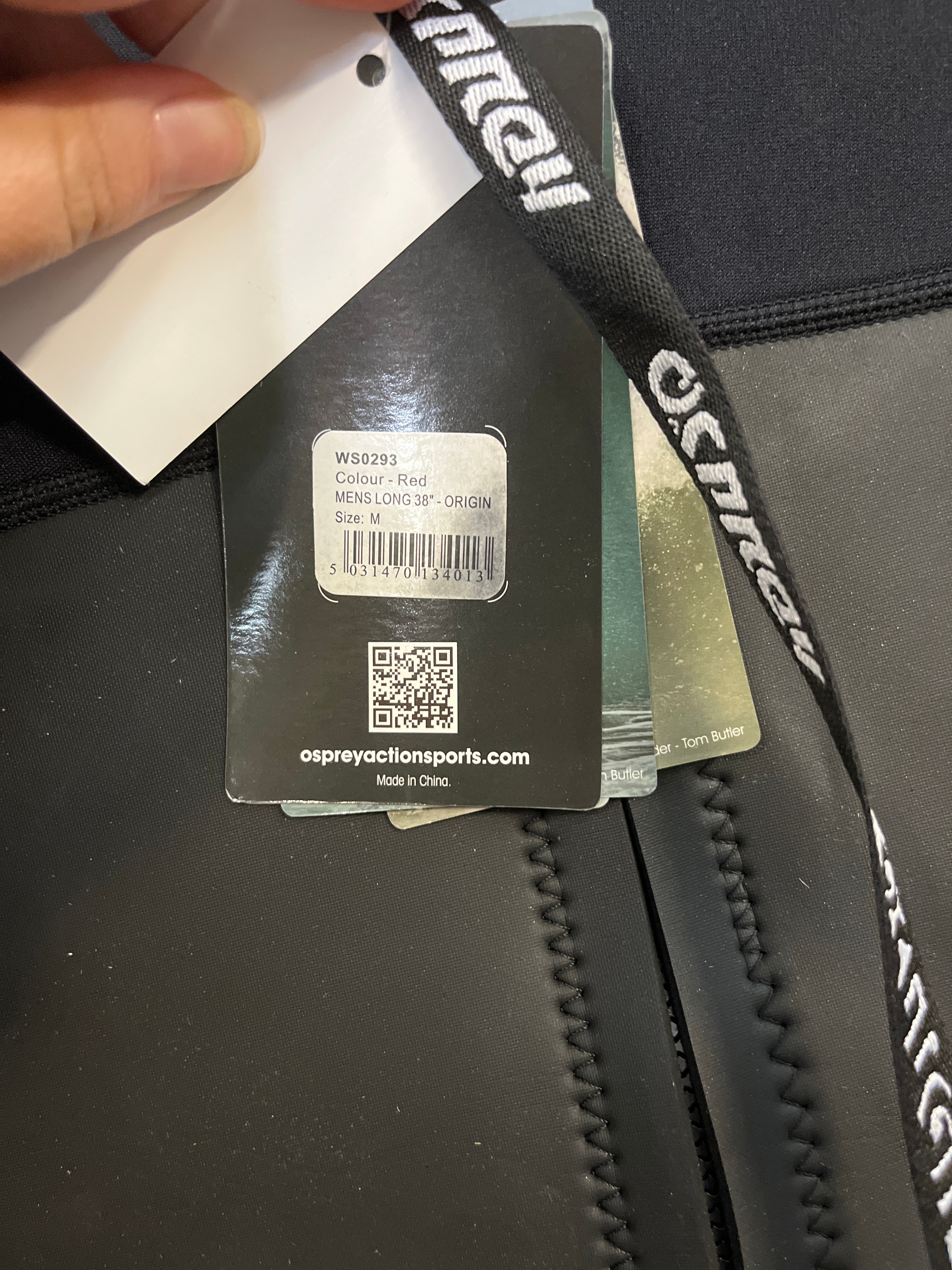 An Osprey MENS OHG 3/6 ORIGIN full length wetsuit. Constructed primarily from neoprene, it features a multi-panel design in black with contrasting grey chest, back, and arm panels, and red accents along the torso sides and inner forearms. The item prominently displays “Osprey” branding in white on the left arm and smaller logos on the lower chest and zipper pull. It is equipped with a full-length front zipper. Attached retail tags identify the model as WS0293, ‘MENS OHG 3/6 ORIGIN’, Size: M, with an accent ‘Colour – Red’, and indicate it was ‘Made in China’.