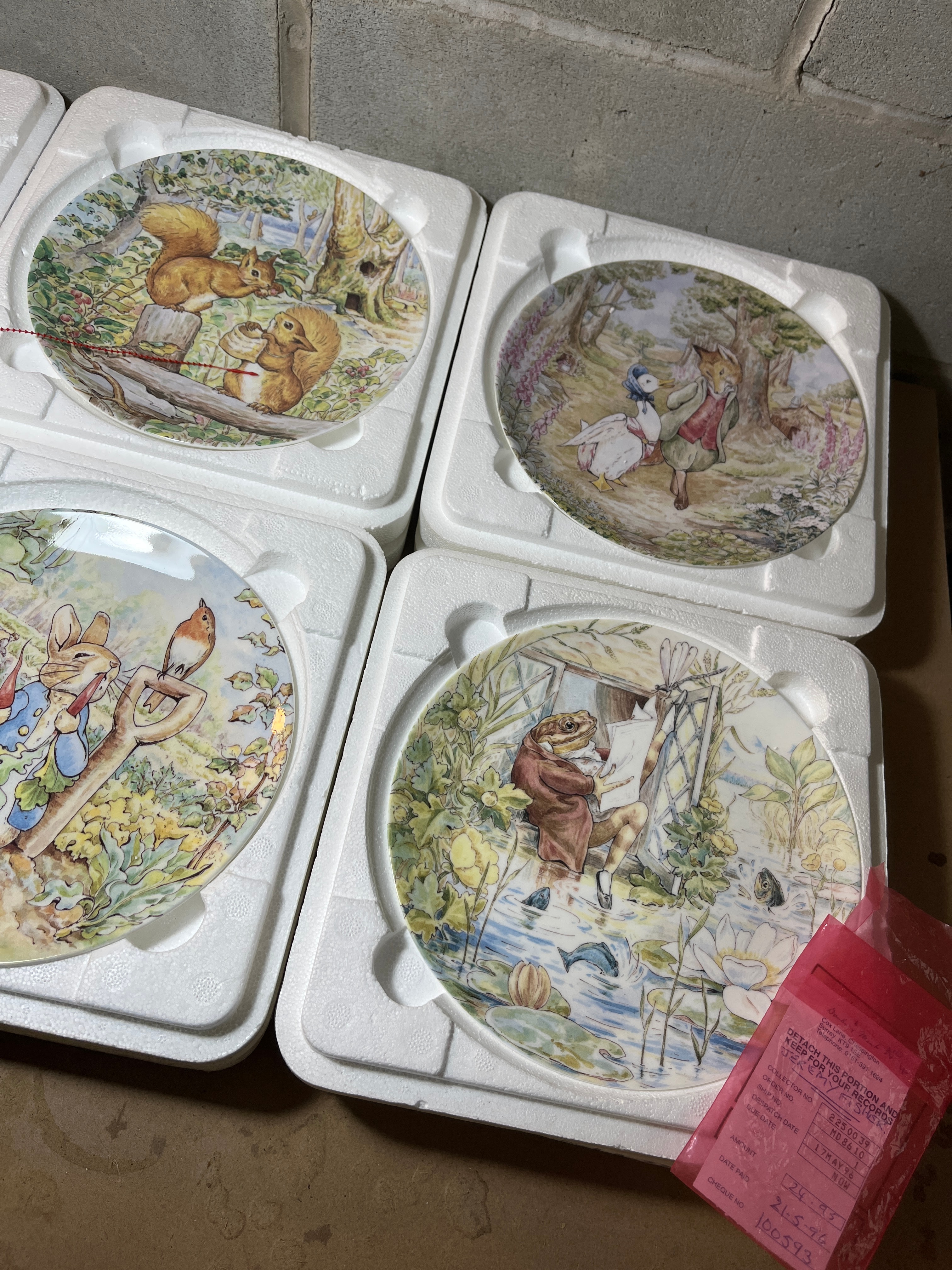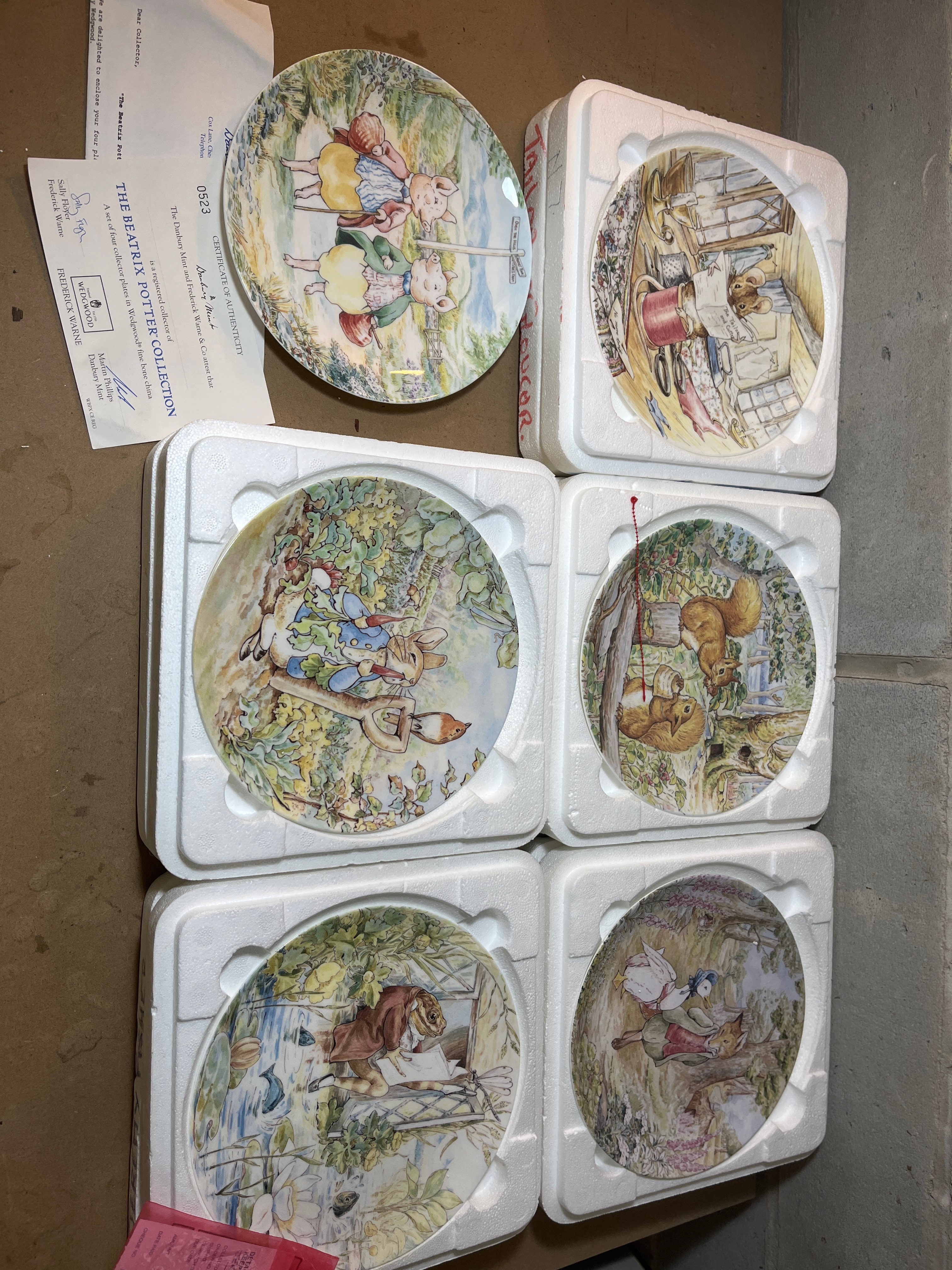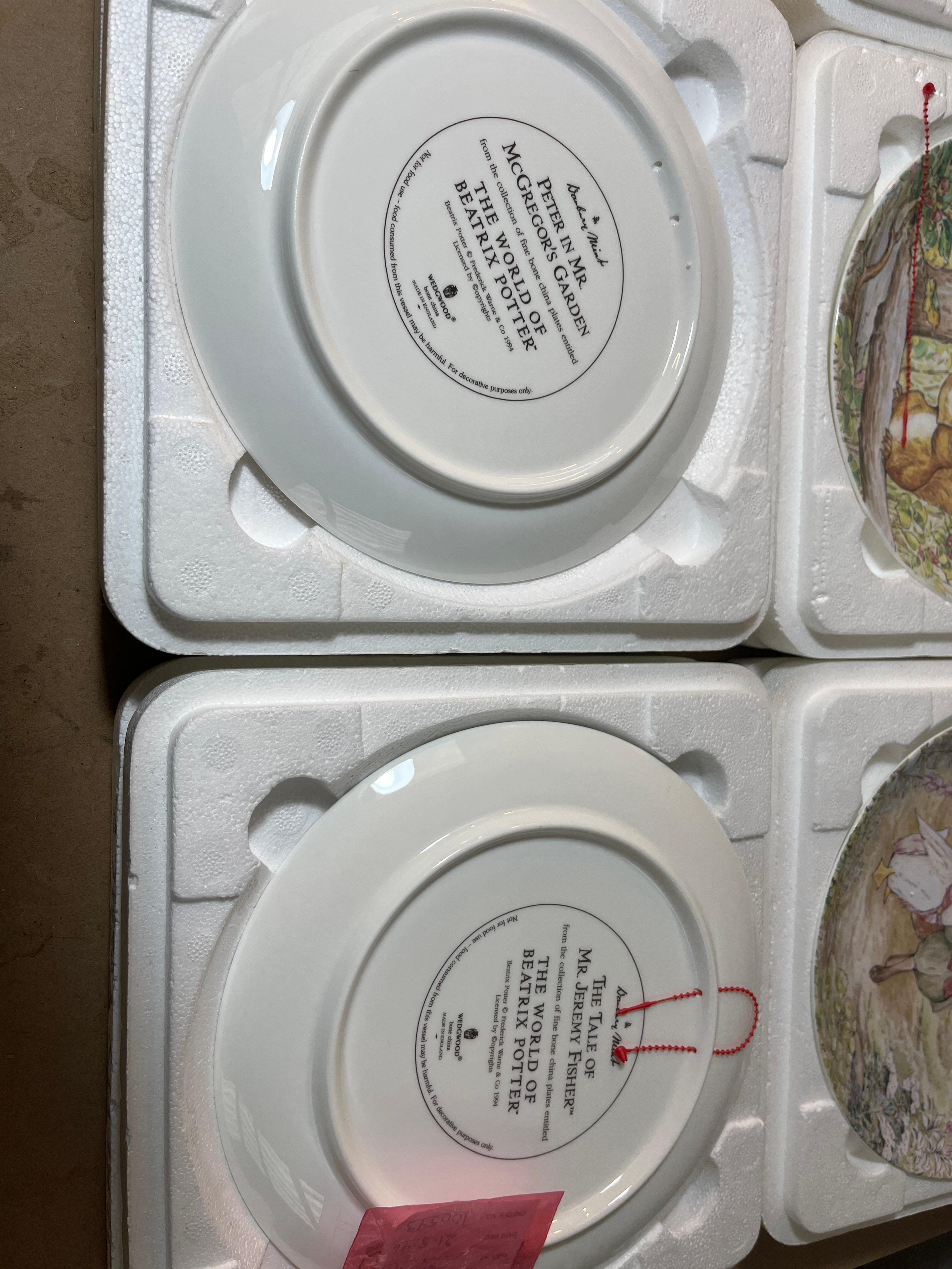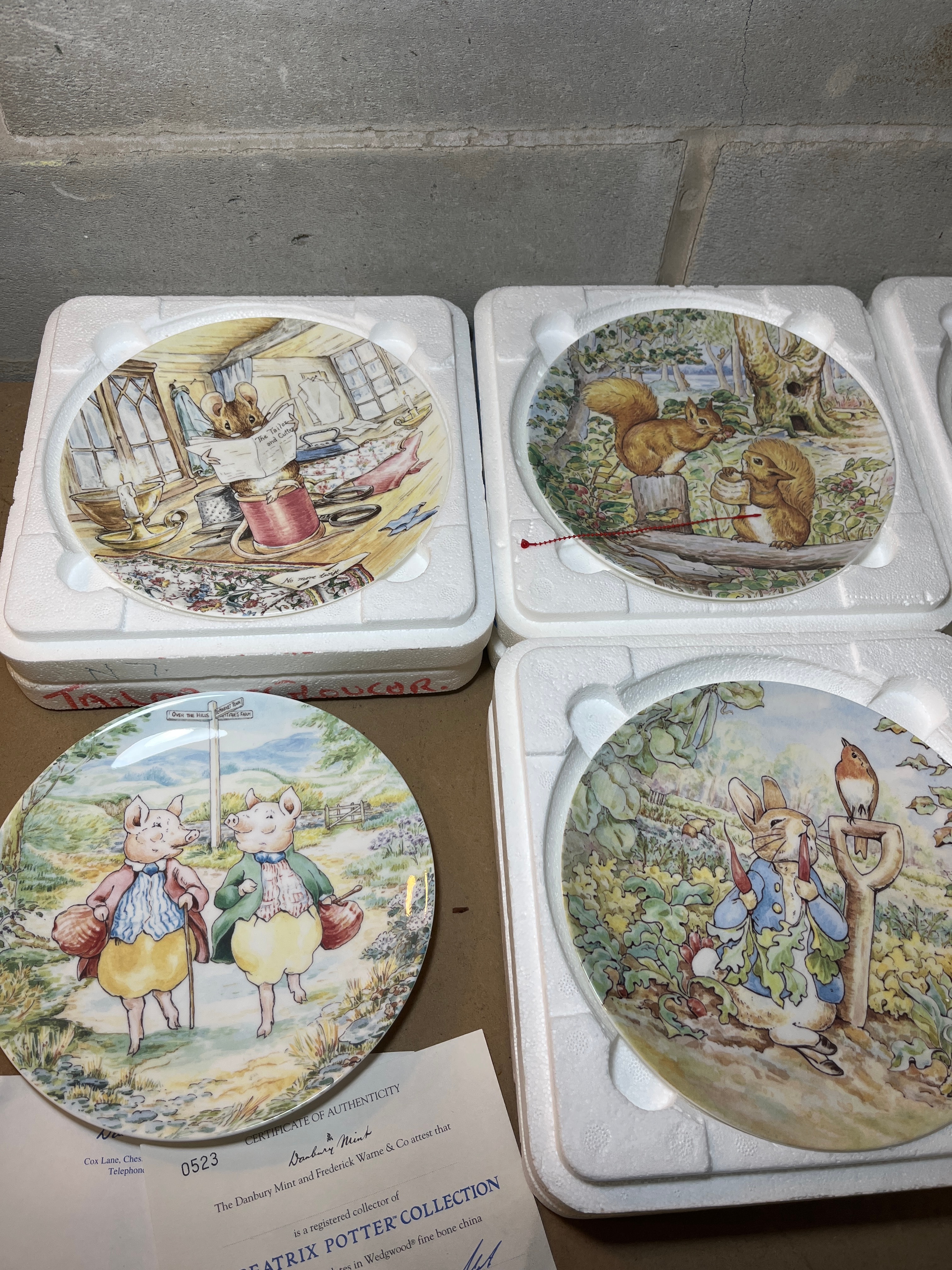 A collection of eight decorative plates crafted from Wedgwood fine bone china, produced for The Danbury Mint as part of “The Beatrix Potter Collection” and “The World of Beatrix Potter.” Each plate features colorful illustrations of anthropomorphic animal characters from Beatrix Potter’s tales, depicting specific scenes with titles including “Peter in Mr. McGregor’s Garden,” “The Tale of Mr. Jeremy Fisher,” “The Tale of Two Bad Mice,” “The Tale of Squirrel Nutkin,” “The Tale of Jemima Puddle-duck,” and “The Tale of Pigling Bland.” The reverse of each plate is marked “Wedgwood® Fine Bone China, Made in England,” along with a disclaimer indicating they are for decorative purposes only. Most plates are presented within their original white styrofoam packaging, and accompanying certificates of authenticity are present.
