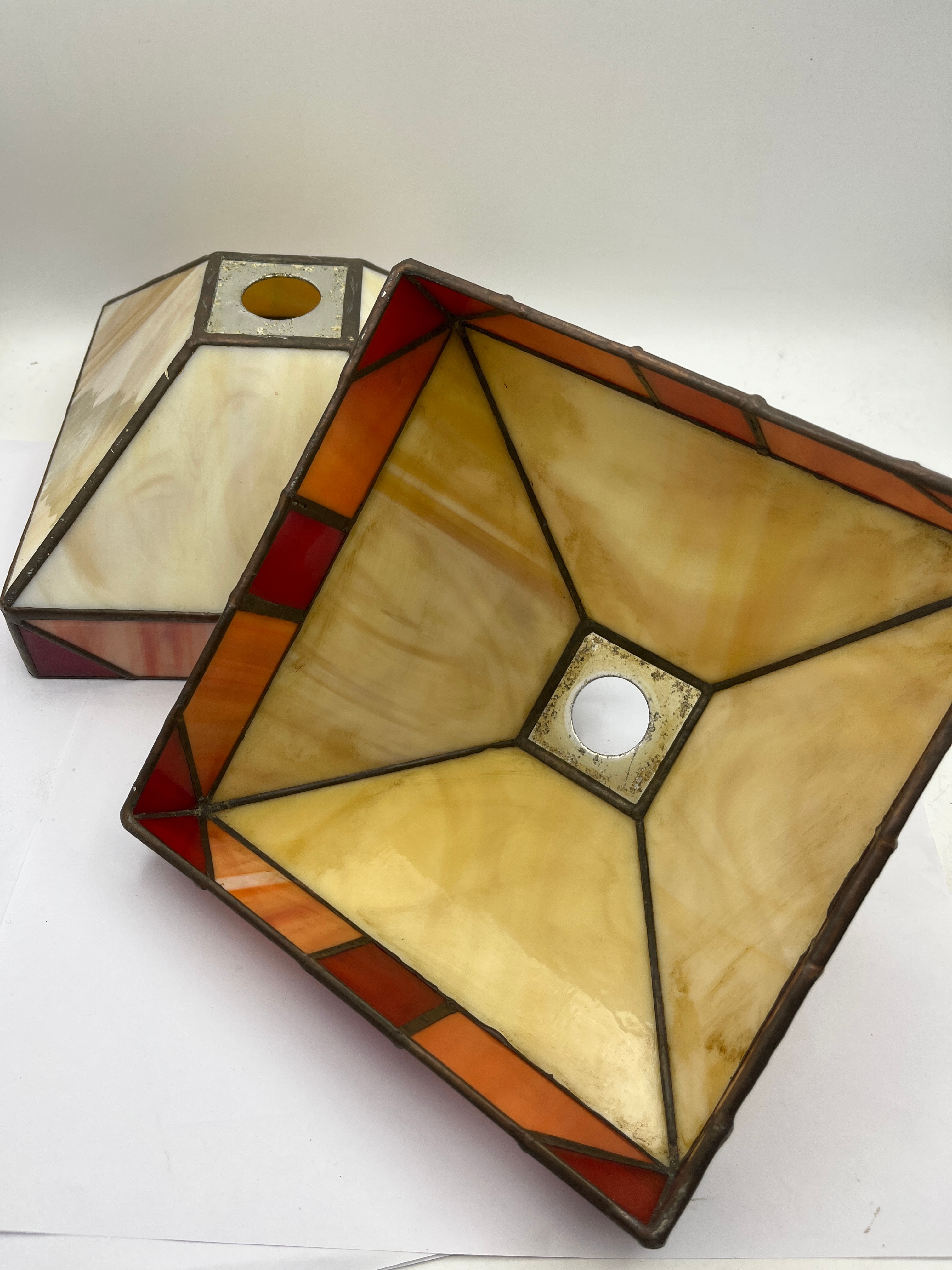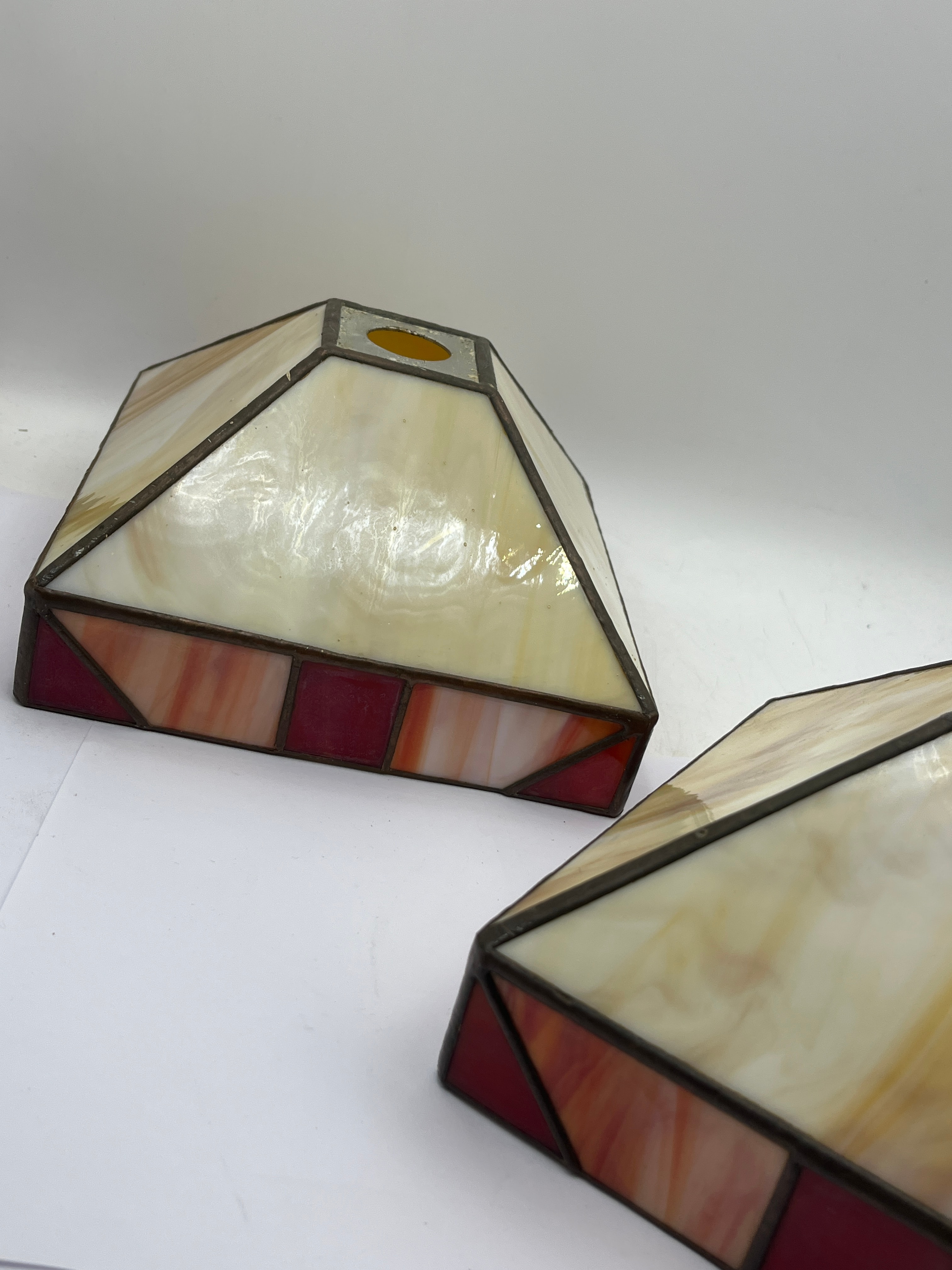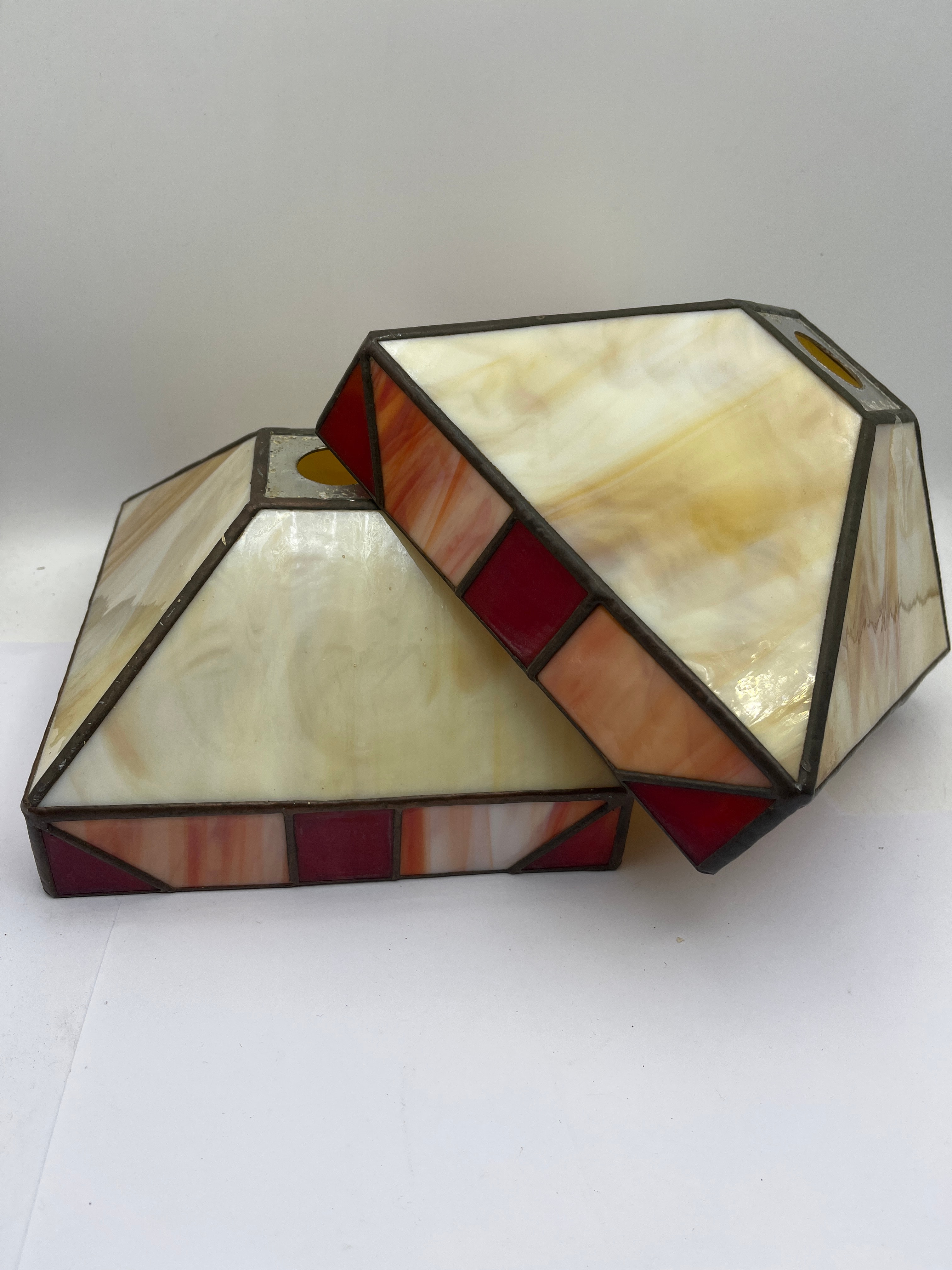 A pair of Tiffany Style Mission leaded glass lamp shades. Each shade features a tapered, square-based form with a central circular opening at the top designed for a fixture. The shades are constructed in a geometric pattern from variegated opalescent glass panels. The primary glass is a creamy off-white hue, complemented by perimeter bands composed of deep red, orange, and amber-toned glass segments, all joined by dark metal leading. No discernible text or manufacturer’s marks are visible.