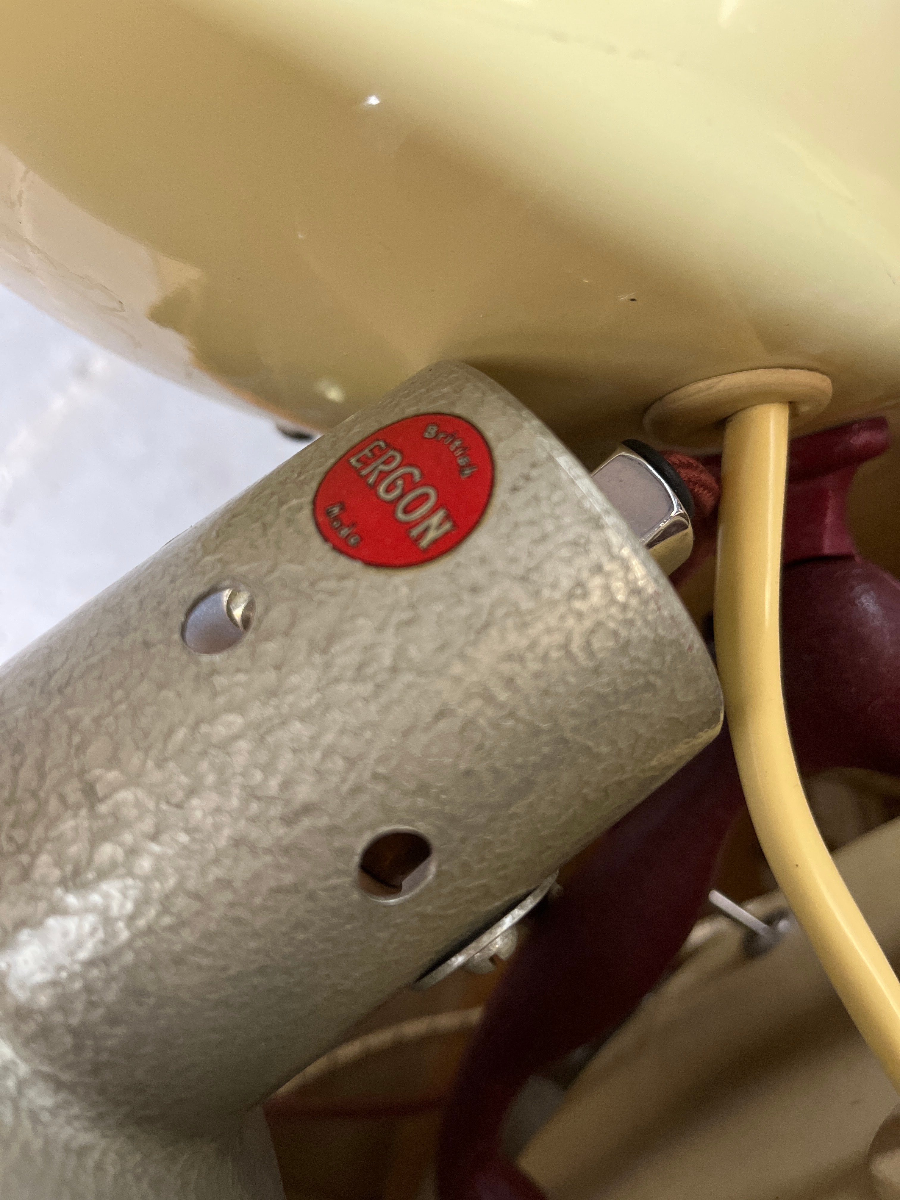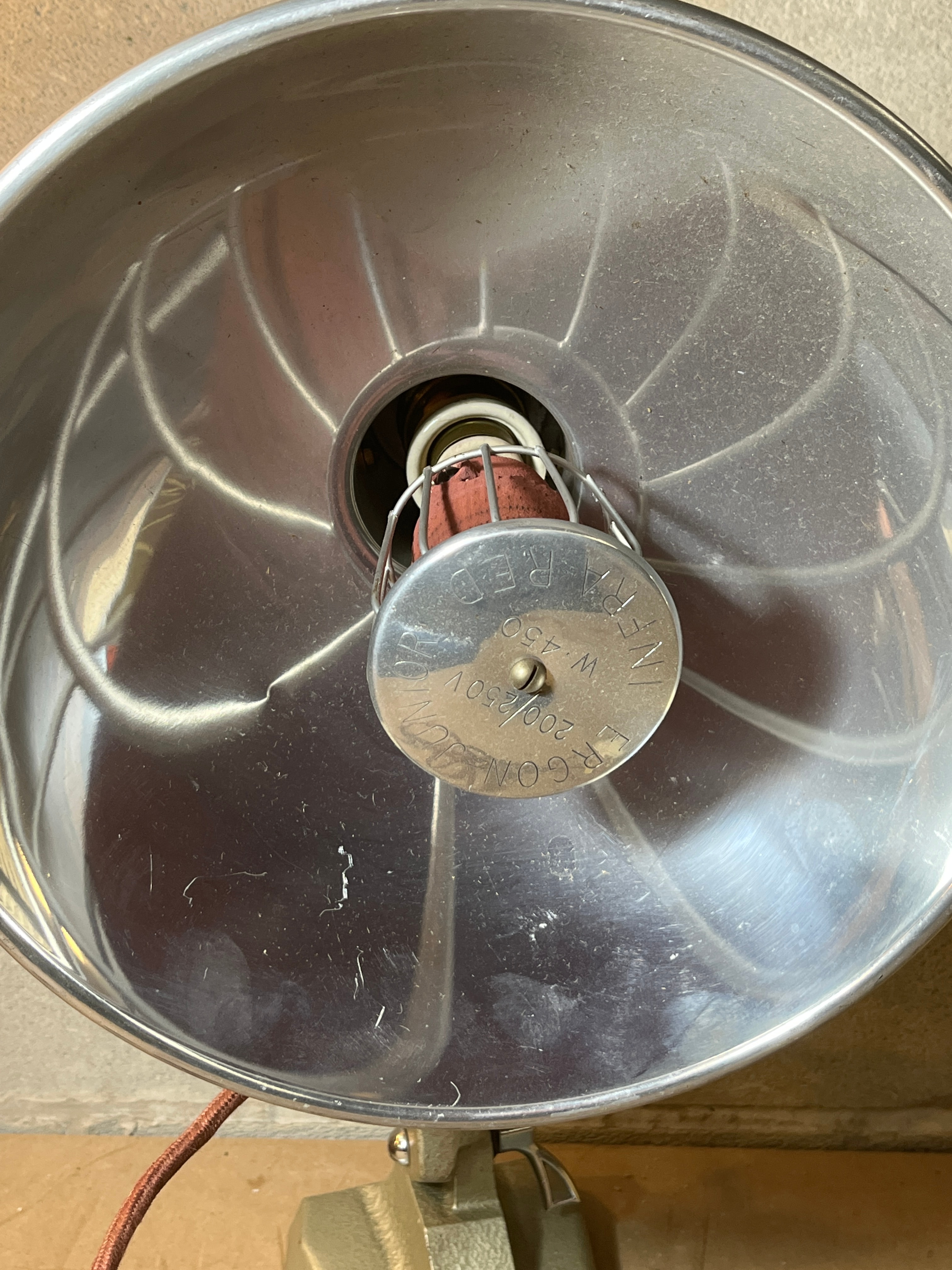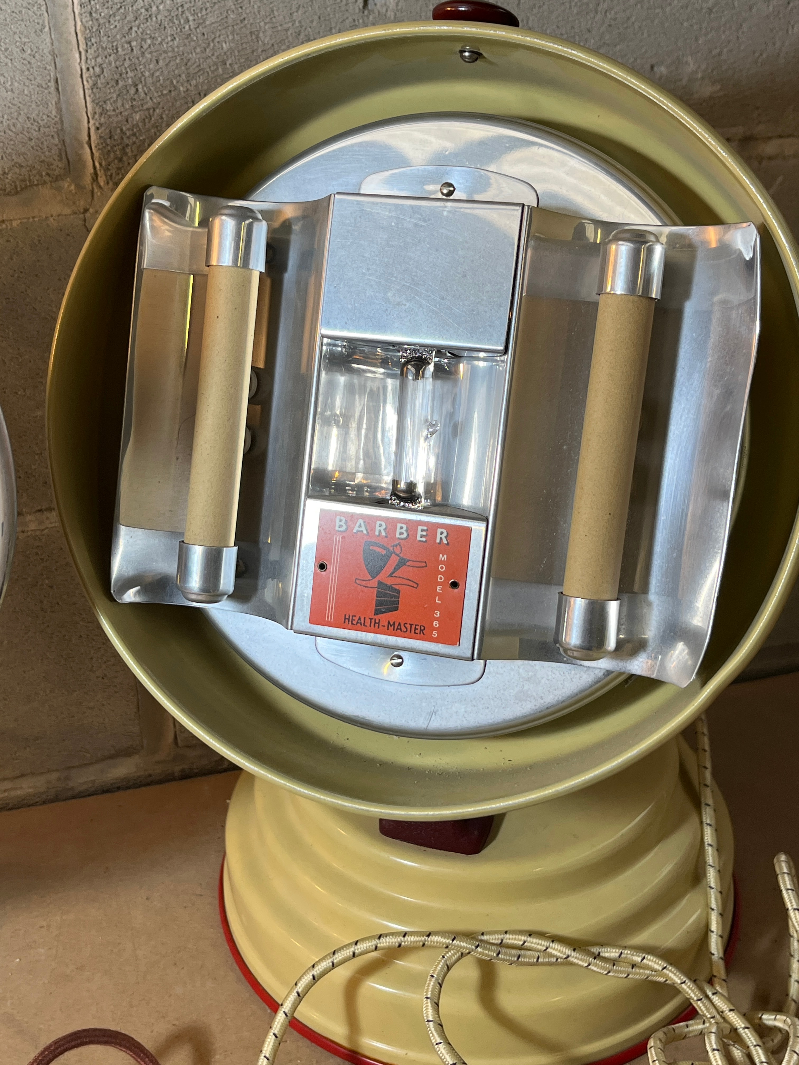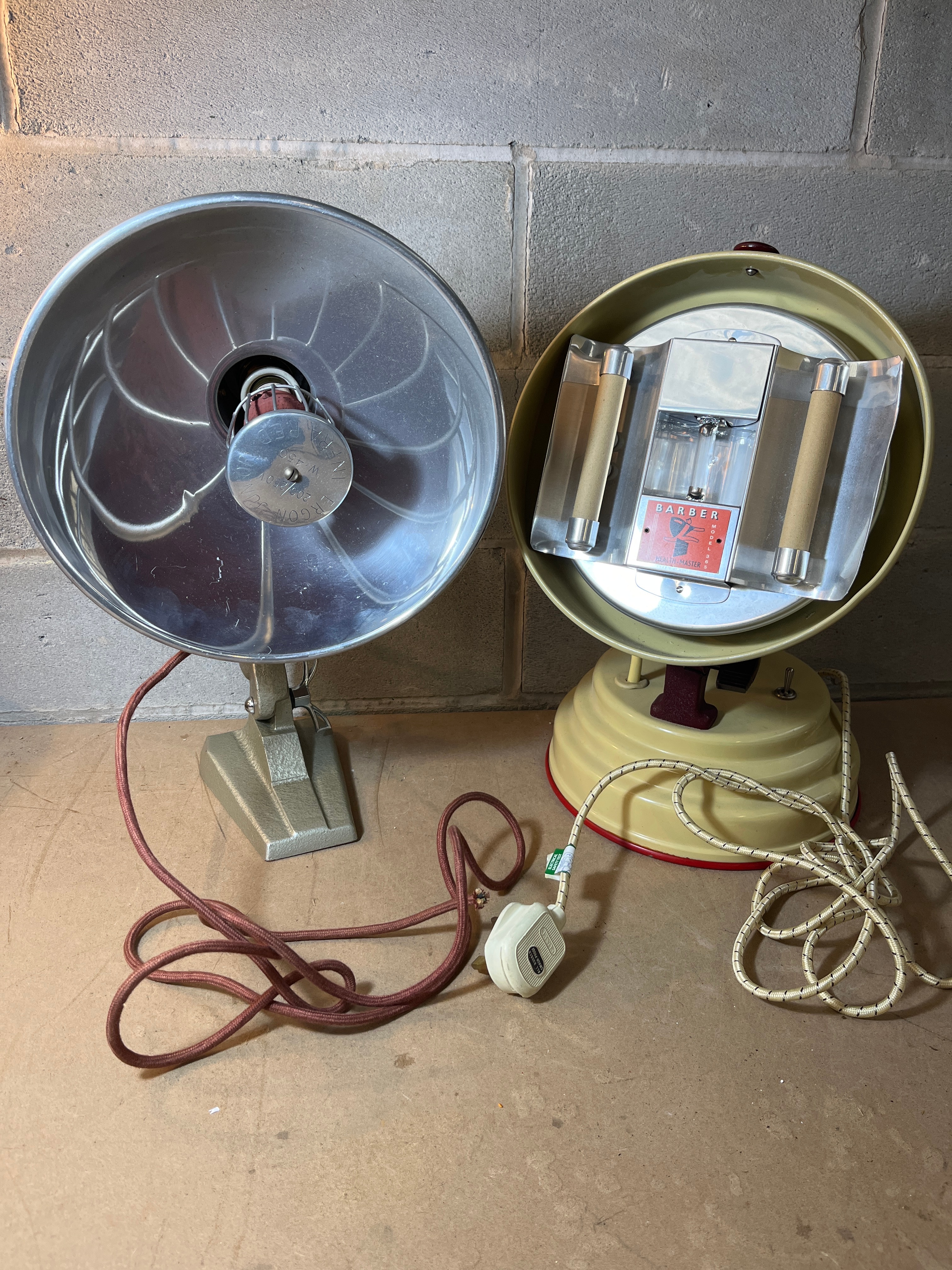 A pair of vintage electric therapeutic lamps, likely dating from the mid-20th century, displaying utilitarian design features. The first is an Ergon heat lamp by Mottershead & Co., a freestanding infrared heat lamp with a painted metallic-grey base and a polished aluminum parabolic reflector. It is marked “ERGON”, “British Made”, “INFRA RED”, “W. 450”, and “200/250V”. The second unit is a Barber Model 38 Health-Master sunlamp, featuring a cream-colored painted metal housing, polished metal interior elements, two visible tubular bulbs, and two wooden or bakelite handles. Both lamps retain their original textile-covered electrical cords and period-appropriate plugs.