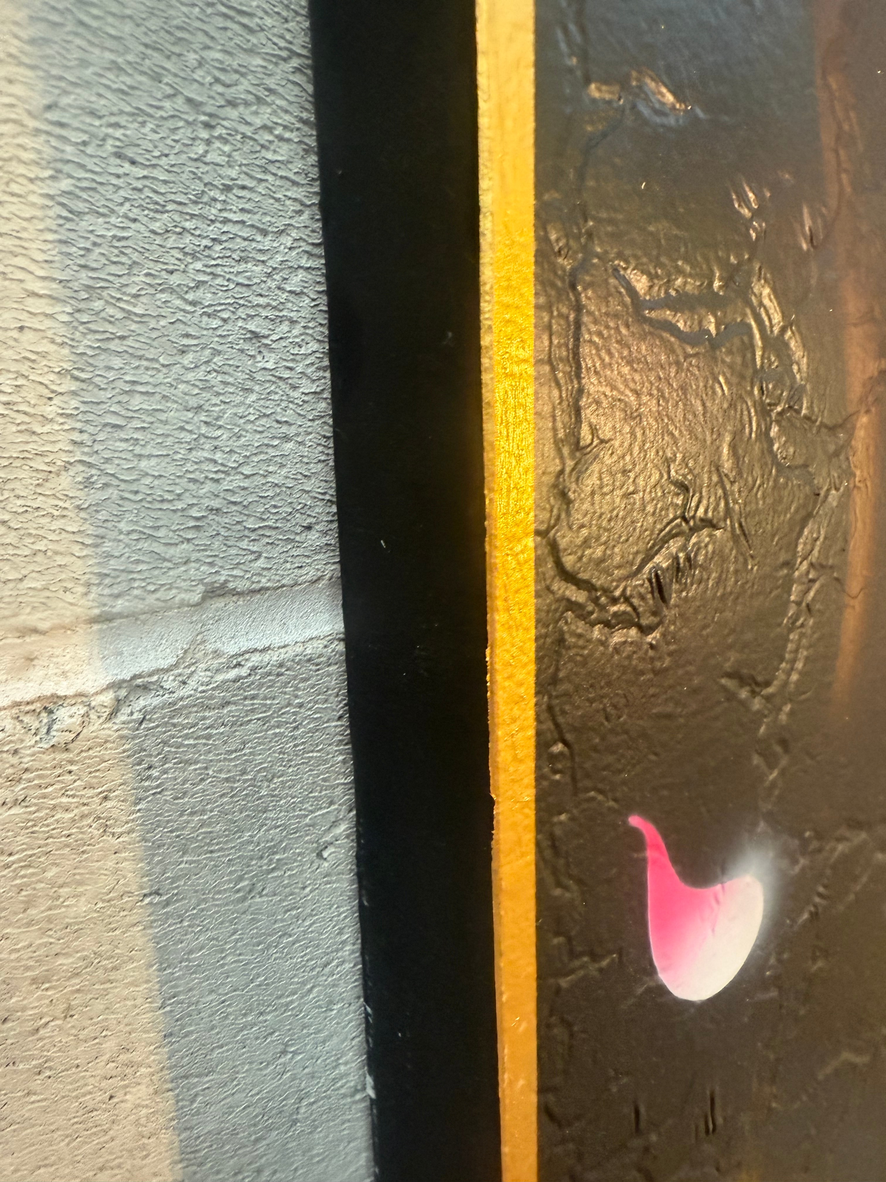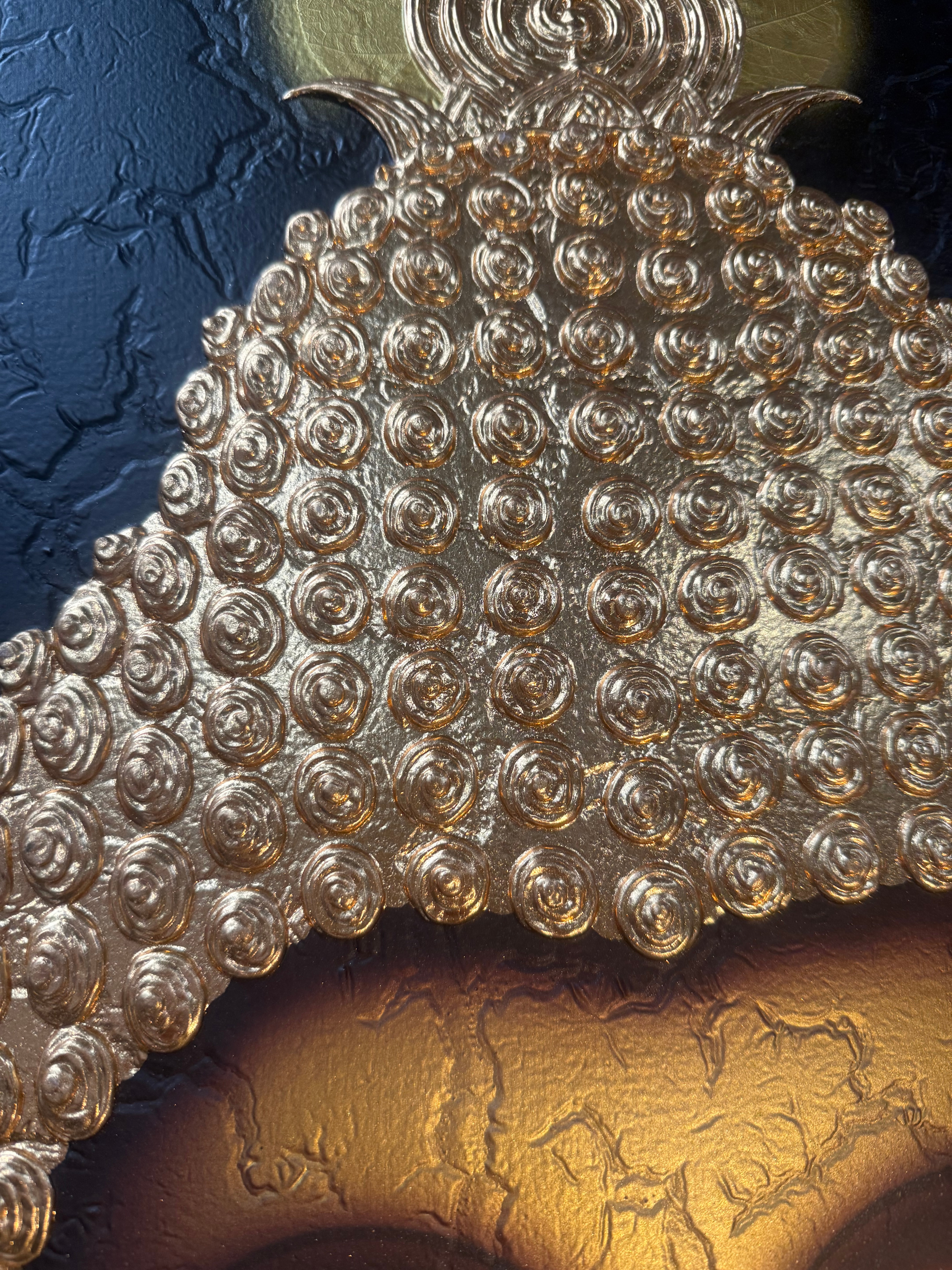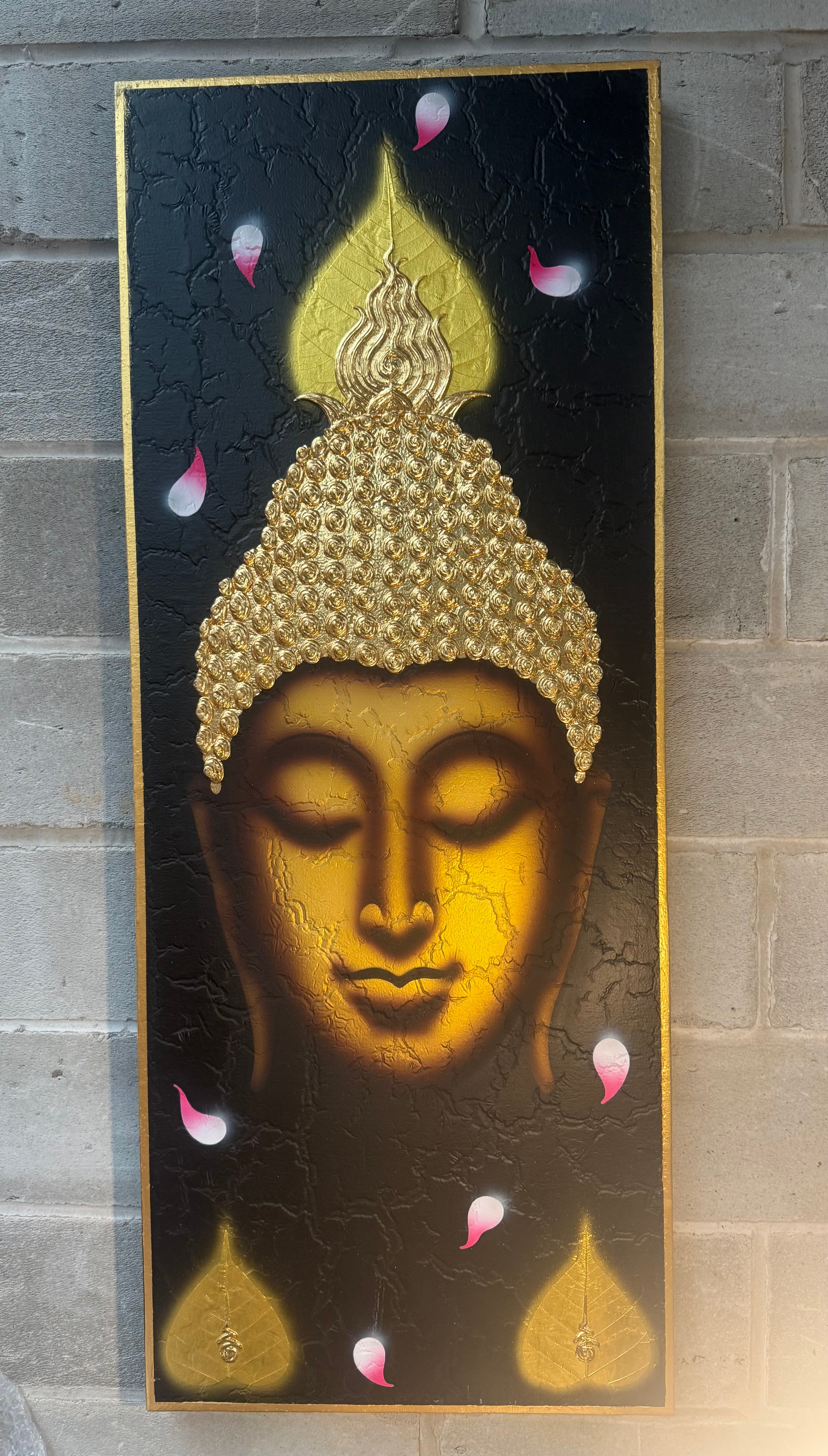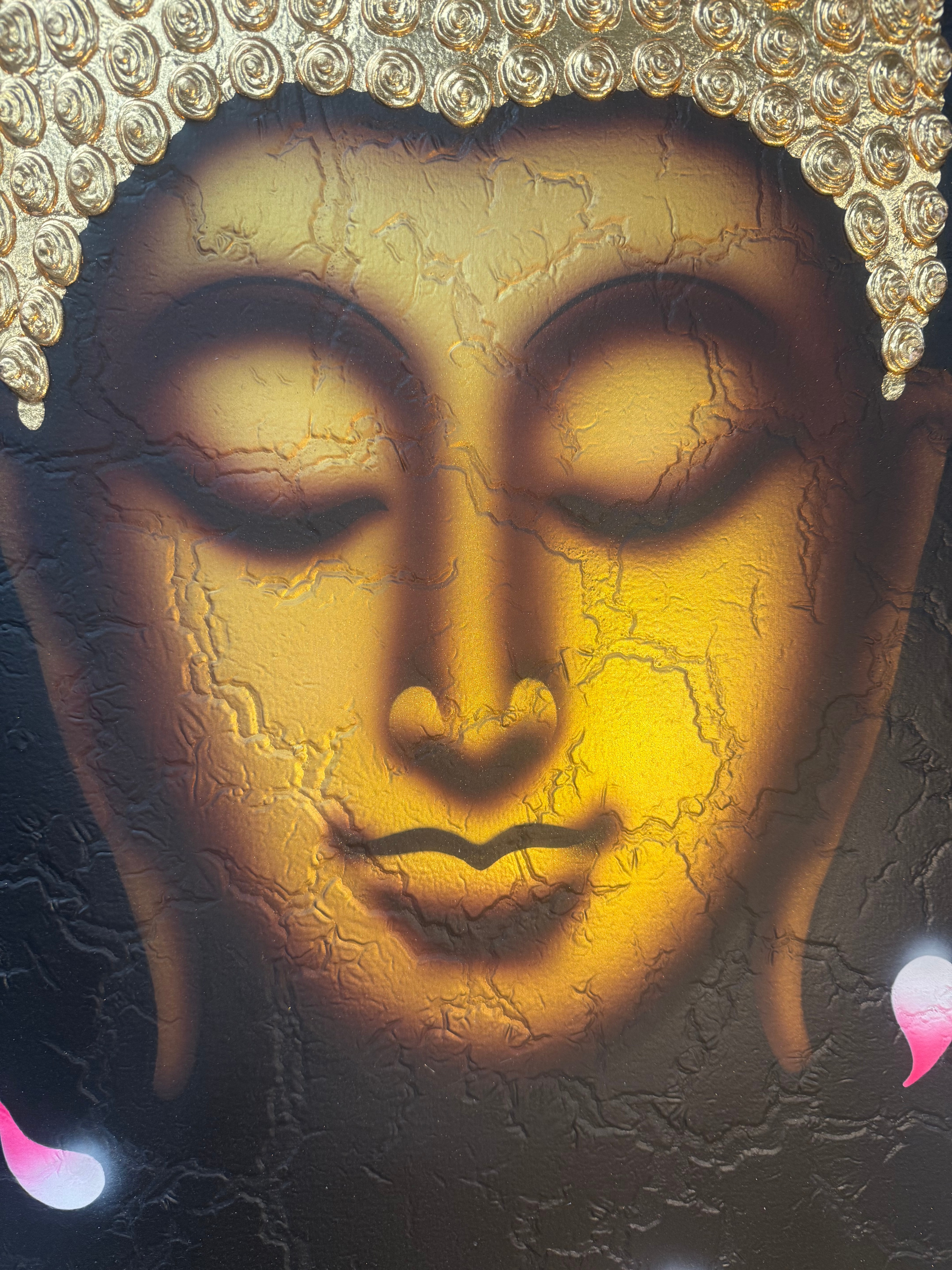 A contemporary decorative painting depicting the head of a Buddha figure on canvas. The Buddha is rendered with closed eyes and a serene expression, set against a textured black background. The central face features gradients of gold and brown with an intentional crackle-like texture. The ushnisha and tightly curled hair are highly three-dimensional, formed from raised, individual spiral elements finished in metallic gold. Stylized gold Bodhi leaves appear at the top and bottom, interspersed with floating pink and white petal forms. The painting is finished with a narrow gold-painted border. No visible text or markings are present.