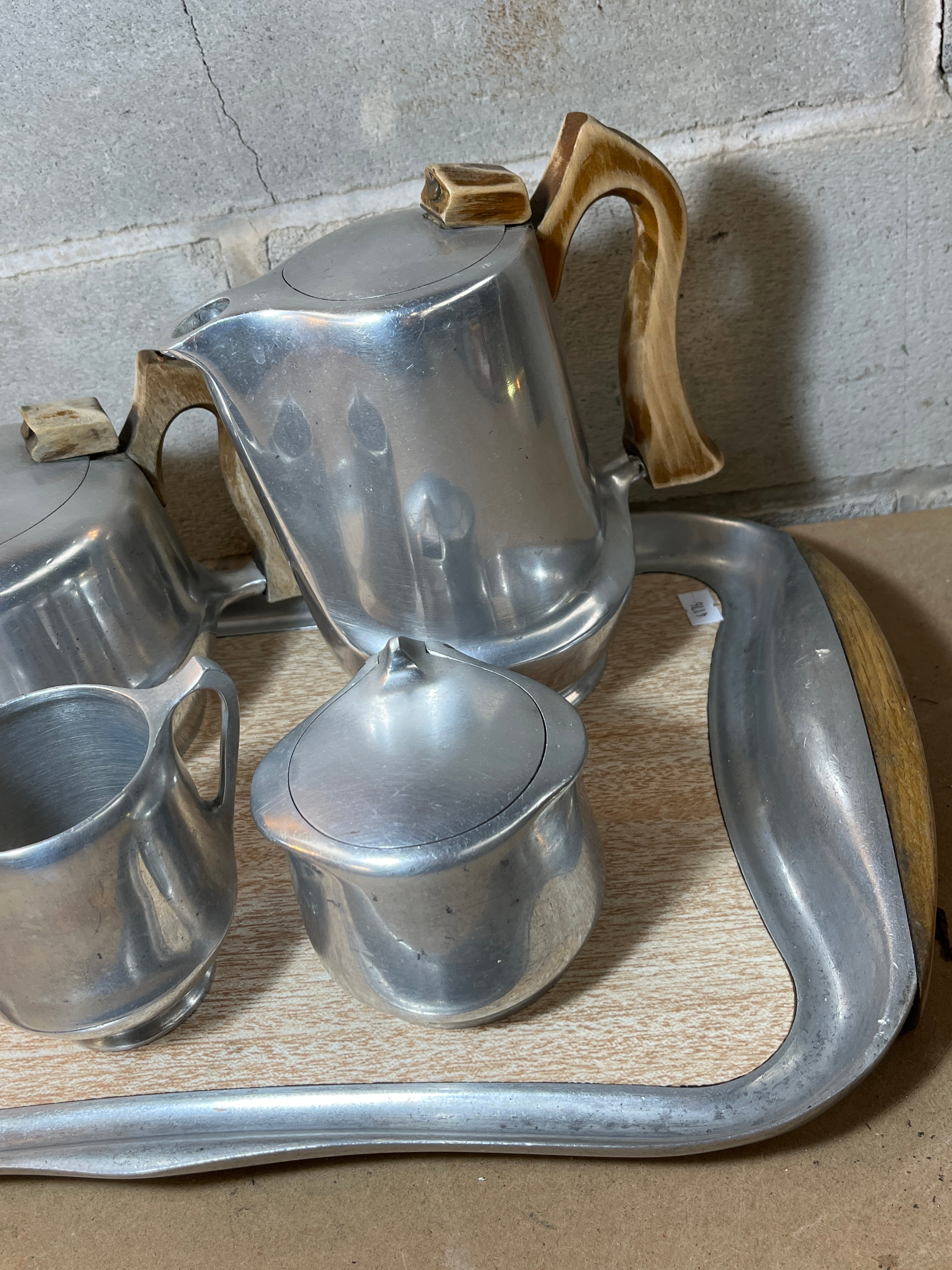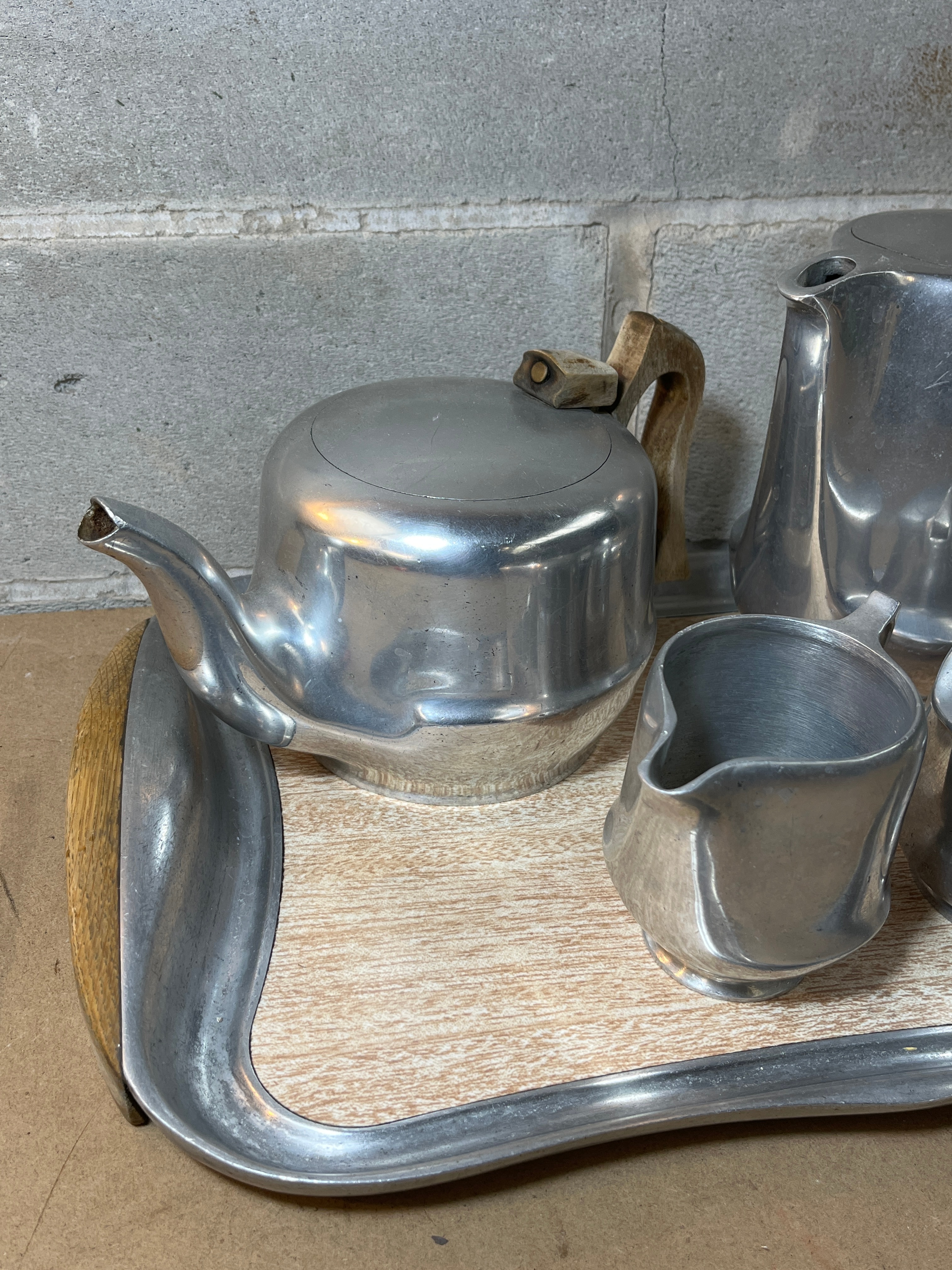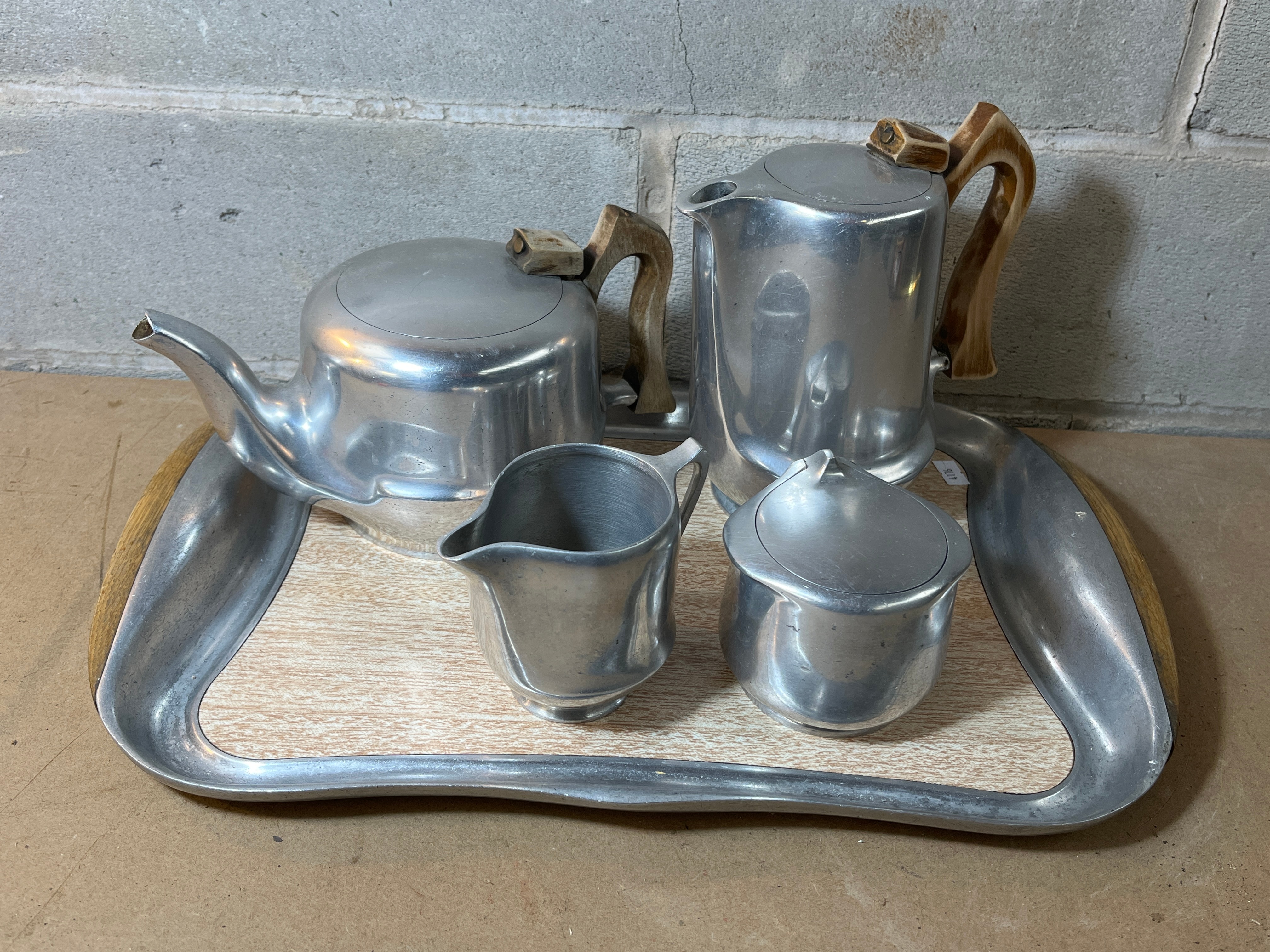 A Set of Five Picquot Ware Tea and Coffee Service. Comprising a rectangular serving tray, a teapot, a taller pot (likely a coffee or hot water pot), a creamer, and a lidded sugar bowl. All pieces are crafted from a polished silver-toned metal, most likely aluminum, and feature streamlined, unadorned forms indicative of a mid-20th century modernist or Art Deco-inspired aesthetic. The handles on the pots and the tray, along with the lid finials, are made of a light-colored wood, with the finials featuring a darker accent. The tray itself has a curved, organic shape with integrated wooden handles and a light-colored laminate or wood veneer insert.