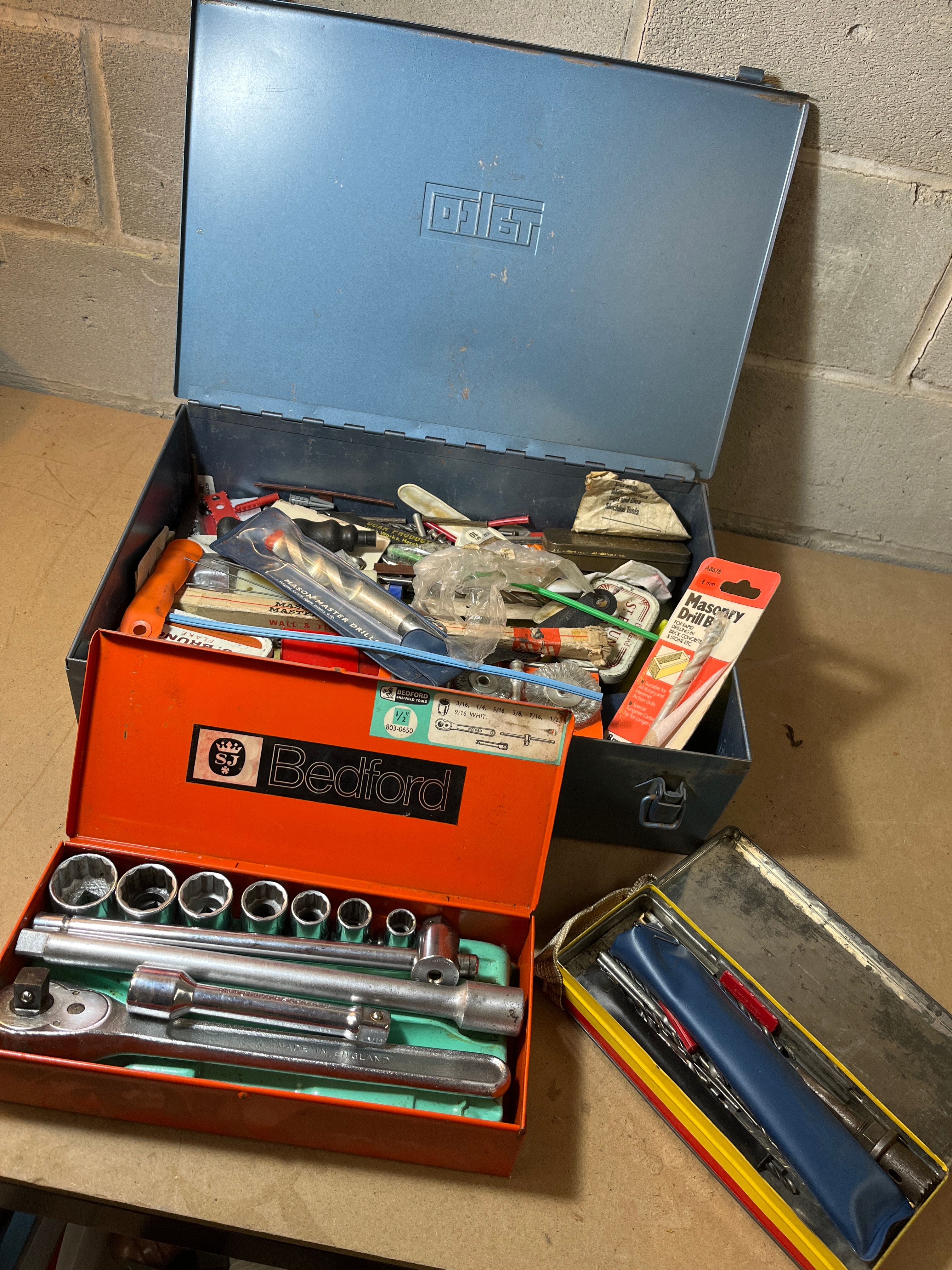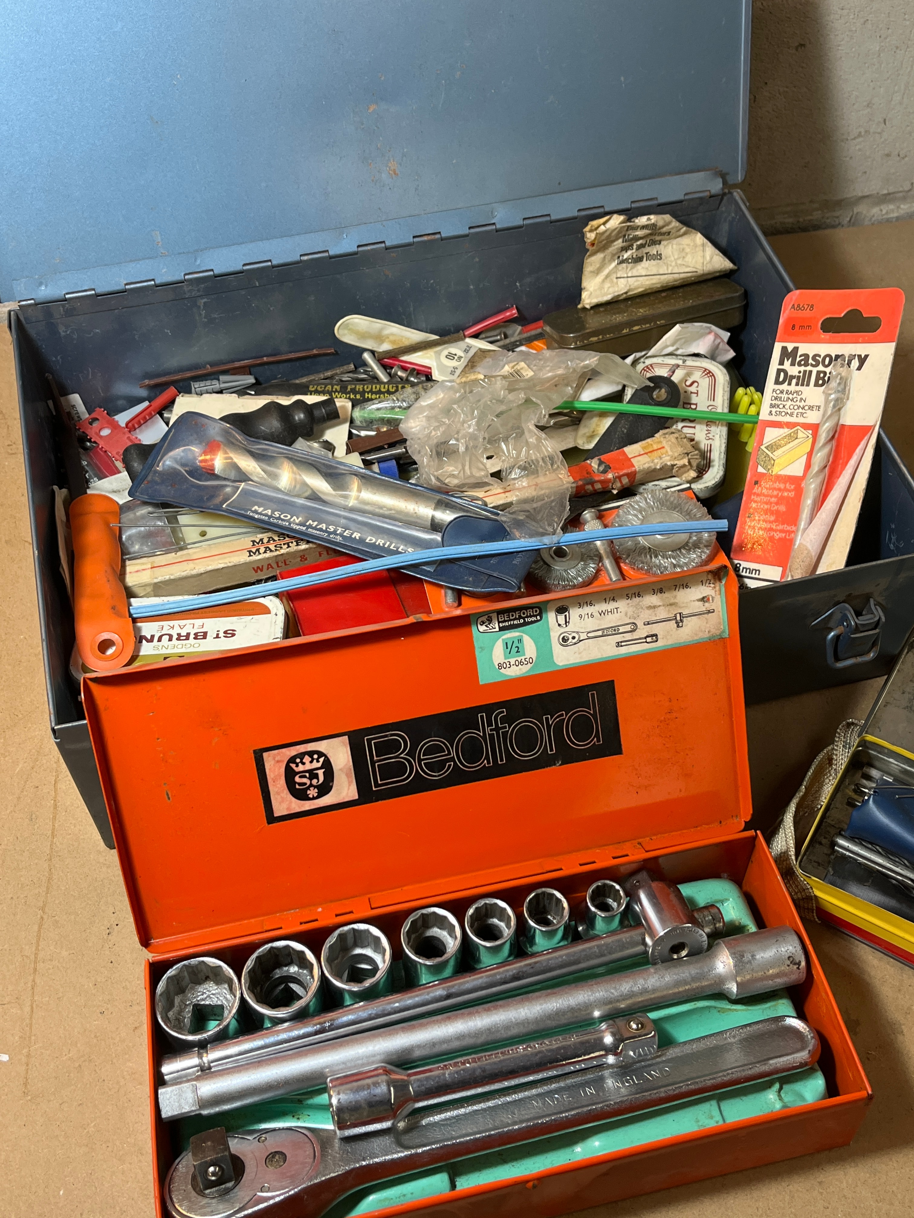 This lot comprises three open, vintage-style metal toolboxes. The most prominent is an orange painted steel toolbox, clearly marked “Bedford SJ*” on its lid and “MADE IN ENGLAND” on the contained ratchet. It holds a socket wrench set with various sockets and accessories, including references to “WHIT” (Whitworth) sizing on an internal label. Adjacent is a larger, rectangular blue painted steel toolbox, debossed with “DOLE” on its lid, filled with a miscellaneous collection of used hand tools, small parts, and workshop accessories, notably including a packaged “Masonry Drill Bit B” set. A third, even smaller, rectangular metal tin with red and yellow stripes contains a few compact hand tools housed within a blue pouch.