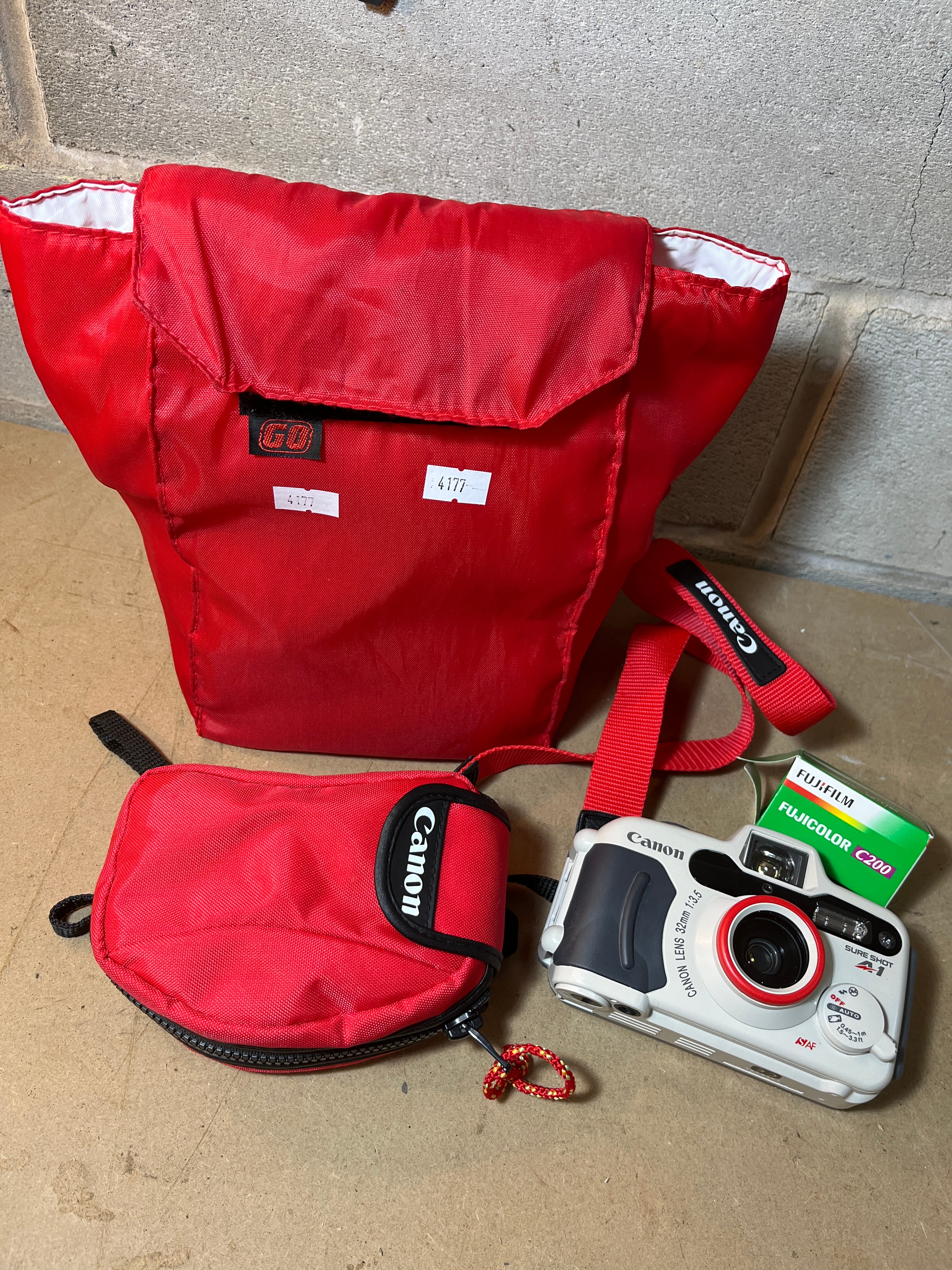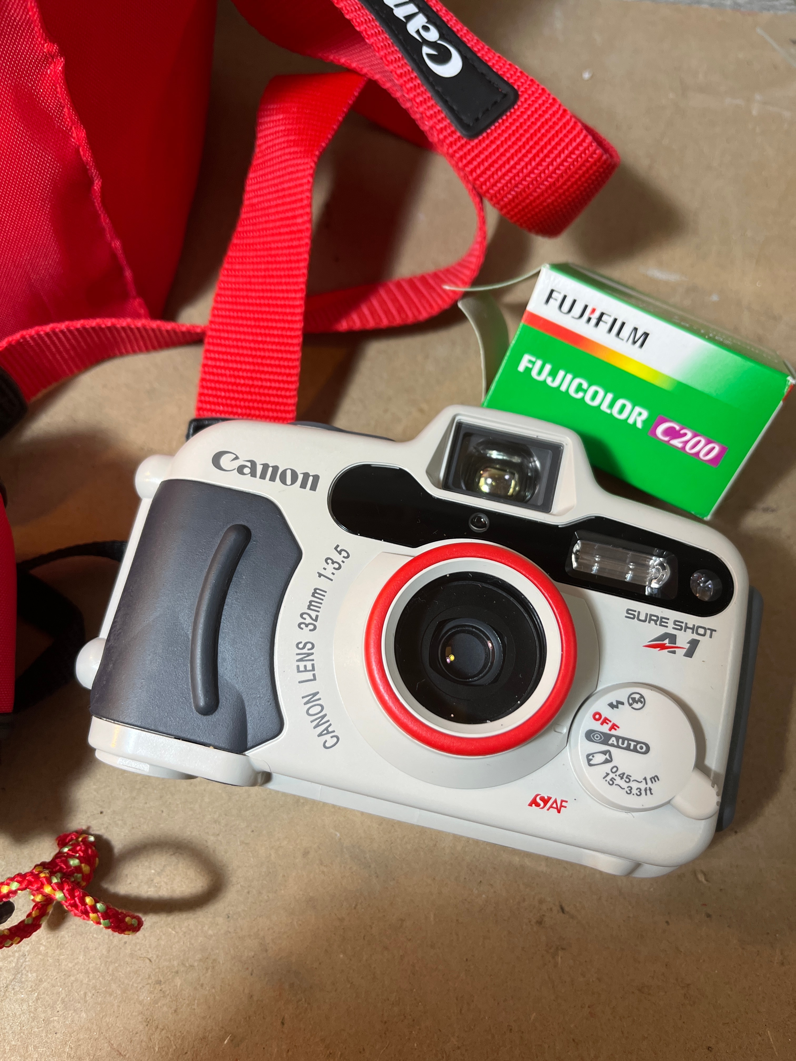 A Canon Sure Shot A-1 compact point-and-shoot film camera, primarily white and dark gray plastic, featuring a Canon Lens 32mm 1:3.5. Visible markings on the camera include ‘Canon’, ‘SURE SHOT A-1’, ‘SA AF’, a control dial with ‘OFF’, ‘ON’, and ‘AUTO’ settings, and Japanese text ‘水深 5m / 16ft’ (Water Depth 5m / 16ft) indicating its waterproof capability. Accompanying the camera are a red fabric Canon-branded wrist strap, a red fabric zippered Canon-branded pouch, and a larger red fabric shoulder bag with a flap closure, marked ‘CB’ and bearing an inventory sticker with ‘4377’. Also included is an unopened box of Fujifilm Fujicolor C200 film.