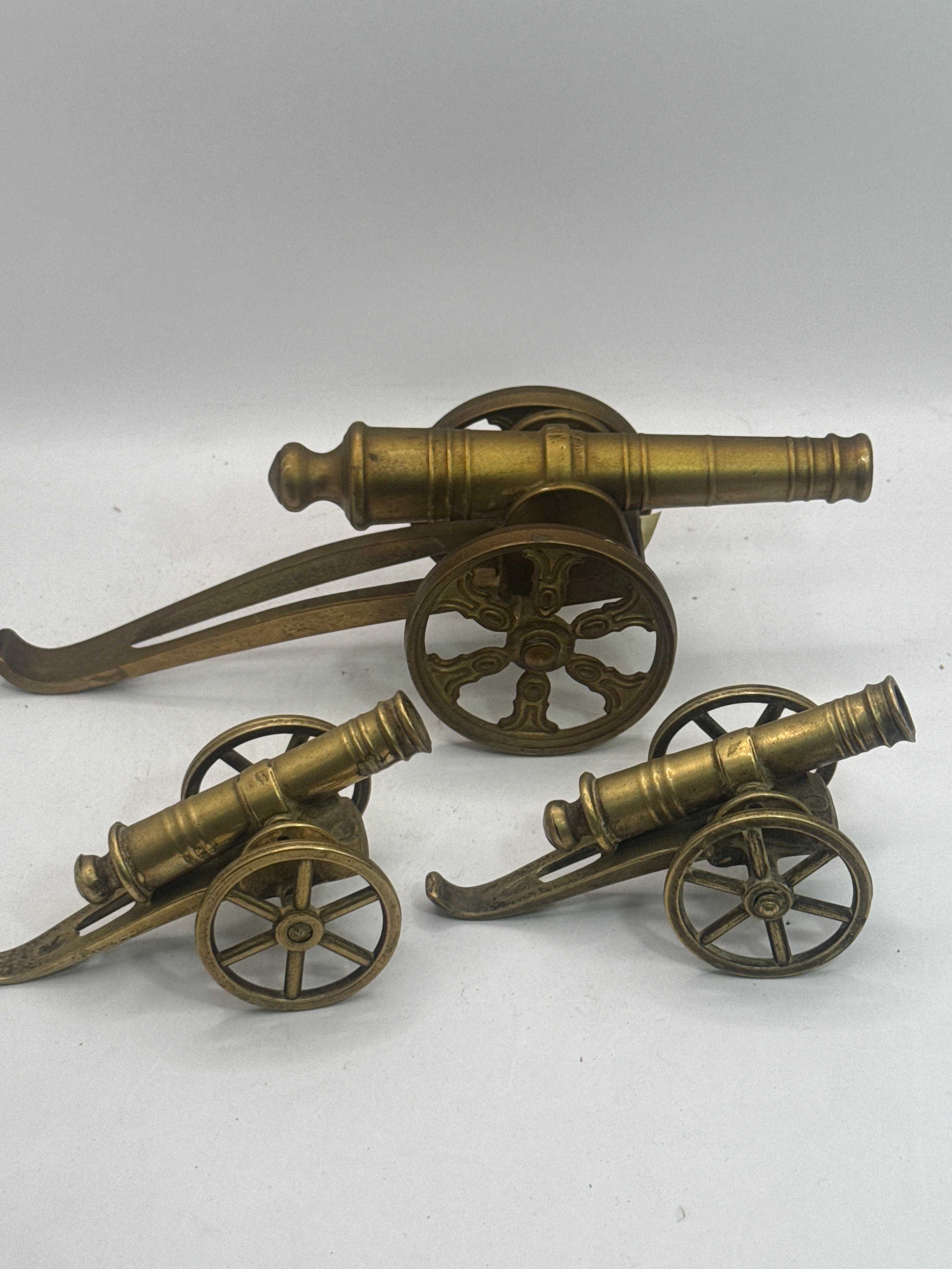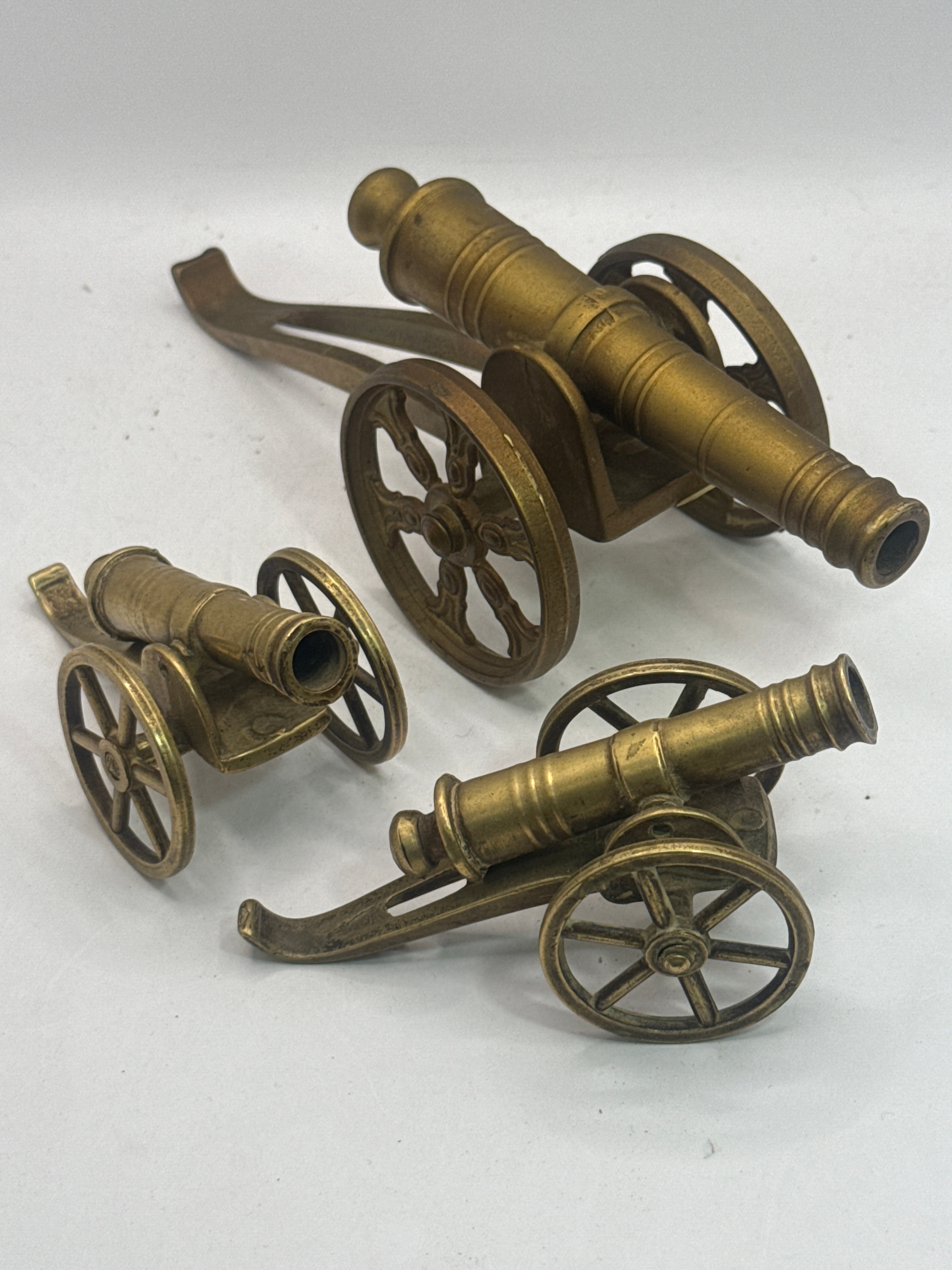 A set of three miniature decorative cannons, likely crafted from brass or bronze due to their consistent golden-yellow metallic luster and visible patina. The lot comprises one notably larger cannon and two smaller, similarly styled pieces. Each features a detailed barrel on a two-wheeled carriage with spoked wheels and a trail. The style evokes historical military or nautical cannons, possibly replicas from the 20th century.