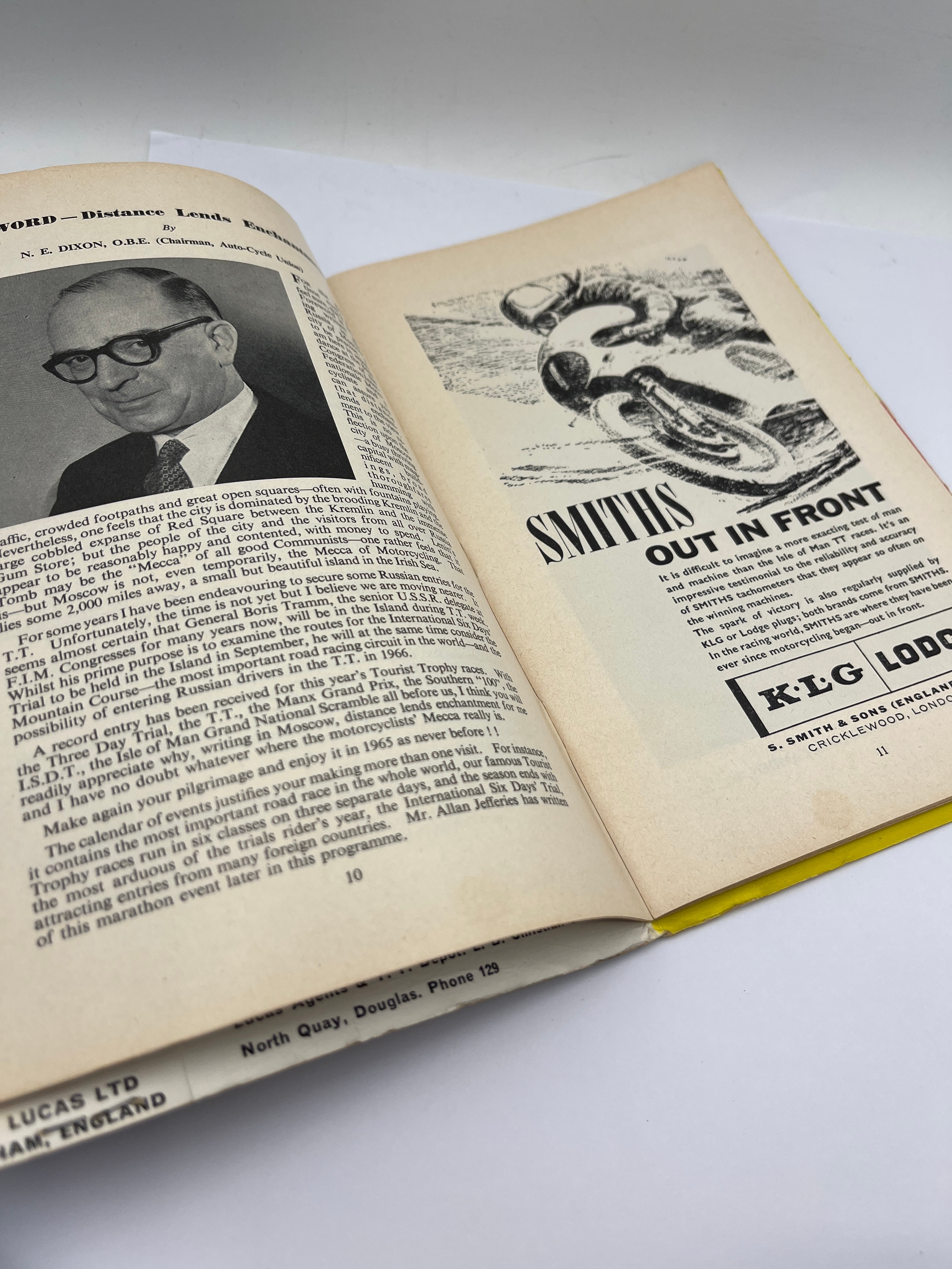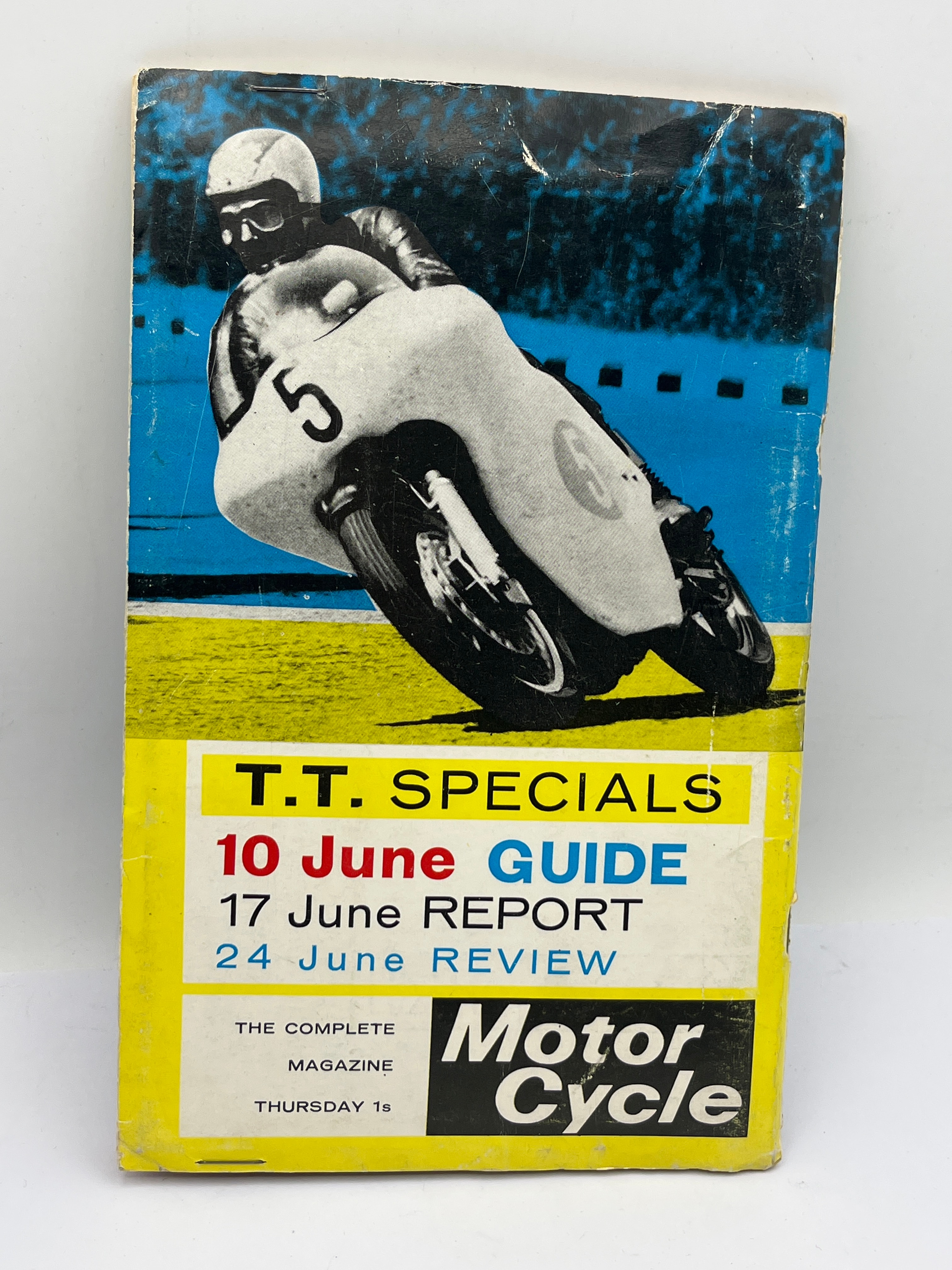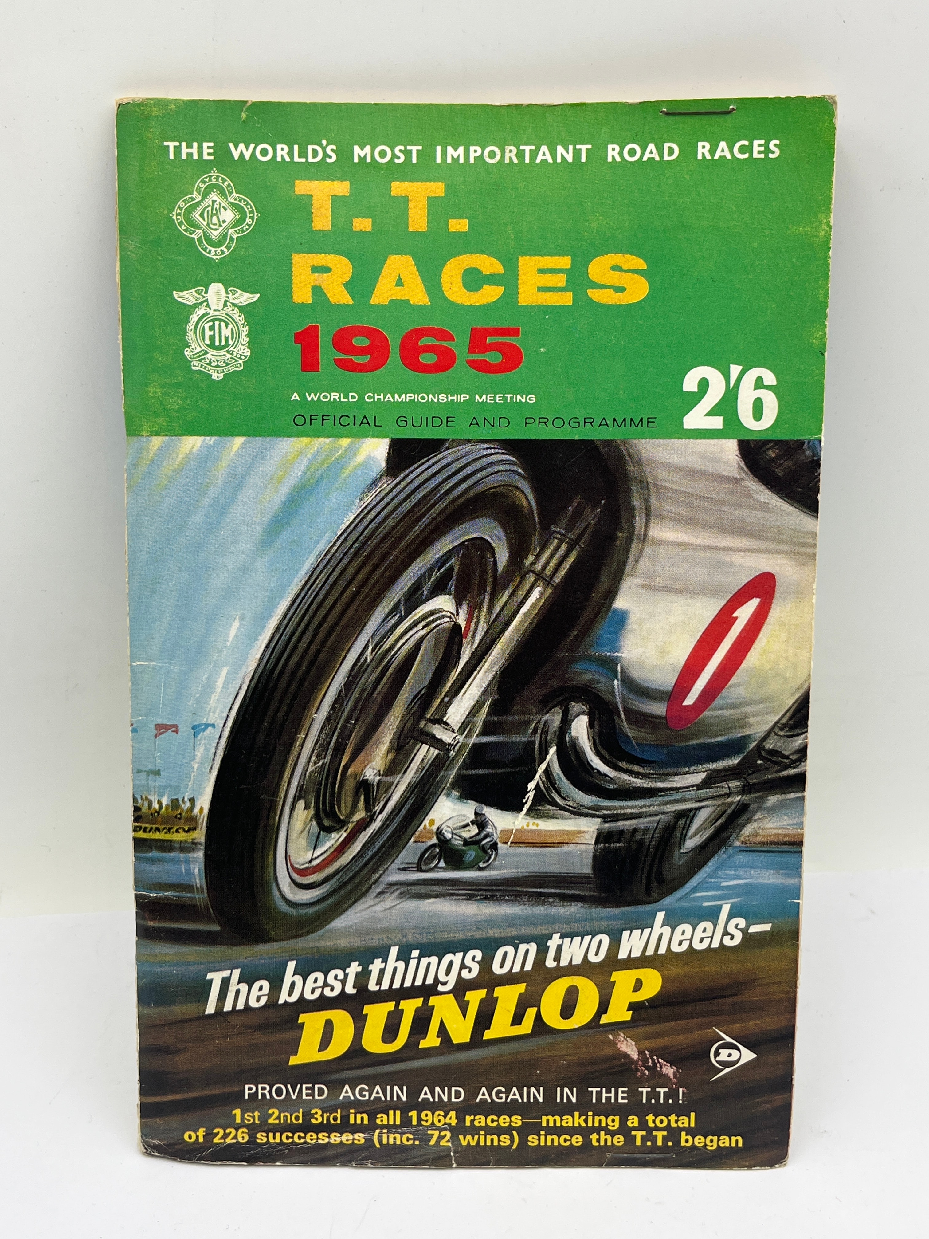 A vintage printed program and official guide for the 1965 T.T. Races, designated as a World Championship Meeting. The front cover, presented in a mid-century graphic style, features an illustration of a racing motorcycle and prominently displays the text “THE WORLD’S MOST IMPORTANT ROAD RACES,” “T.T. RACES 1965,” “A WORLD CHAMPIONSHIP MEETING,” and “OFFICIAL GUIDE AND PROGRAMME,” with an original price of 2’6 (two shillings and sixpence). The cover also incorporates FIM and Dunlop branding and advertising text. The back cover is a “Motor Cycle Magazine” special, advertising “T.T. SPECIALS” for “10 June GUIDE,” “17 June REPORT,” and “24 June REVIEW,” priced at 1s (one shilling), and features an illustration of a racer on a motorcycle. Interior pages contain articles mentioning the “Isle of Man Grand Prix” and period advertisements for “Smiths” and “KLG Lodge.” The item is complete.