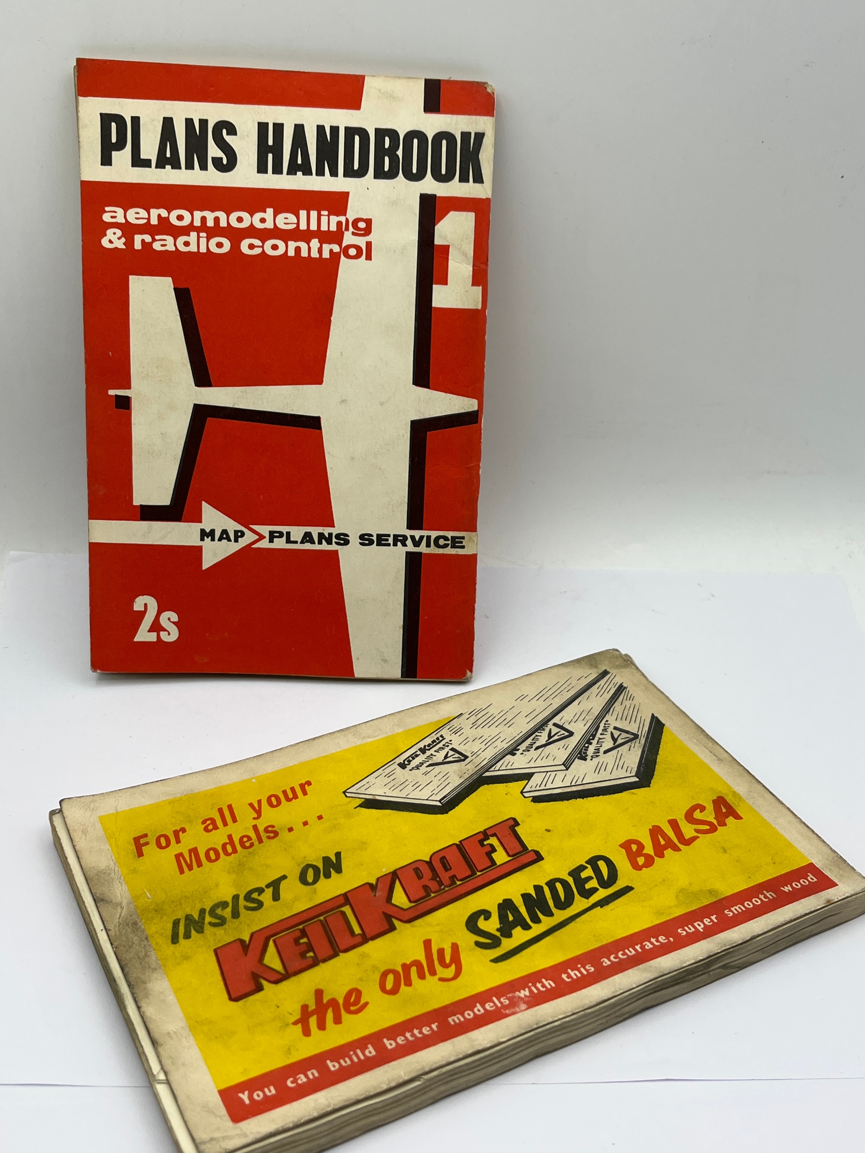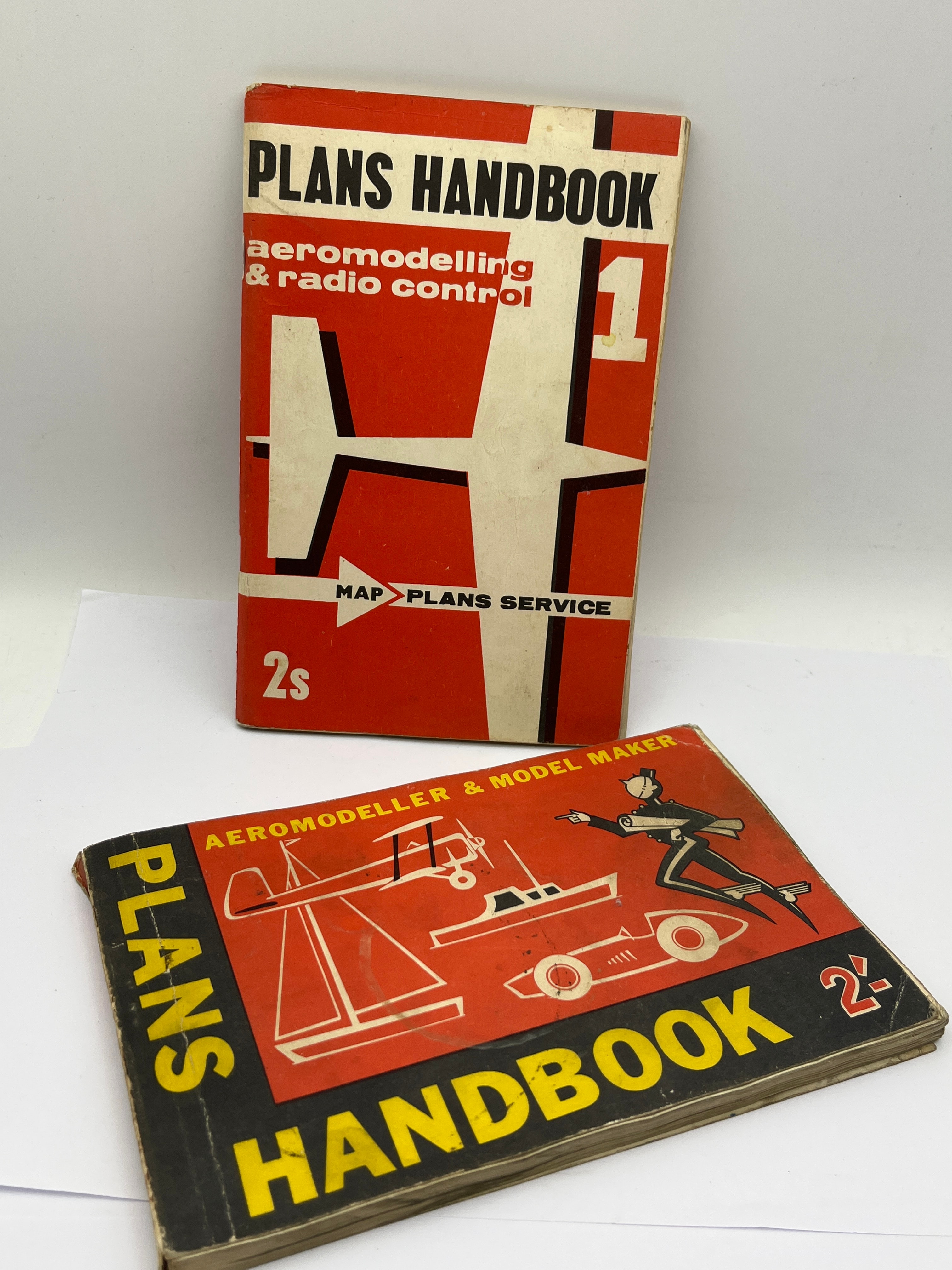 A pair of vintage paperback handbooks titled ‘Plans Handbook’, published by Model & Allied Publications (MAP). The first volume, ‘Plans Handbook 1: Aeromodelling & Radio Control’, features a stylized airplane graphic incorporating the numeral ‘1’ on its cover. The second volume, ‘Plans Handbook 2: Aeromodeller & Model Maker’, illustrates an airplane, boat, and car, and its reverse advertises ‘KEK KRAFT SANDED BALSA’ for model building. Both volumes are priced at ‘2s’ (two shillings) each and are constructed from paper/card stock, likely mid-20th century publications.